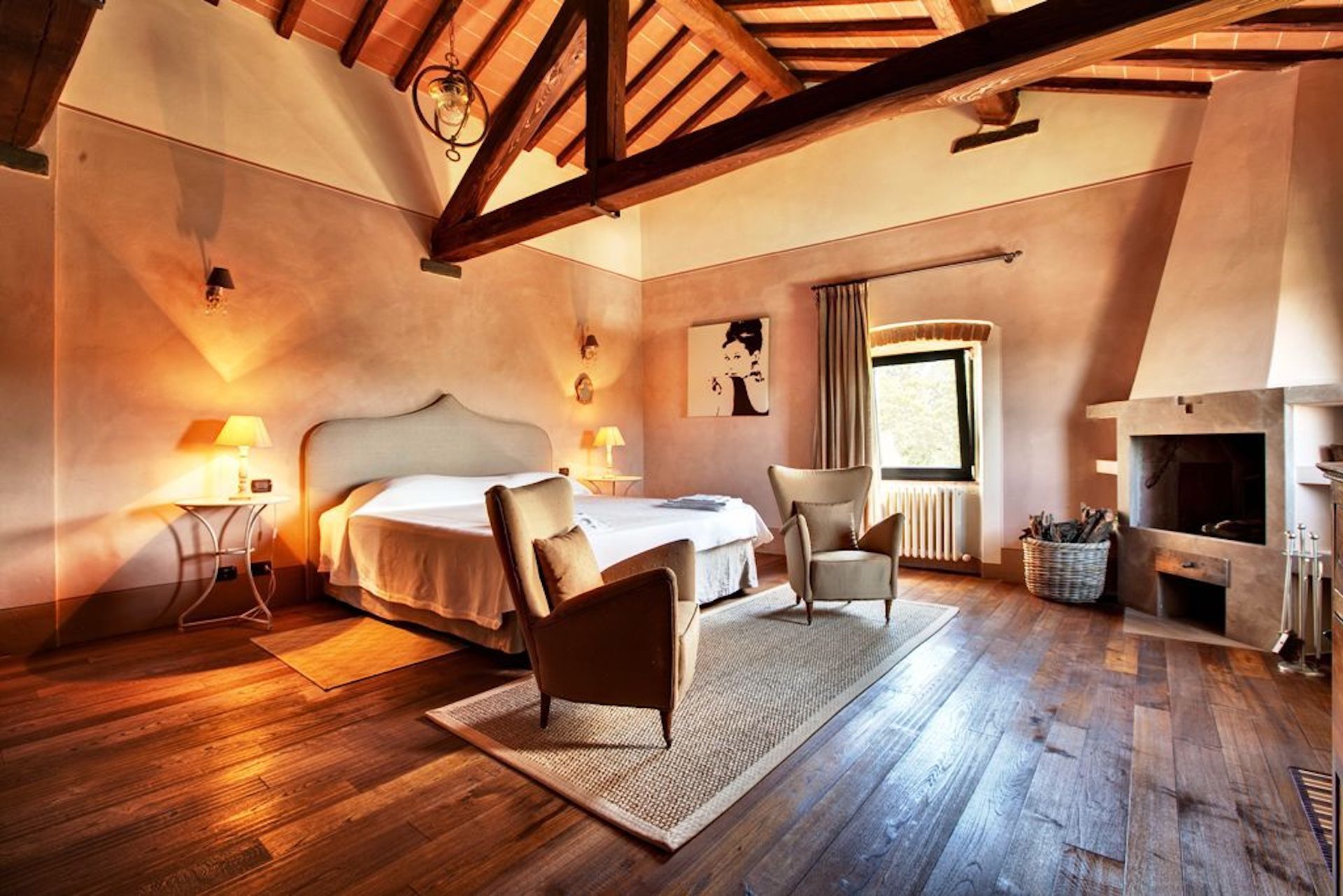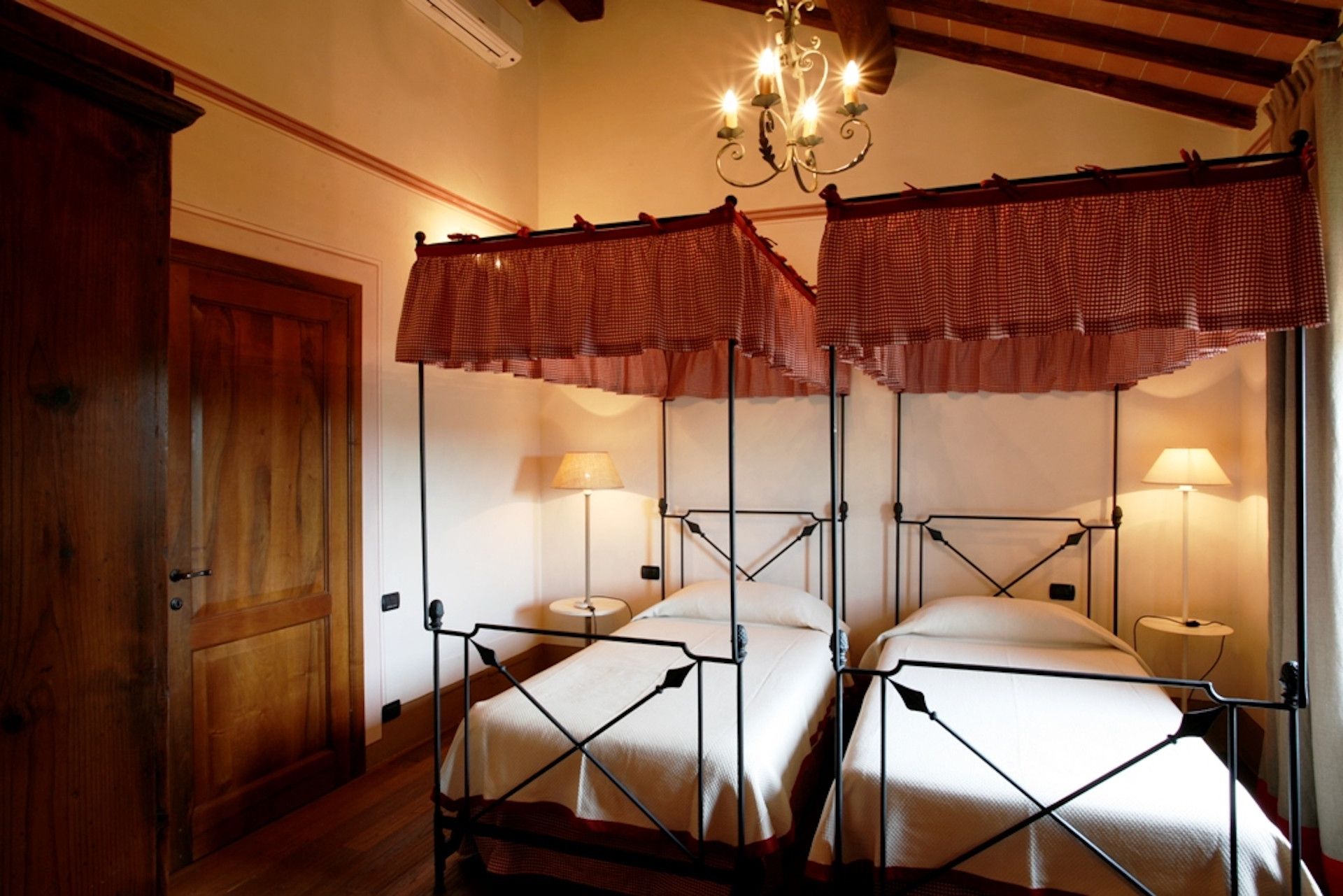 Surrounded by olive groves and vineyards, this home is a peaceful retreat in the heart of Tuscany, just a short drive from Florence, Siena, and San Gimignano. With sweeping countryside views, an outdoor pool, heated hydromassage pool, and a wellness area, relaxation is guaranteed. The sleeping arrangements are spread over two floors of the main villa and a separate cottage. Start your morning with a workout and a swim, then venture into the Tuscan countryside and explore the local villages and vineyards before returning home to dine alfresco in the shaded veranda.