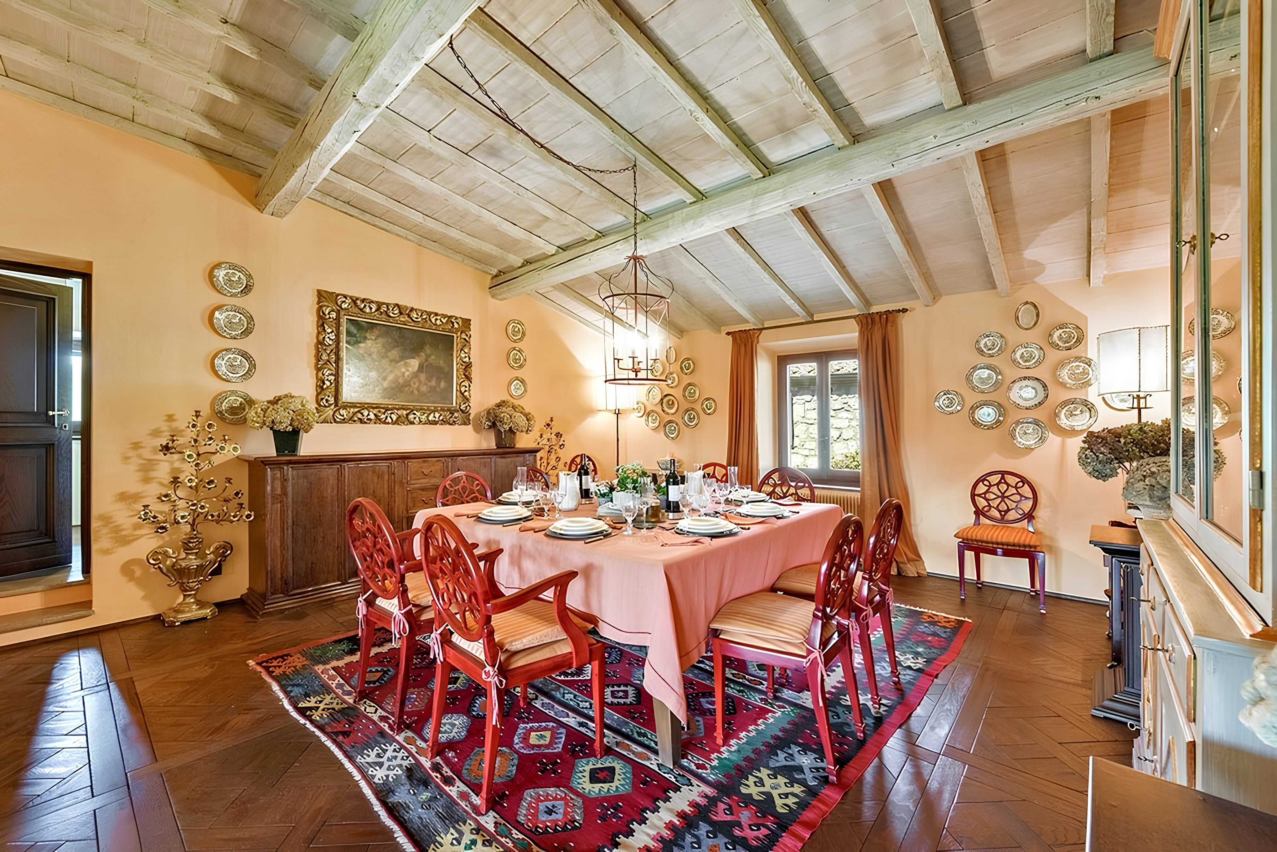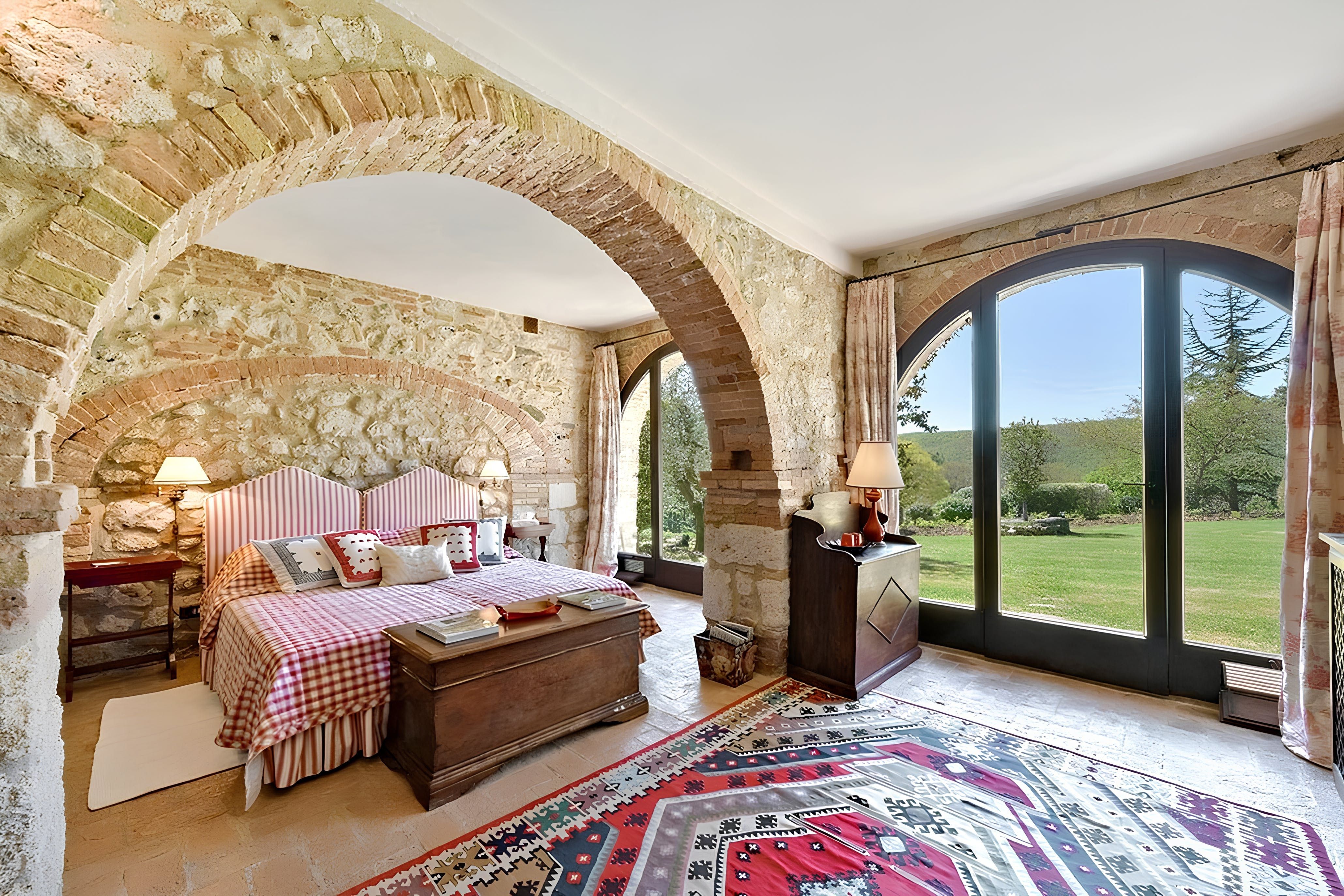 Tuscan charm abounds at this rustic villa near Sarteano. Even with dated interiors, every room here conveys cosiness – picture arched stone walls, wood and terracotta ceilings, book-lined shelves, and a traditional fireplace. Outside, dappled terraces, a football field, and a private swimming pool will keep both grown-ups and little ones entertained. What's more, the rural location puts you within striking distance of Tuscany's old-world villages and rolling hills. Sarteano and Cetona are just minutes away, while Perugia and Siena are about an hour's drive and make good options for day trips.