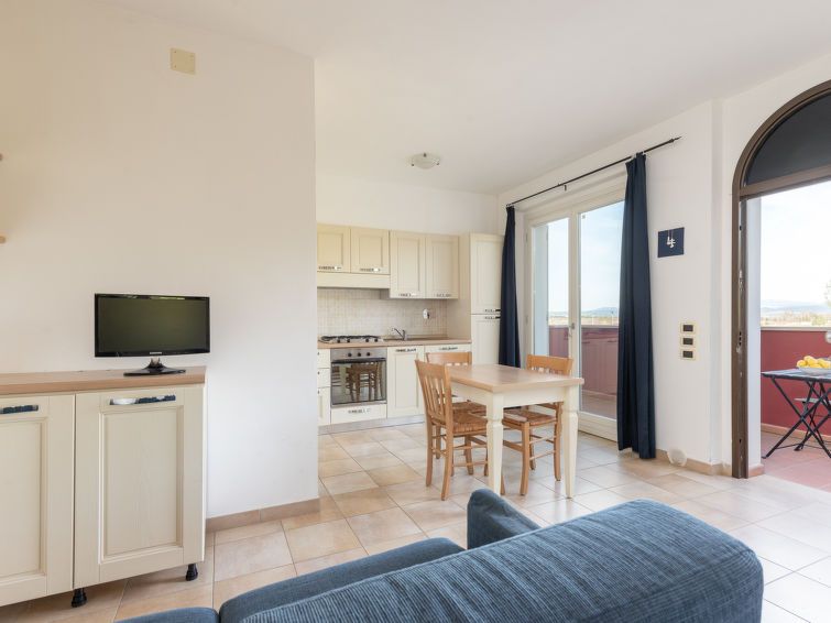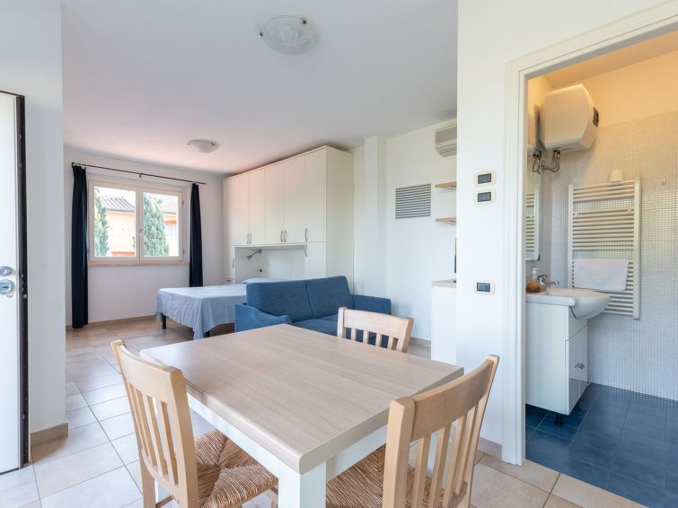 1-room apartment 31 m2 on 1st floor. Object suitable for 2 adults + 1 child. Cosy furnishings: open living/sleeping room with 1 sofabed, 1 double bed, dining table, kitchen corner and TV. Exit to the terrace. Open kitchen (oven, 4 gas rings). Exit to the terrace. Shower/WC. Air-conditioning, forced-air heating.
