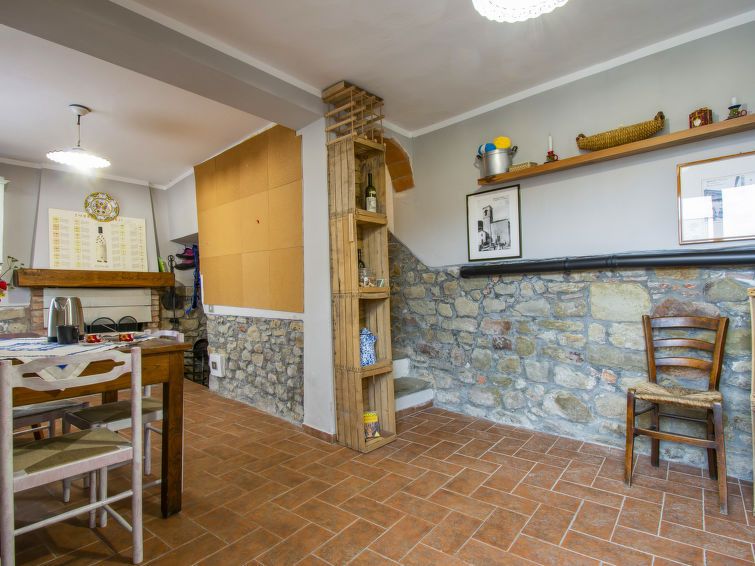 "Casa della Fontana", 3-room terraced house. Practical and rustic furnishings: living/dining room with open-hearth fireplace (only for decoration), dining table. Exit to the garden. Kitchen (4 induction hot plates, kettle, microwave, electric coffee machine). Upper floor: computer room with panoramic window.