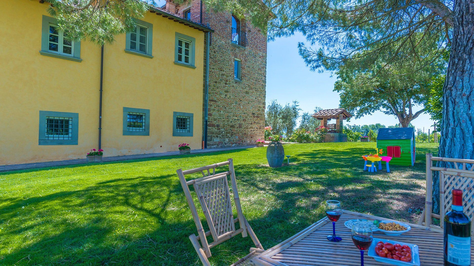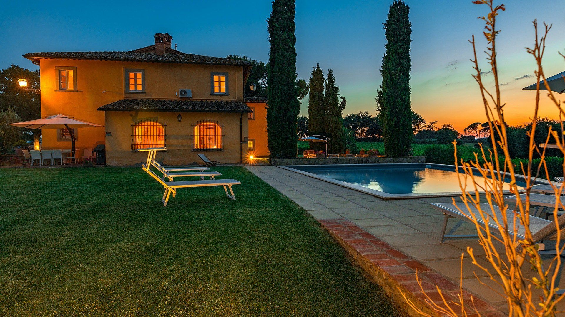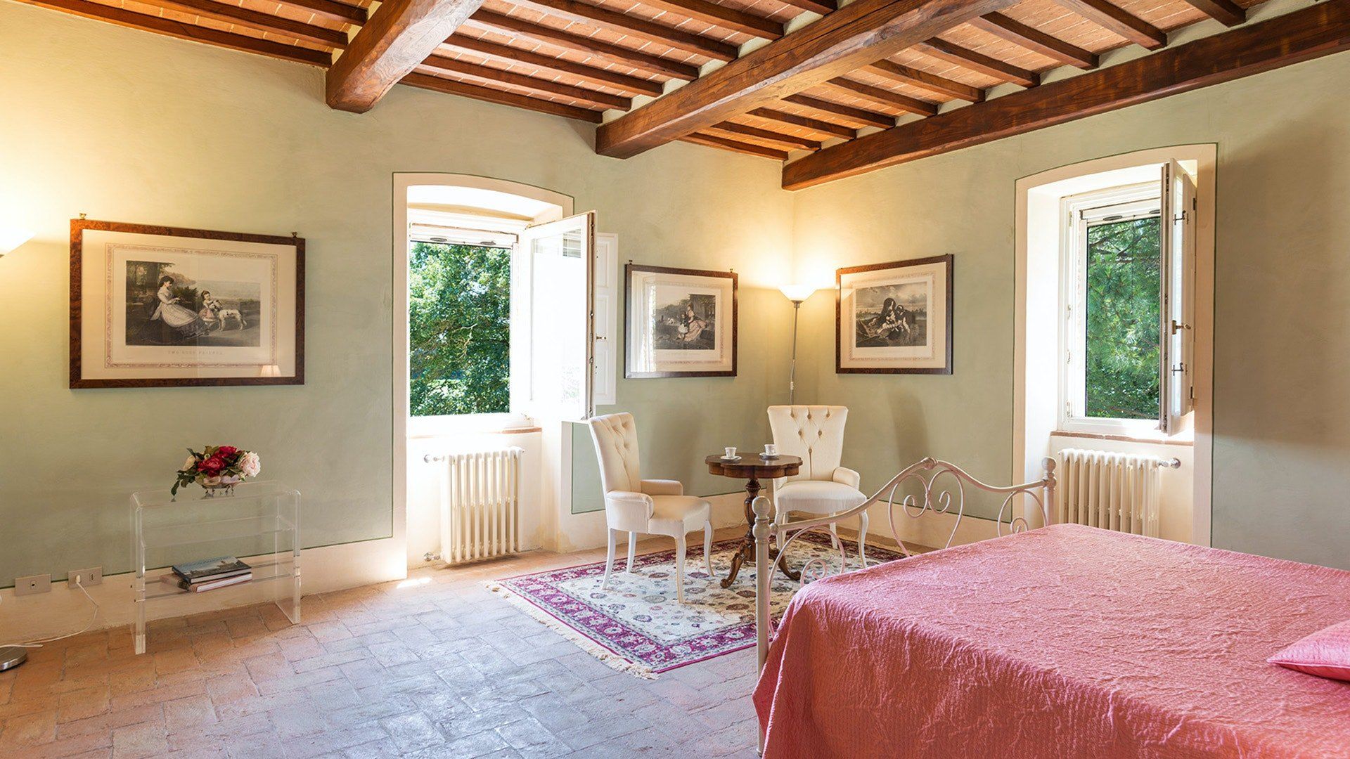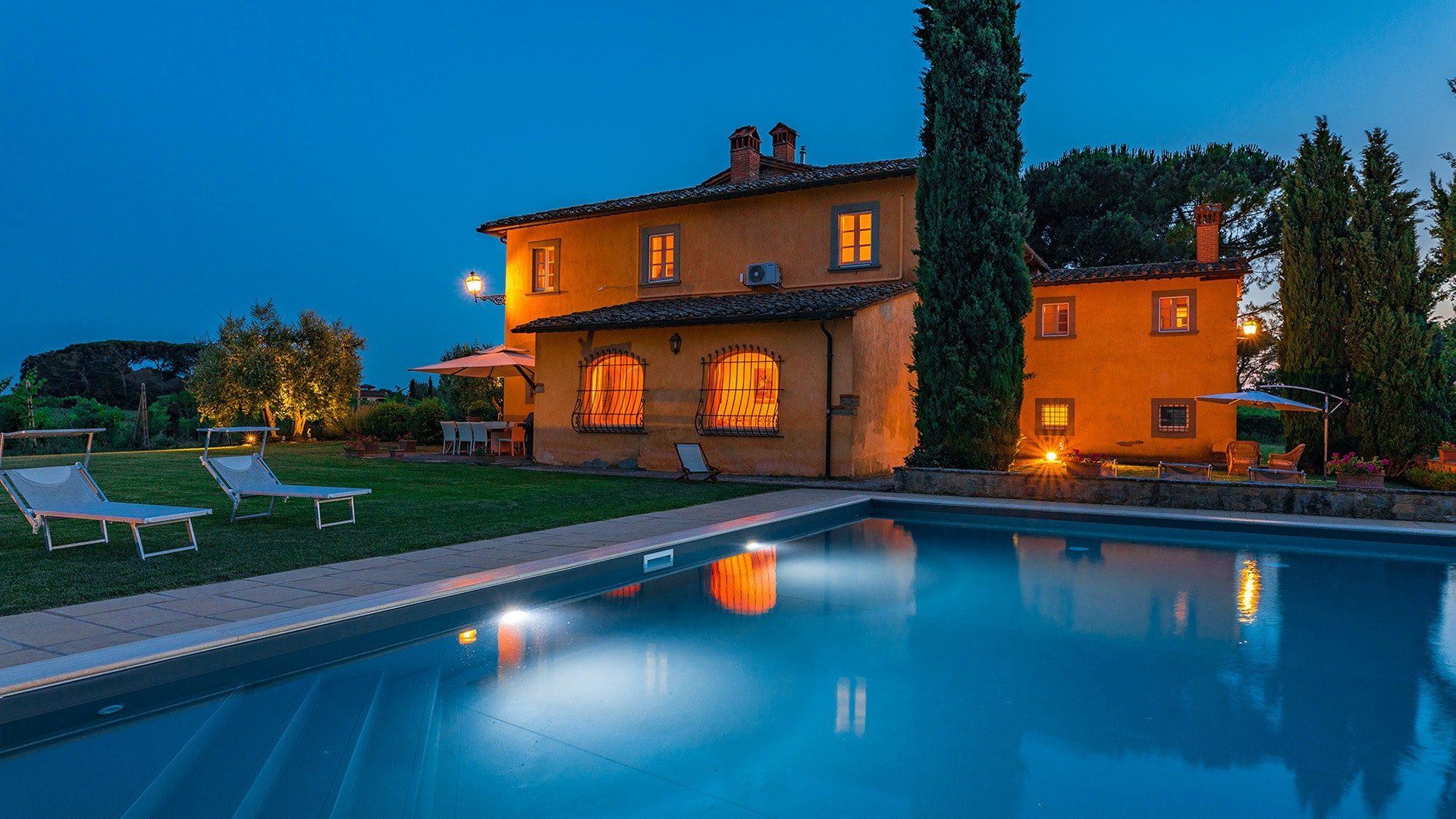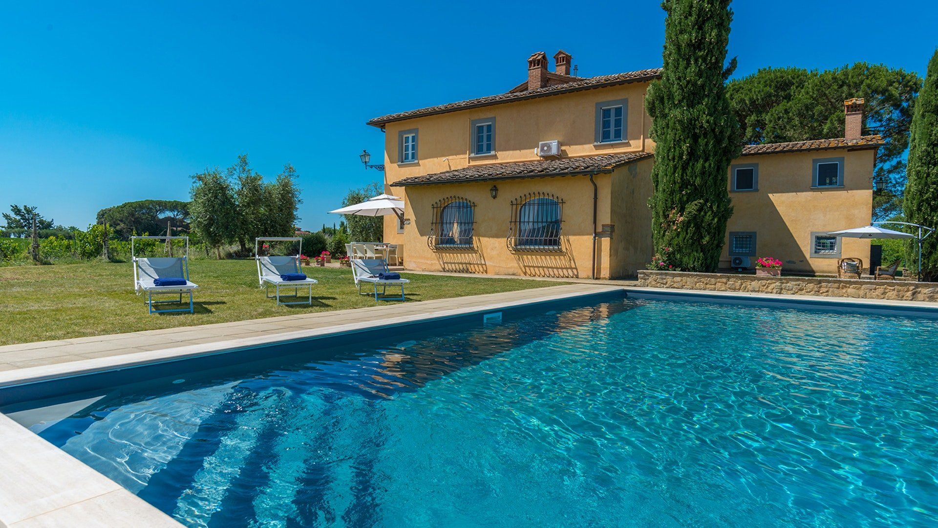 Retaining its original exposed stone structure and terracotta thatched roof, this villa stands tall just outside the small village of Alberoro. Spend mornings relaxing on the lush lawns by the private pool, where sprigs of lavender lend an air of tranquillity. Fire up the gas barbecue for an alfresco lunch in the courtyard, with striking views over the rural landscapes of the Aretine Val di Chiana and its surrounding villages. Large white umbrellas cover the many outdoor seating areas here, to shade you from the Mediterranean sun as you enjoy the views. Inside, this rustic home has luxurious touches throughout, including beautiful bathrooms with painted walls, blue velvet sofas, a 12-seater wrought iron dining table and a piano. As well as two separate living rooms, there's a light-filled library with comfy sofas, and a games room with foosball and a poker table. If you can tear yourself away, you’ll be just a short drive away from the quaint medieval town of Arezzo.