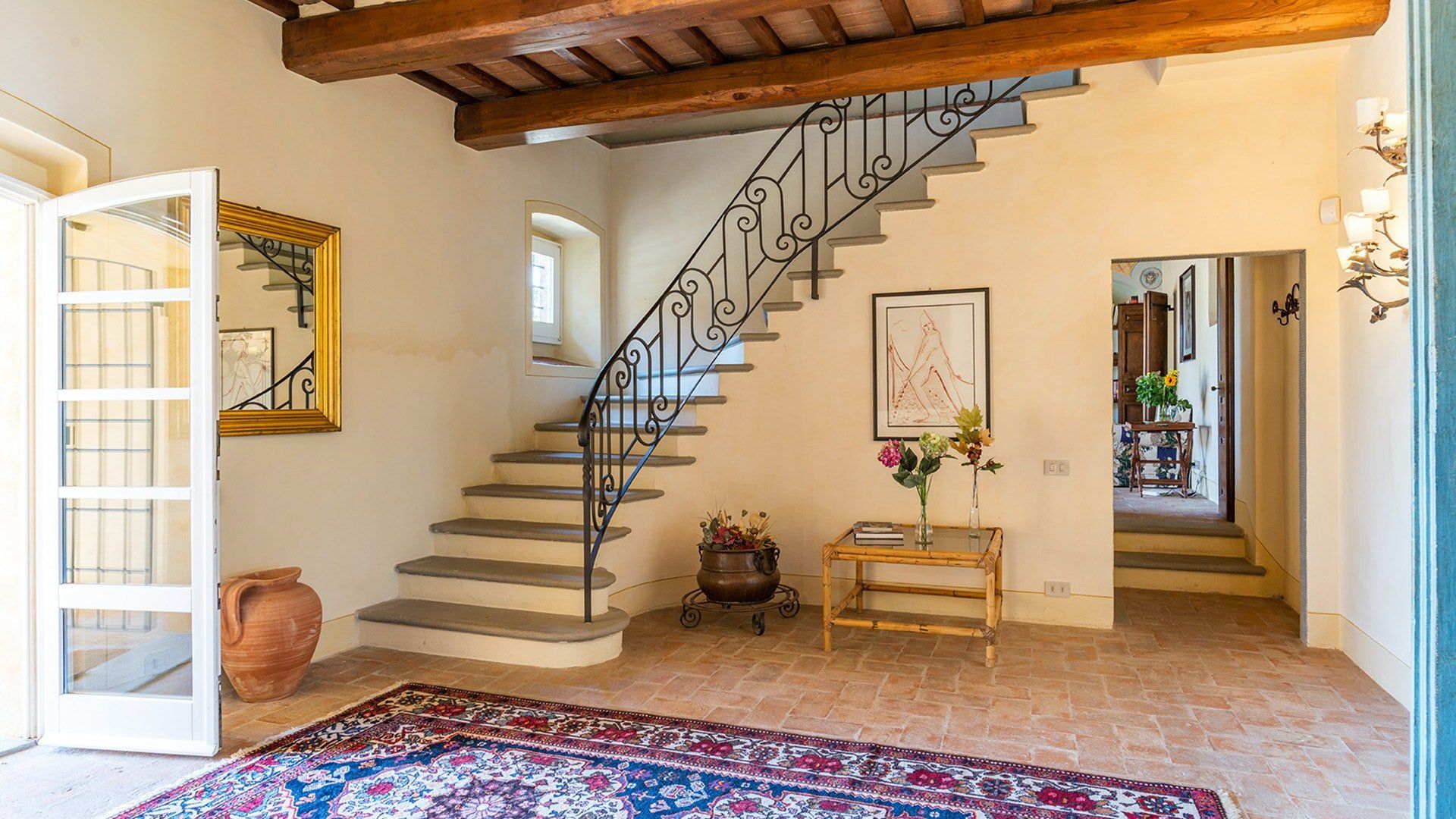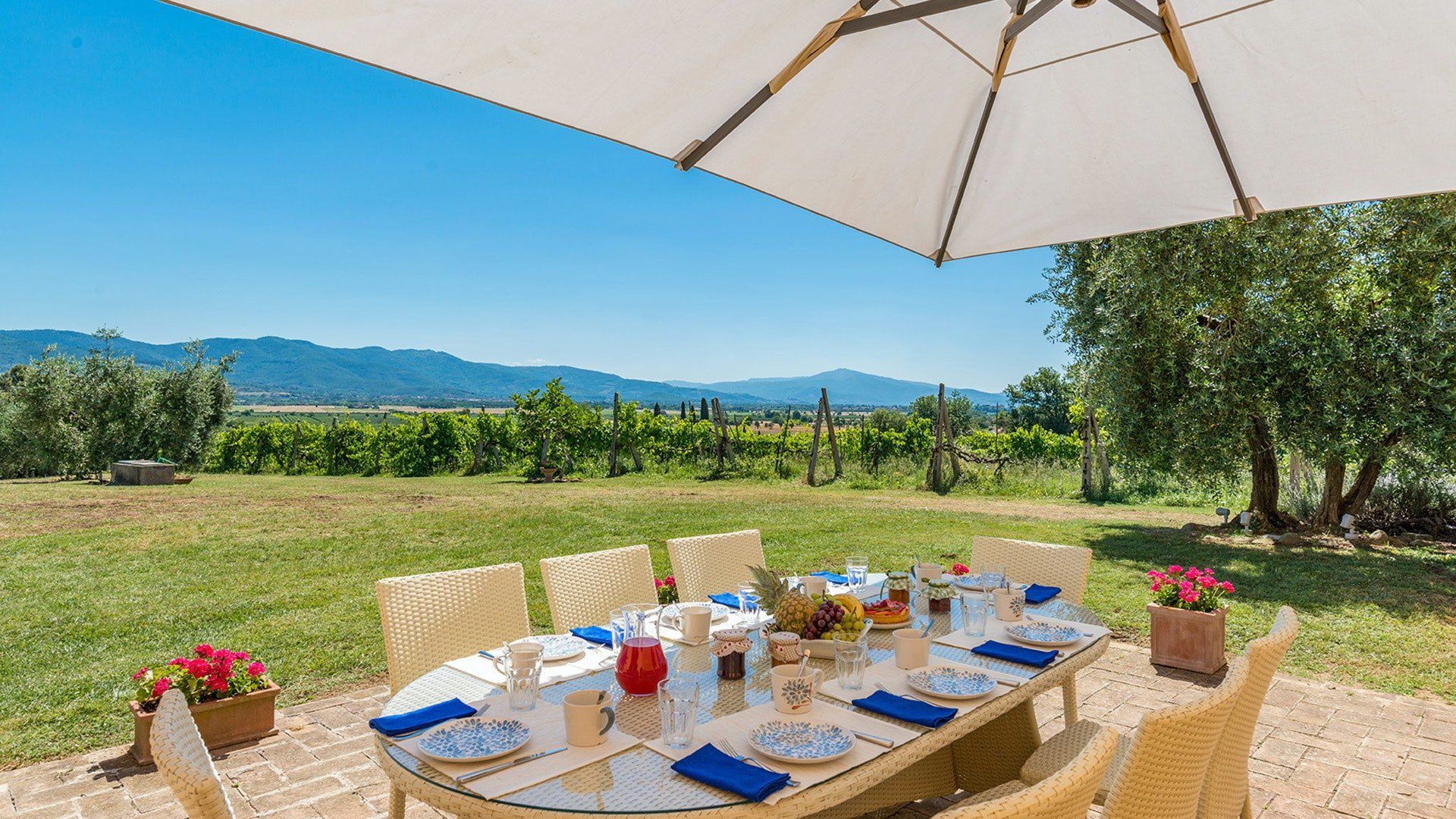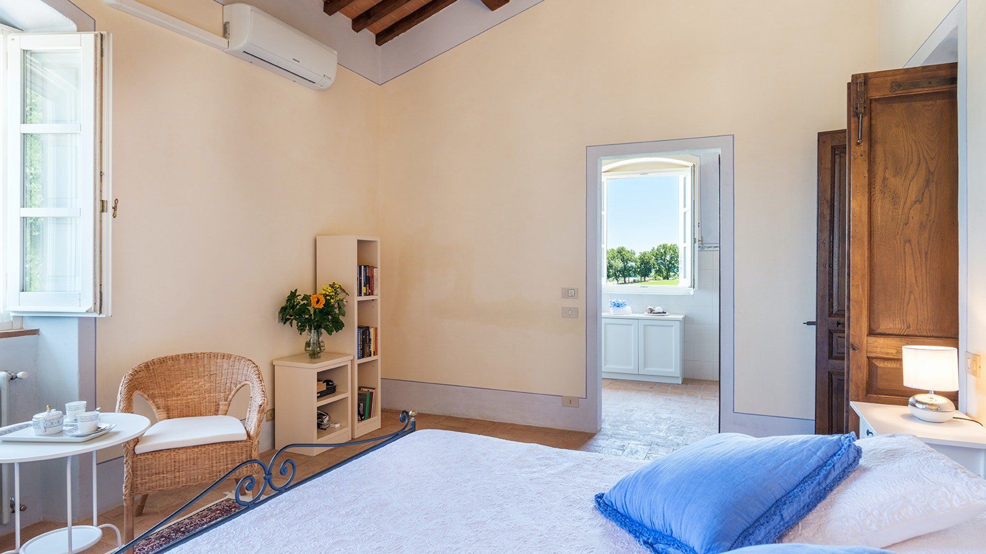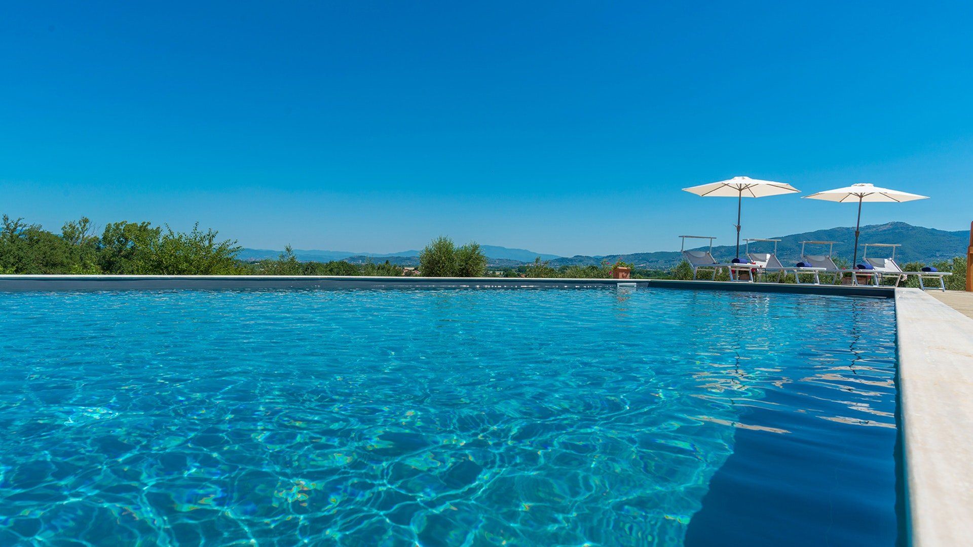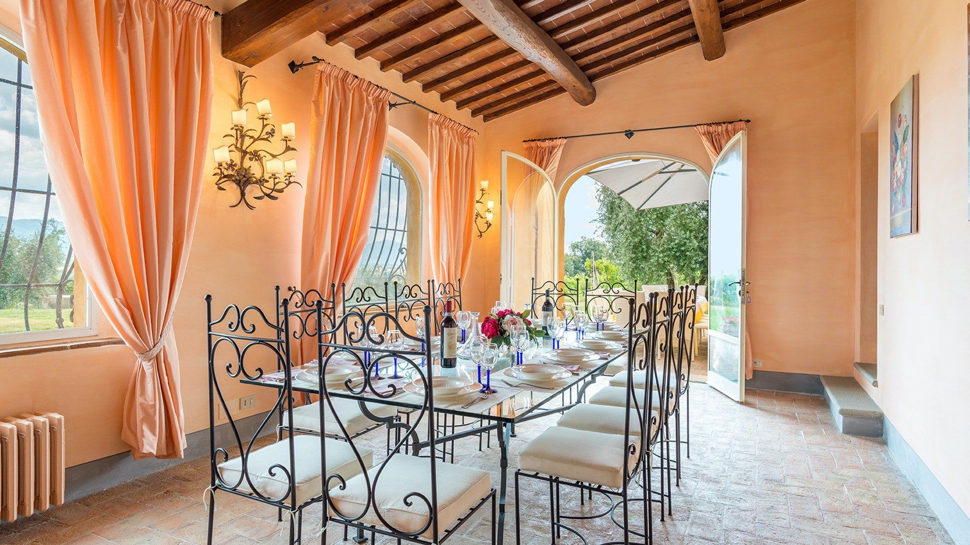 Retaining its original exposed stone structure and terracotta thatched roof, this villa stands tall just outside the small village of Alberoro. Spend mornings relaxing on the lush lawns by the private pool, where sprigs of lavender lend an air of tranquillity. Fire up the gas barbecue for an alfresco lunch in the courtyard, with striking views over the rural landscapes of the Aretine Val di Chiana and its surrounding villages. Large white umbrellas cover the many outdoor seating areas here, to shade you from the Mediterranean sun as you enjoy the views. Inside, this rustic home has luxurious touches throughout, including beautiful bathrooms with painted walls, blue velvet sofas, a 12-seater wrought iron dining table and a piano. As well as two separate living rooms, there's a light-filled library with comfy sofas, and a games room with foosball and a poker table. If you can tear yourself away, you’ll be just a short drive away from the quaint medieval town of Arezzo.