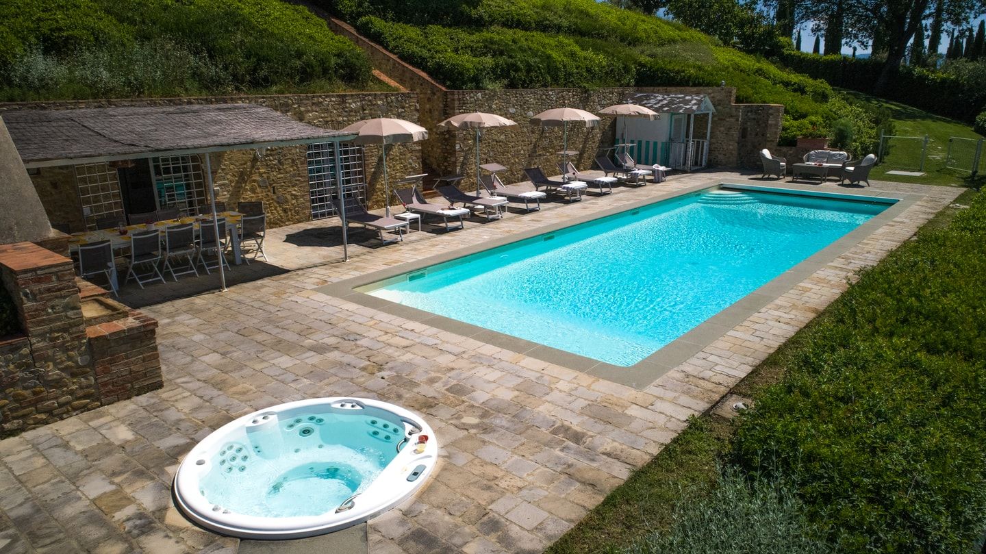 Nestled in the rolling hills, this villa offers a tranquil retreat in the heart of Tuscan wine country. Perfect for families or friends, it blends rustic charm with modern comforts for a truly restful stay. Spend your sunny days lounging by the private pool or unwind in the spa with a Turkish bath, sauna and Jacuzzi. You'll find everything you need inside the elegant living spaces, including a billiard room and six serene bedrooms split between the main house and annexe. Finish your day of relaxation at the BBQ and alfresco dining area for a long, lazy evening under the stars. With charming villages, historic abbeys, and world-class wine estates a short drive away, this is timeless Tuscan living.