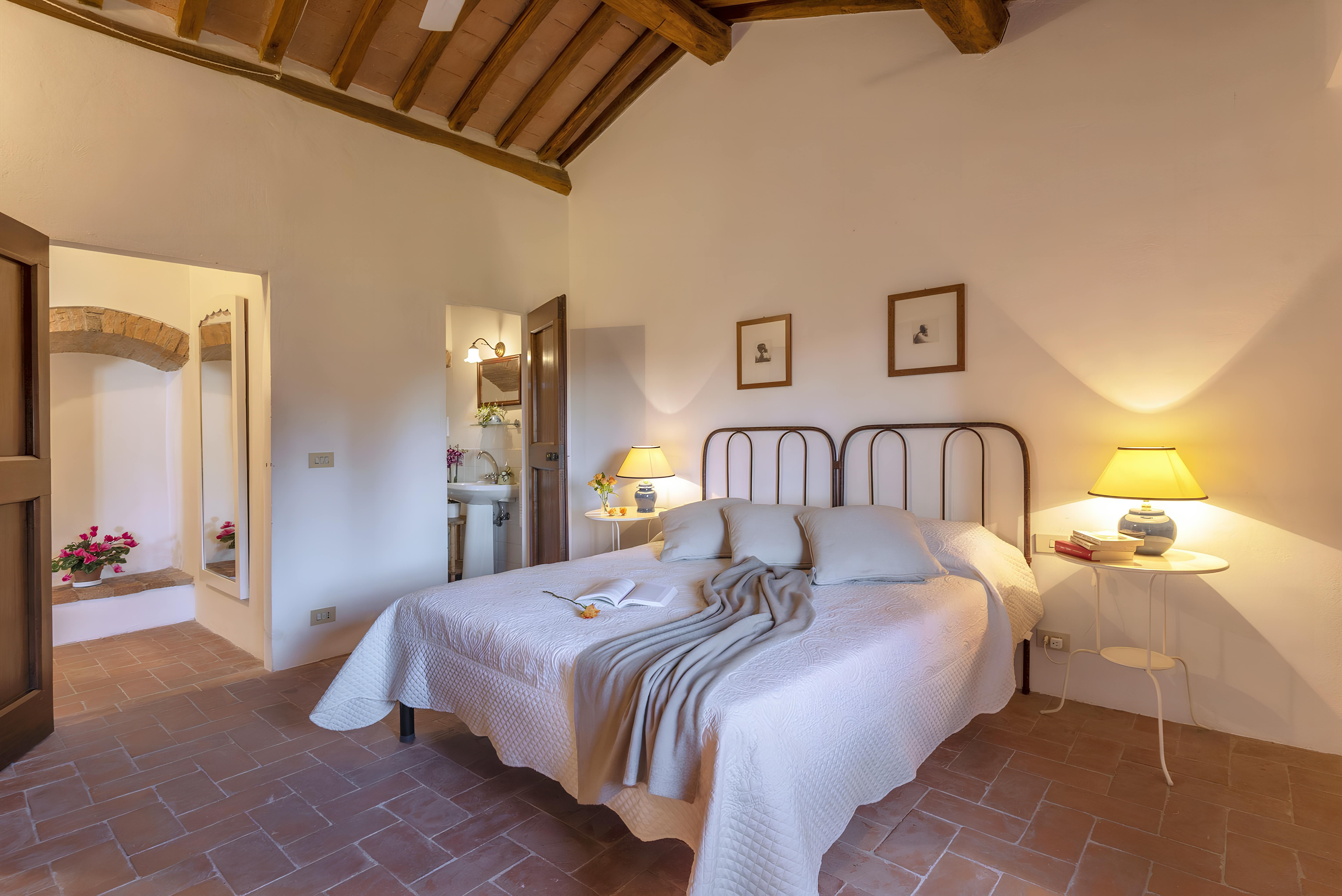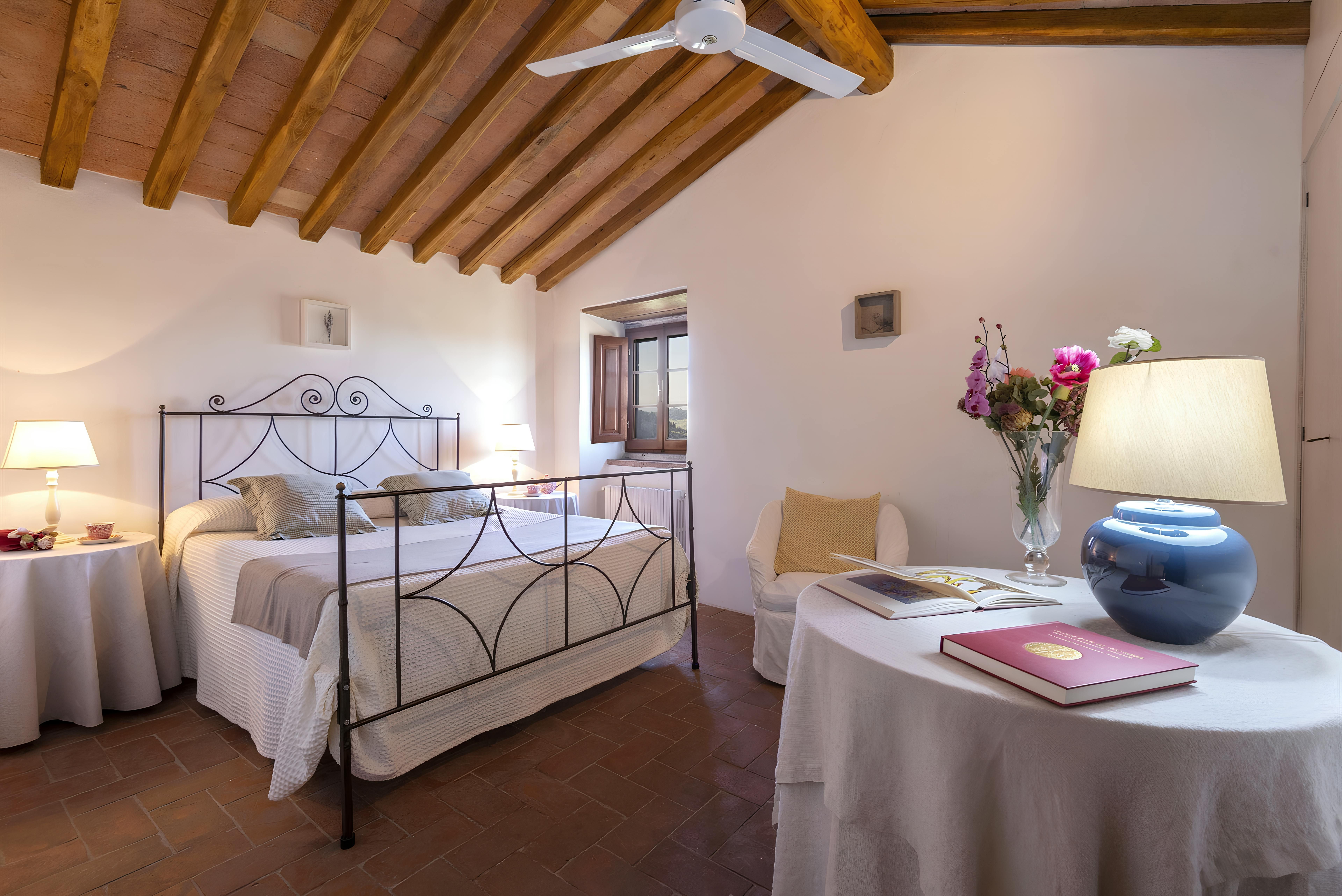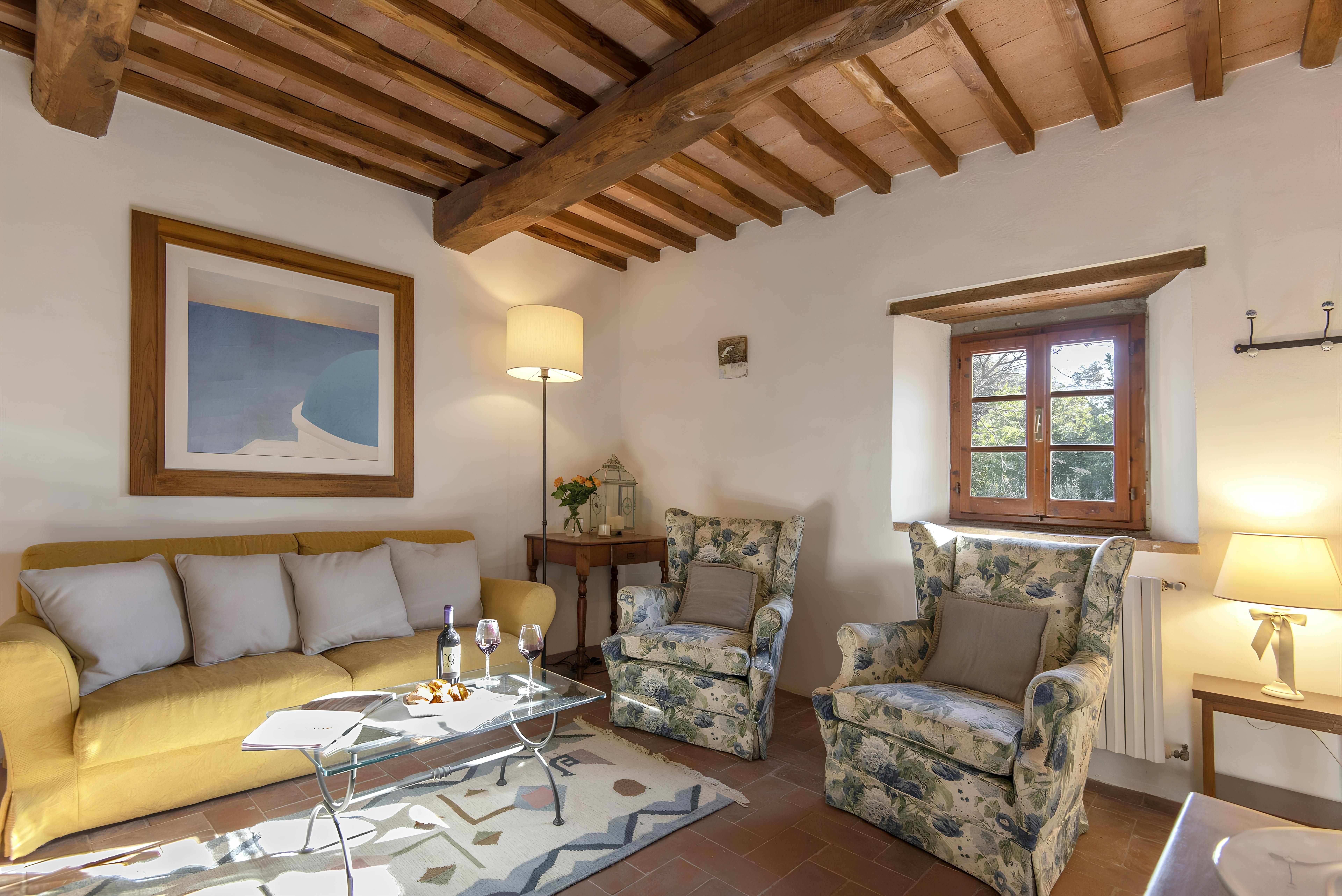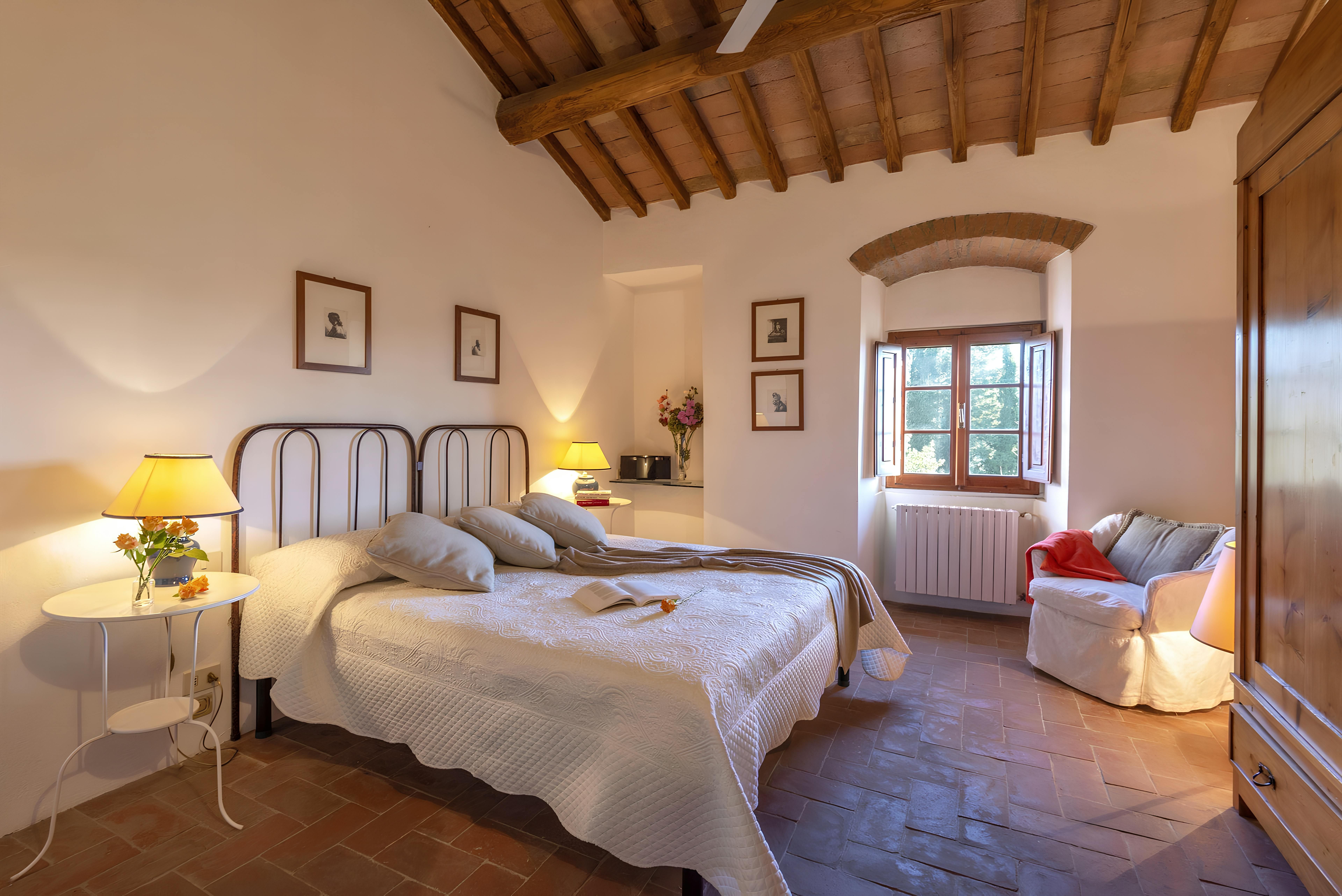 Tuscan character abounds in this stone villa, from wood-beamed ceilings to terracotta-tiled floors. It's the garden, however, that steals the show here. A covered terrace is the perfect spot to enjoy an Italian breakfast while the swimming pool beckons on a hot summer day. The best part is the views – sit back with a Chianti-made wine and admire the surrounding vineyards, olive groves, and meadows. When you're ready to venture out, take a trip to Florence – less than an hour's drive – or hop on the three provided mountain bikes to explore locally. Just note that the owner's son lives on the property, but none of the spaces are shared.