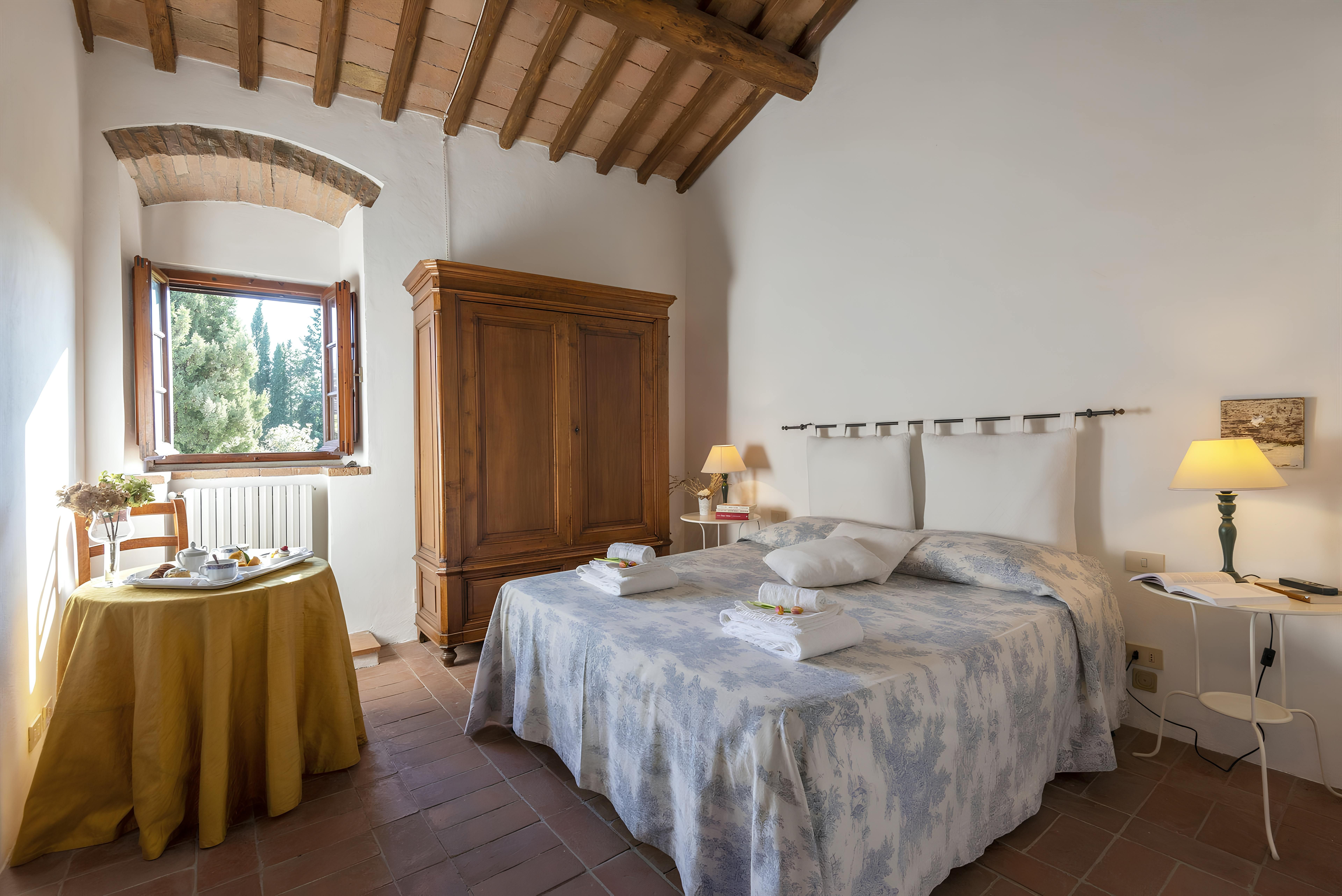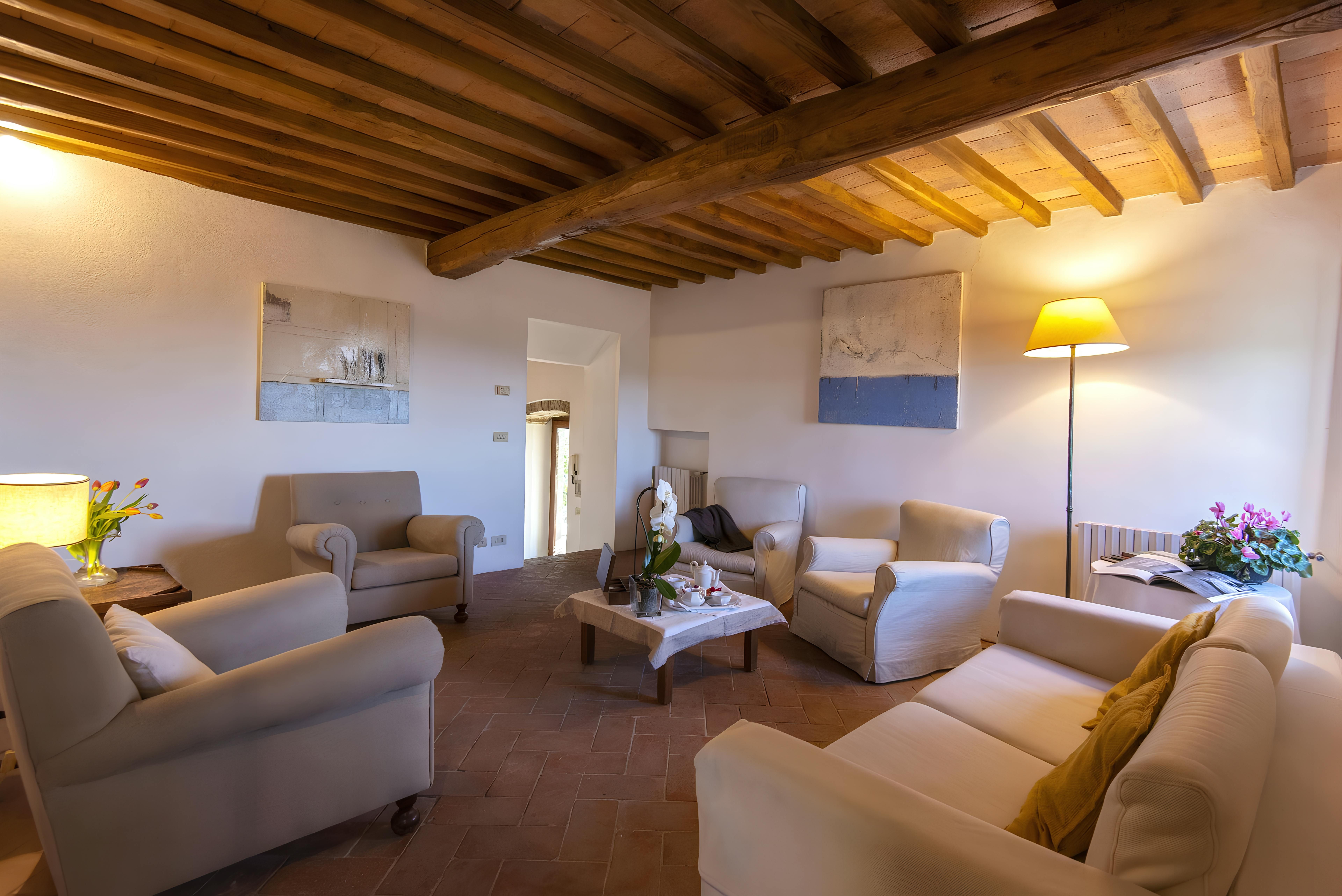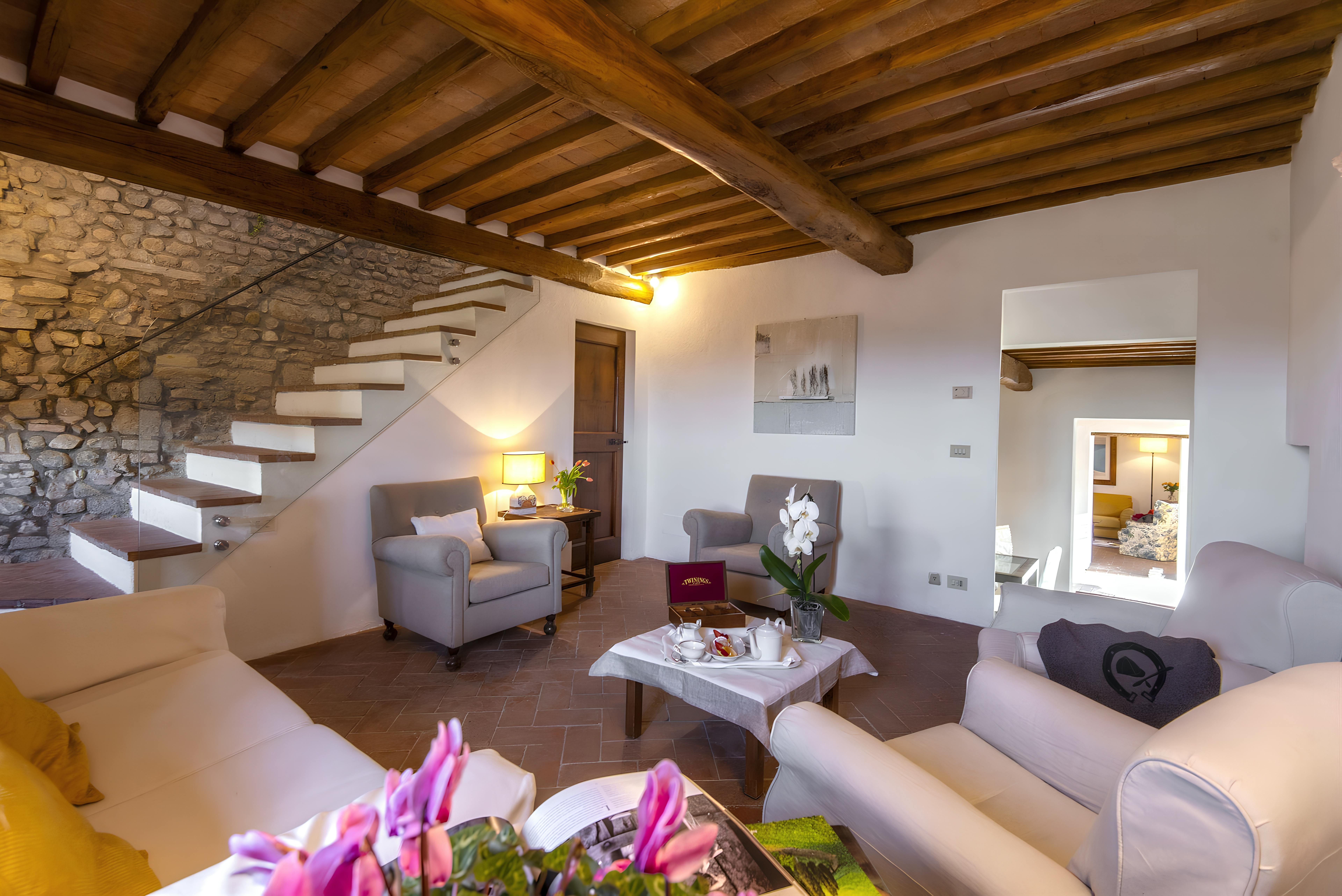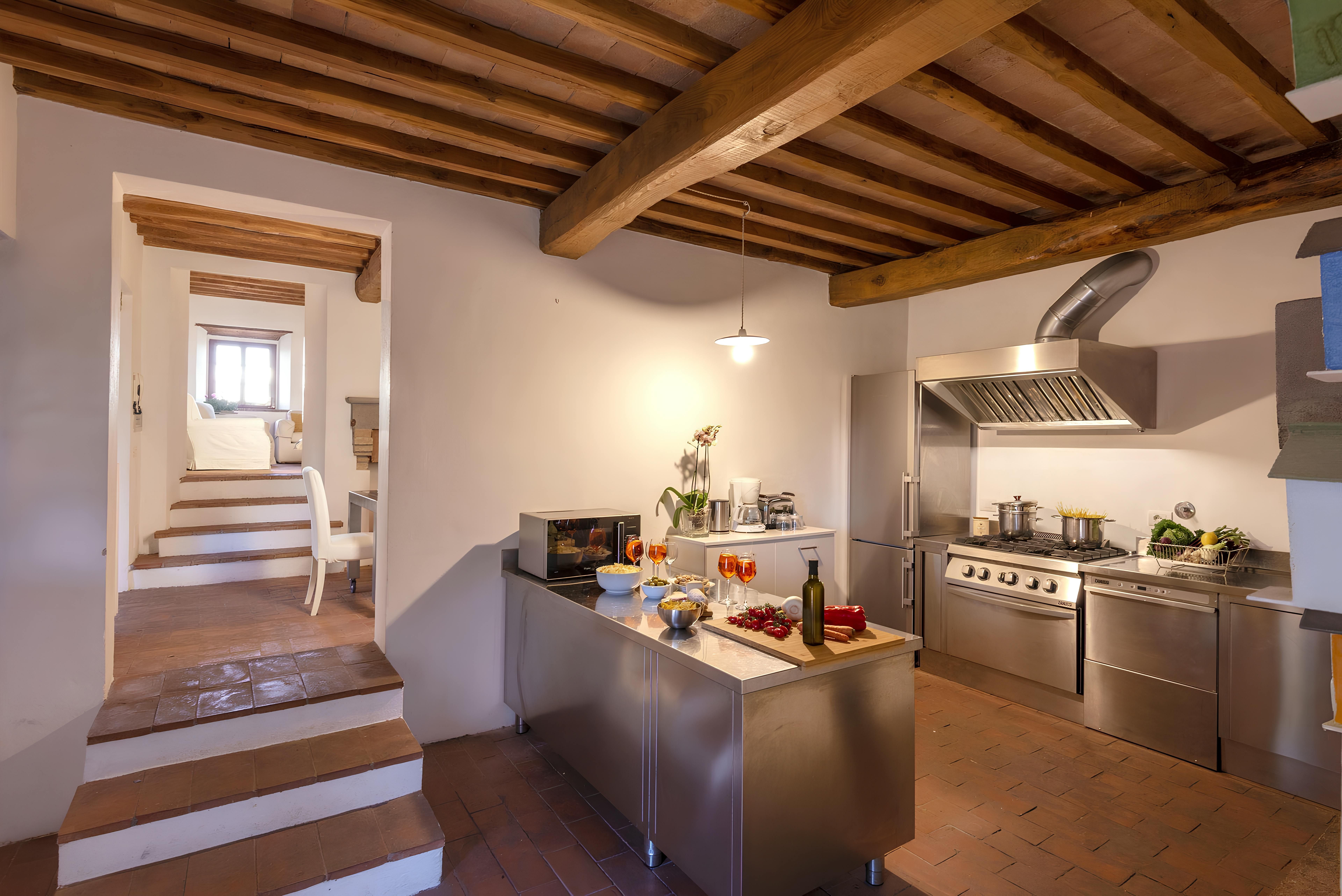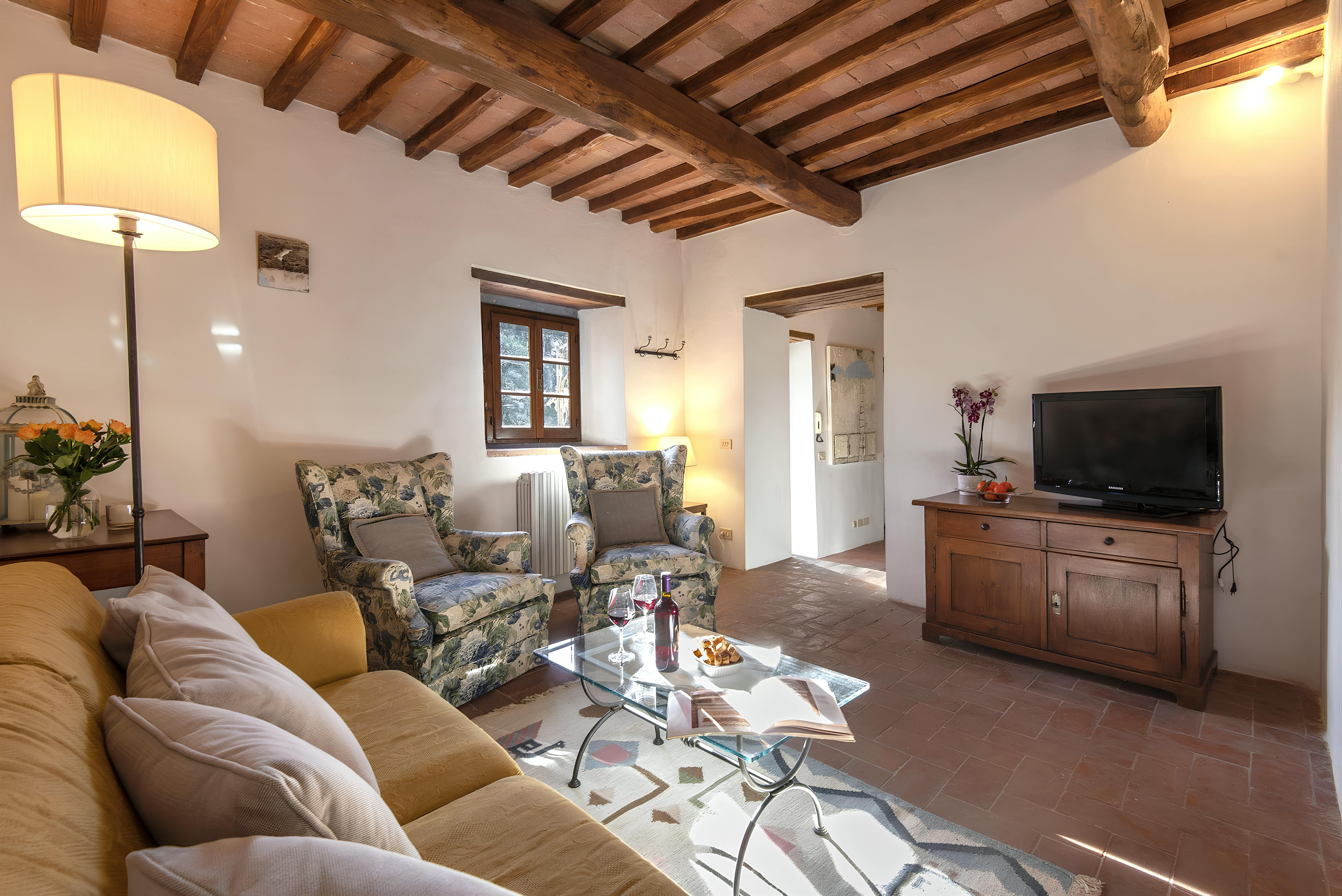 Tuscan character abounds in this stone villa, from wood-beamed ceilings to terracotta-tiled floors. It's the garden, however, that steals the show here. A covered terrace is the perfect spot to enjoy an Italian breakfast while the swimming pool beckons on a hot summer day. The best part is the views – sit back with a Chianti-made wine and admire the surrounding vineyards, olive groves, and meadows. When you're ready to venture out, take a trip to Florence – less than an hour's drive – or hop on the three provided mountain bikes to explore locally. Just note that the owner's son lives on the property, but none of the spaces are shared.