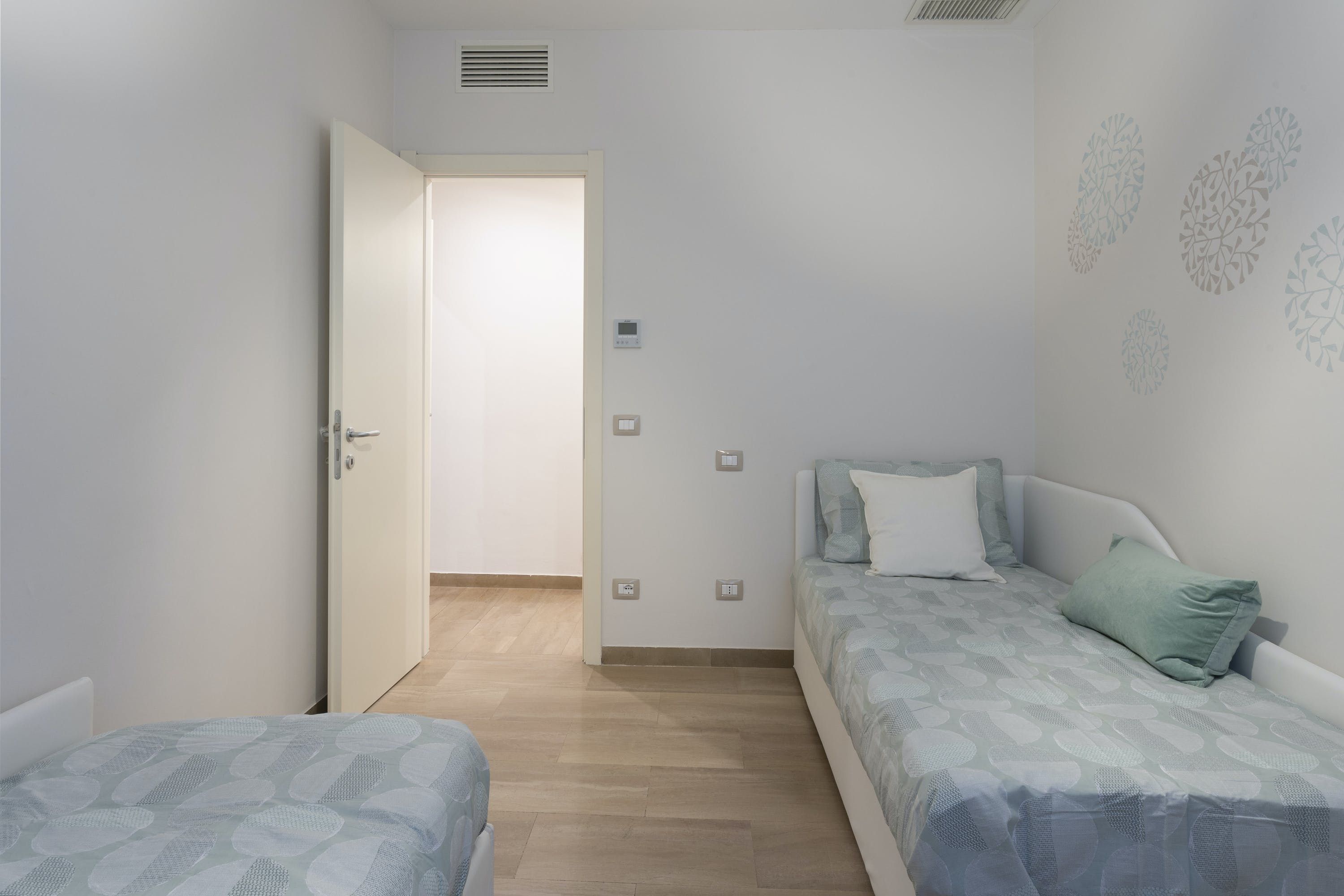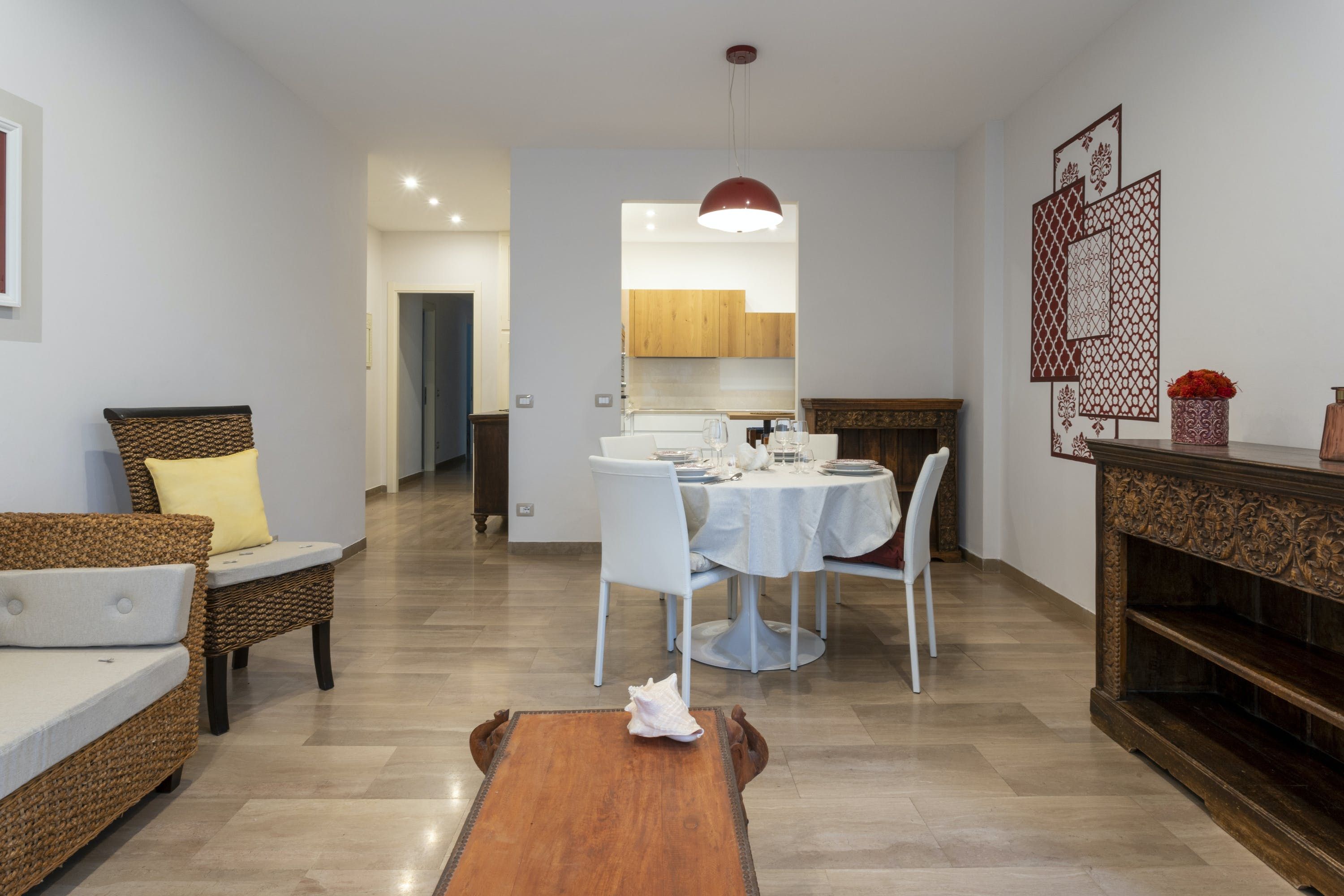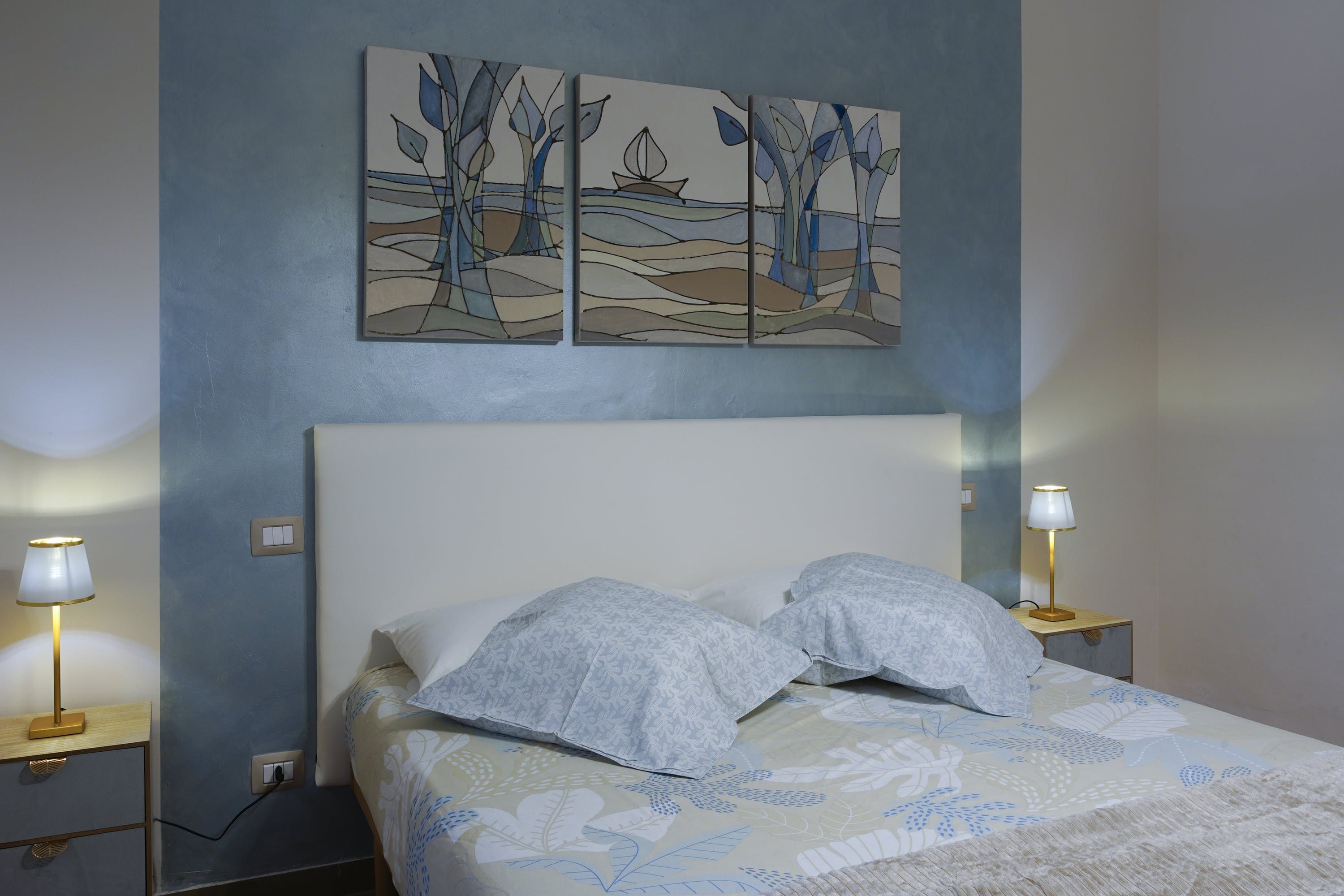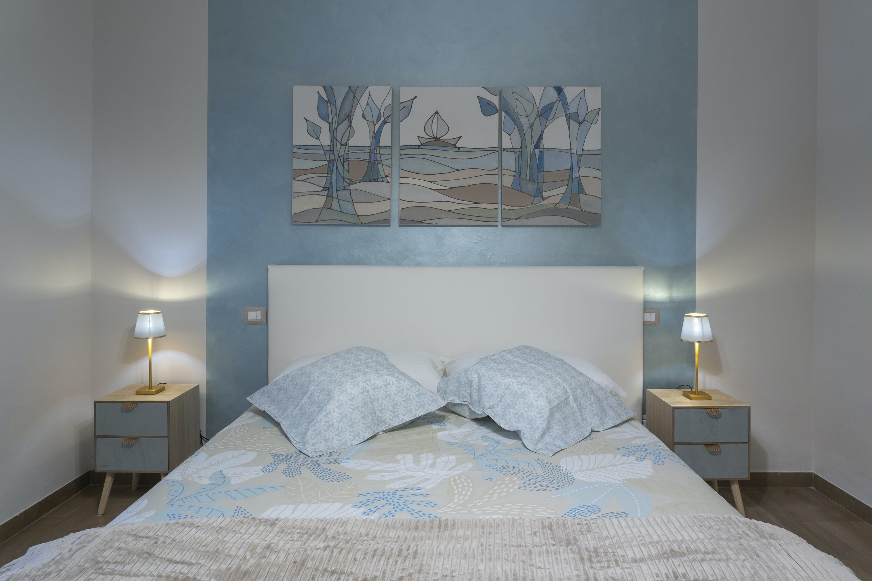 The apartment itself is an ideal city bolthole. Intricately carved teak furniture gives the open living room a Balinese calm feel and floor-to-ceiling corner windows keep things feeling light. The kitchen is sleek and modern, tucked away at the back and you can choose between the breakfast bar or dining table to uncork a bottle of local Sangiovese for social evenings in. We love the bedroom with the powder-blue feature wall and art nouveau paintings.