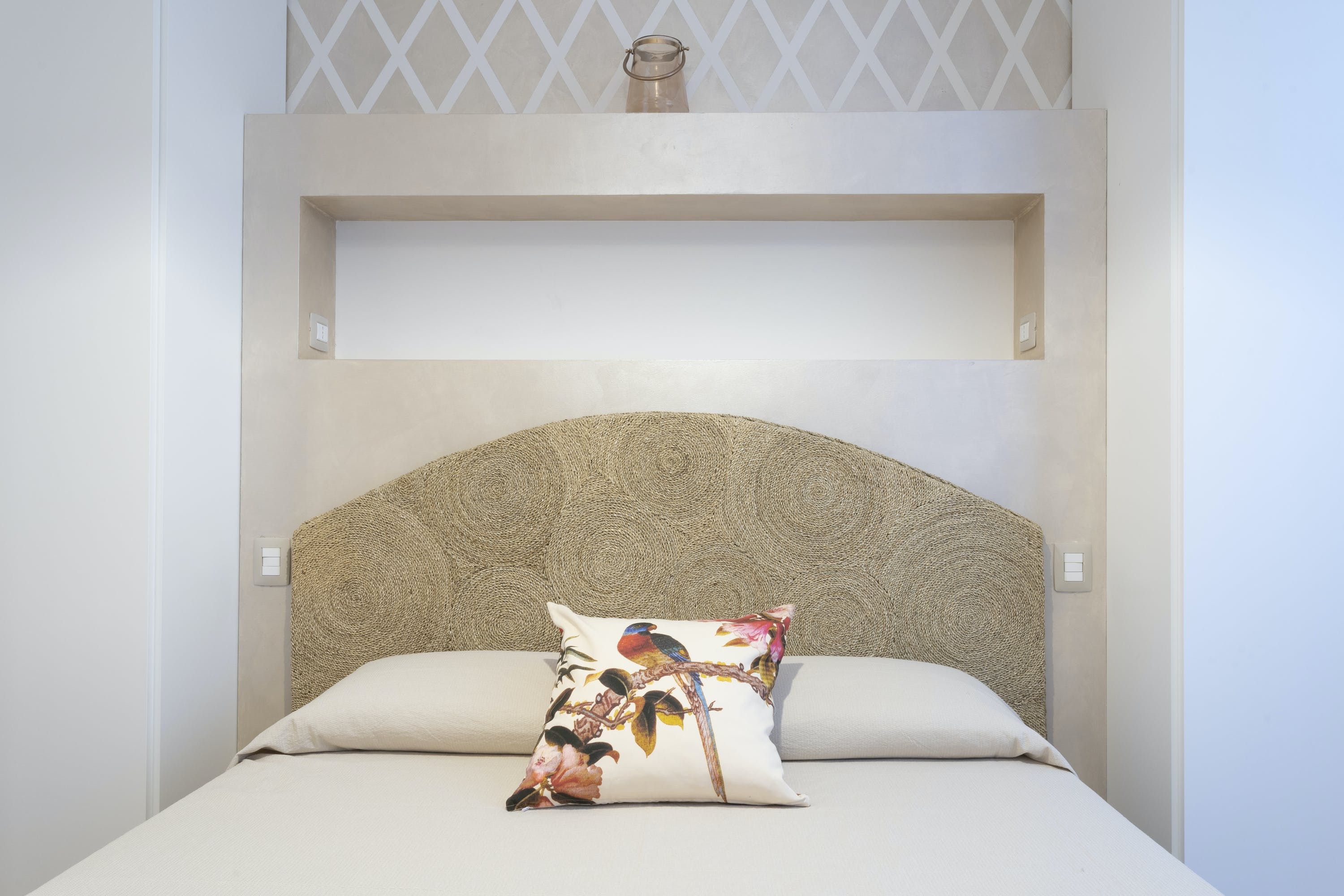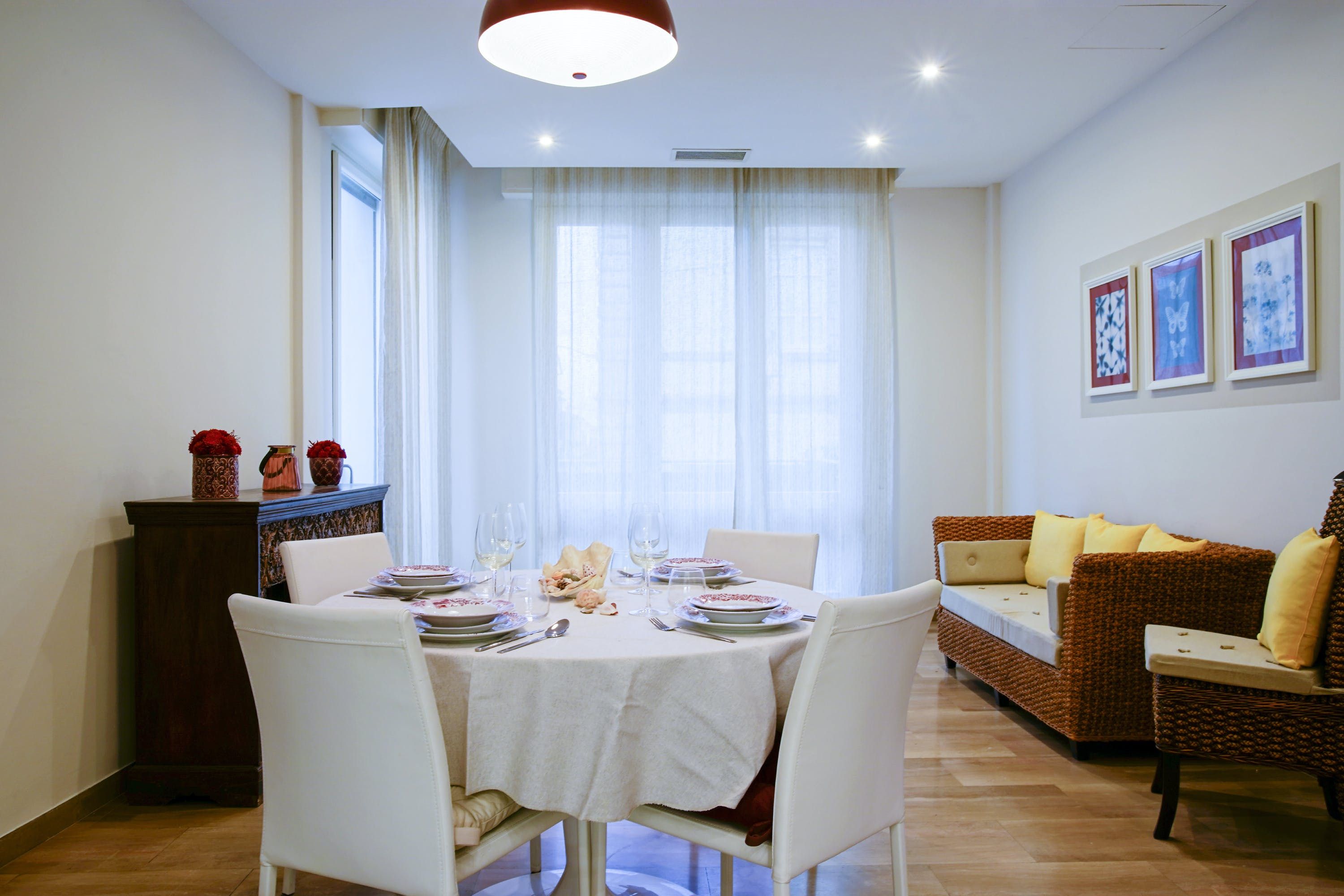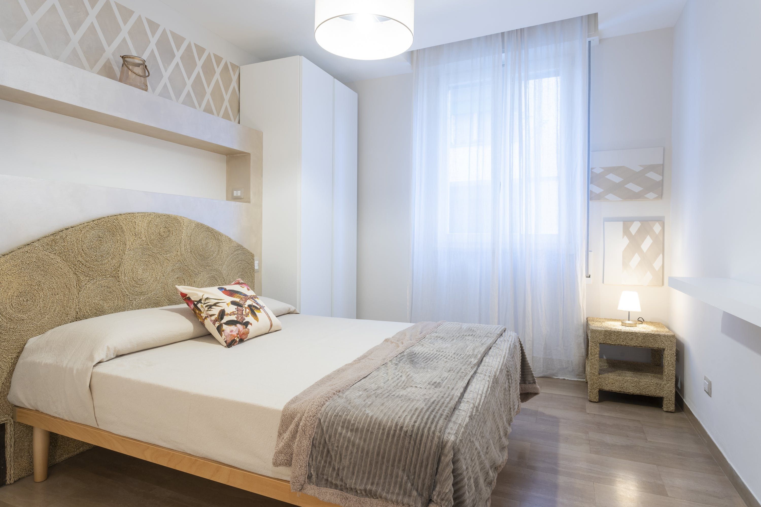 The apartment itself is an ideal city bolthole. Intricately carved teak furniture gives the open living room a Balinese calm feel and floor-to-ceiling corner windows keep things feeling light. The kitchen is sleek and modern, tucked away at the back and you can choose between the breakfast bar or dining table to uncork a bottle of local Sangiovese for social evenings in. We love the bedroom with the powder-blue feature wall and art nouveau paintings.