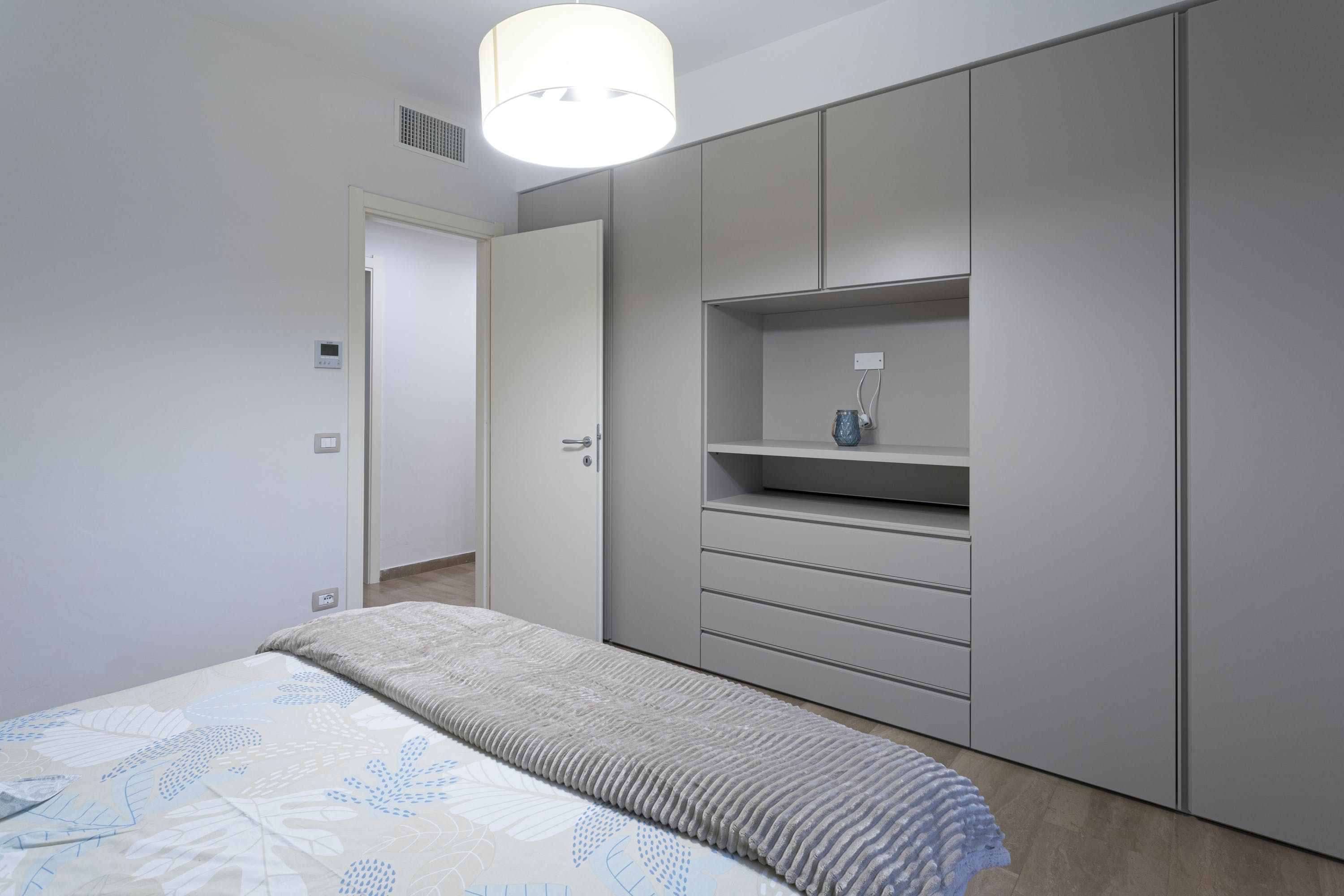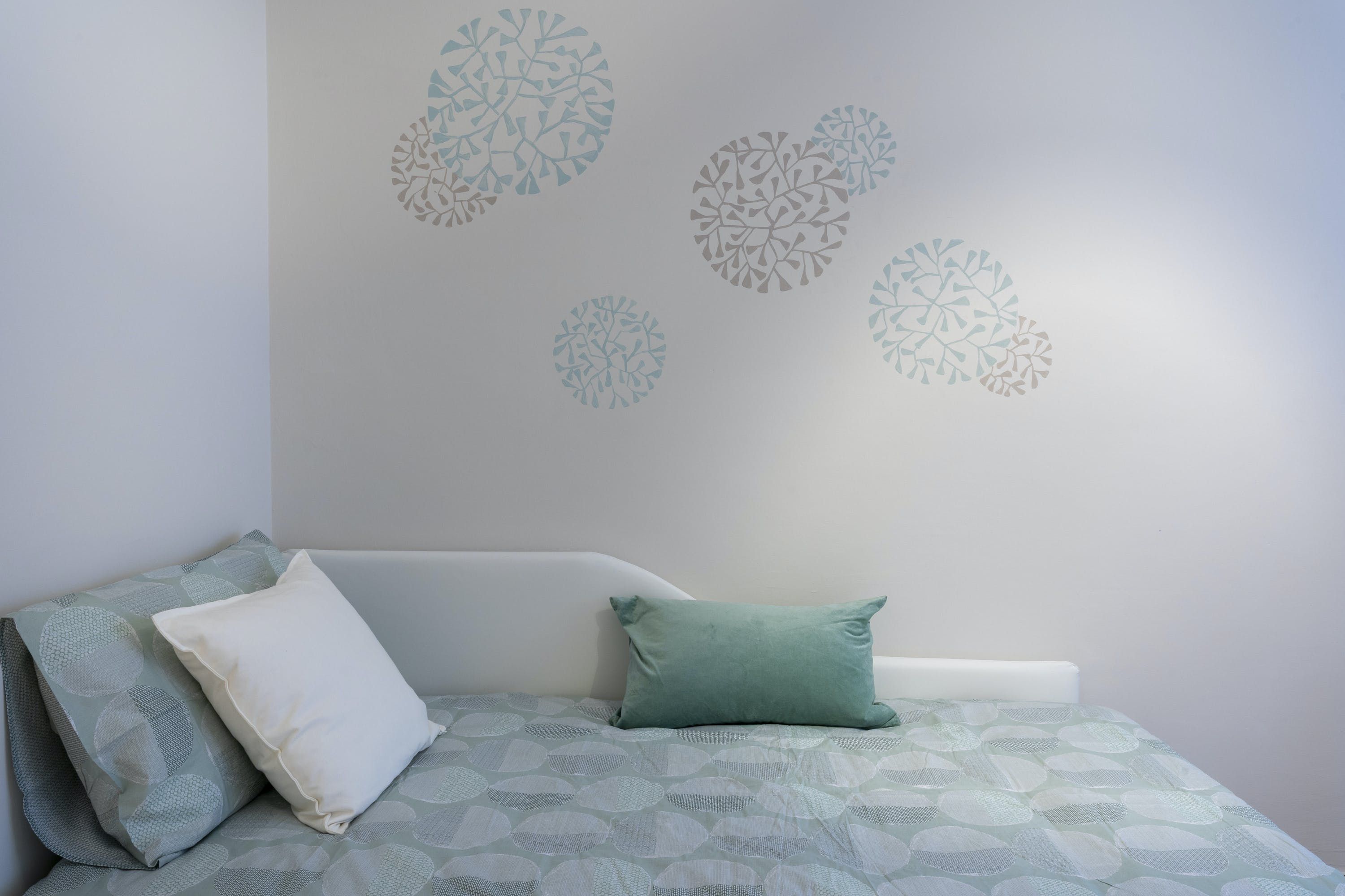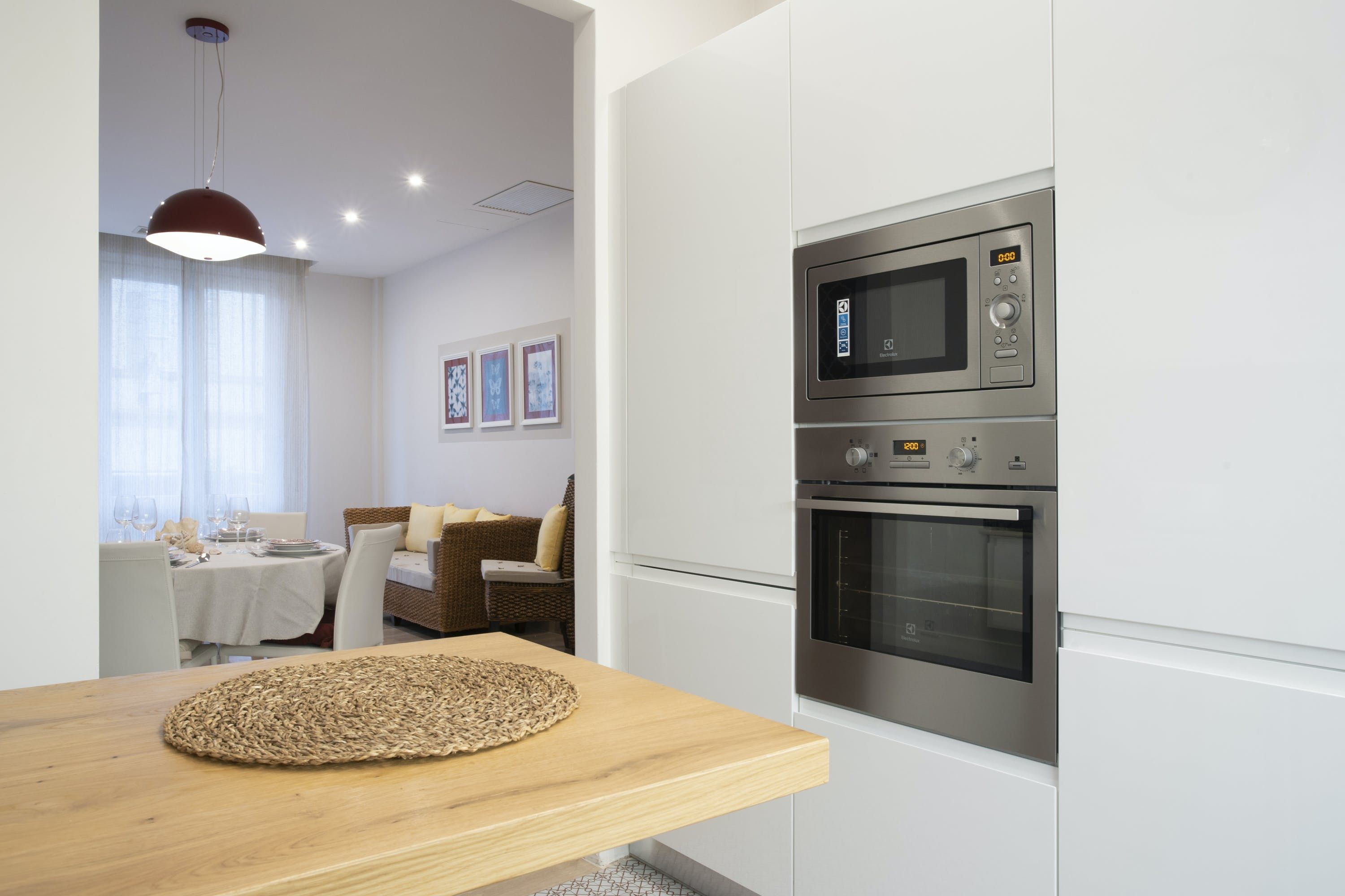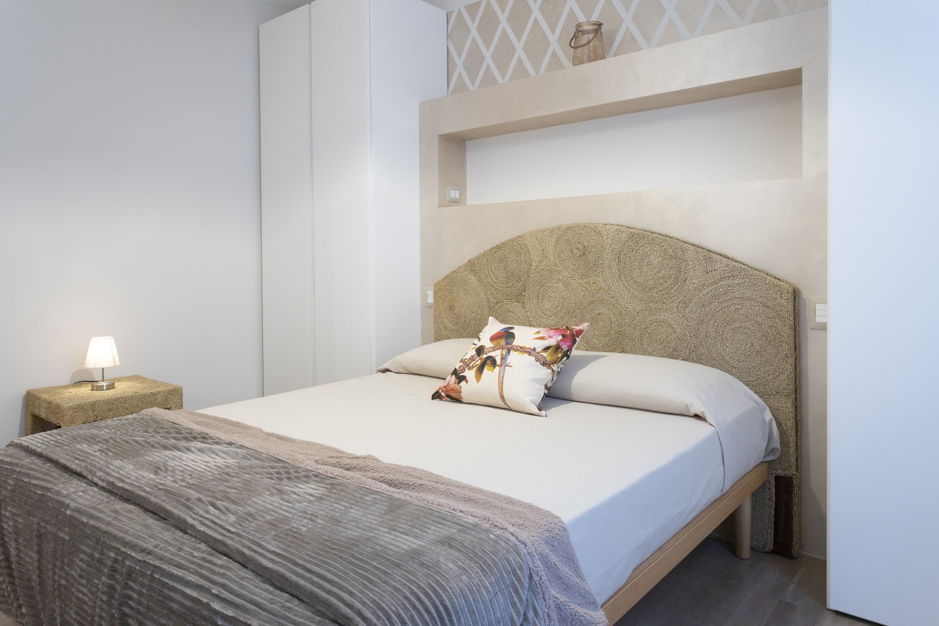 The apartment itself is an ideal city bolthole. Intricately carved teak furniture gives the open living room a Balinese calm feel and floor-to-ceiling corner windows keep things feeling light. The kitchen is sleek and modern, tucked away at the back and you can choose between the breakfast bar or dining table to uncork a bottle of local Sangiovese for social evenings in. We love the bedroom with the powder-blue feature wall and art nouveau paintings.