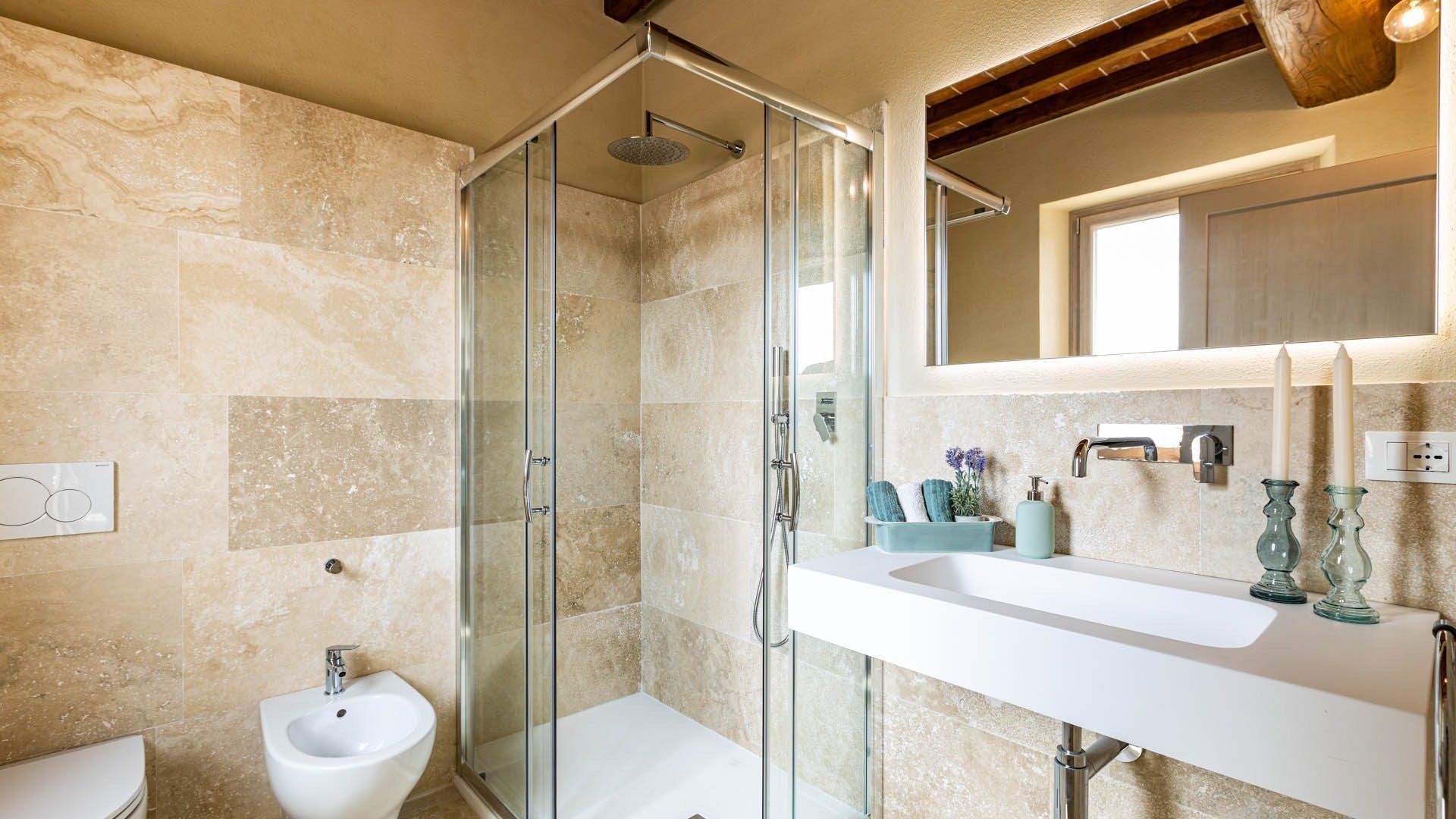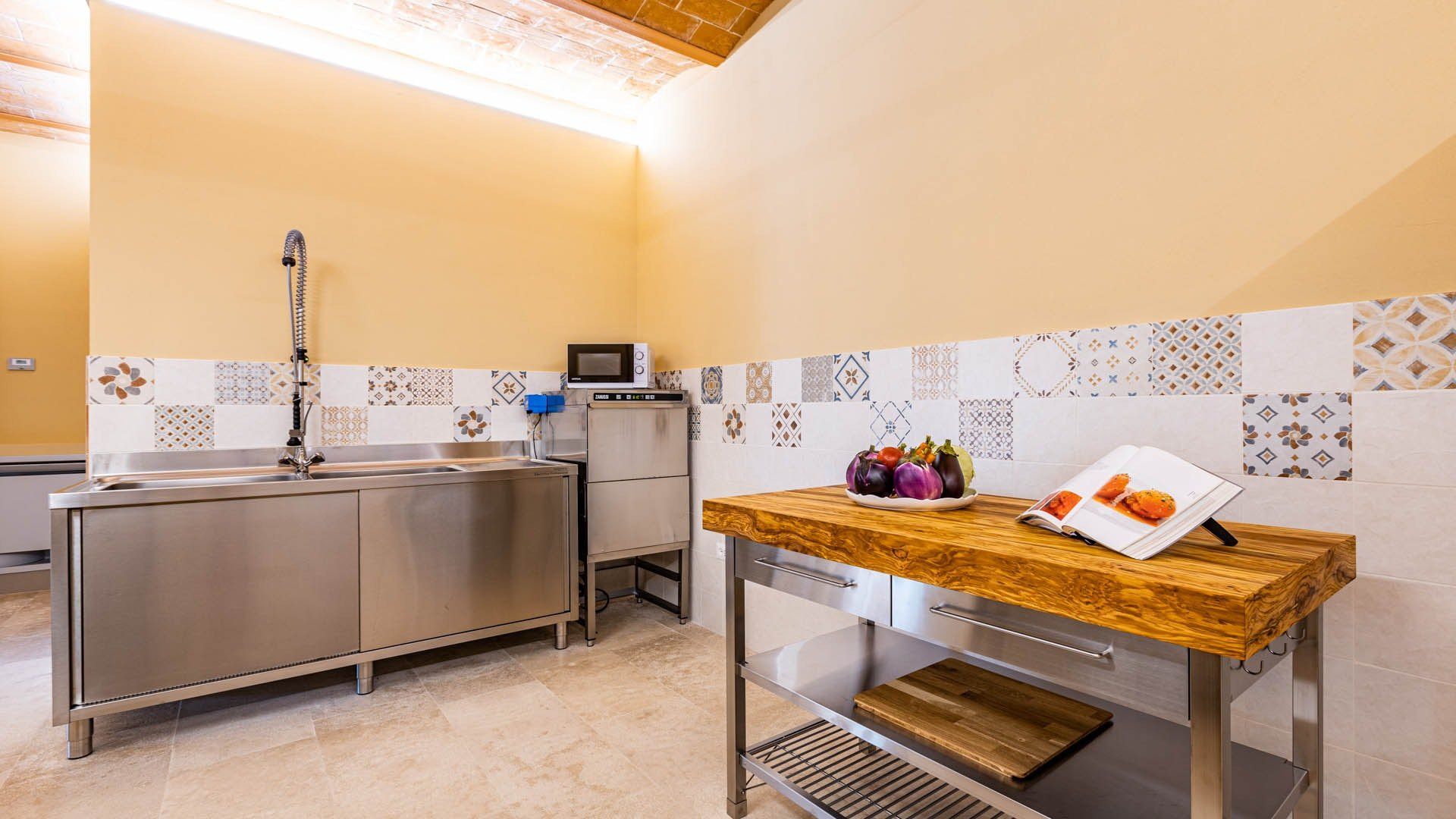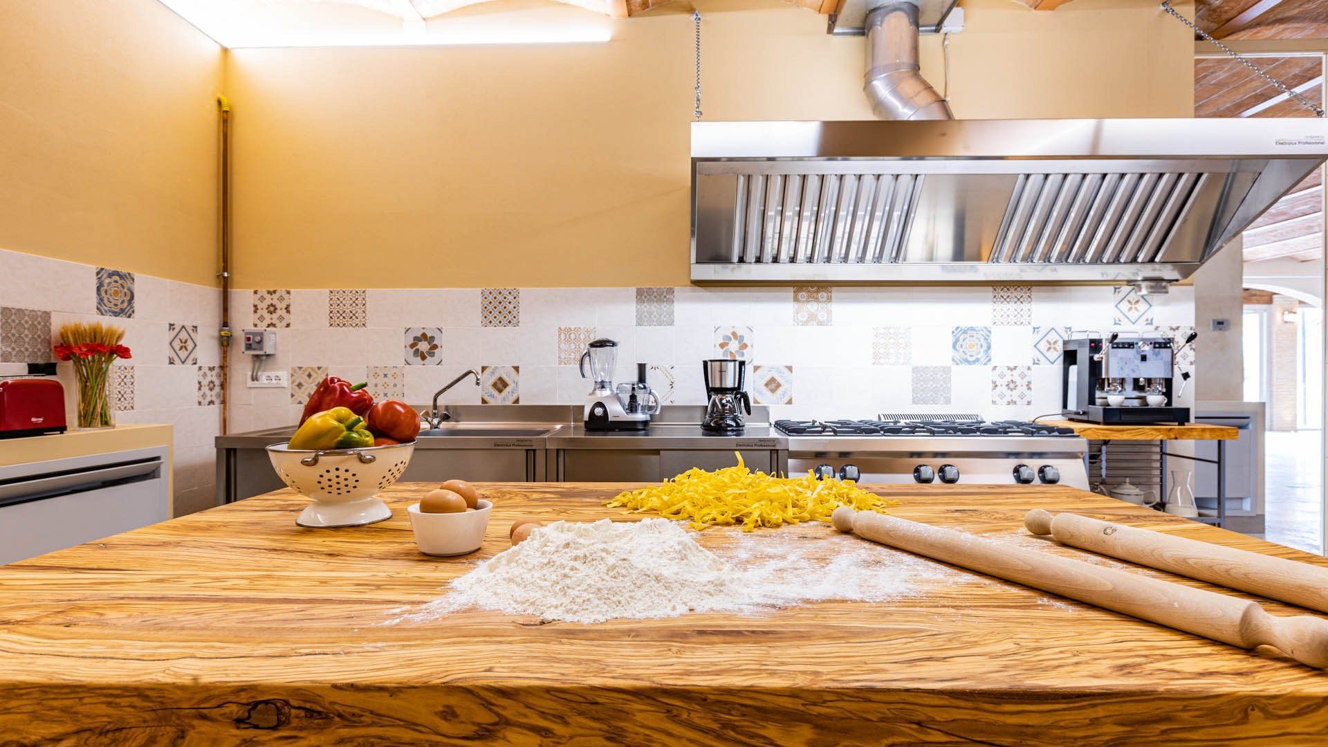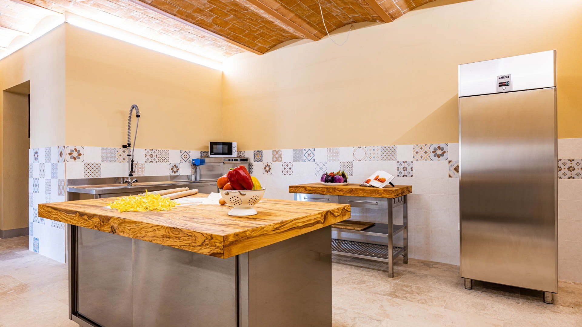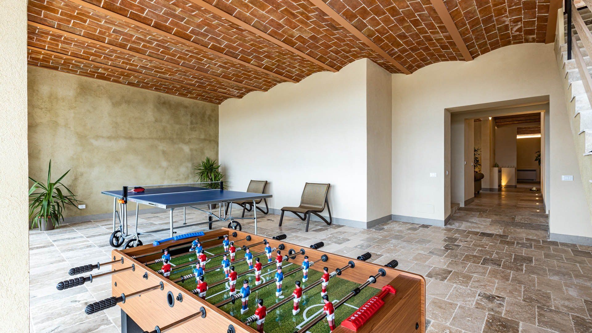 The villa may have the stone facade and arched windows of a traditional Tuscan farmhouse, but the wall of glass in the living and dining room is a testament to the 21st century. There’s more than enough room for the group to spread out and dine together at two banquet-sized tables inside. Unwind beneath a brick vaulted ceiling in the evening. Chefs will feel right at home in the kitchen – all chrome and steel like the professional kitchens of a Michelin-starred restaurant, but with a wood-topped pasta-making table straight out of a 19th-century farmhouse.