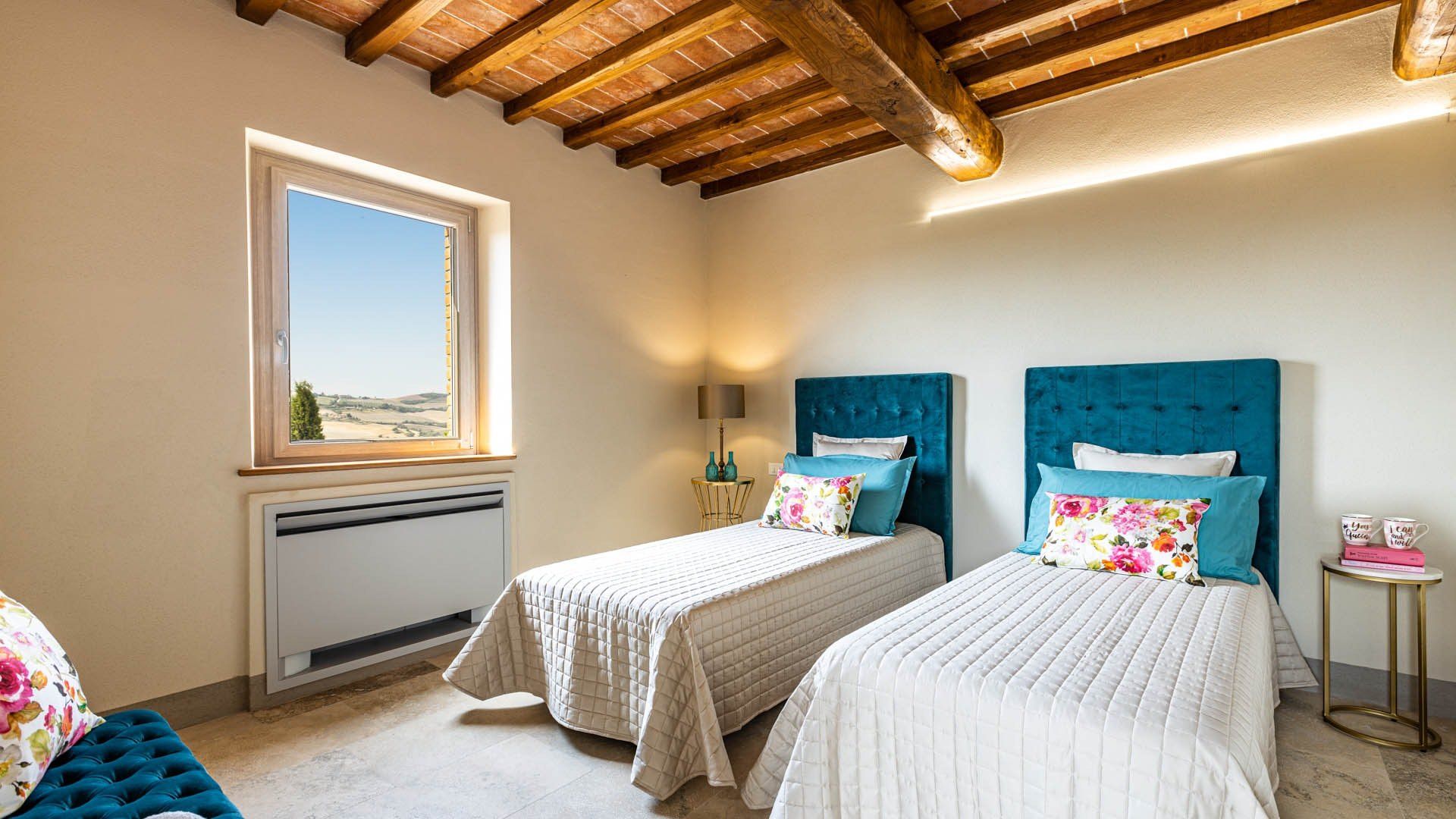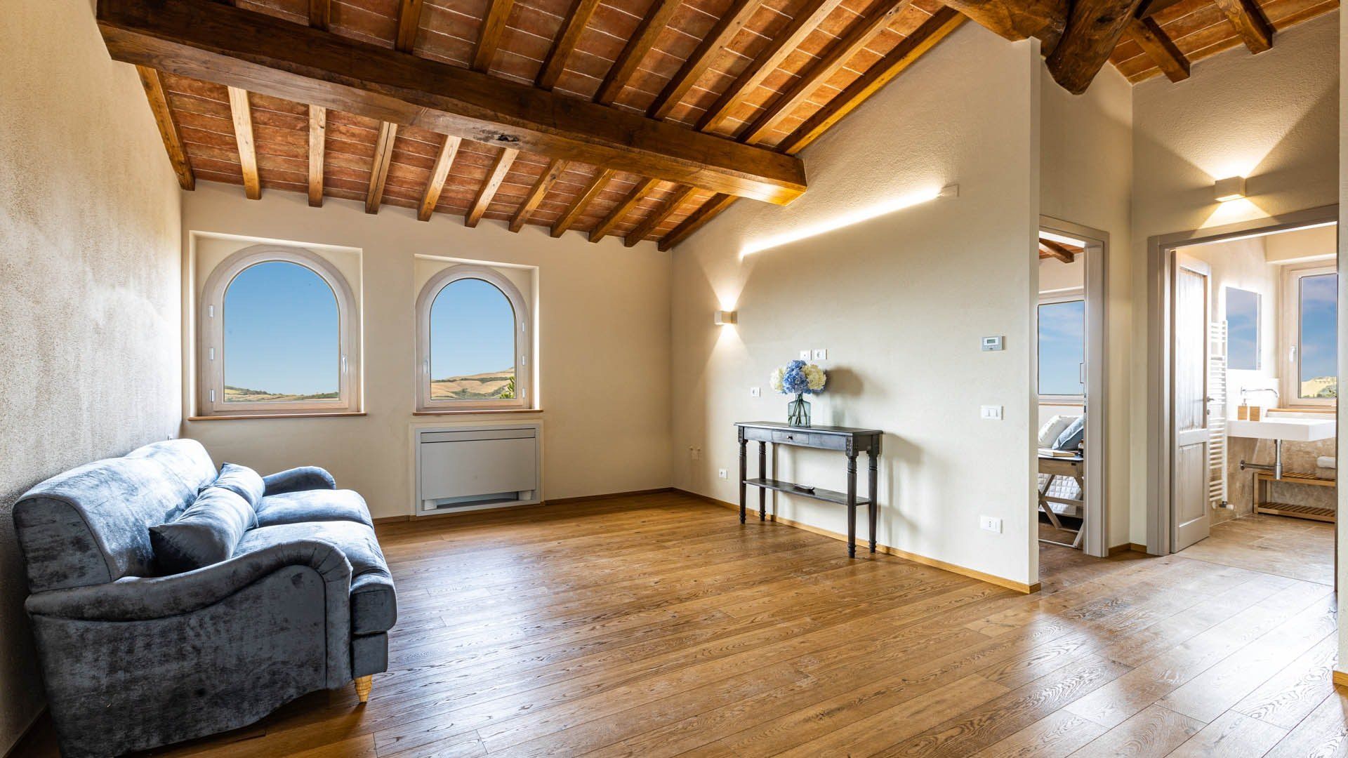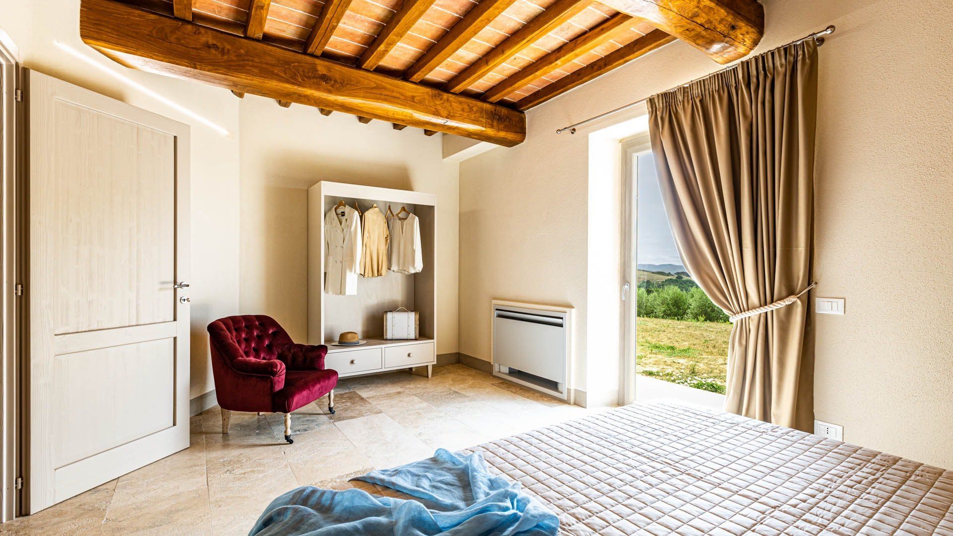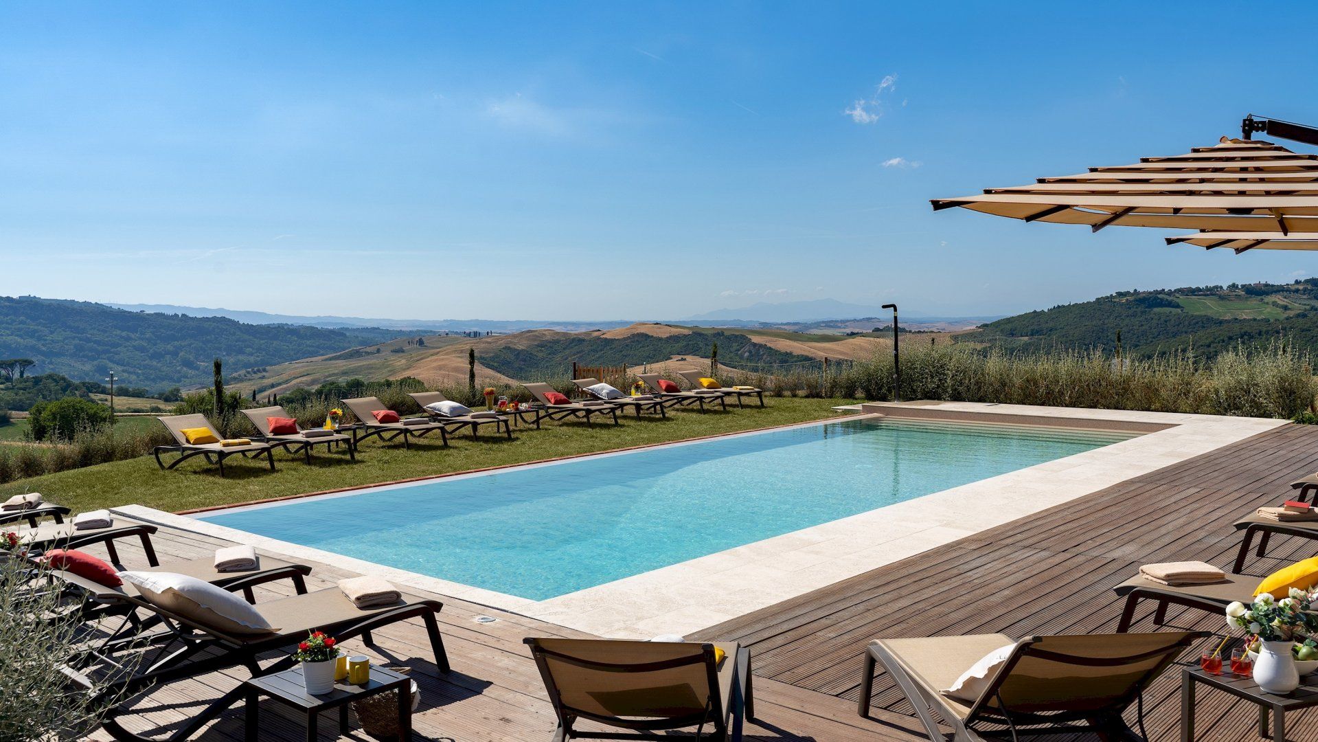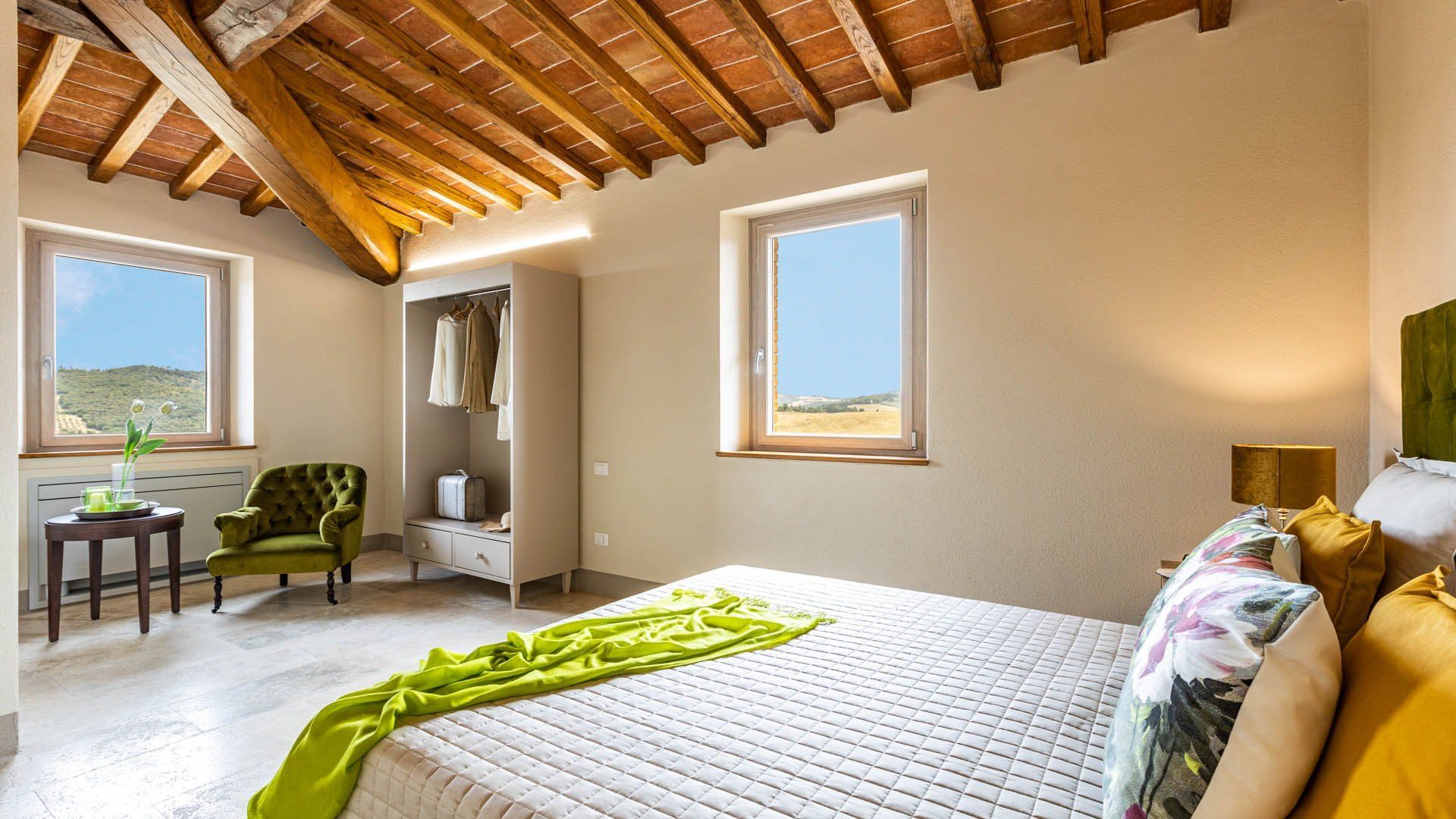 Panoramic views take centre stage outdoors, where raised terraces can provide shaded spots for meals outside. From a poolside lounger, you can admire the forest-clad hills around you, before slipping into the turquoise pool to cool off from the sun. Aperitivo is best served on the first-floor terrace, where comfy seating looks out over the countryside.