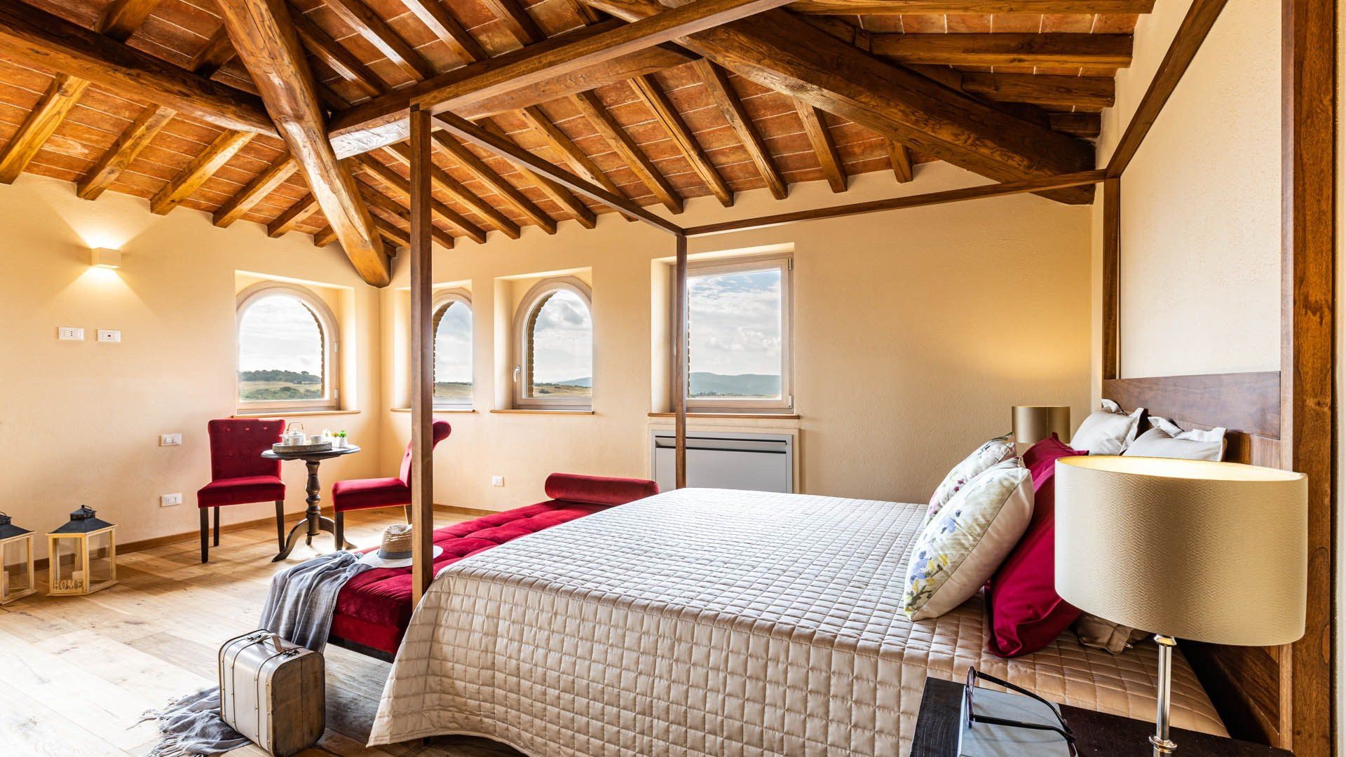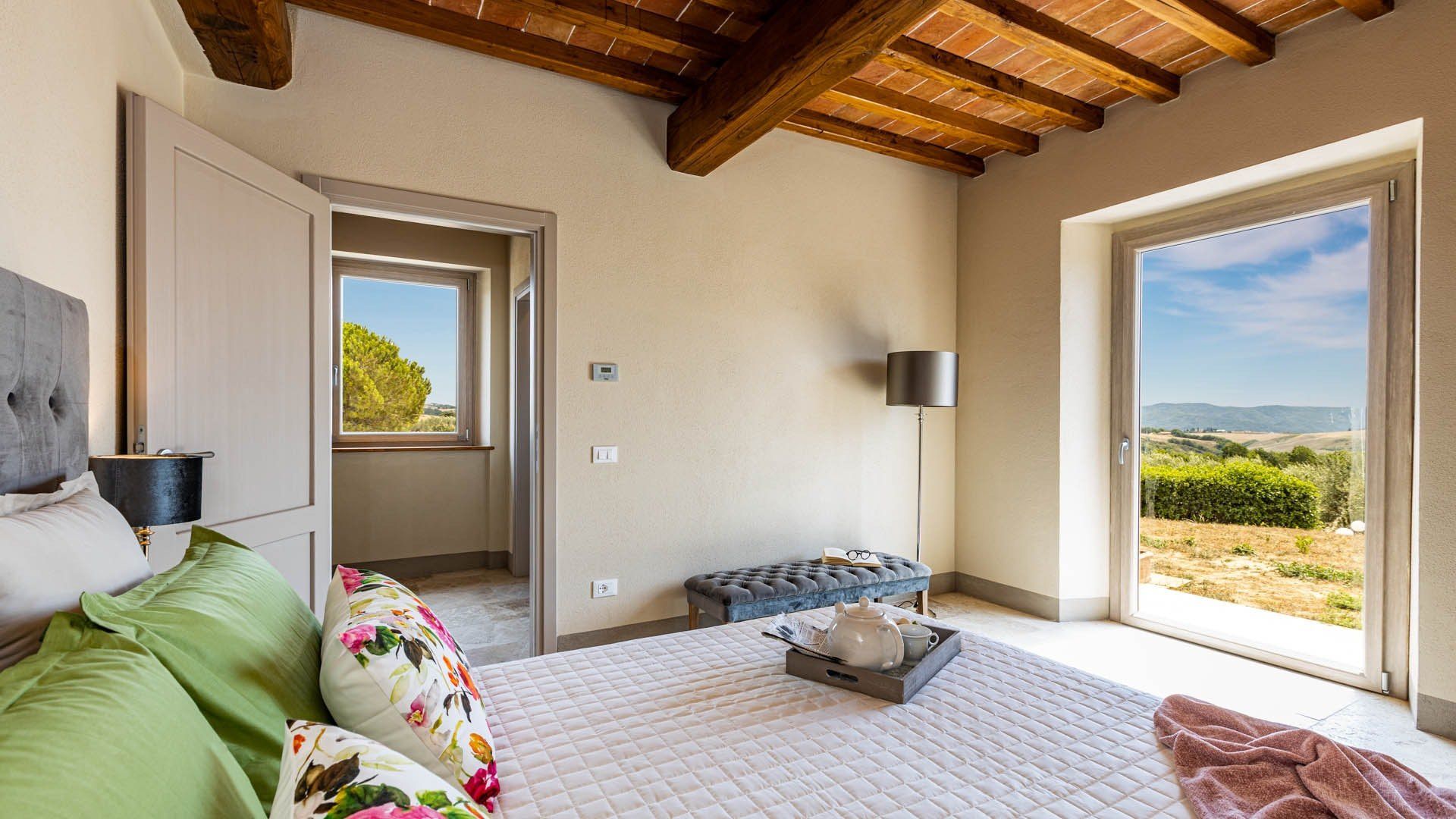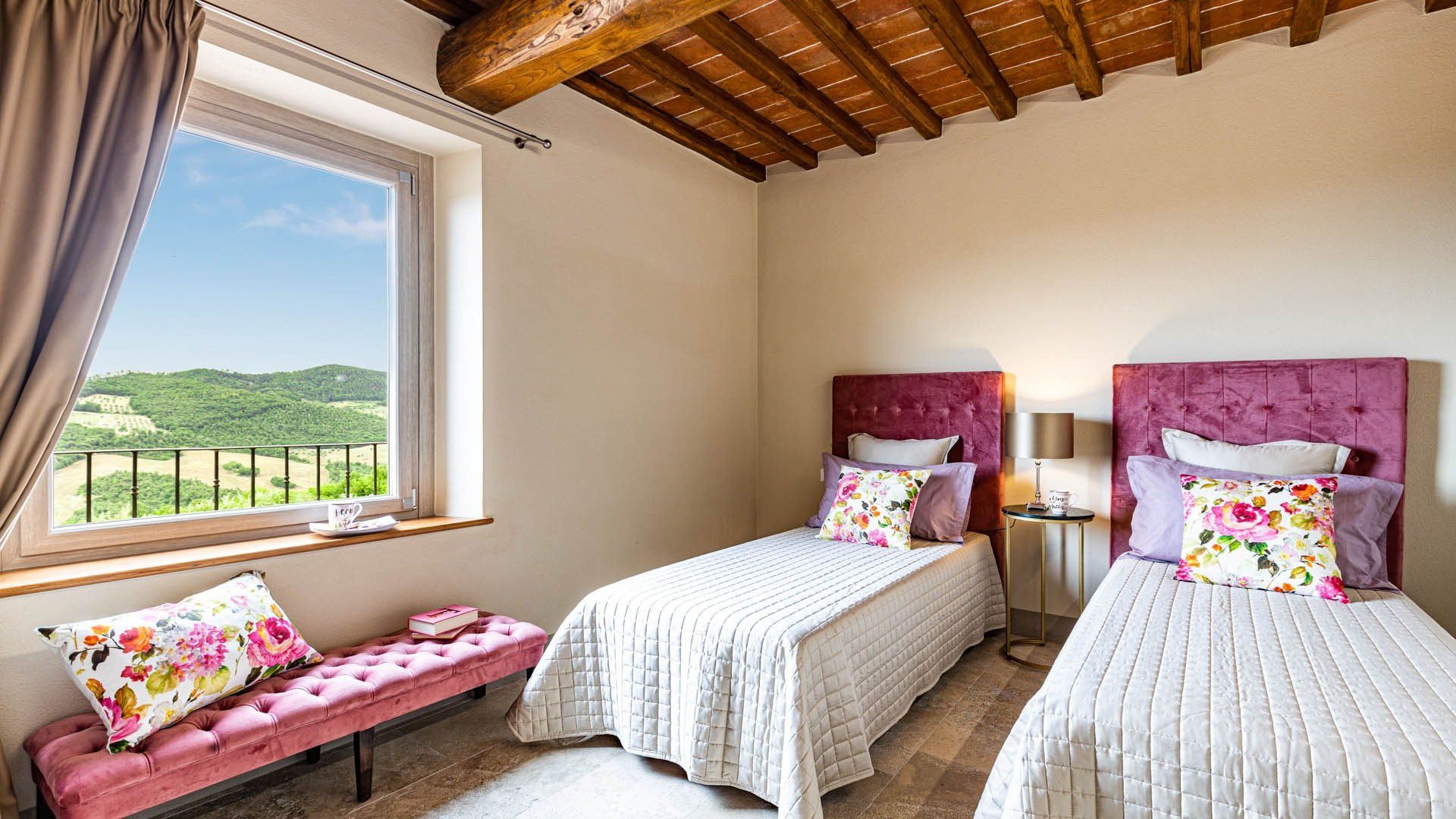 In the undulating Tuscan countryside, this villa sits atop a hill, right on the ancient oil and wine route through olive groves and vineyards. It’s a fifteen-minute drive from Volterra, a medieval walled town with plenty of farm-to-table restaurants and old churches to explore. And Siena is just under an hour’s drive for a day trip.
