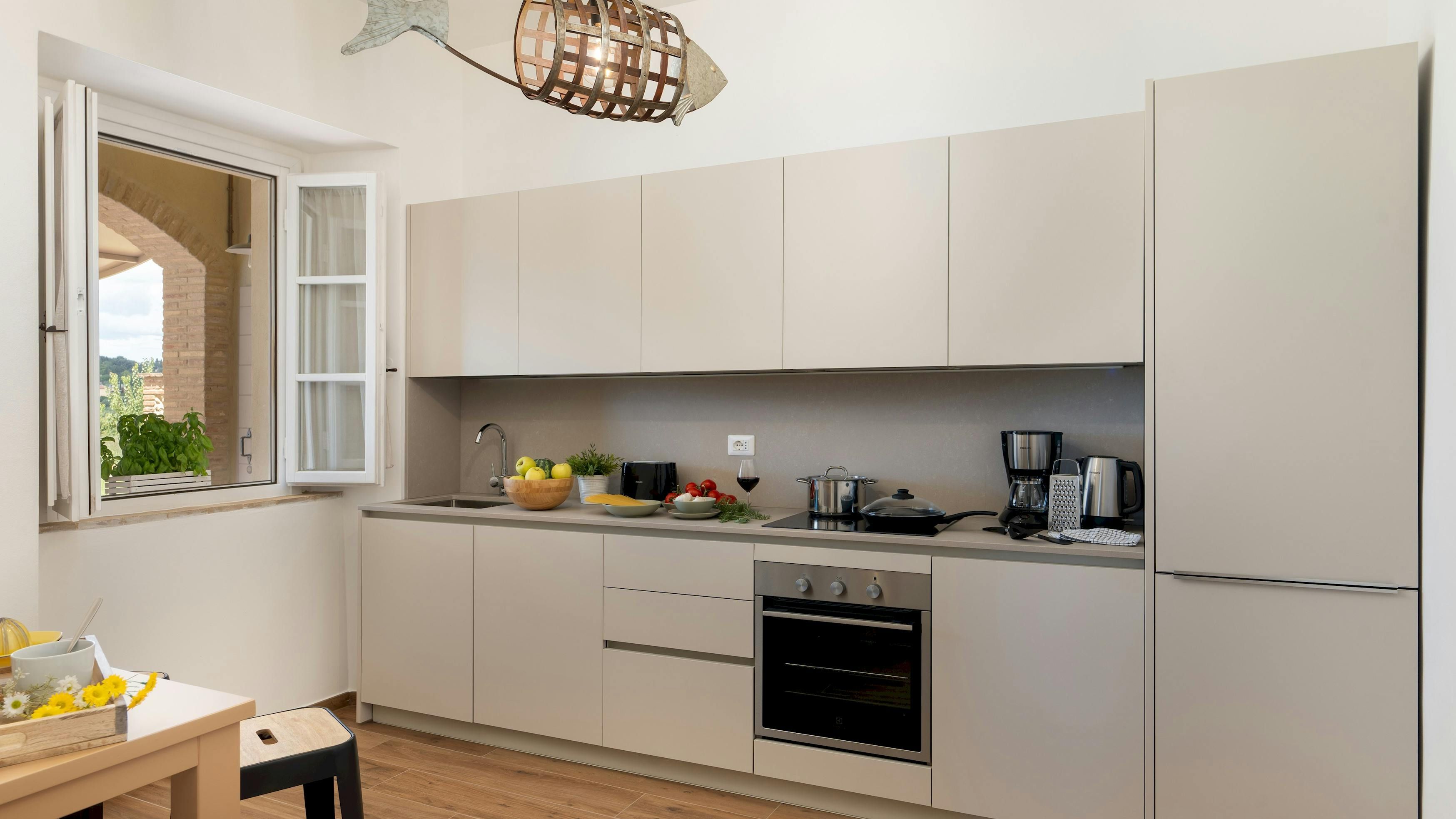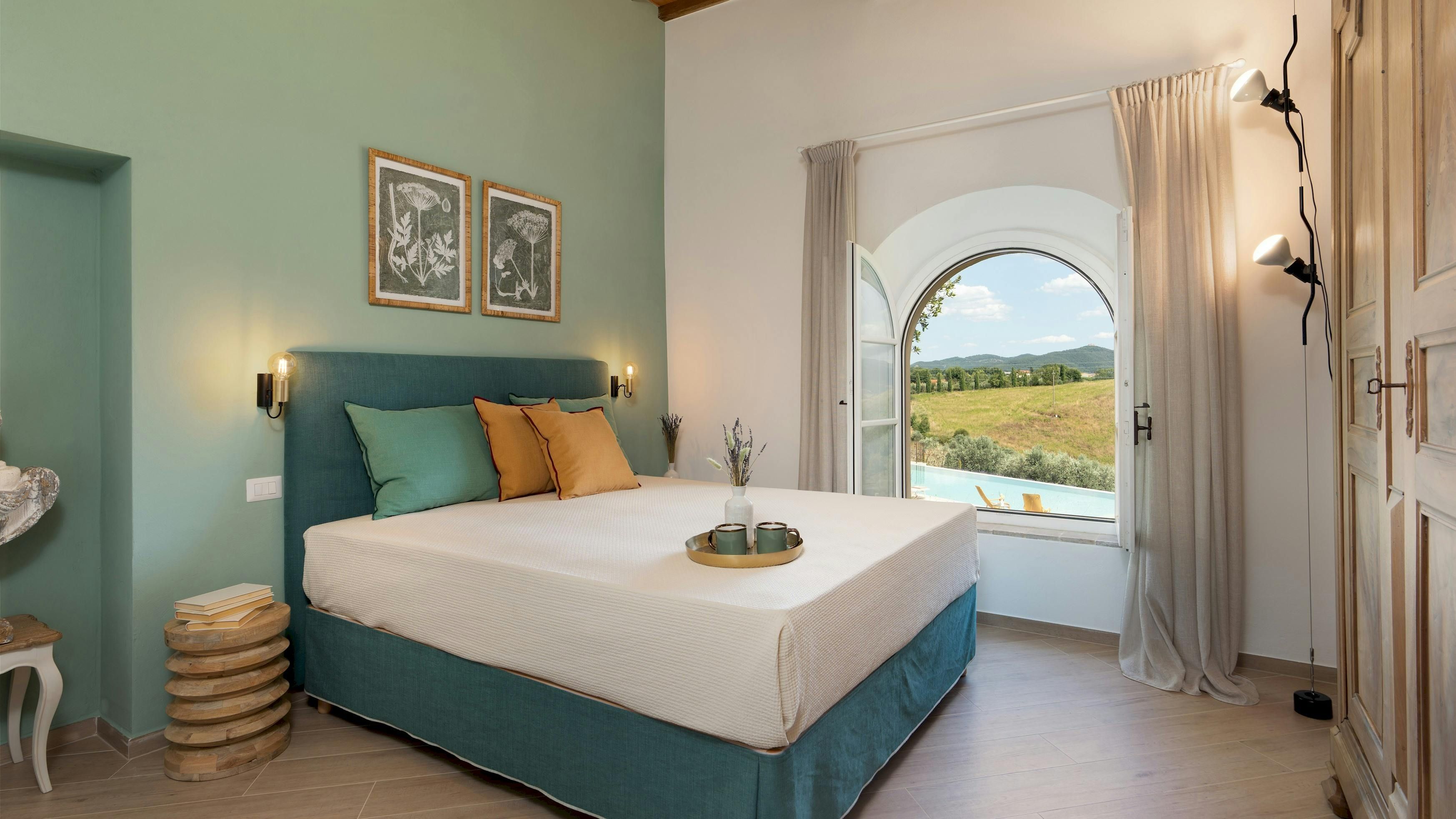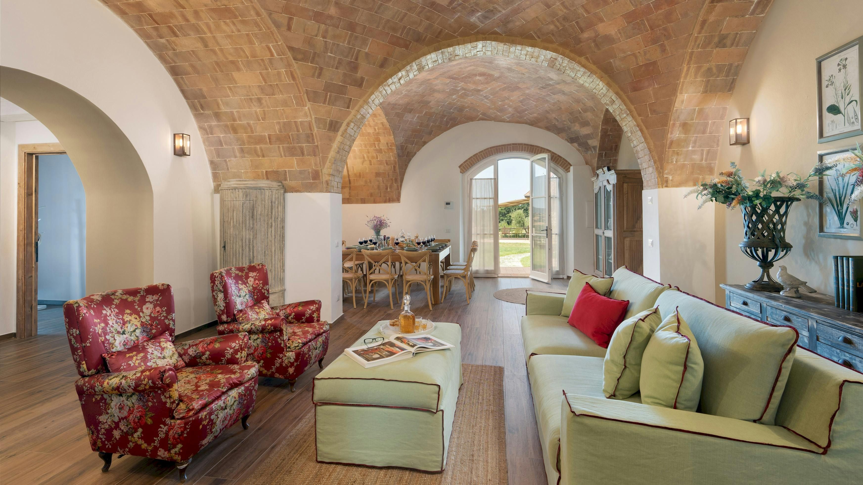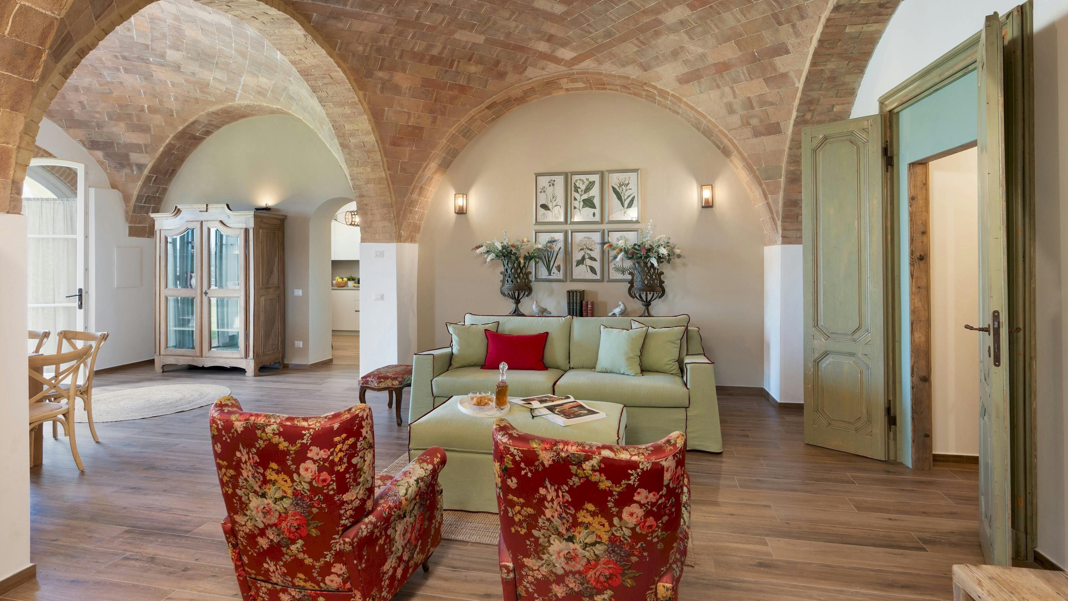 This Tuscan home is something special. It’s in the Val di Cecina, close to the medieval town of Pomarance, with its historic castle and walls. The villa – comprising four residential units – is perfect for several families as there’s plenty of space to spend time together while still enjoying privacy. From its position in the hills, the villa offers beautiful views of the surrounding landscape, which can be admired from the well-kept garden and terracotta outdoor dining area. The scent of verbena, lilies, and rosemary pervades the garden. This stylish and elegant home has been renovated to add modern comforts while retaining all the charm of a typical Tuscan farmhouse.