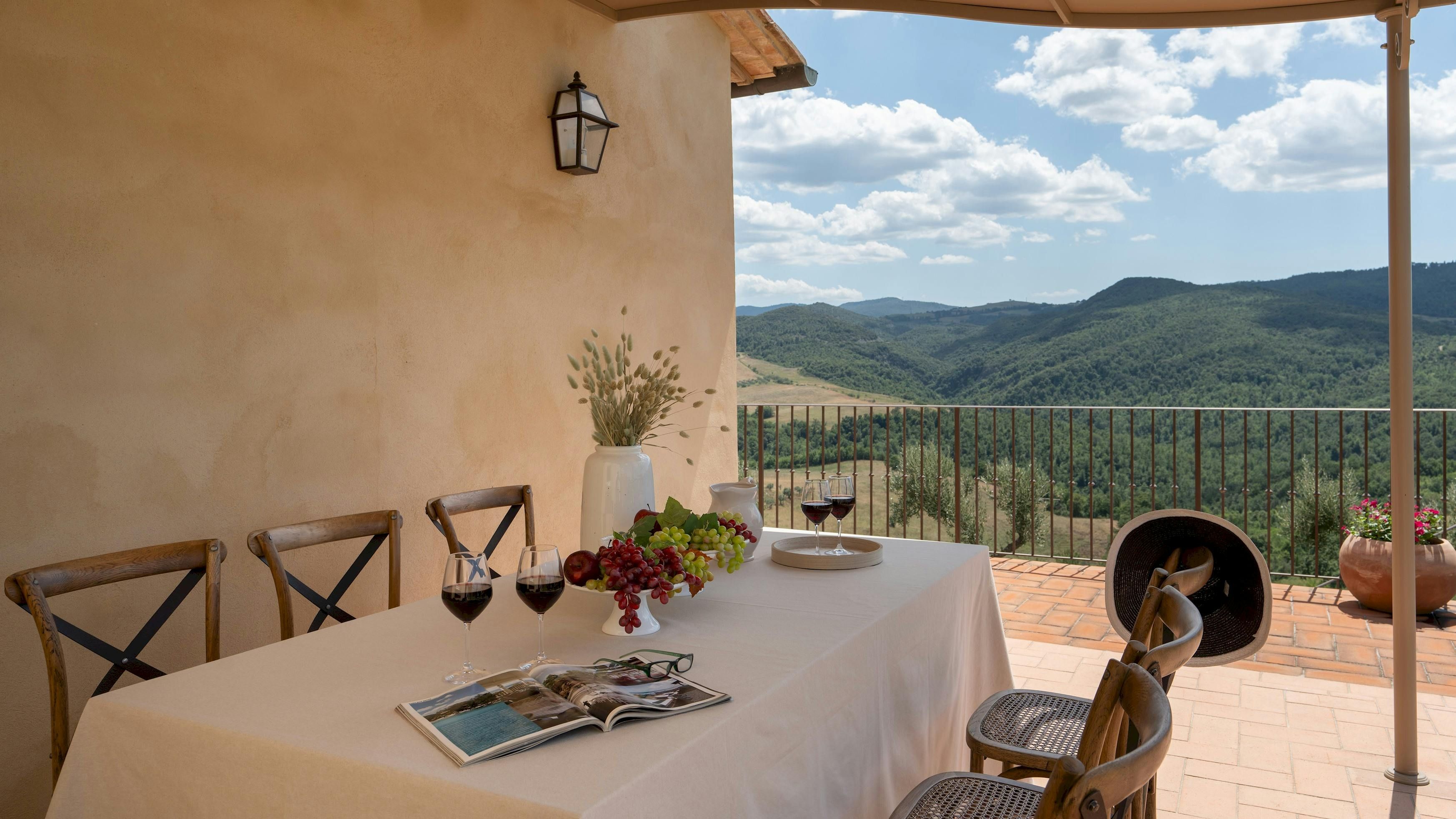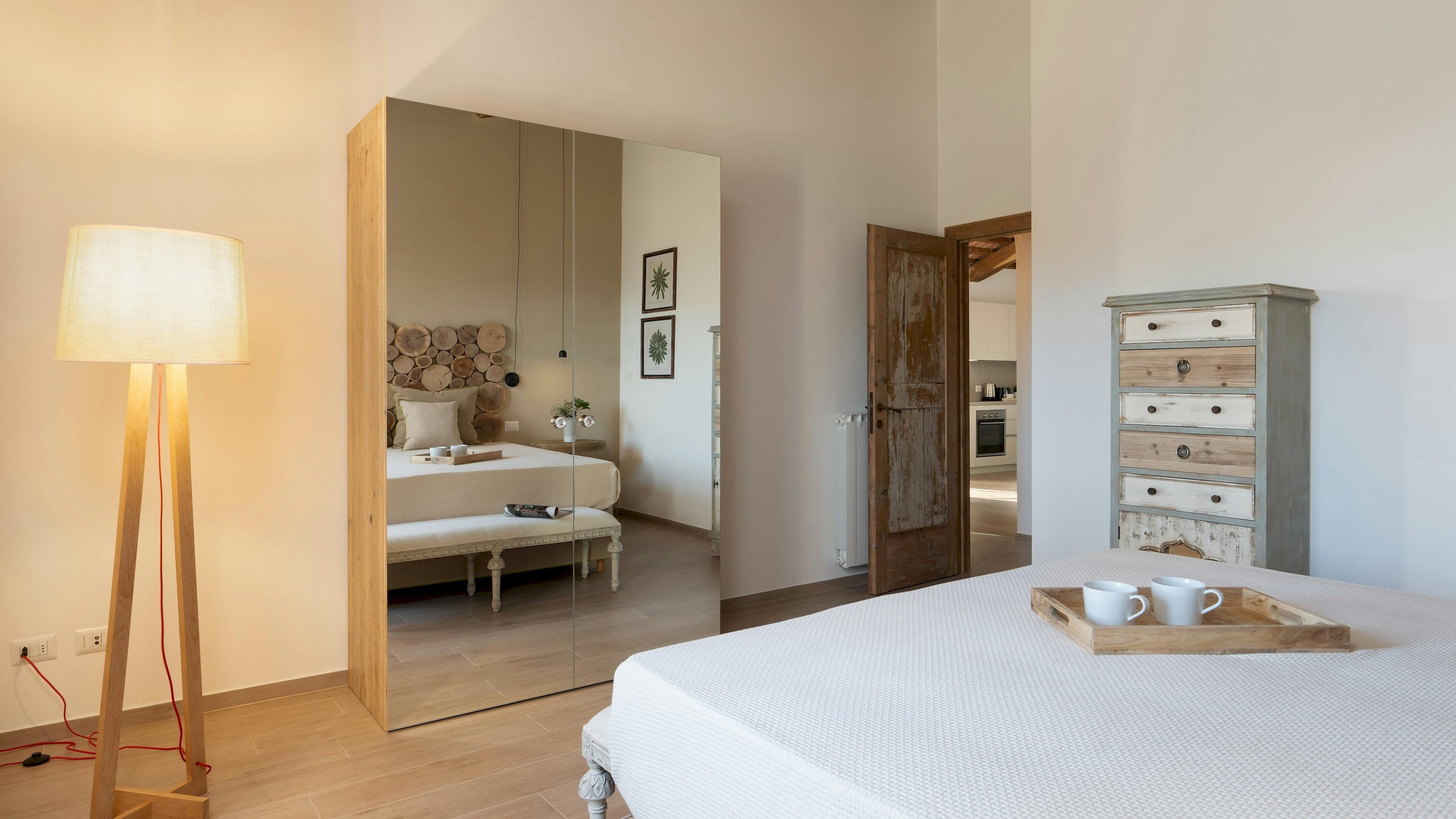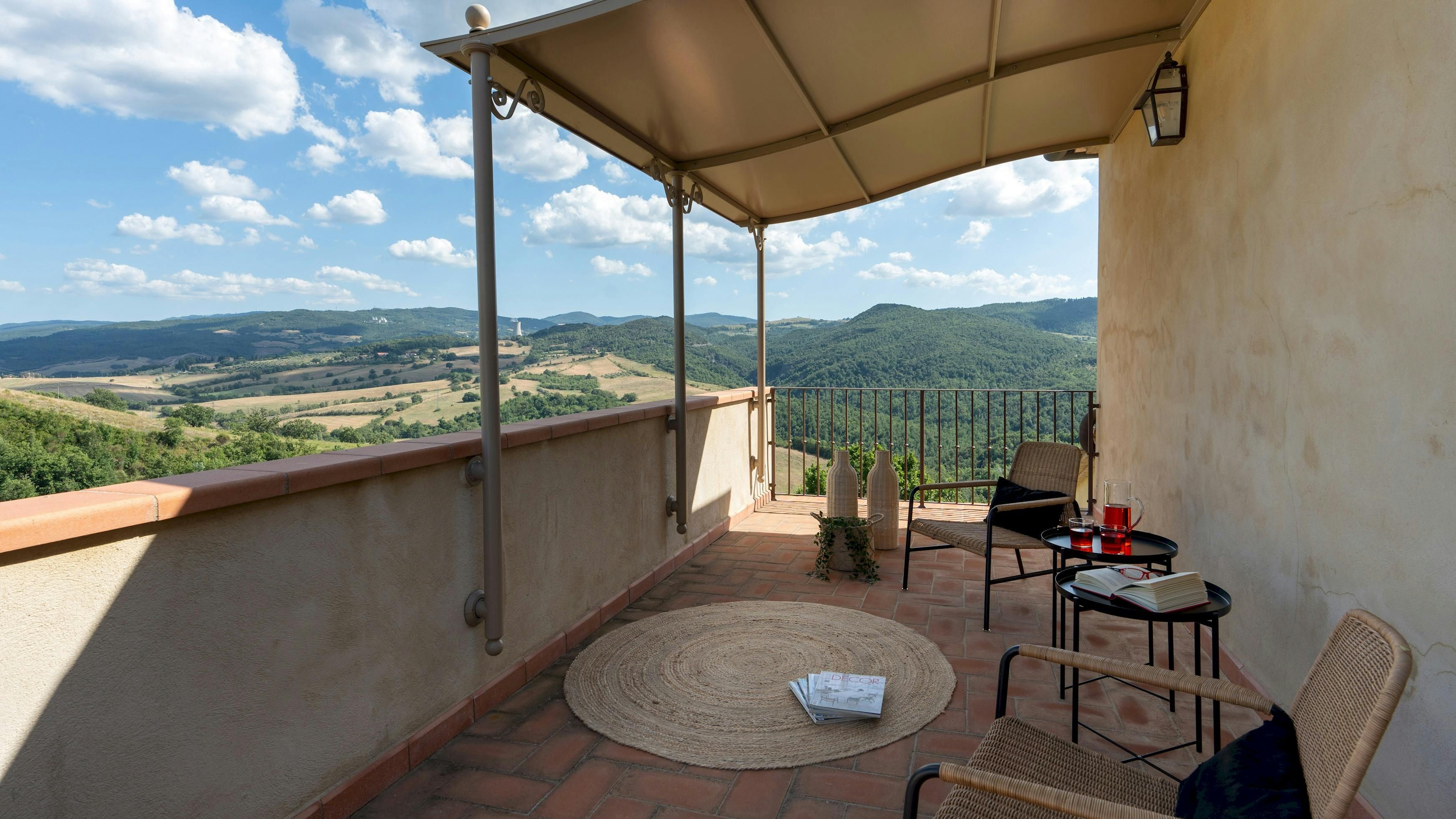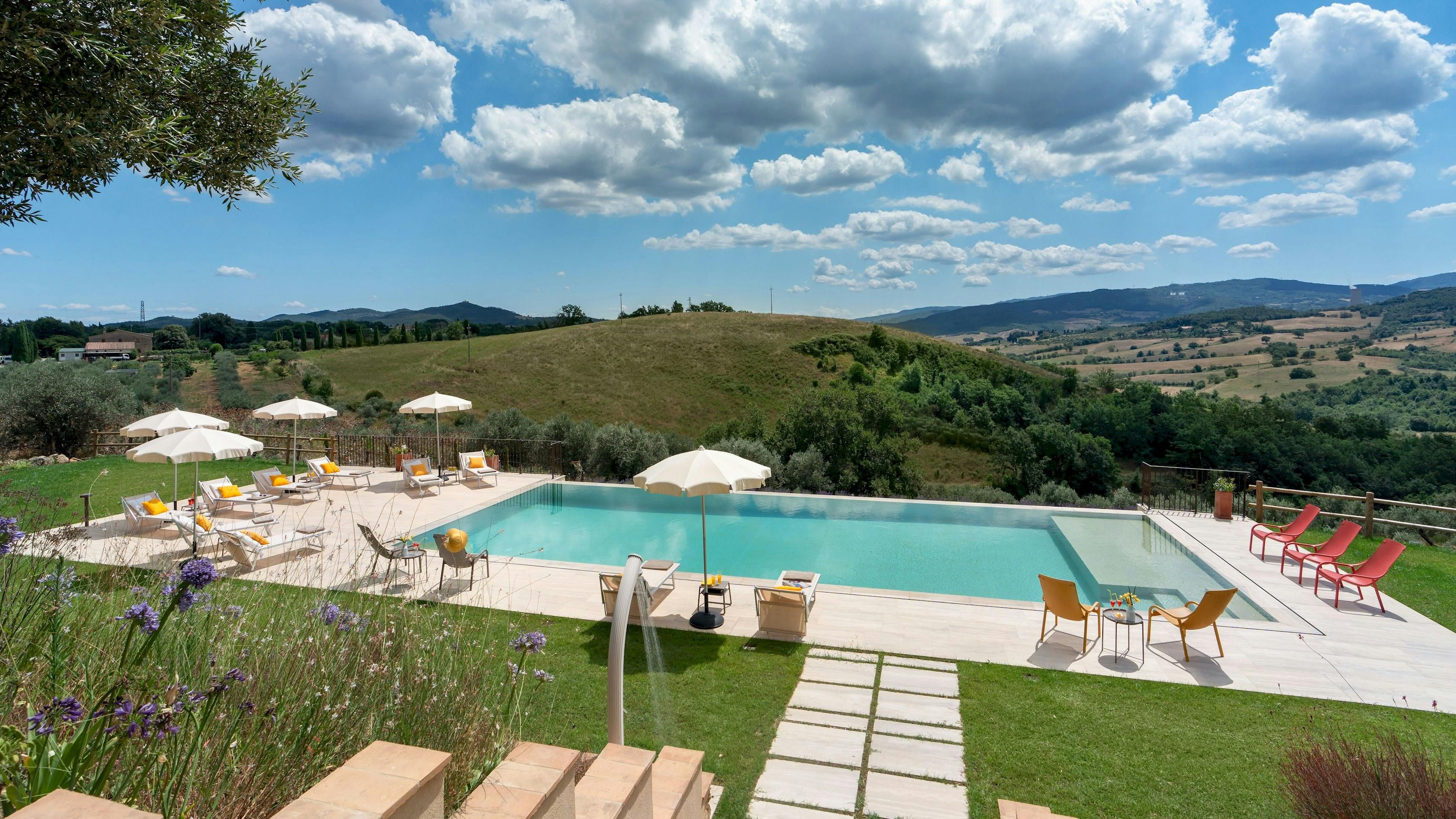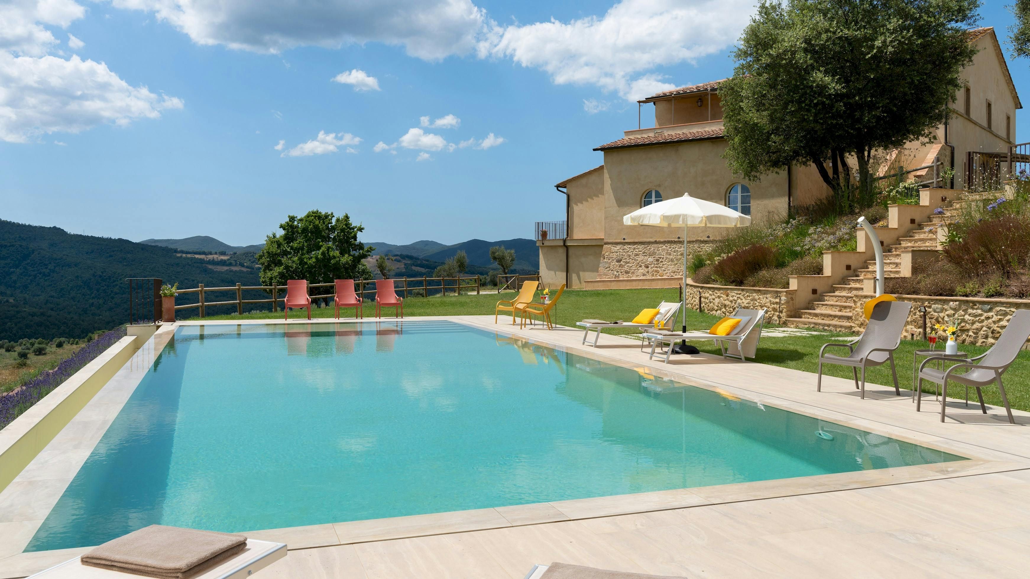 This Tuscan home is something special. It’s in the Val di Cecina, close to the medieval town of Pomarance, with its historic castle and walls. The villa – comprising four residential units – is perfect for several families as there’s plenty of space to spend time together while still enjoying privacy. From its position in the hills, the villa offers beautiful views of the surrounding landscape, which can be admired from the well-kept garden and terracotta outdoor dining area. The scent of verbena, lilies, and rosemary pervades the garden. This stylish and elegant home has been renovated to add modern comforts while retaining all the charm of a typical Tuscan farmhouse.