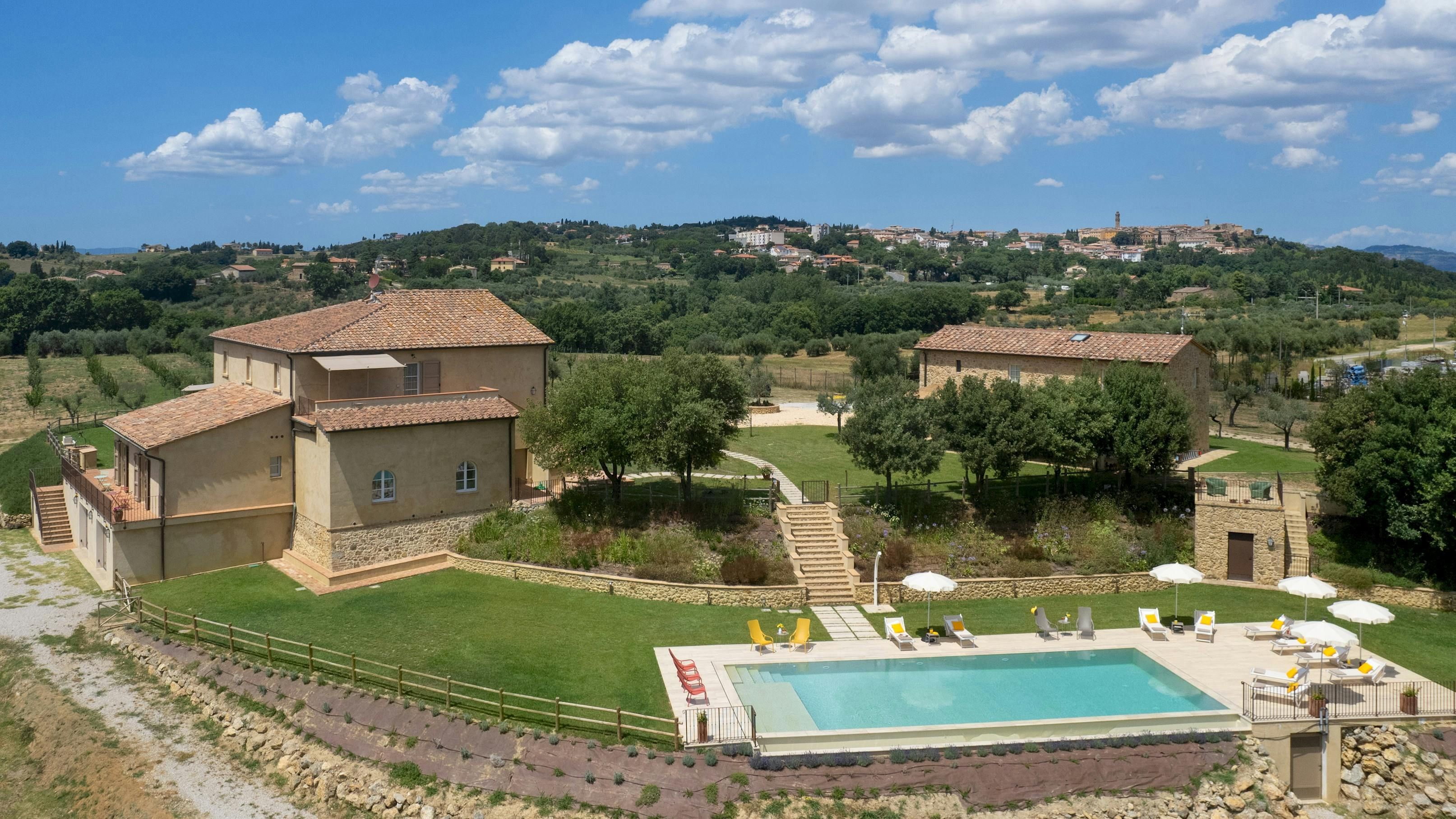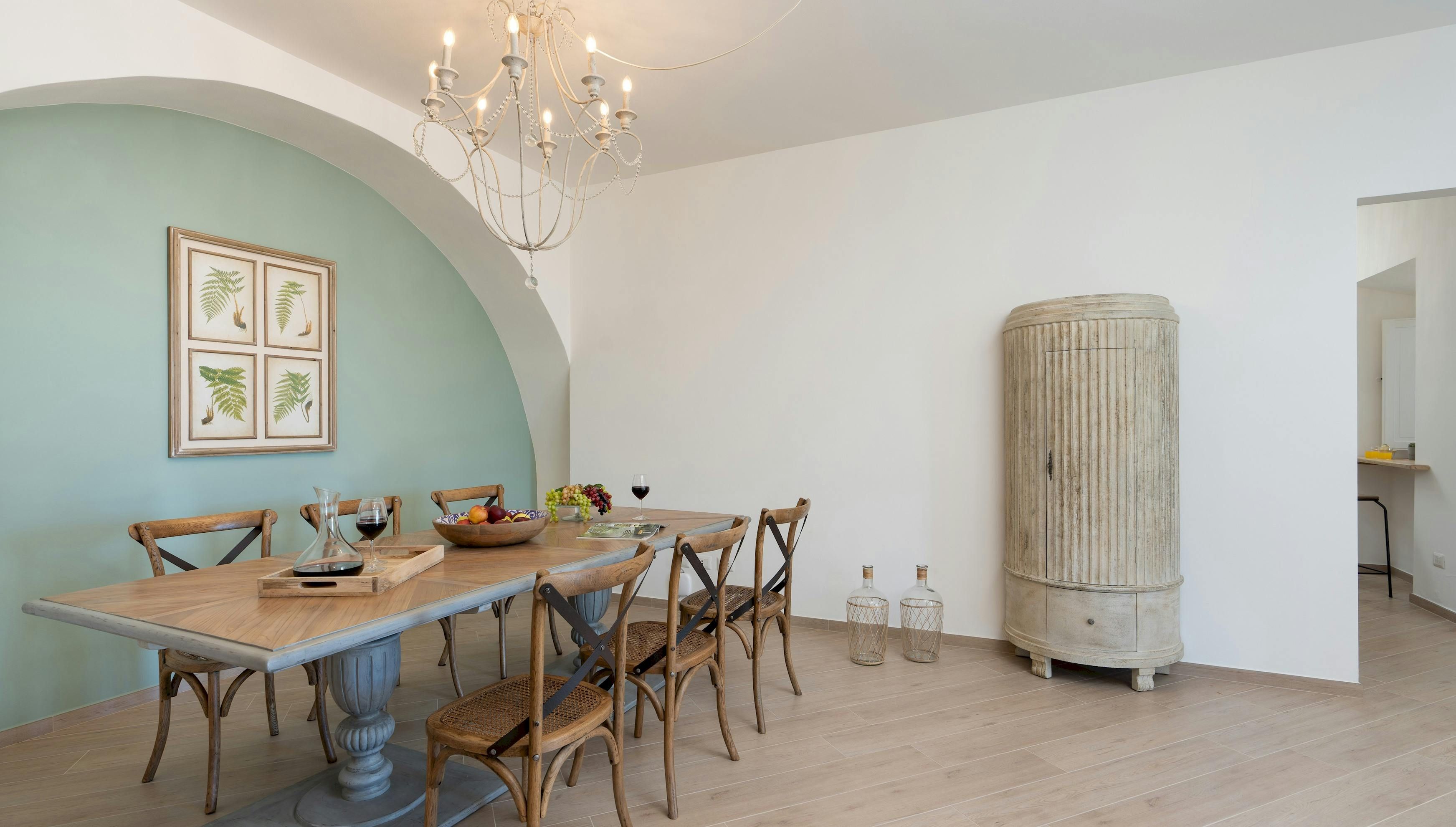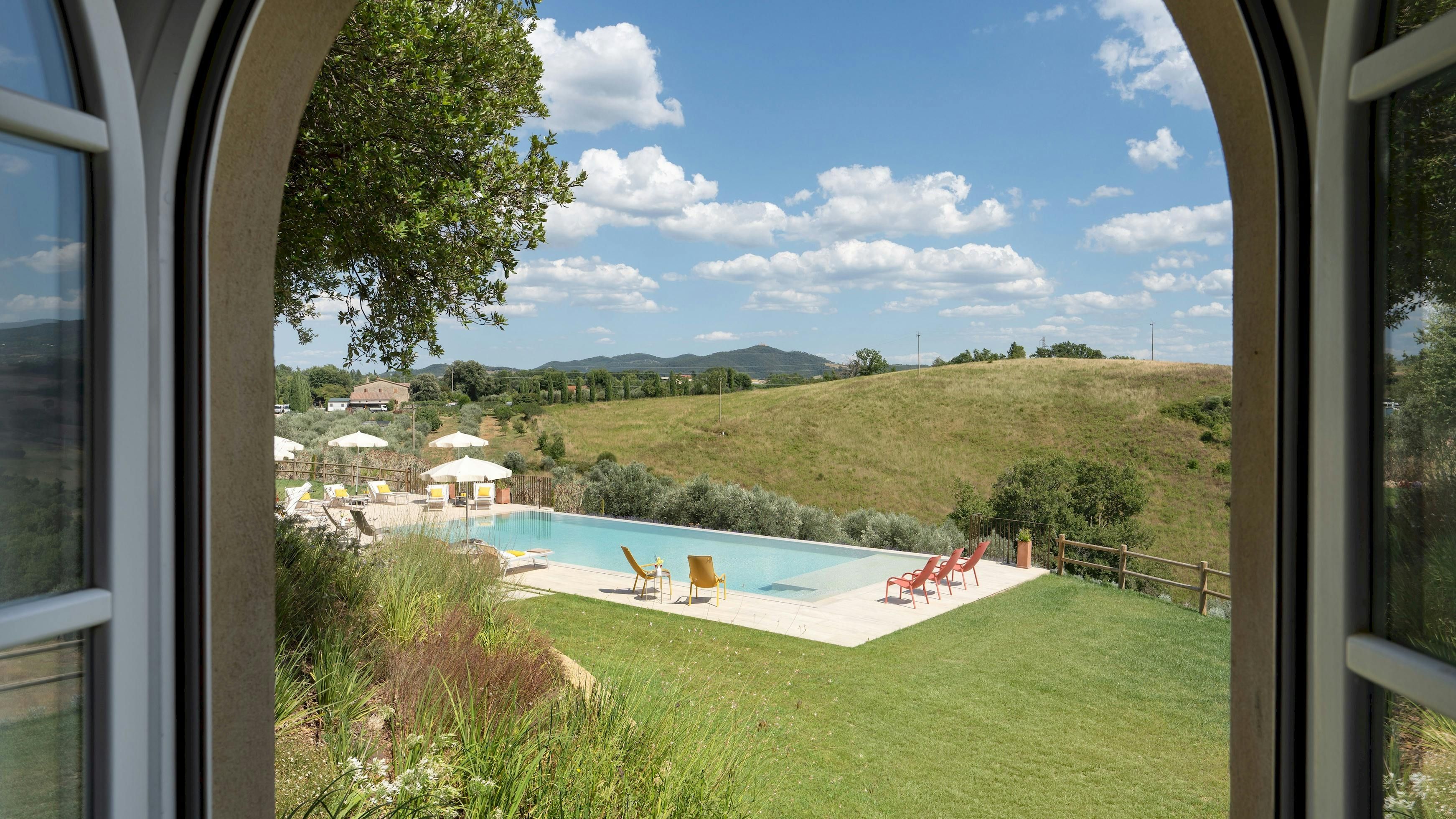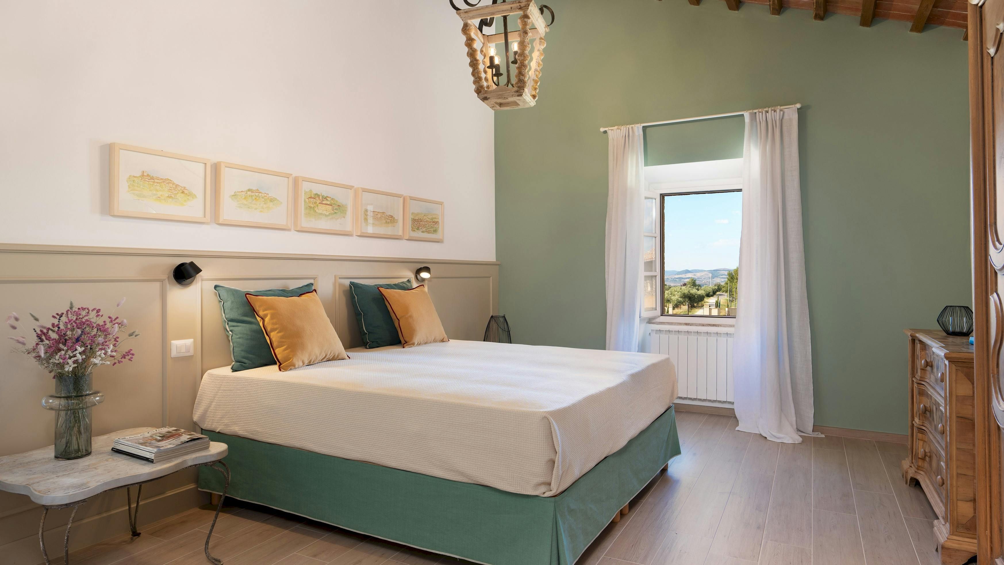 This Tuscan home is something special. It’s in the Val di Cecina, close to the medieval town of Pomarance, with its historic castle and walls. The villa – comprising four residential units – is perfect for several families as there’s plenty of space to spend time together while still enjoying privacy. From its position in the hills, the villa offers beautiful views of the surrounding landscape, which can be admired from the well-kept garden and terracotta outdoor dining area. The scent of verbena, lilies, and rosemary pervades the garden. This stylish and elegant home has been renovated to add modern comforts while retaining all the charm of a typical Tuscan farmhouse.