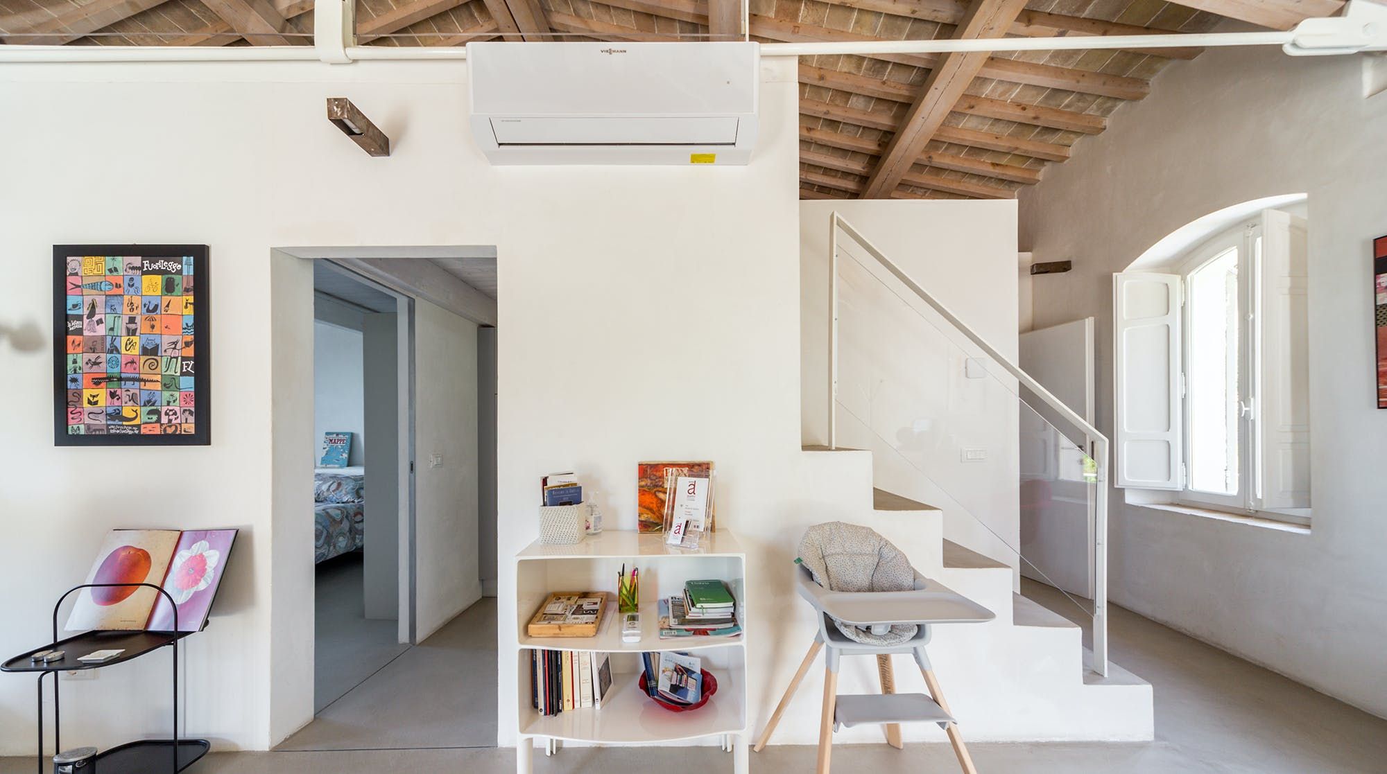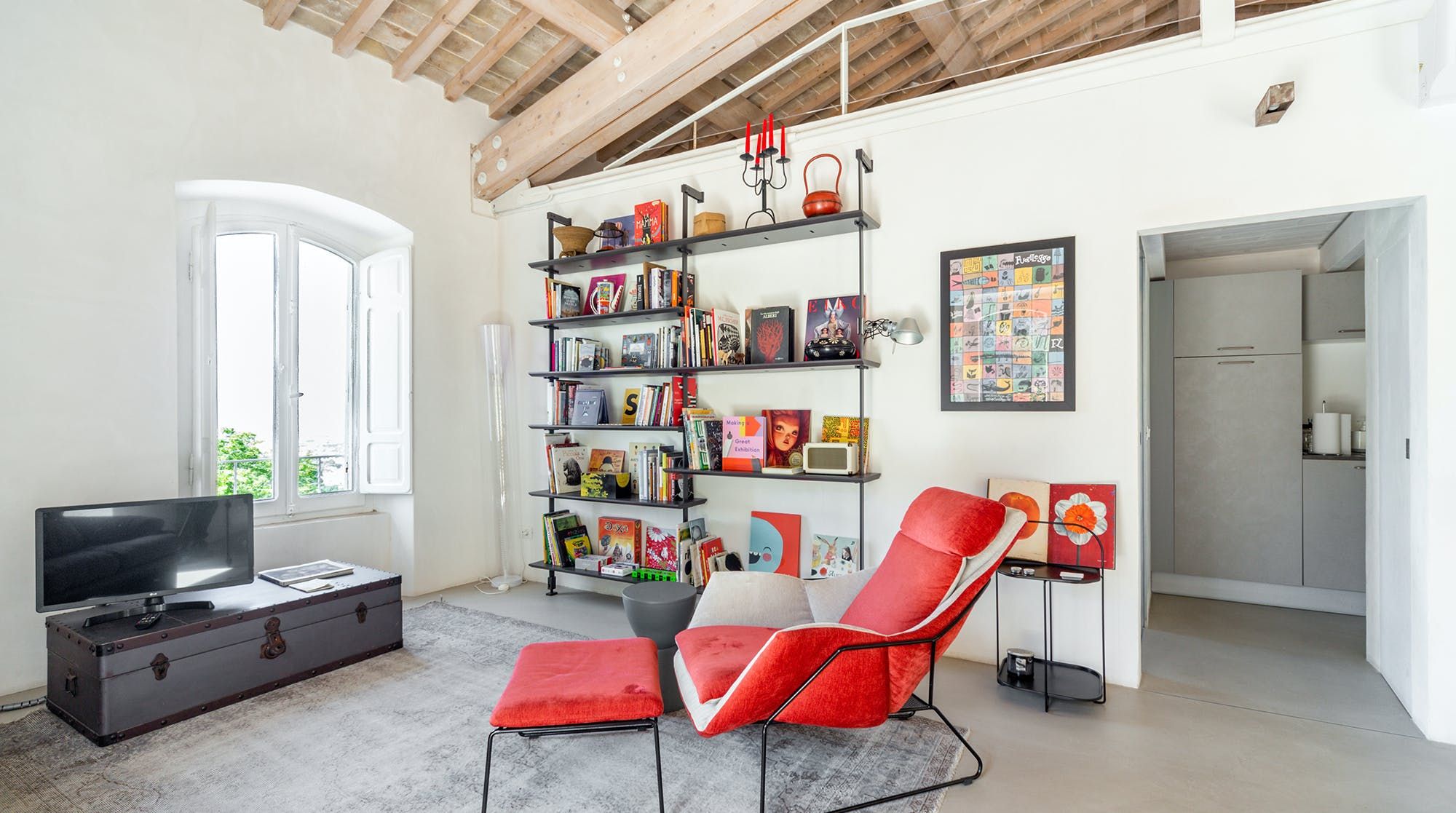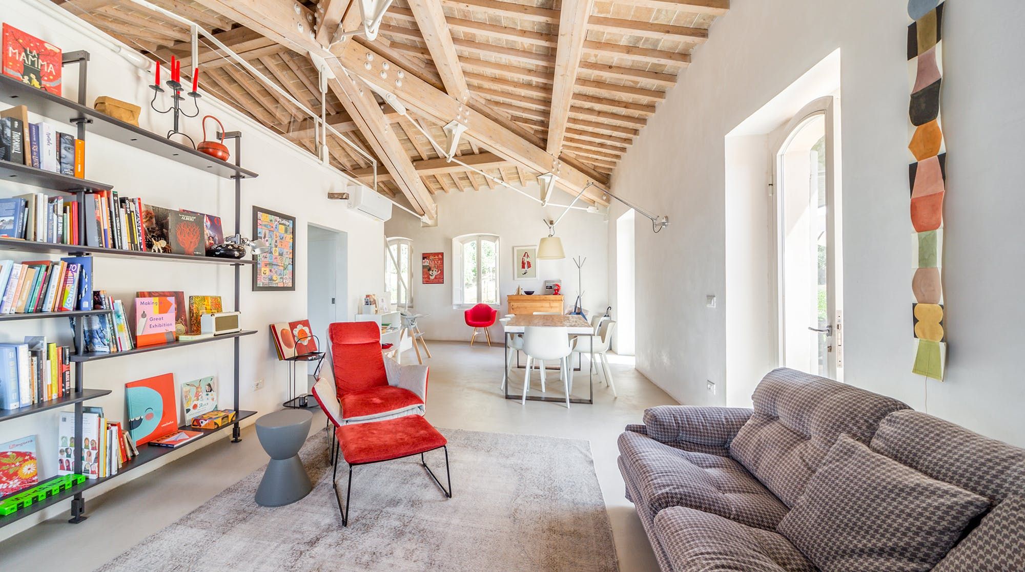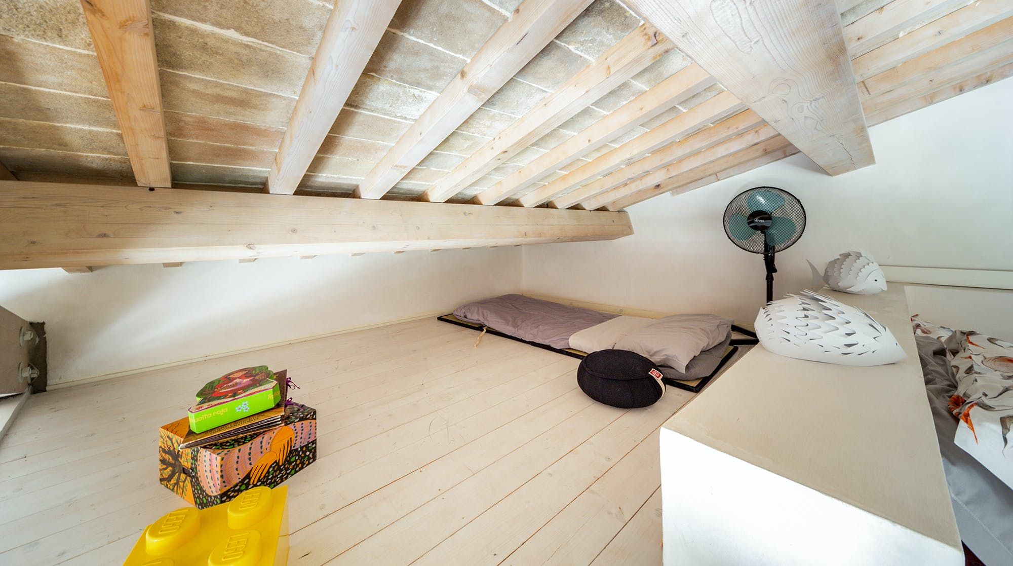 Book lovers will feel right at home here, with a huge selection of books to snuggle up on the sofa with. We recommend bringing your children here as there is also a ton of charming children's books to entertain your little ones. There's plenty of floor space for the children to play with toys that are provided by the host, as well as a cosy mezzanine bedroom space for a quick nap on the futon. The wooden beams add a rustic vibe, combined with the minimalistic yet colourful designs throughout the home.