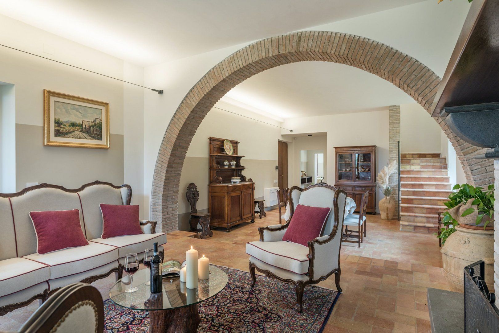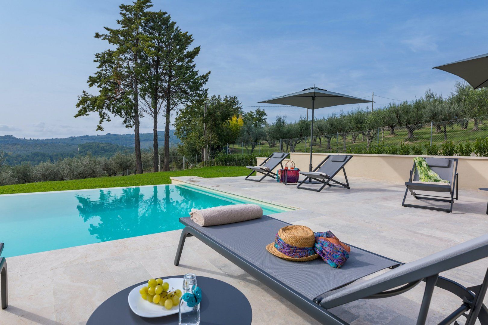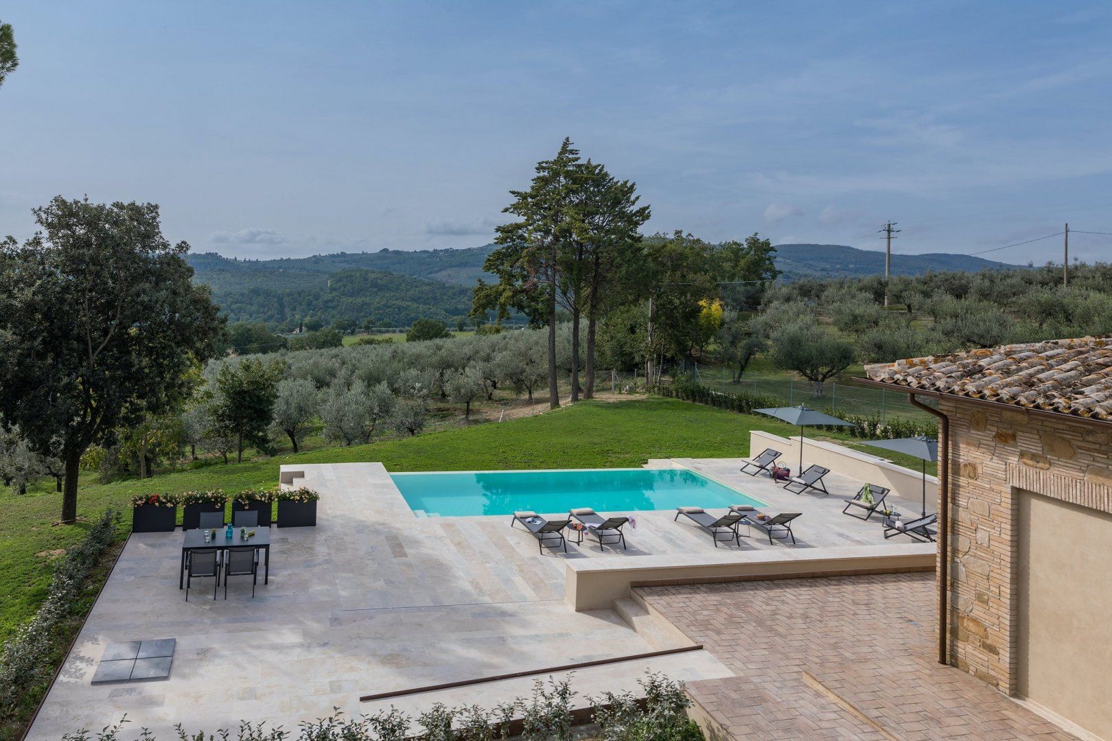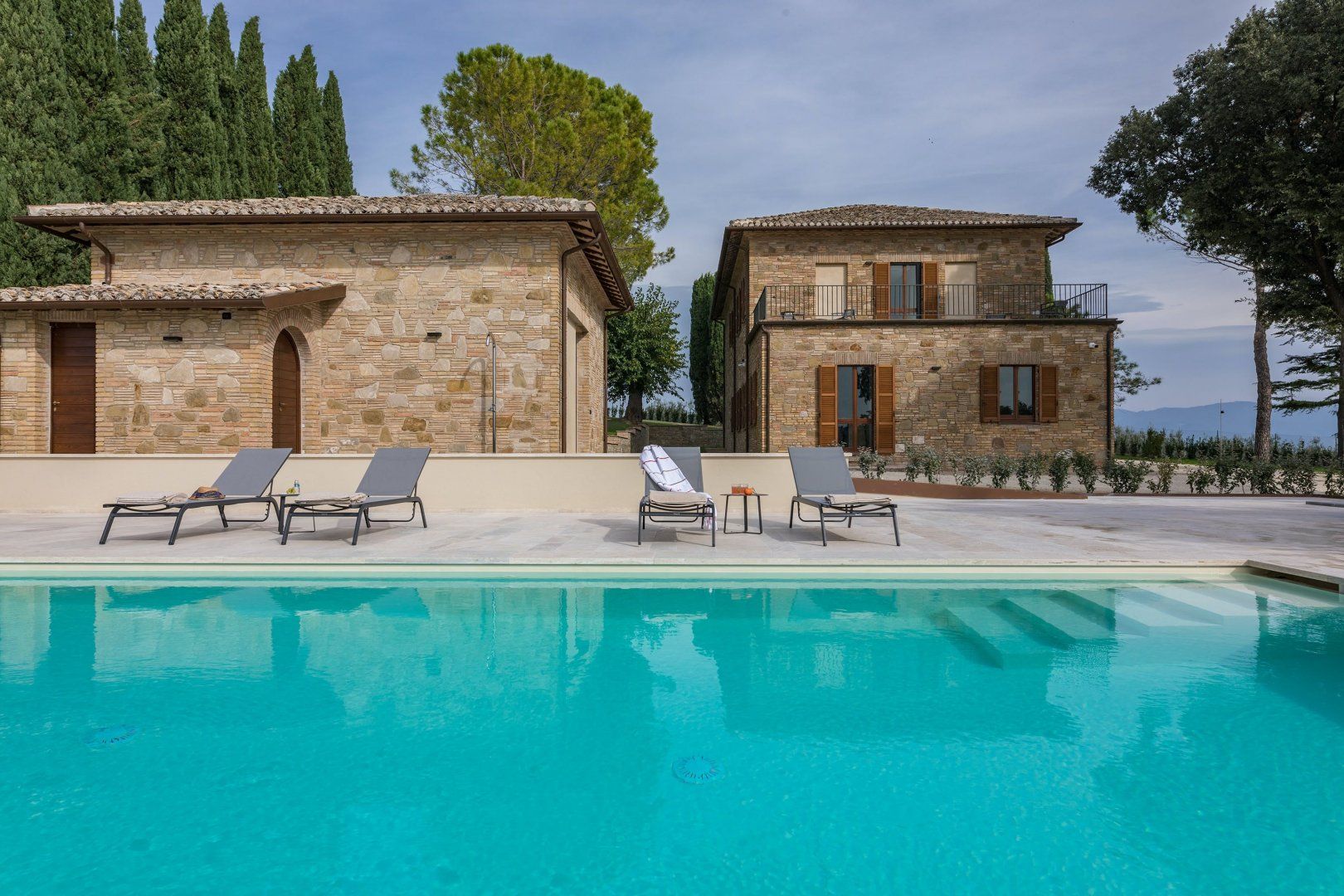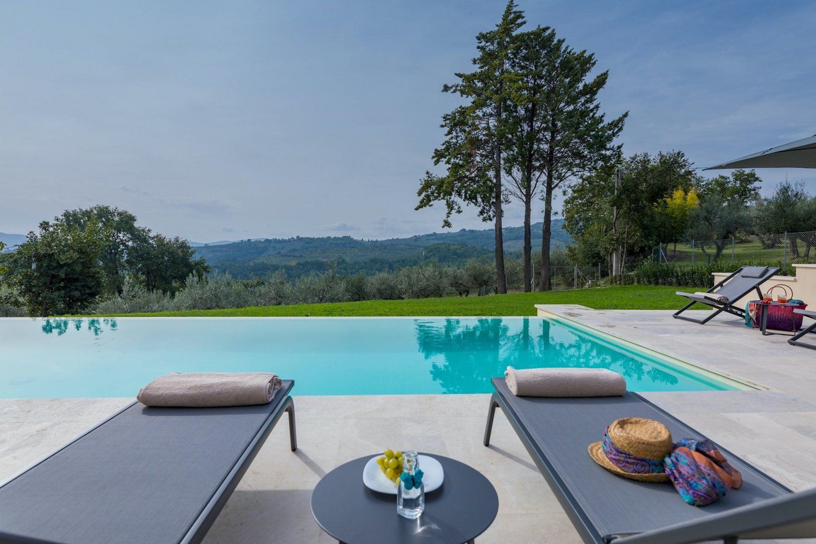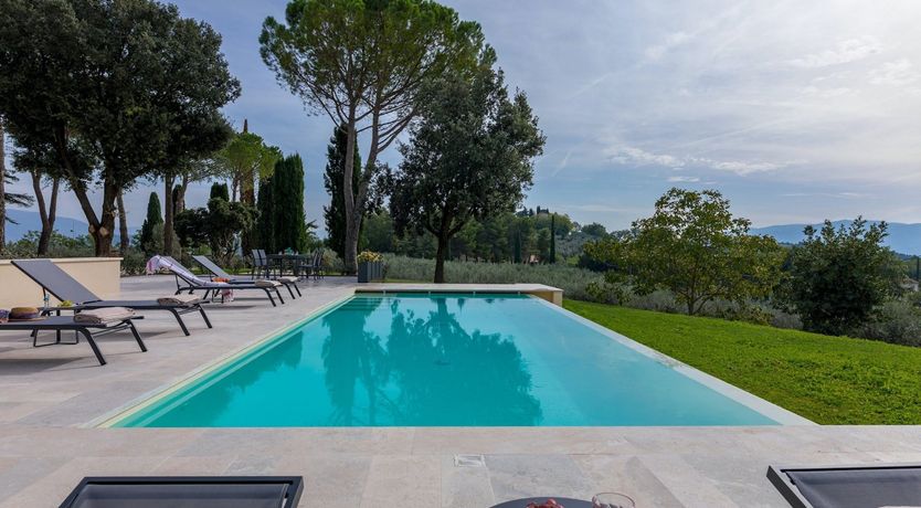 This home is just majestic as its stunning countryside surroundings. It's ideally located in a peaceful spot, nestled among the rolling hills of Umbria, just a short drive from the fascinating medieval town of Bevagna. Surrounding the villa sits groves of olive trees and lush green vineyards, with Mount Subasio creating a heavenly backdrop to the idyllic countryside views. These are best enjoyed with a cocktail in hand while relaxing by the infinity pool, or while dining at sunset on the covered terrace. The interiors are just as elegant, with traditional touches together with modern luxuries, such as the private massage room.