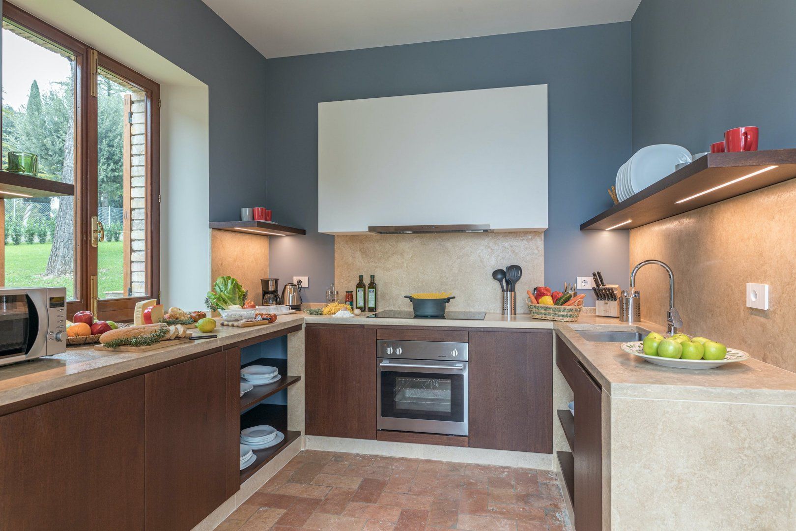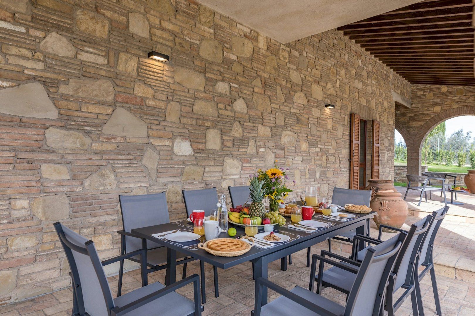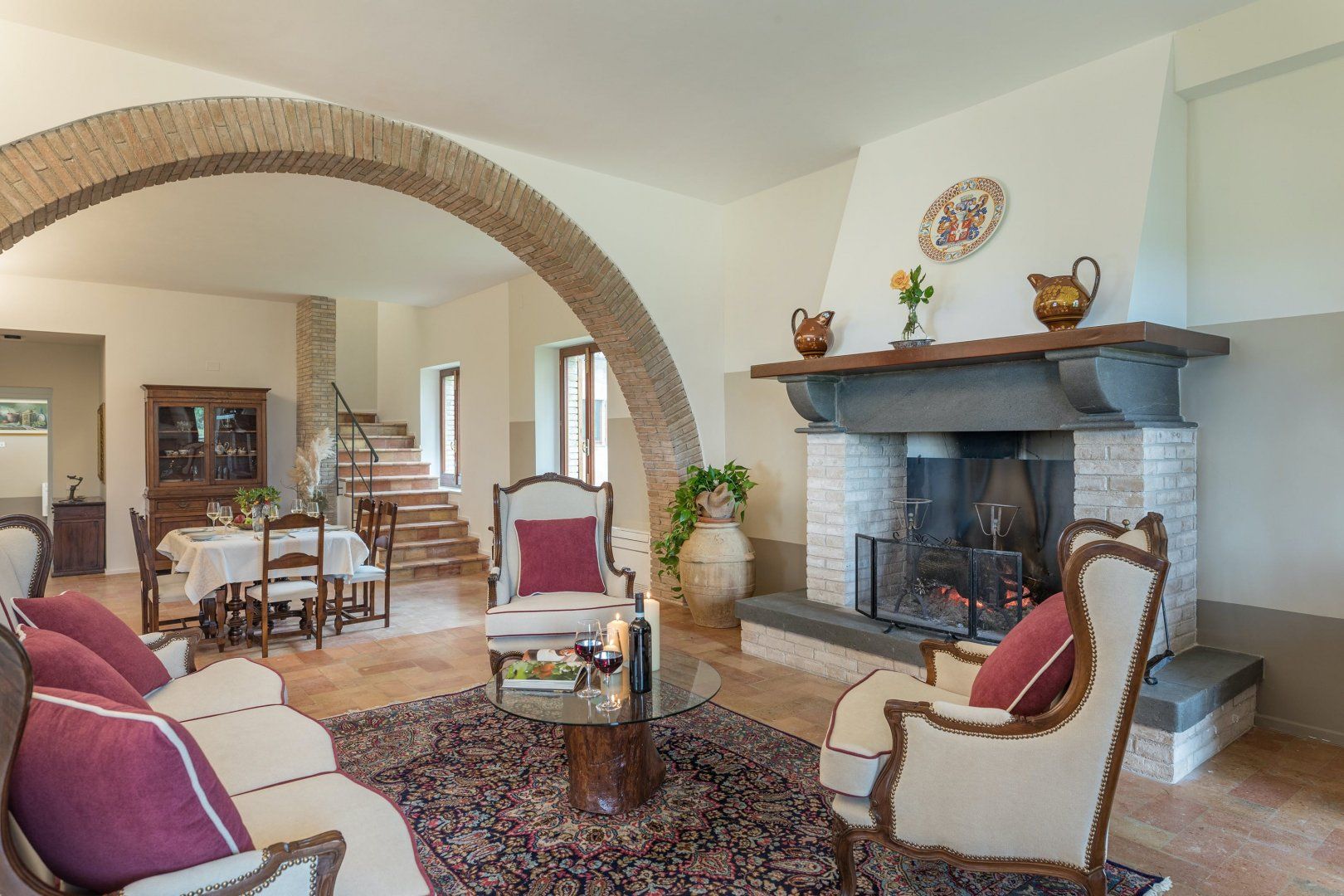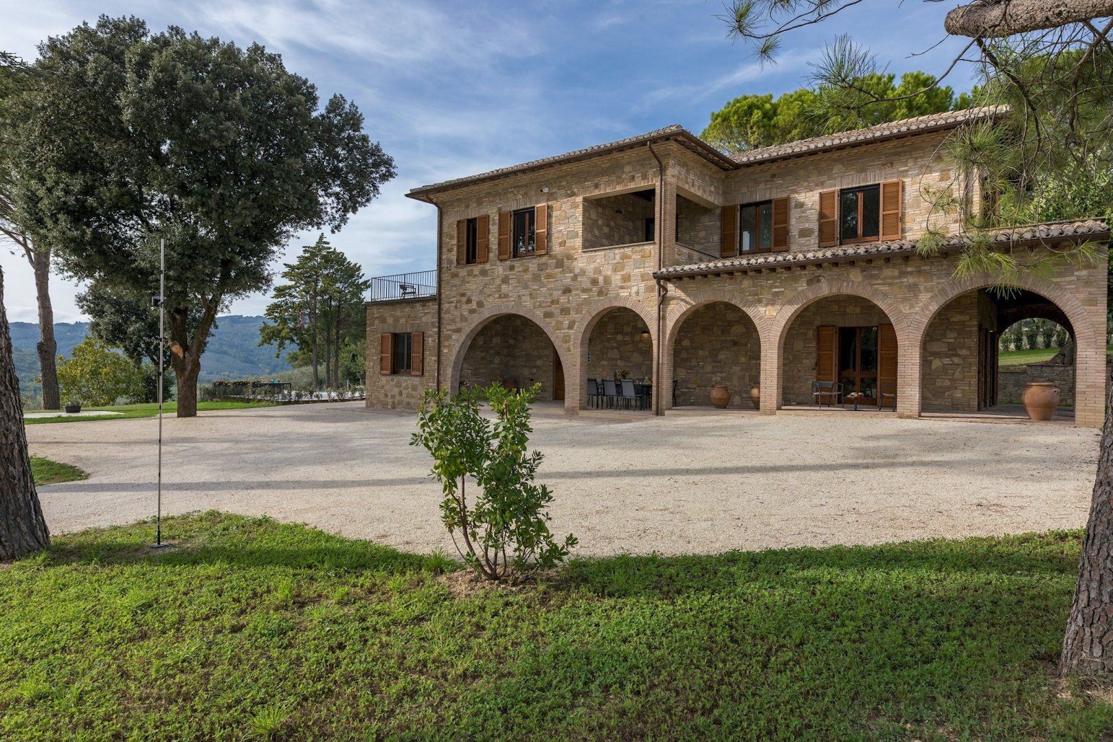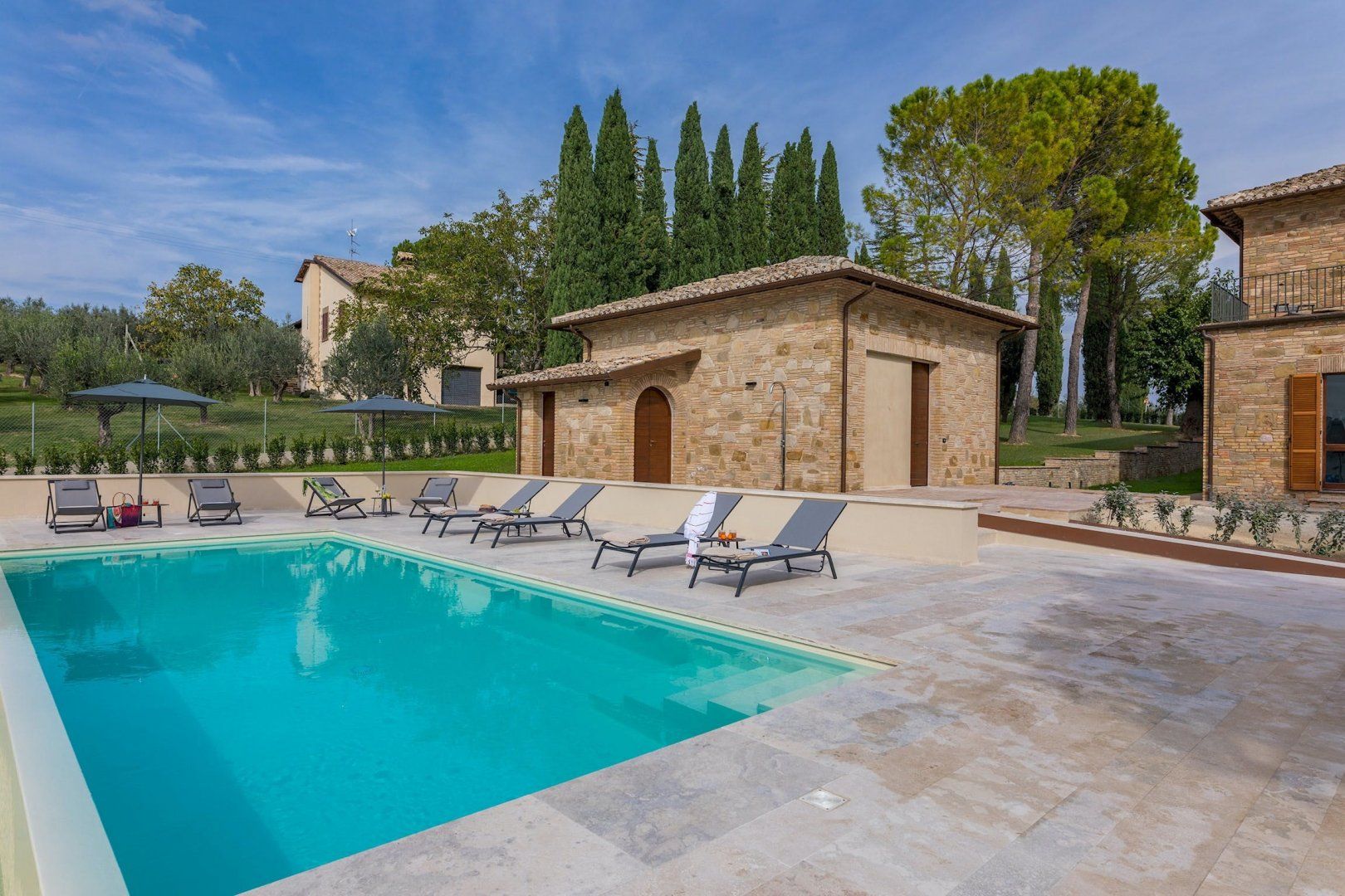 This home is just majestic as its stunning countryside surroundings. It's ideally located in a peaceful spot, nestled among the rolling hills of Umbria, just a short drive from the fascinating medieval town of Bevagna. Surrounding the villa sits groves of olive trees and lush green vineyards, with Mount Subasio creating a heavenly backdrop to the idyllic countryside views. These are best enjoyed with a cocktail in hand while relaxing by the infinity pool, or while dining at sunset on the covered terrace. The interiors are just as elegant, with traditional touches together with modern luxuries, such as the private massage room.