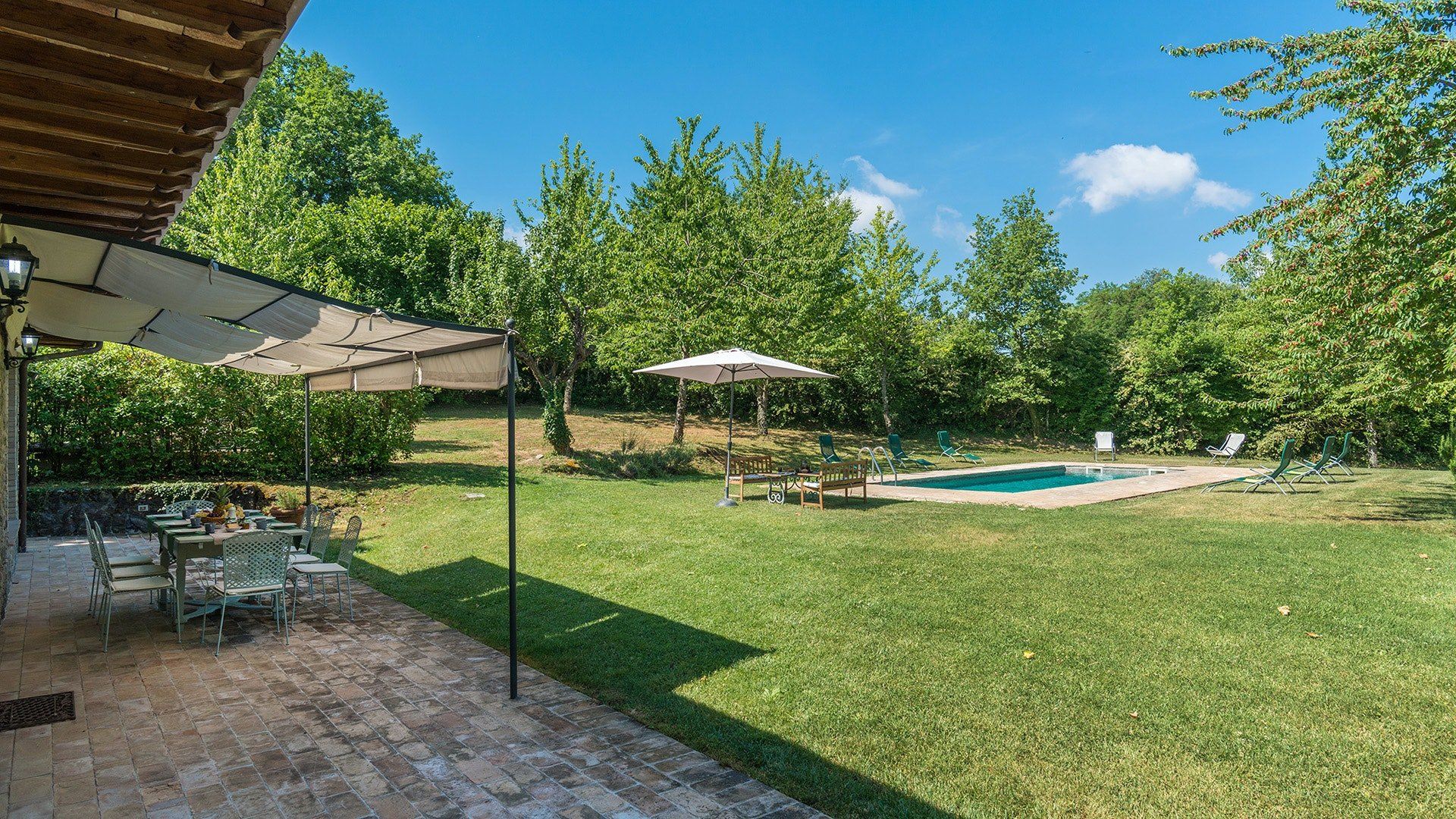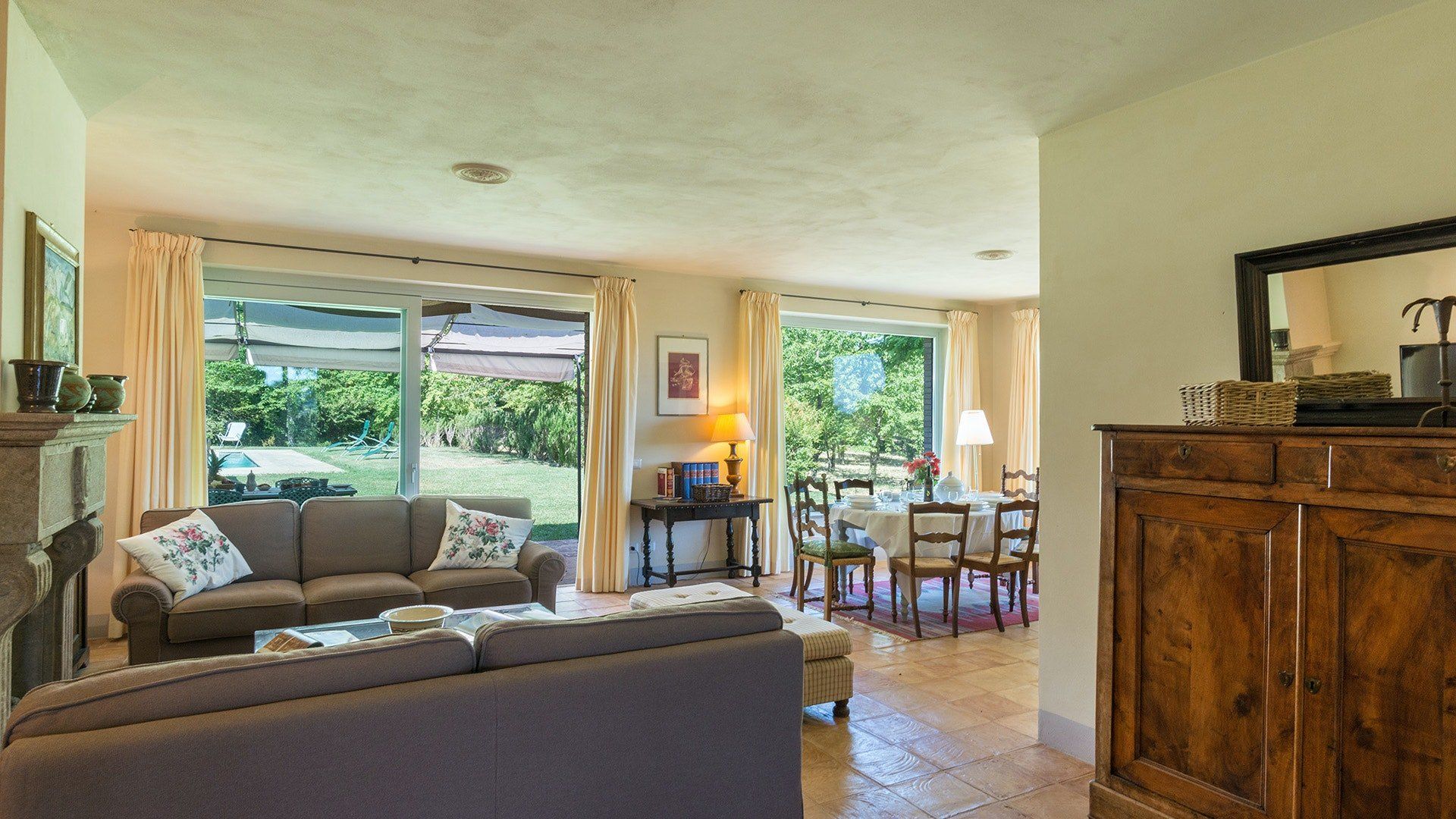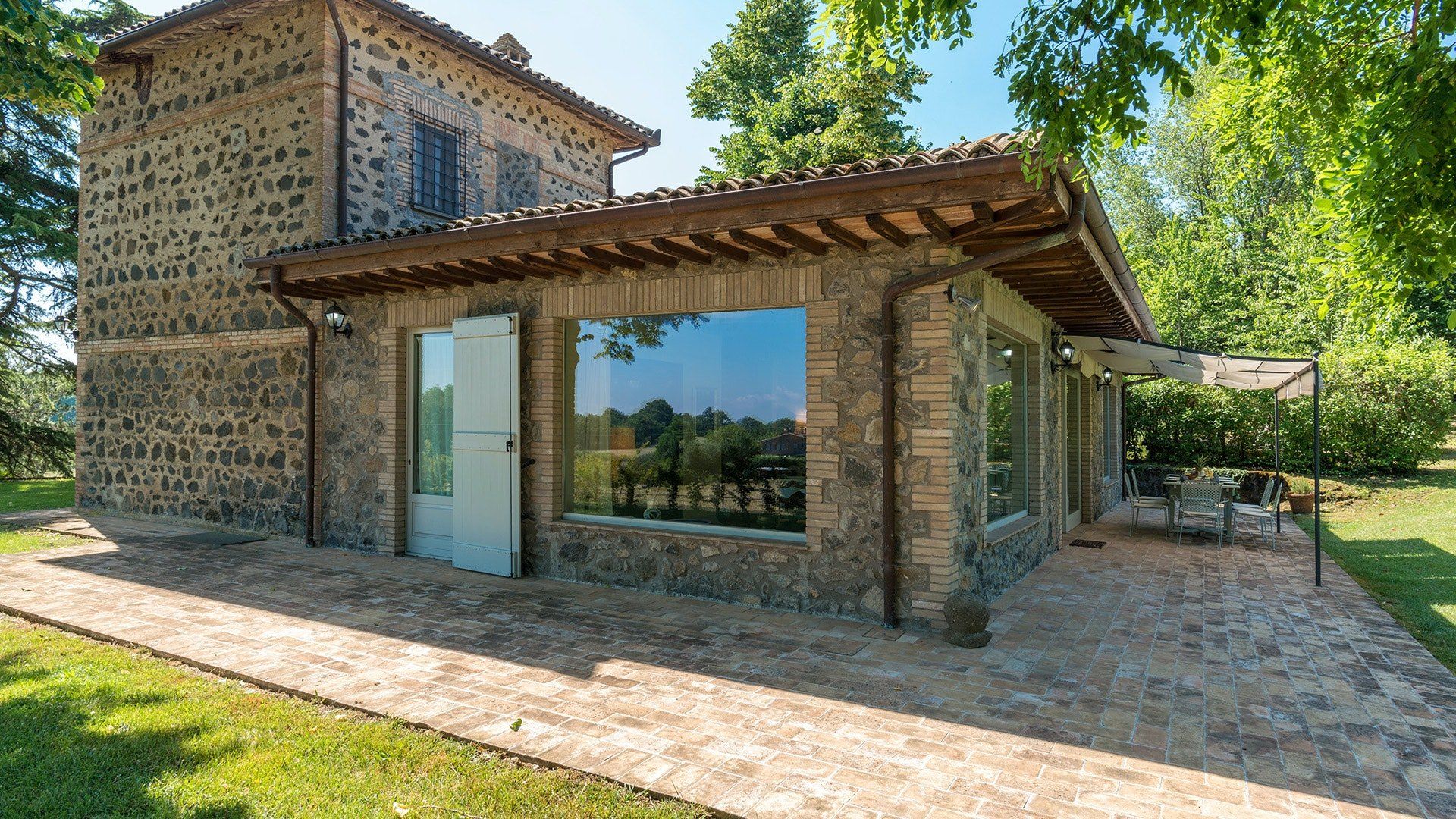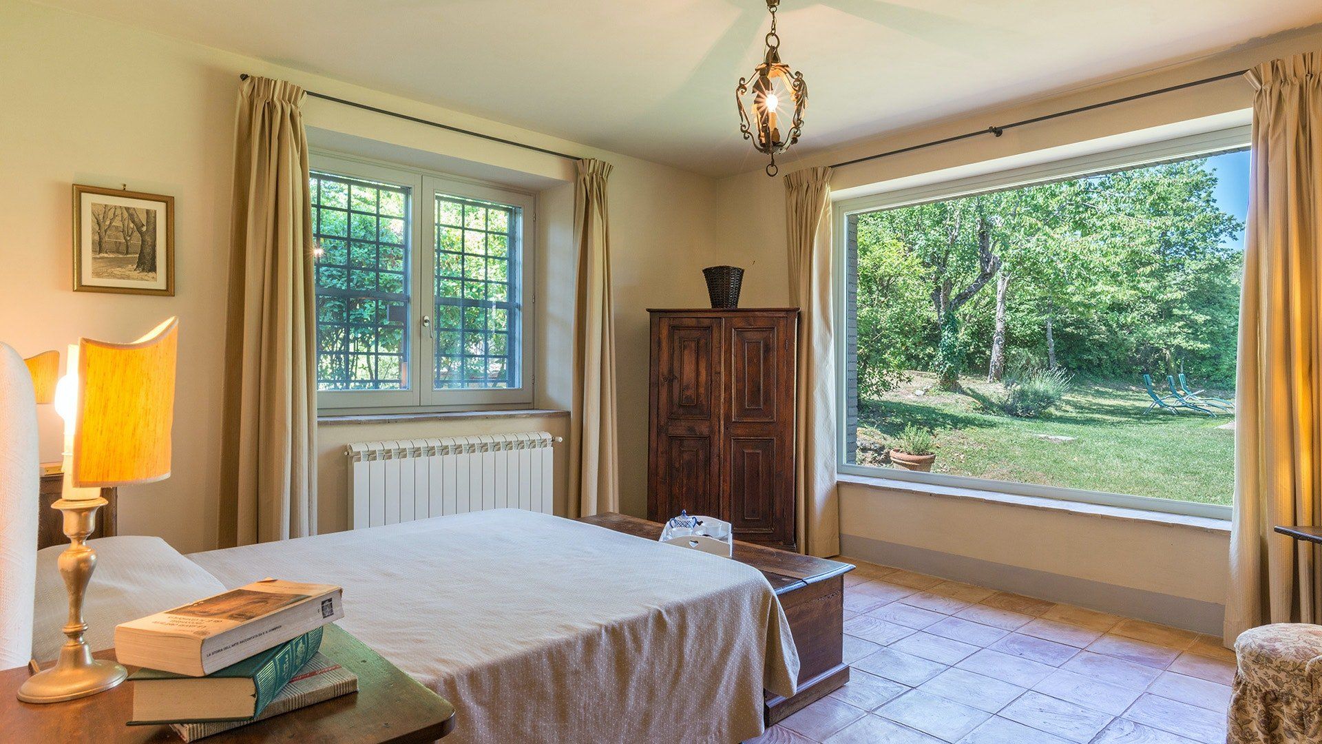 Inside, simple designs accentuate the home's original features and traditional Italy – think terracotta floors, exposed wooden beams and floods of natural daylight via the large windows overlooking the garden and surrounding landscape. When it's sunny, you'll likely want to spend much of your time outside. Open up the living room's French windows and find your perch under the pergola – here, you'll get to take in the tranquillity of the meadows and watch the grazing horses of the surrounding countryside passing by.