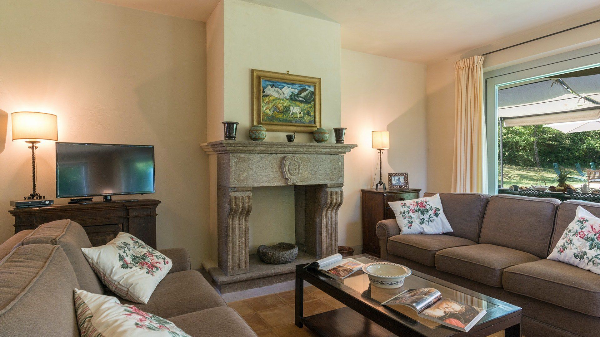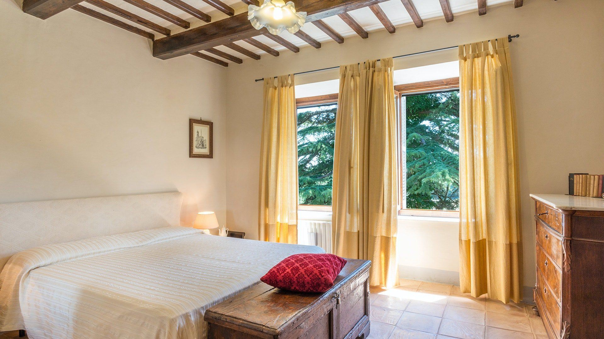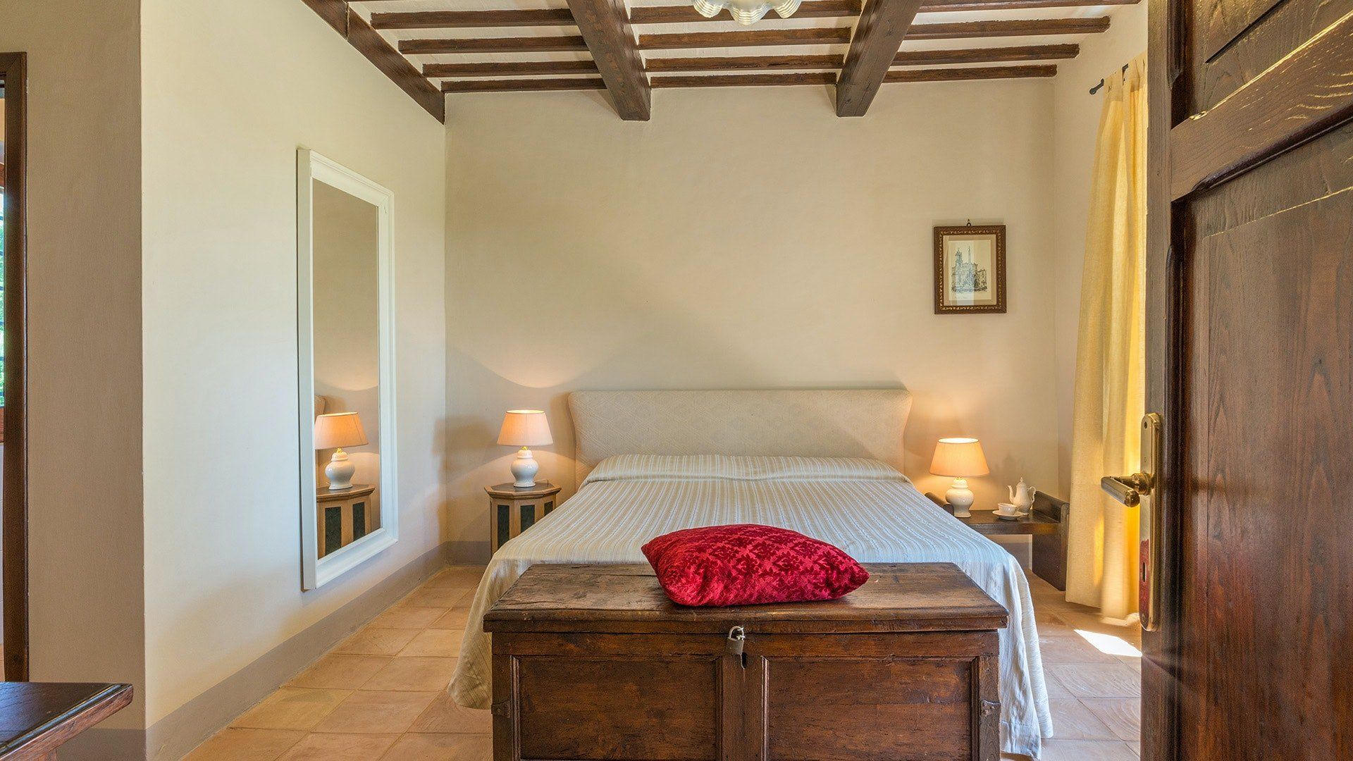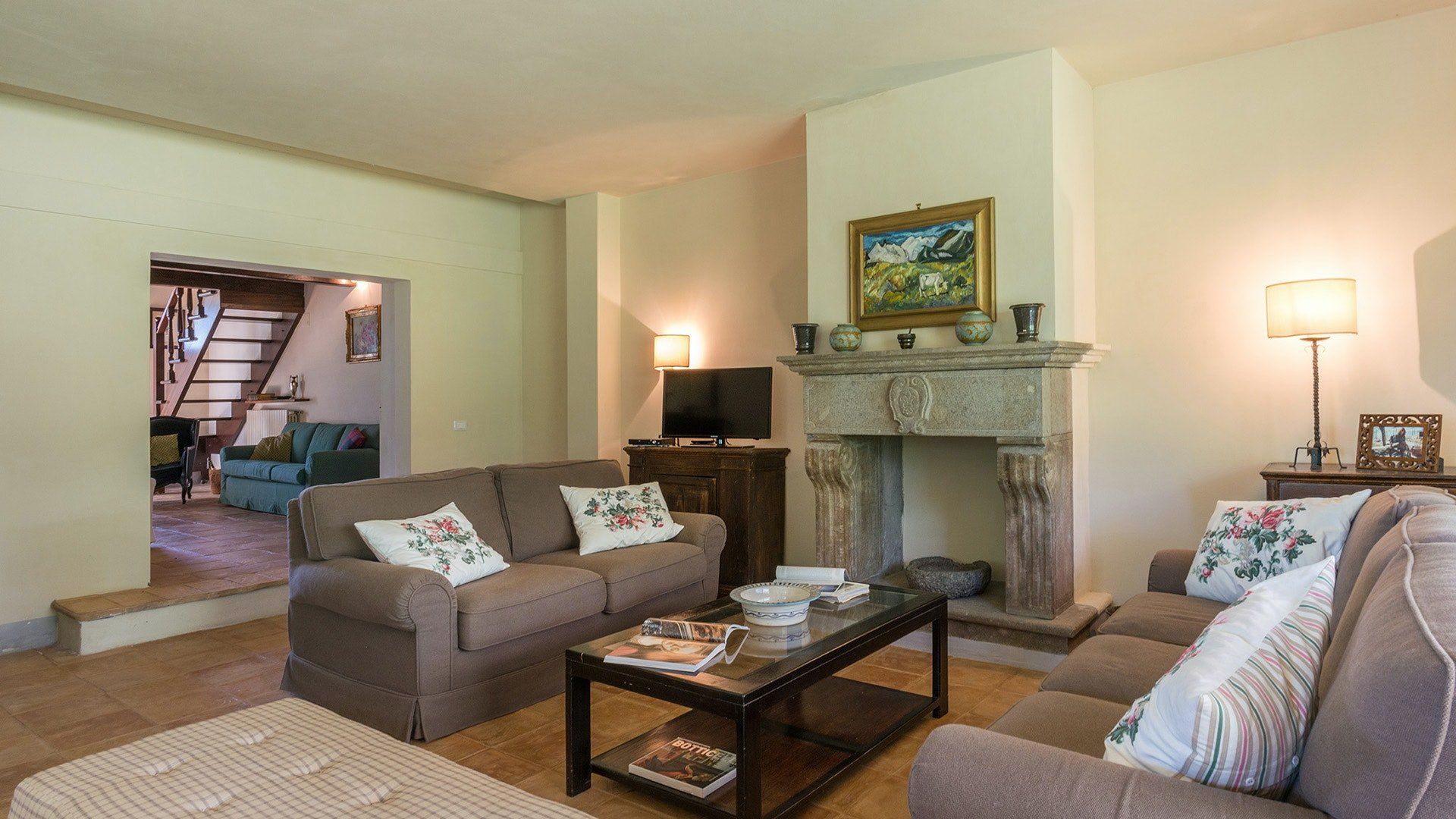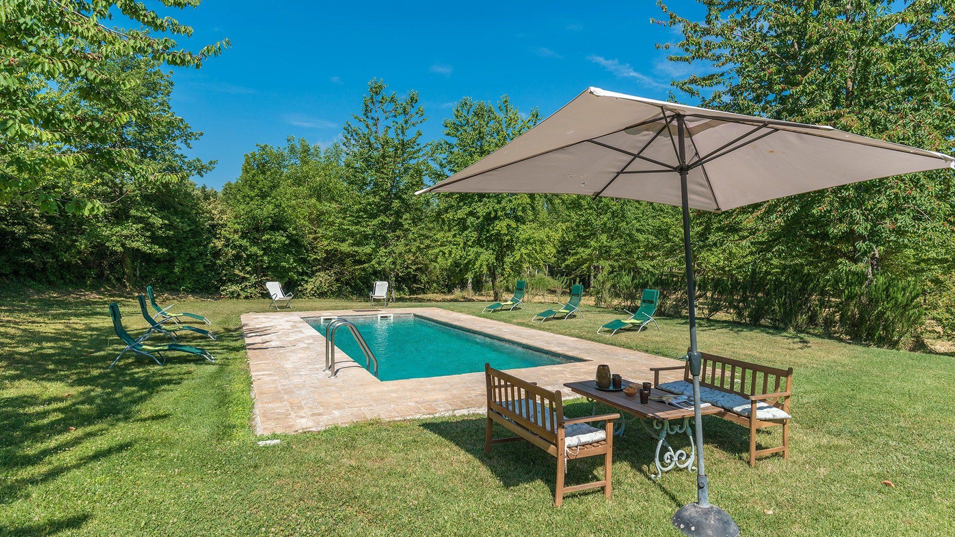 Inside, simple designs accentuate the home's original features and traditional Italy – think terracotta floors, exposed wooden beams and floods of natural daylight via the large windows overlooking the garden and surrounding landscape. When it's sunny, you'll likely want to spend much of your time outside. Open up the living room's French windows and find your perch under the pergola – here, you'll get to take in the tranquillity of the meadows and watch the grazing horses of the surrounding countryside passing by.