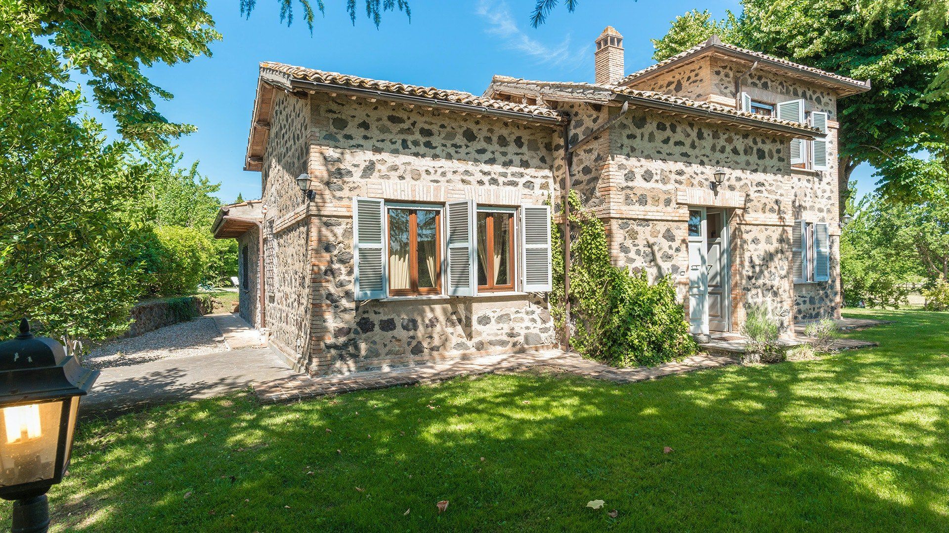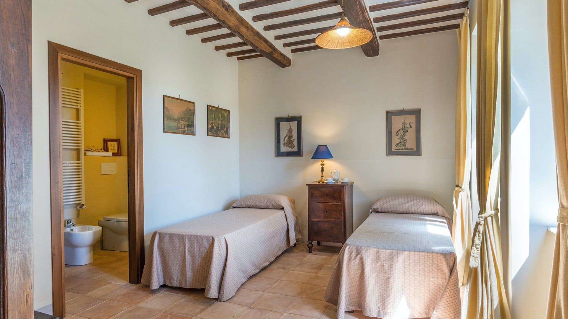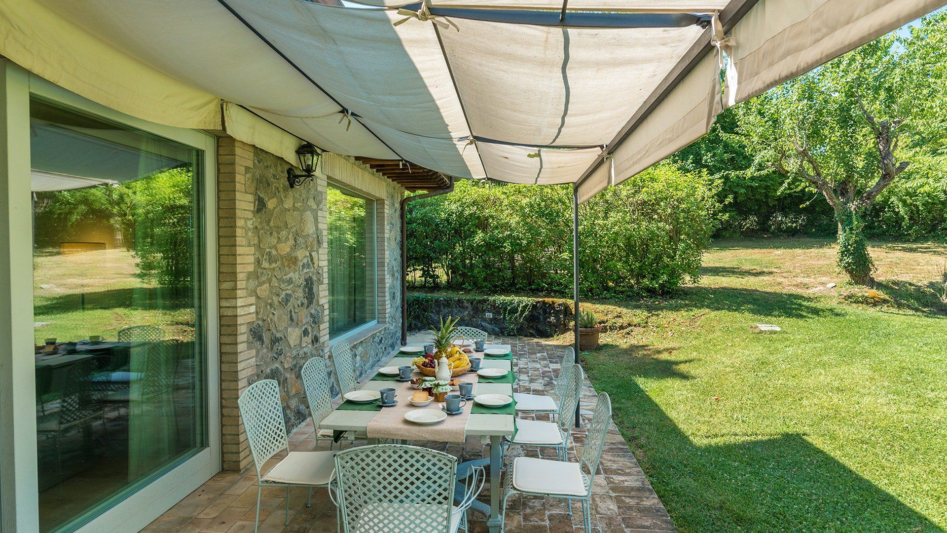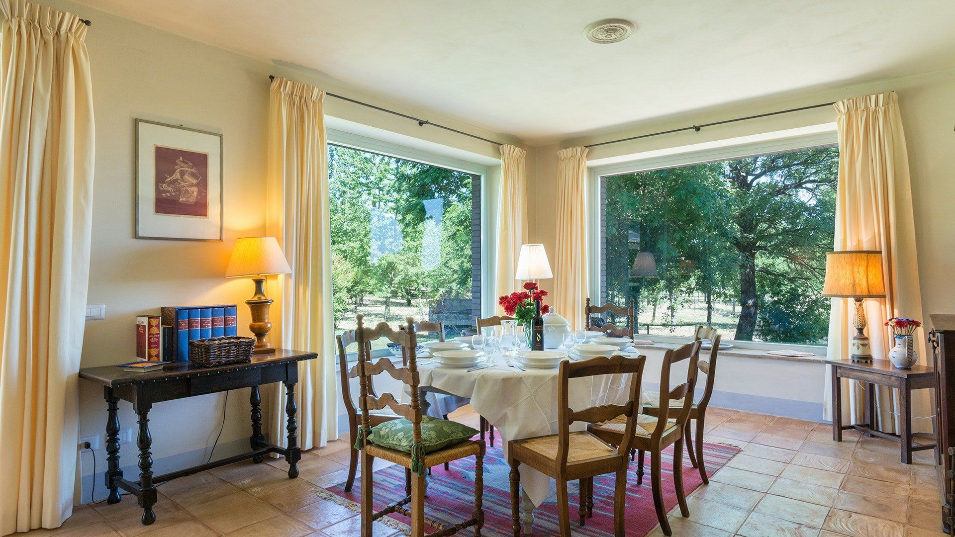 Inside, simple designs accentuate the home's original features and traditional Italy – think terracotta floors, exposed wooden beams and floods of natural daylight via the large windows overlooking the garden and surrounding landscape. When it's sunny, you'll likely want to spend much of your time outside. Open up the living room's French windows and find your perch under the pergola – here, you'll get to take in the tranquillity of the meadows and watch the grazing horses of the surrounding countryside passing by.