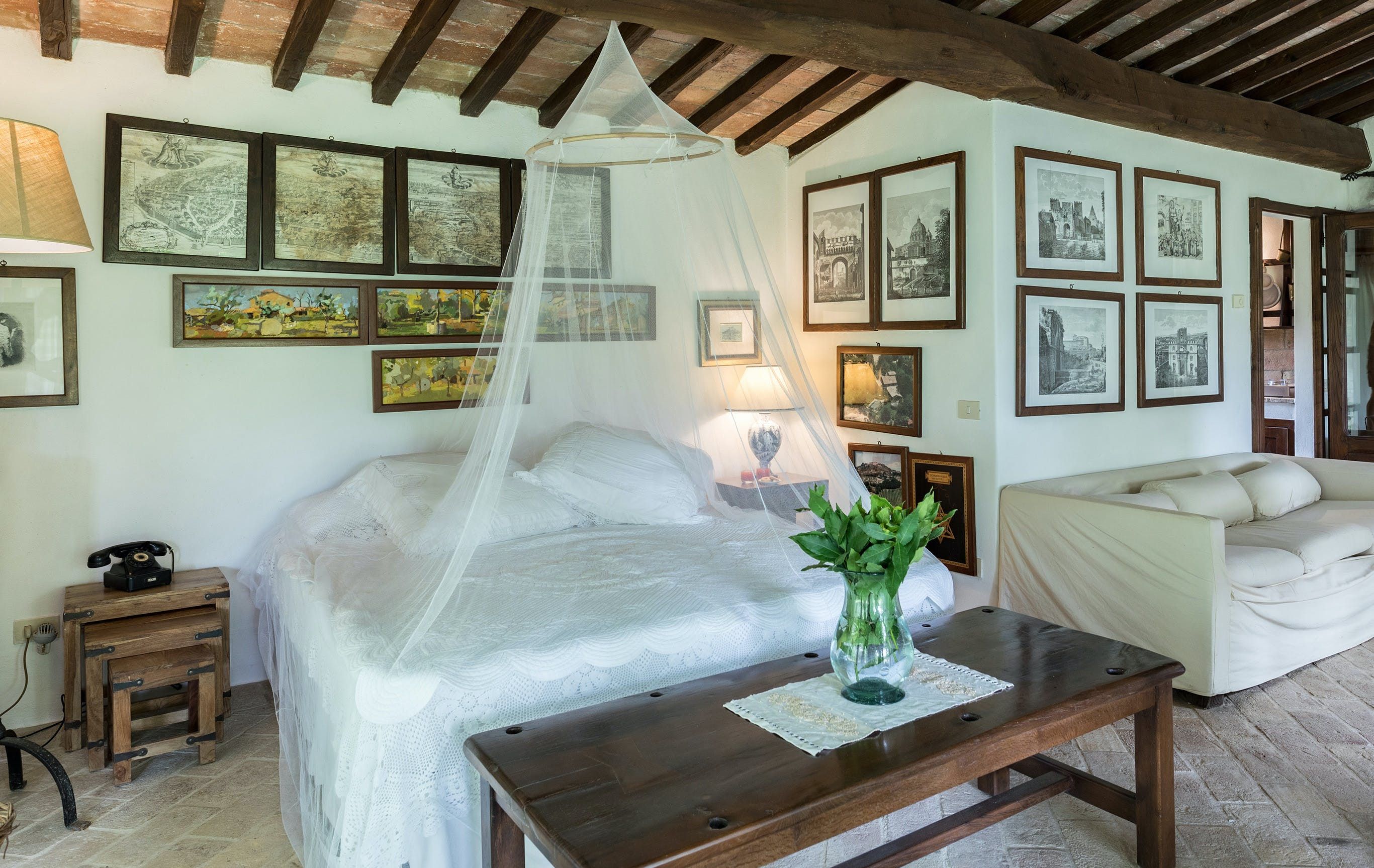 This beautifully rustic home is dressed with character and washed with beauty. Situated in a lovely countryside location, this private villa has olive groves and vineyards wrapping around it and the luxury of a garden in full bloom. If you aren’t swimming in the pool, pop open a bottle of local wine and try your hand at a traditional Italian pizza, cooked on the built-in barbecue and wood oven. Dine alfresco under the romantic pergola as the sun sets and you’ll have an evening to remember. The stunning location is perfectly complemented inside, with the walls dressed in wonderful works of antique-style art and classic features. Gather your loved ones and light the fireplace on cooler summer evenings for a cosy retreat. The beamed ceilings coupled with wooden floors and stone walls are classically elegant.