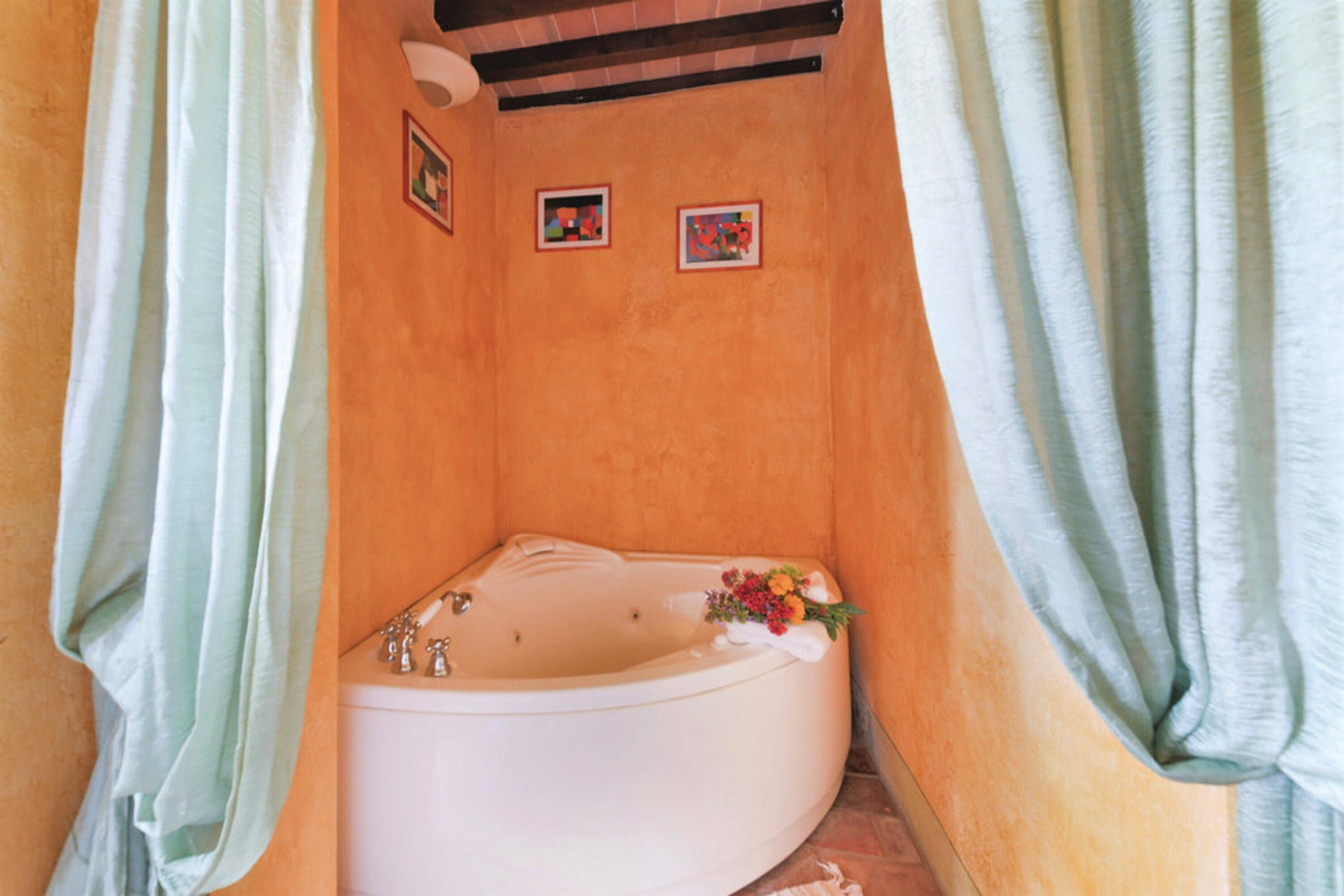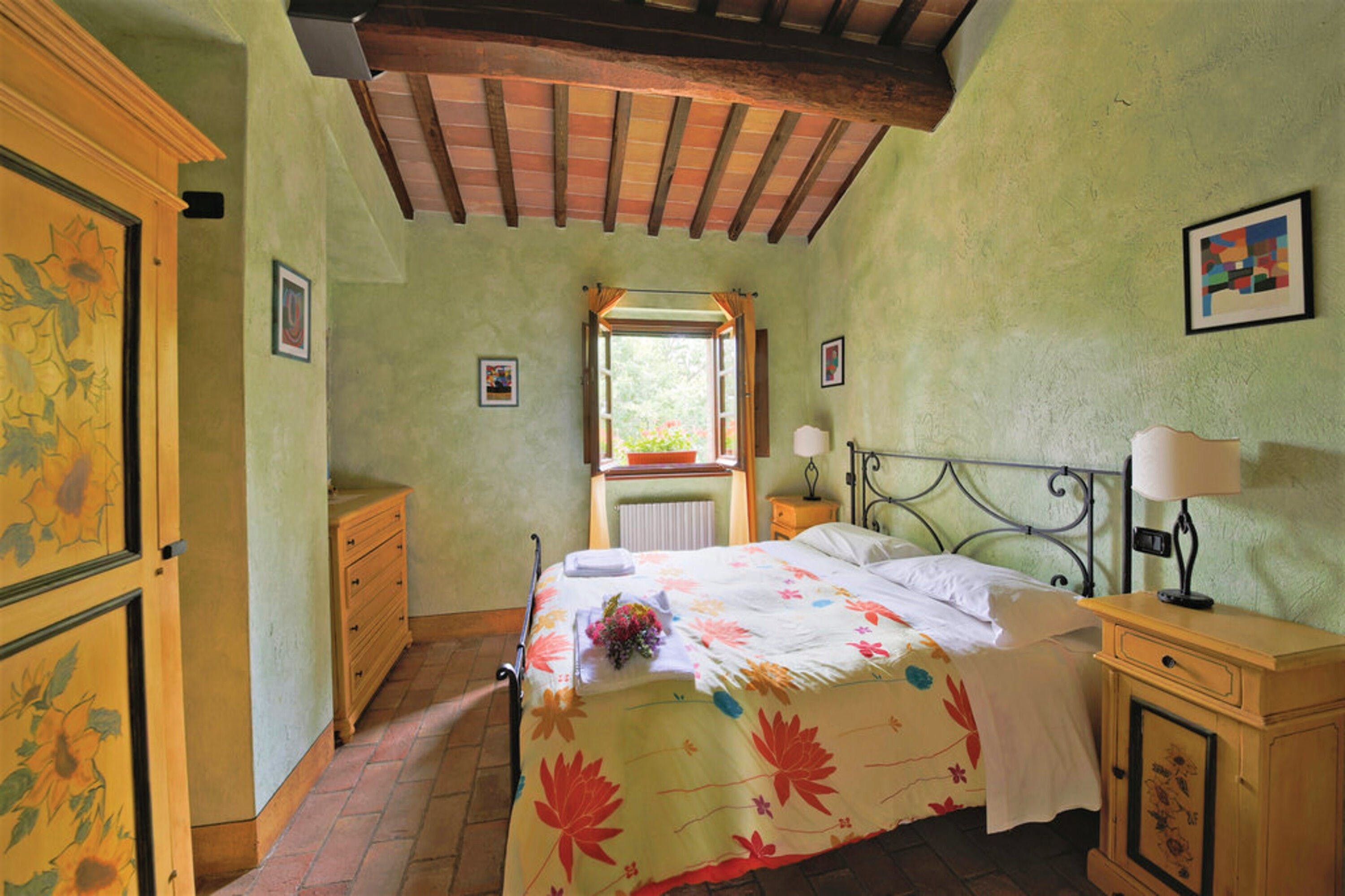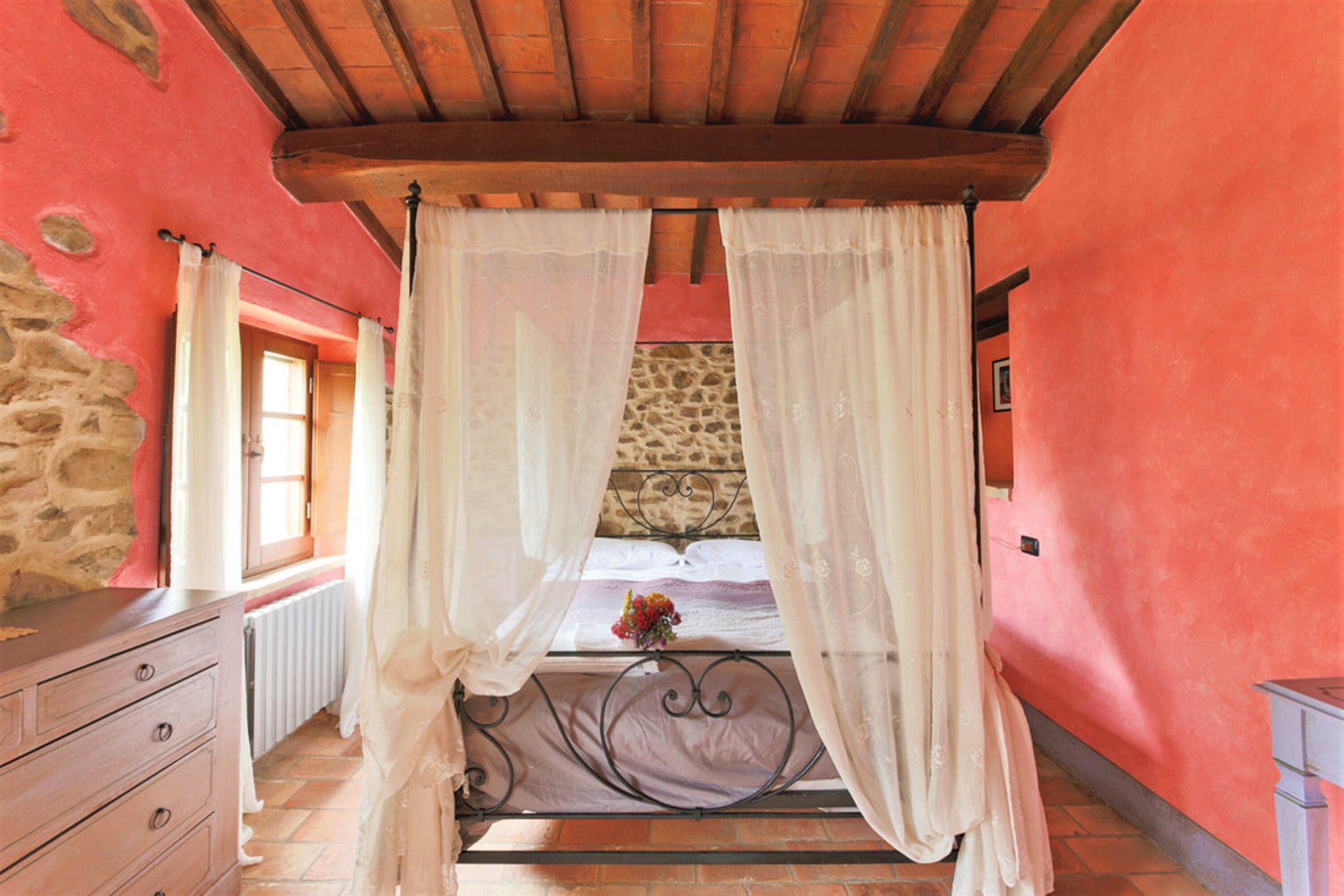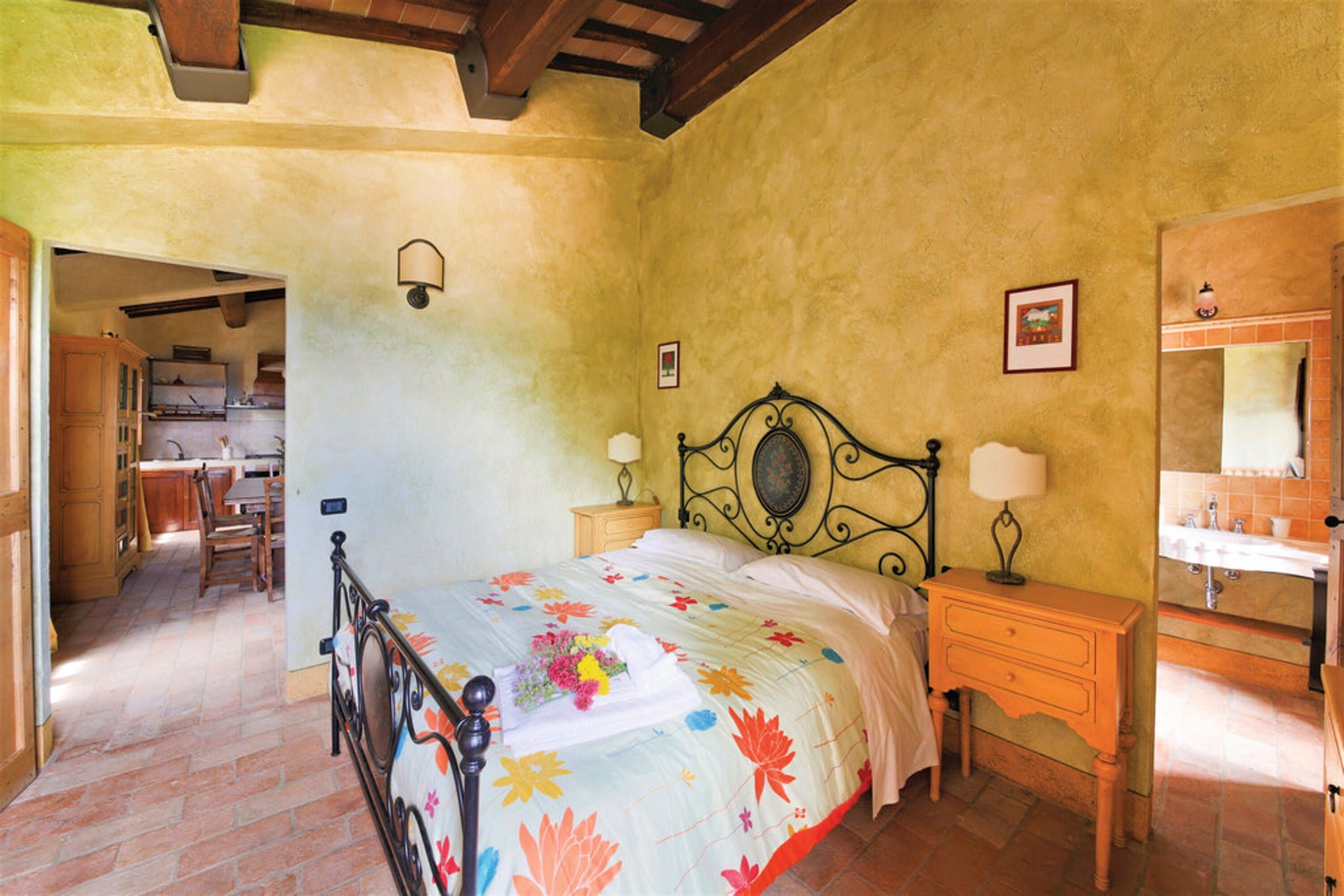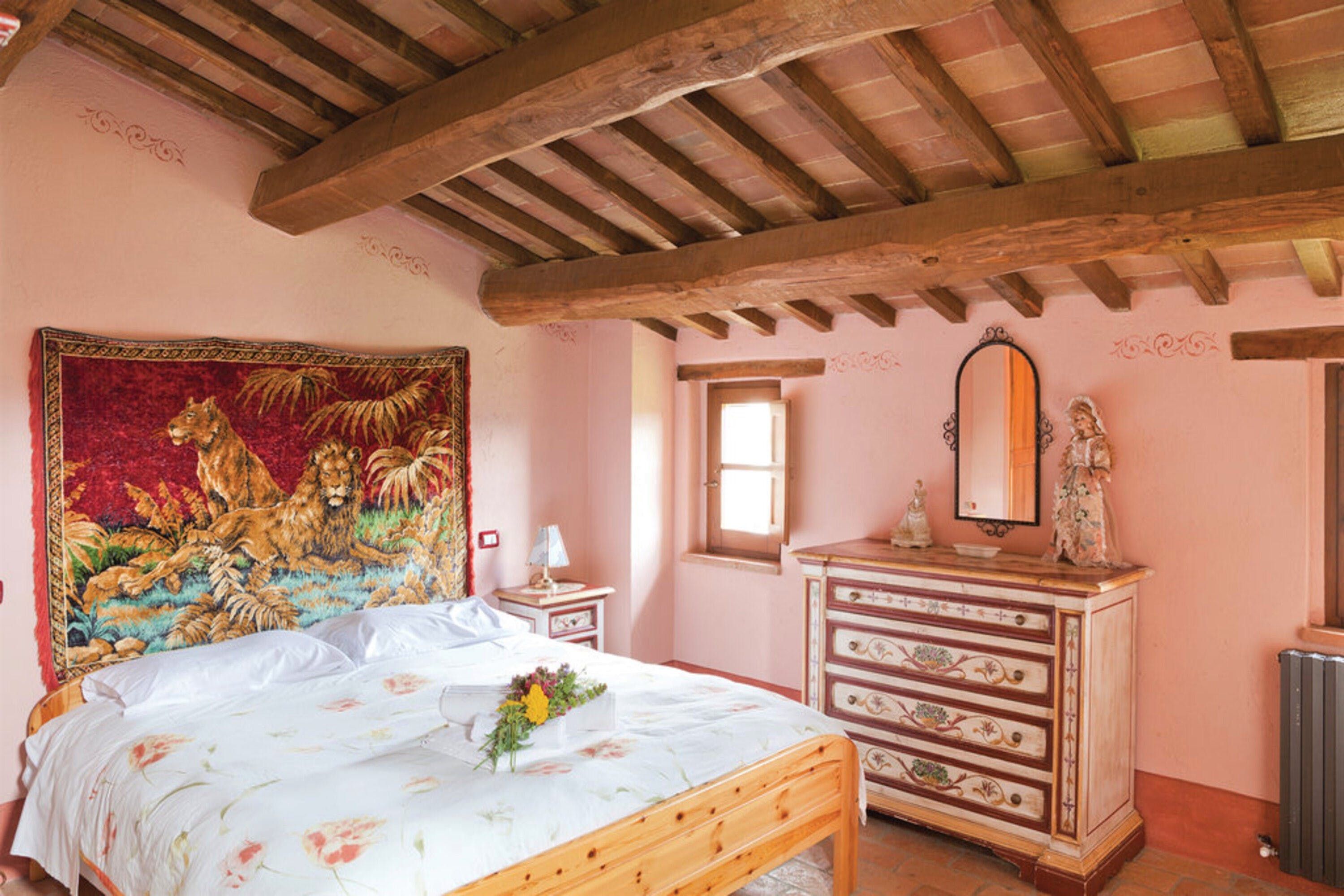 Inside you’ll find all the classic features of a traditional Umbrian home – wood-beamed ceilings, terracotta tiled floors and a rustic-style kitchen that still has serious 19th-century farmhouse vibes. Each bedroom has its own character, with wrought-iron beds and hand-painted wardrobes harking back to yesteryear. We were keen on the sunflower room in olive and forest green, and the master with its four-poster swathed with curtains. But the room with the lion tapestry really grabbed us.