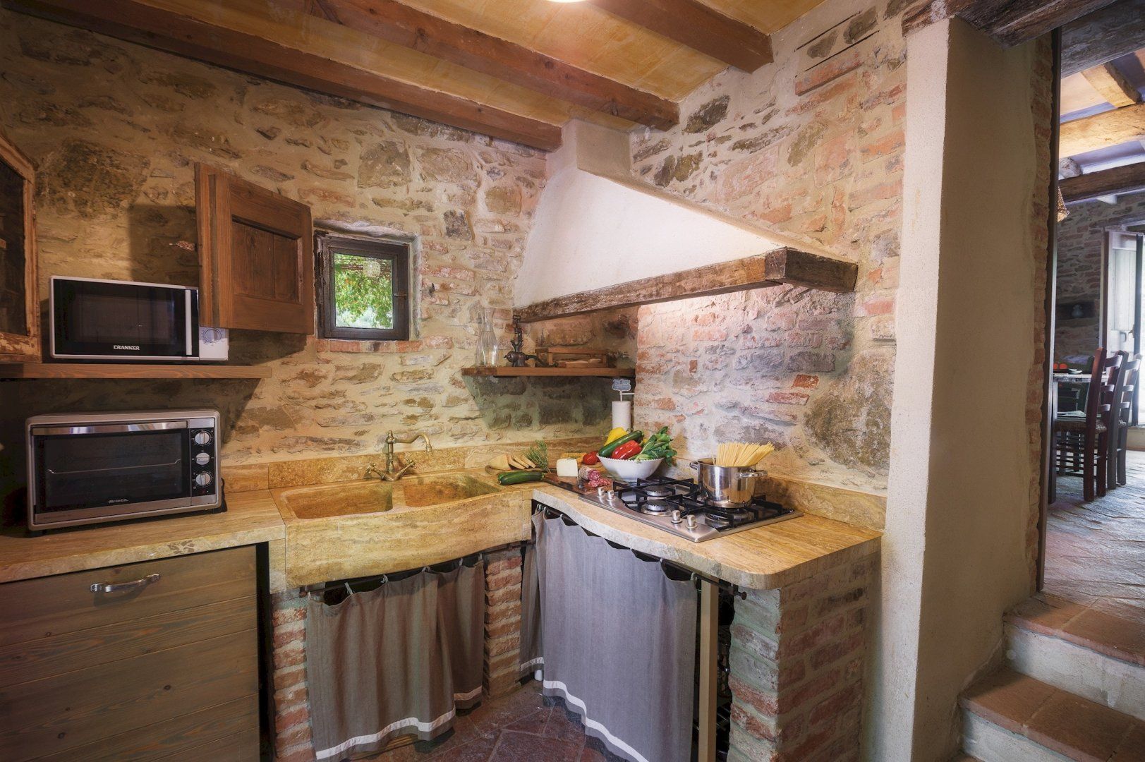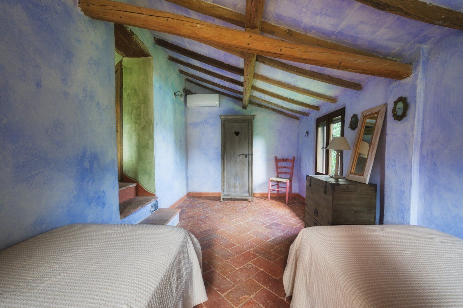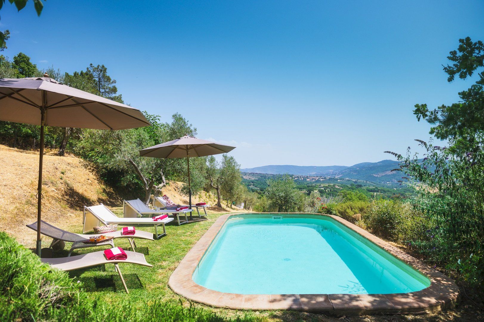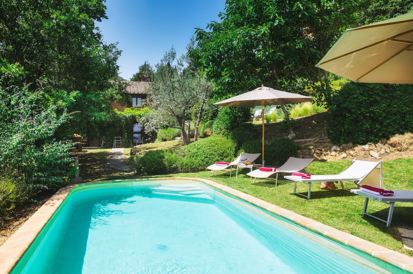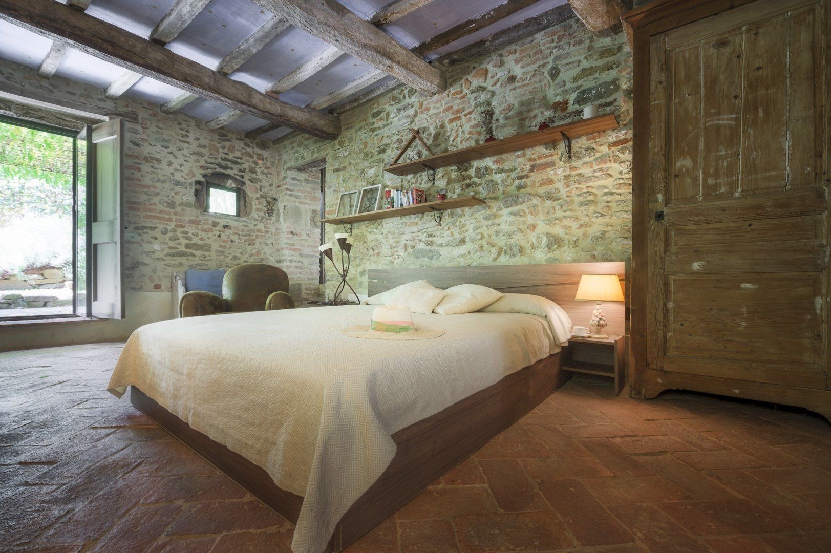 Surrounded by olive groves and rolling Umbrian countryside, this rustic farmhouse retains its original character and charm. We loved the timber and exposed brickwork ceilings, Venetian plaster walls and traditional furnishings that make the place feel like home. Wake up to a light breakfast in the charming kitchen then spend your day lounging by the secluded pool or floating about in its cool water.
