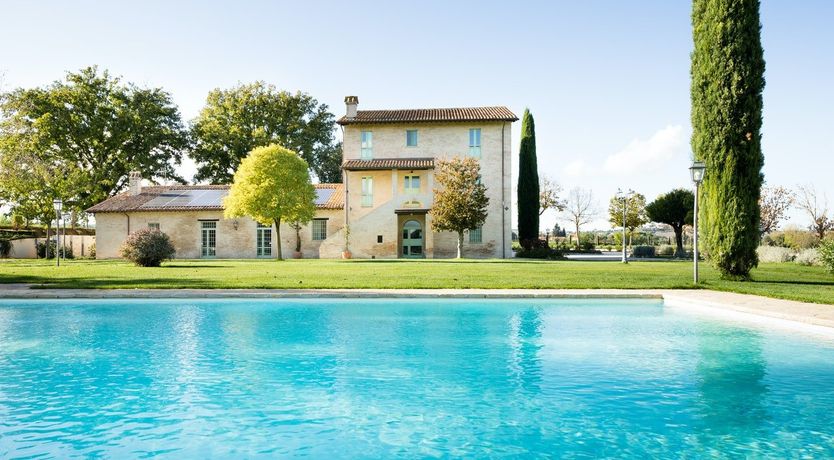 Out in the undulating countryside of Umbria, this villa encapsulates the traditional Italian aesthetic with a few modern luxuries thrown in. A terracotta roof, honey-hued old stone and green shutters are all old-world charm, but the sparkling turquoise pool stretching out front is a reminder you’re in the 21st-century. Within the acres of grounds, you’ll find a shaded loggia for dining outdoors, perfectly manicured lawns, and dining for up to forty under wooden pergolas should you have something special to celebrate. Two self-contained cottages are ideal for members of the group who want a bit more privacy and one comes with a luxurious hammam-style shower. In the main old farmhouse (dating back to the 1700s), you’ll find huge social space for group celebrations with its own bar, a professional-grade kitchen in sleek chrome, and a full spa in the basement with a hot tub, sauna and Turkish bath. Snug sitting rooms set around working fireplaces are scattered throughout the villa and most of the rooms are fully independent with kitchenettes and seating areas under their wood-beamed ceilings.