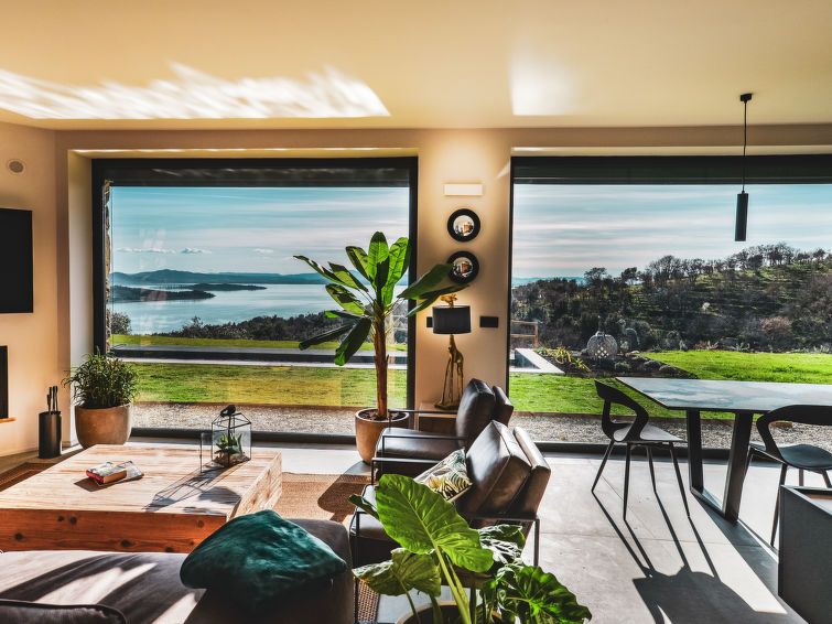 4-room villa 200 m2. Modern and luxurious furnishings: open large living/dining room with panoramic window with open-hearth fireplace, kitchen corner and TV (flat screen). Exit to the garden, pergola. 2 double bedrooms with panoramic window, each room with shower/bidet/WC. Exit to the garden, to the swimming pool.