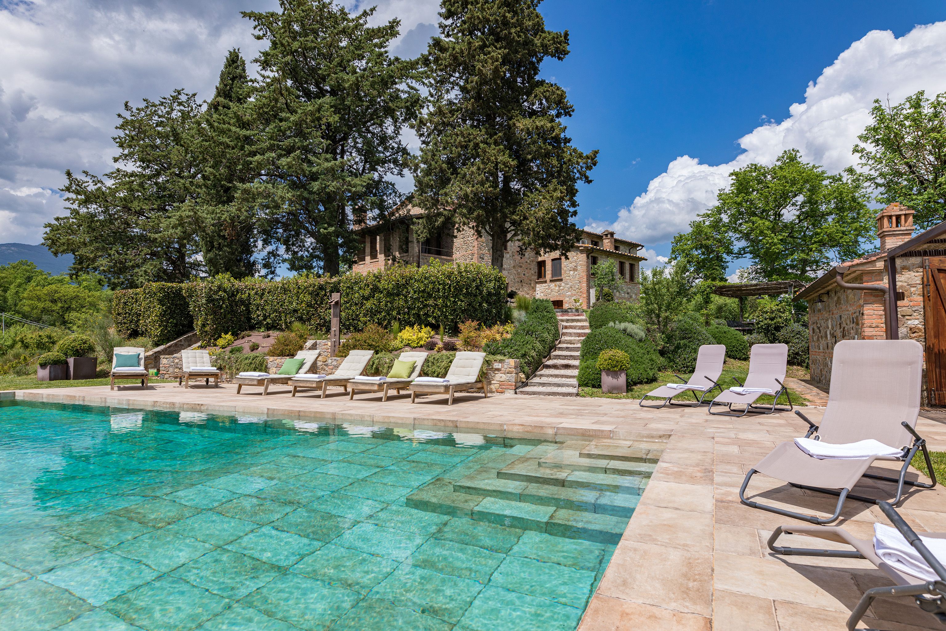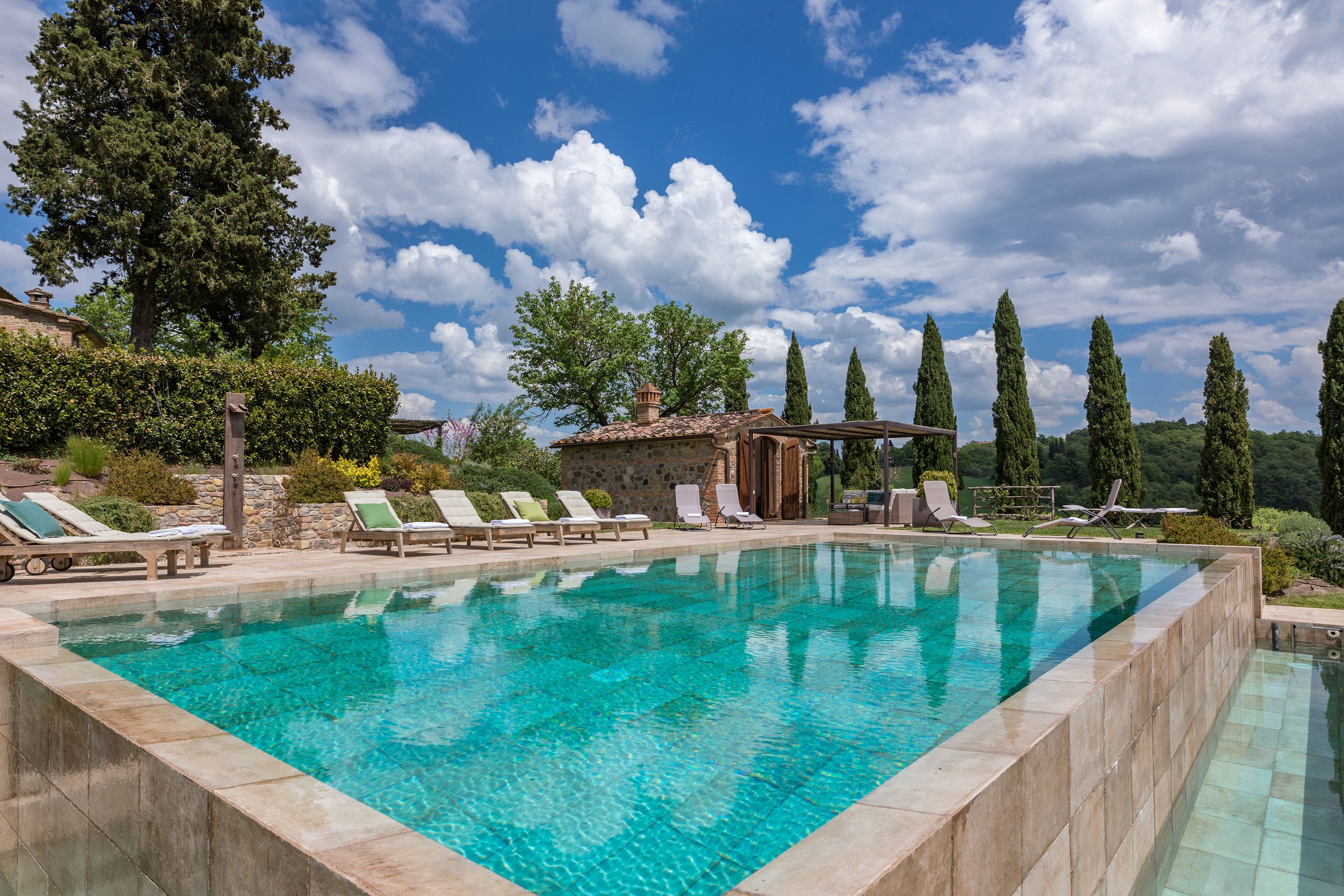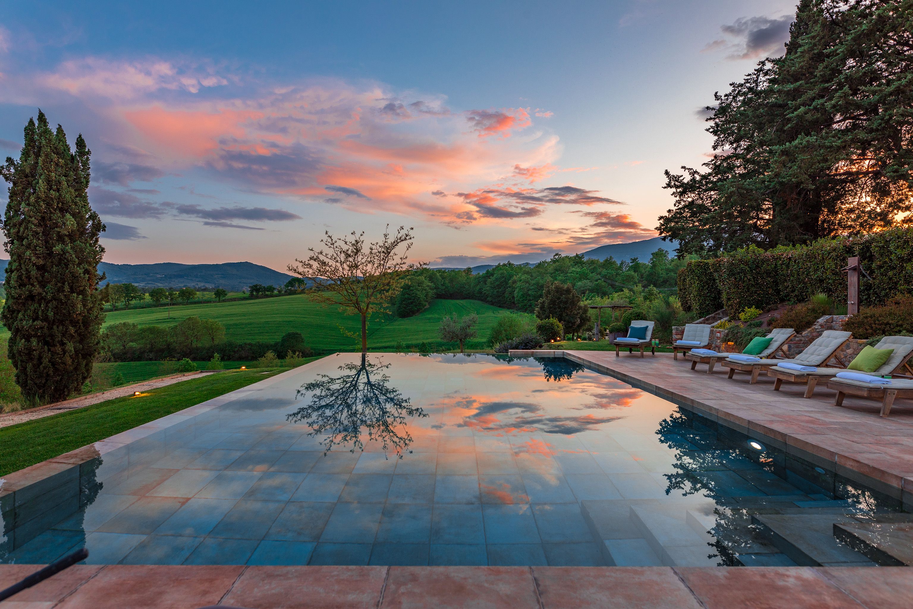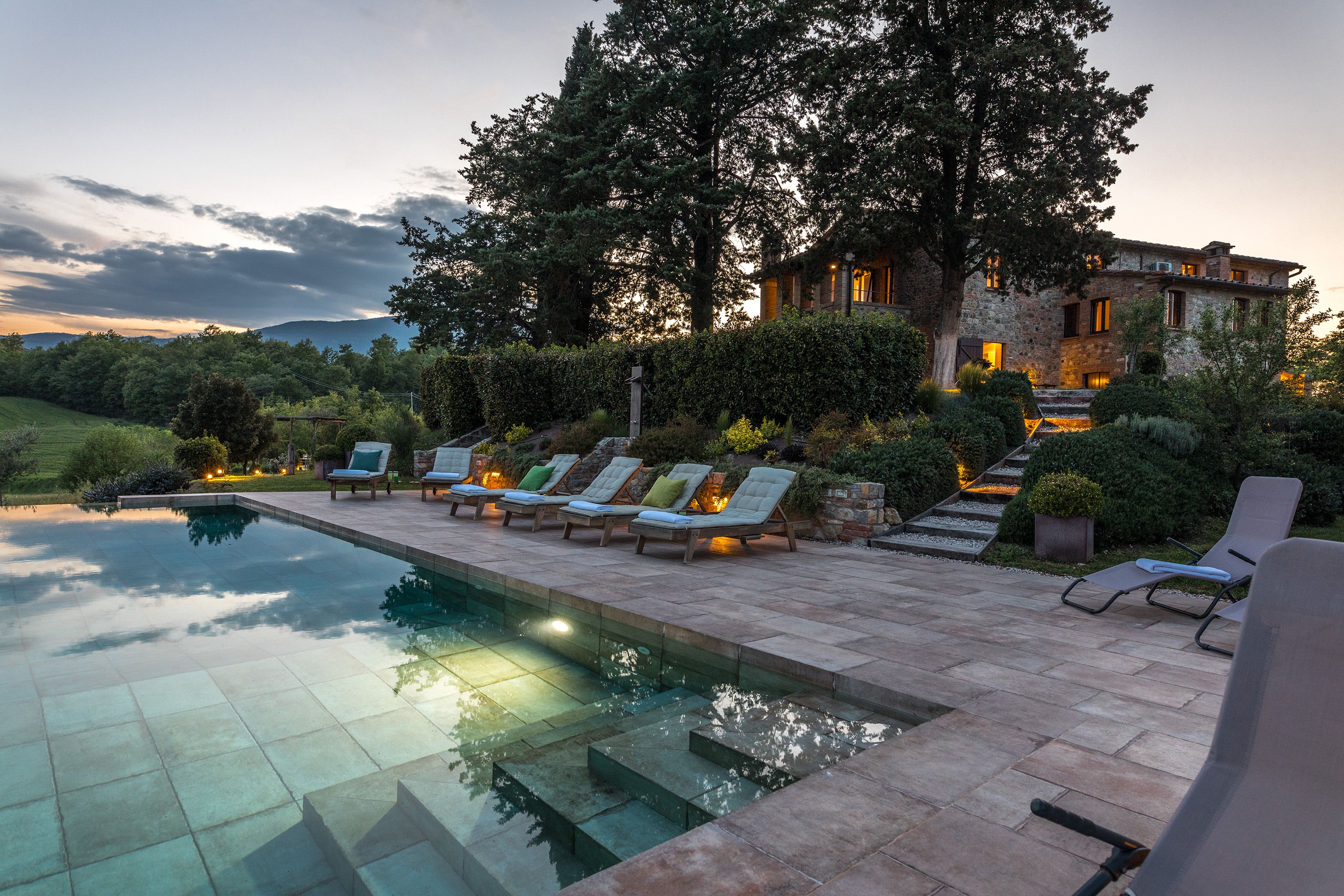 And there’s a lot to see – sitting proudly on a five-hectare estate, the home looks out onto both cultivated land and woodland, a lush garden of flowers and cypress trees. Outside, the rolling landscape is best enjoyed by the shimmering stone pool or the romantic, shaded pergola. In the heat of the afternoon, read in the cool of the study before returning to the patio. Lounge until sunset, where the fiery colours linger longer, and are best enjoyed alongside a bold Tuscan red from the cellar.