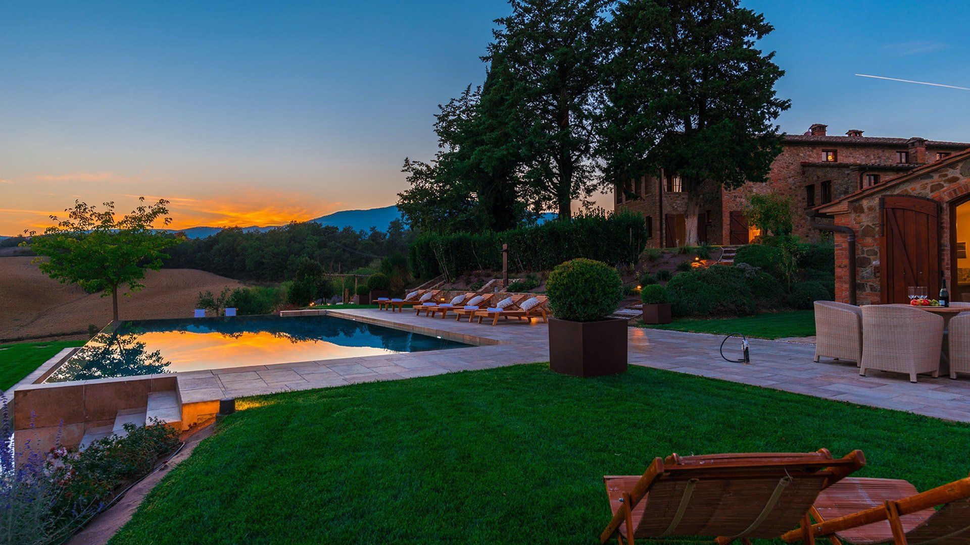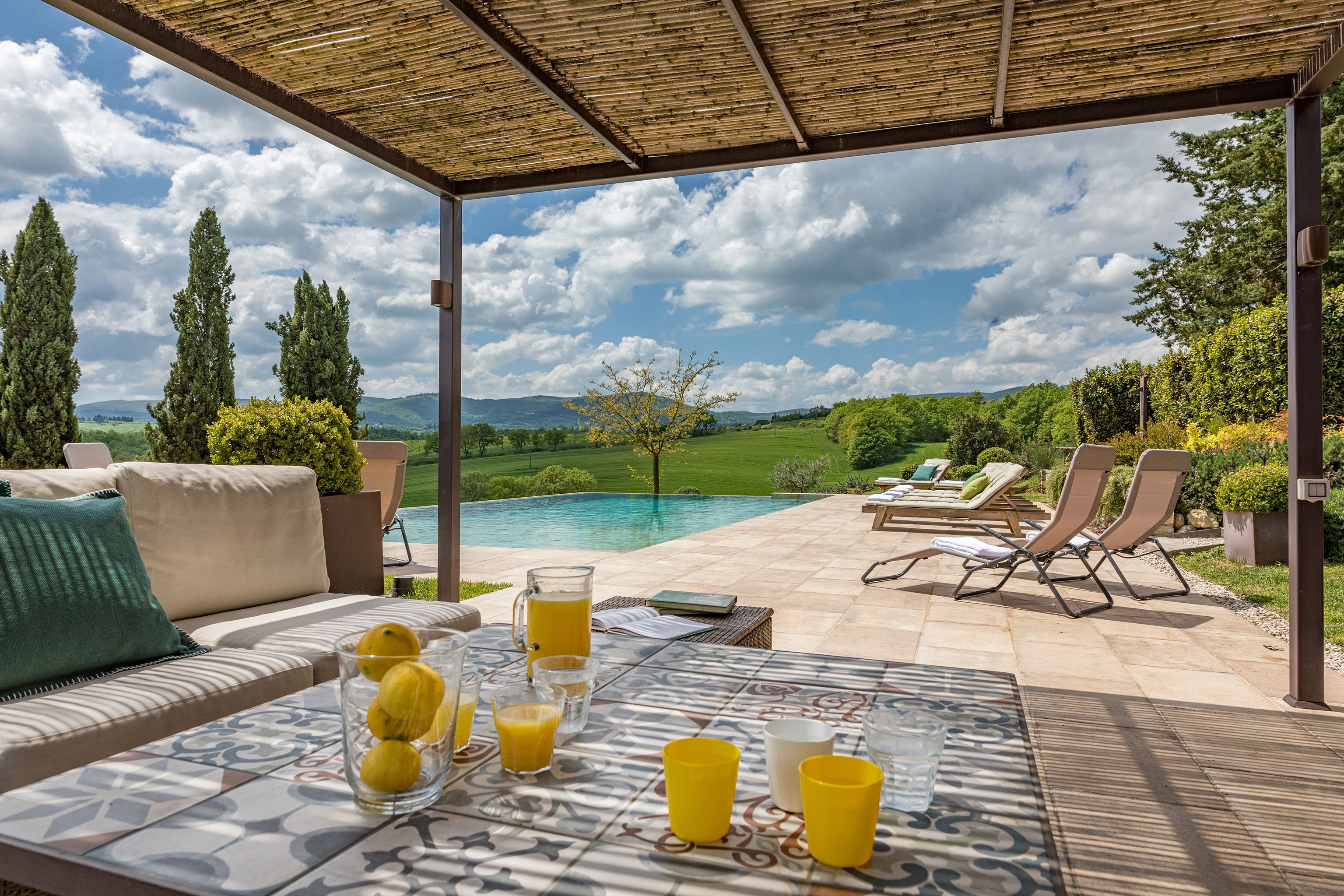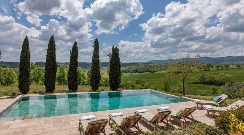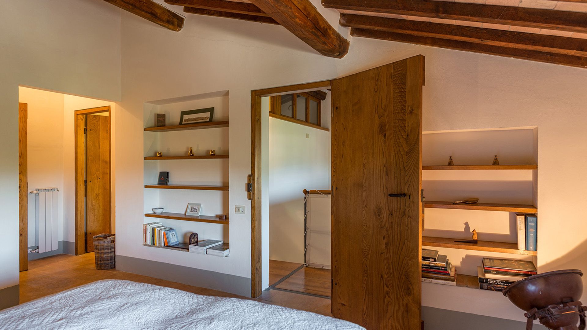 And there’s a lot to see – sitting proudly on a five-hectare estate, the home looks out onto both cultivated land and woodland, a lush garden of flowers and cypress trees. Outside, the rolling landscape is best enjoyed by the shimmering stone pool or the romantic, shaded pergola. In the heat of the afternoon, read in the cool of the study before returning to the patio. Lounge until sunset, where the fiery colours linger longer, and are best enjoyed alongside a bold Tuscan red from the cellar.
