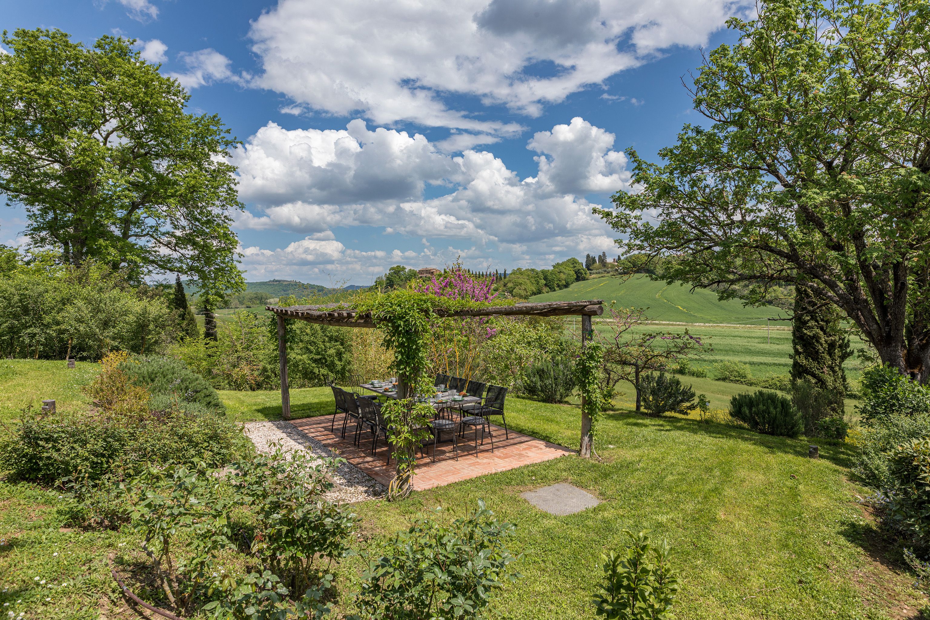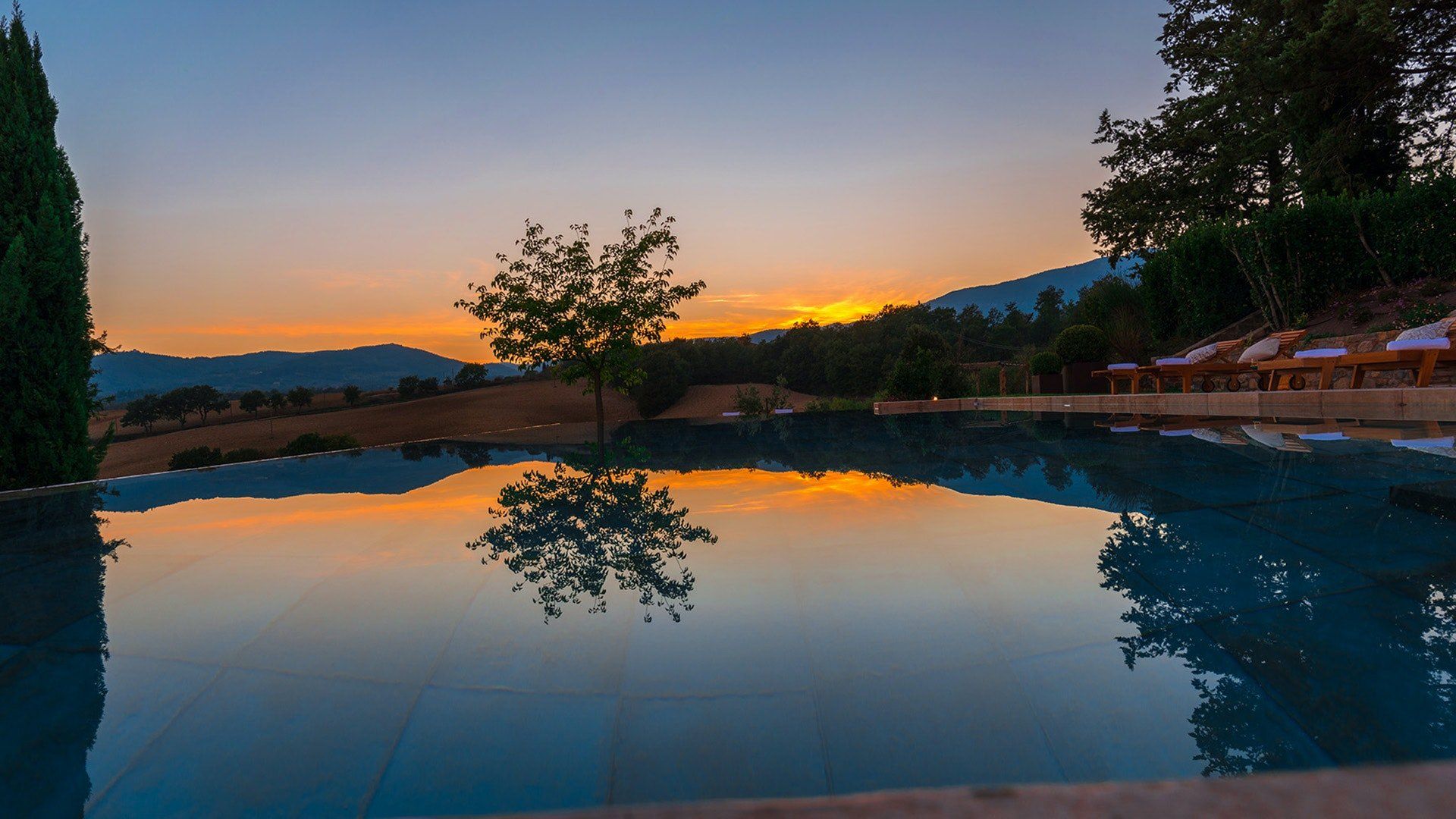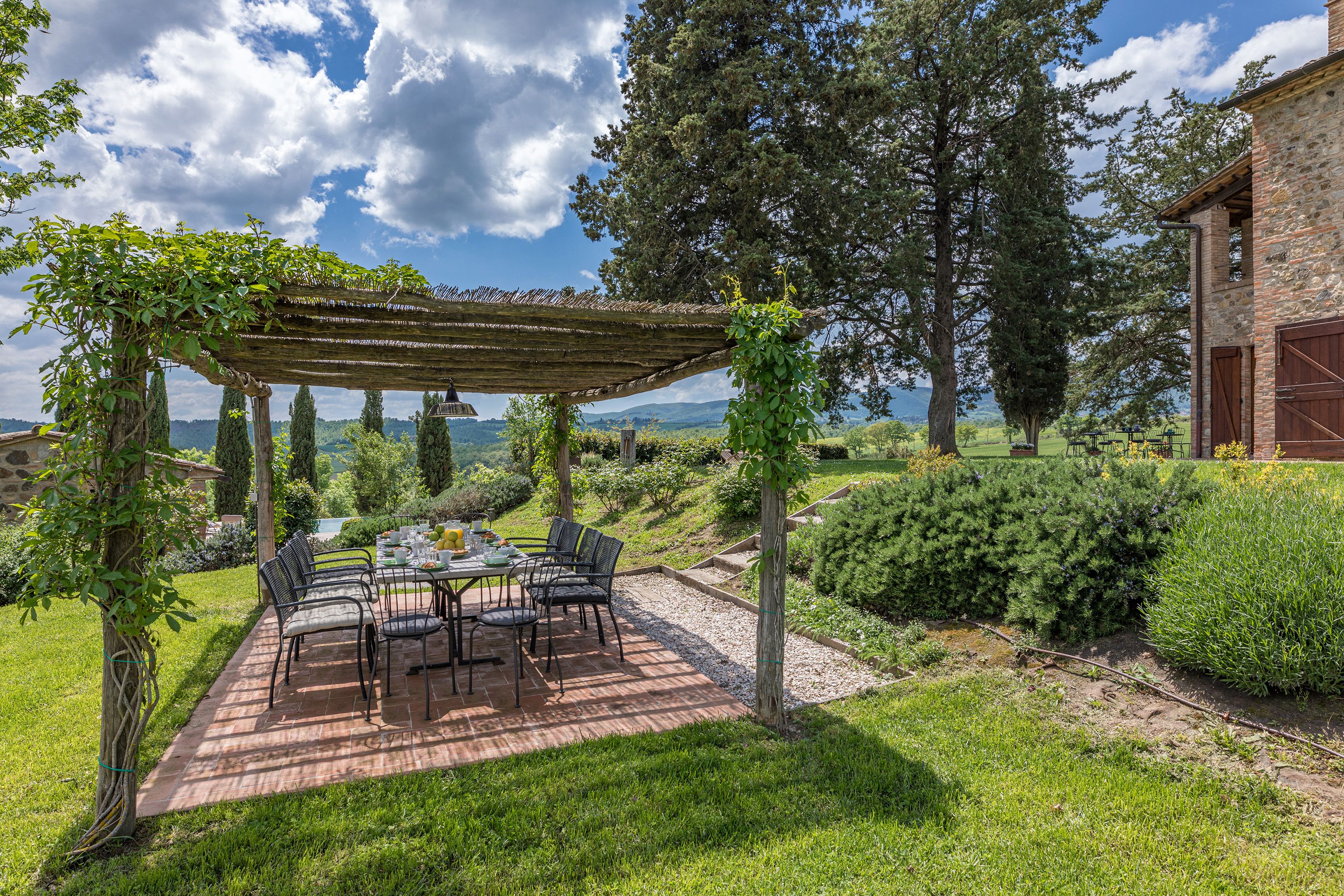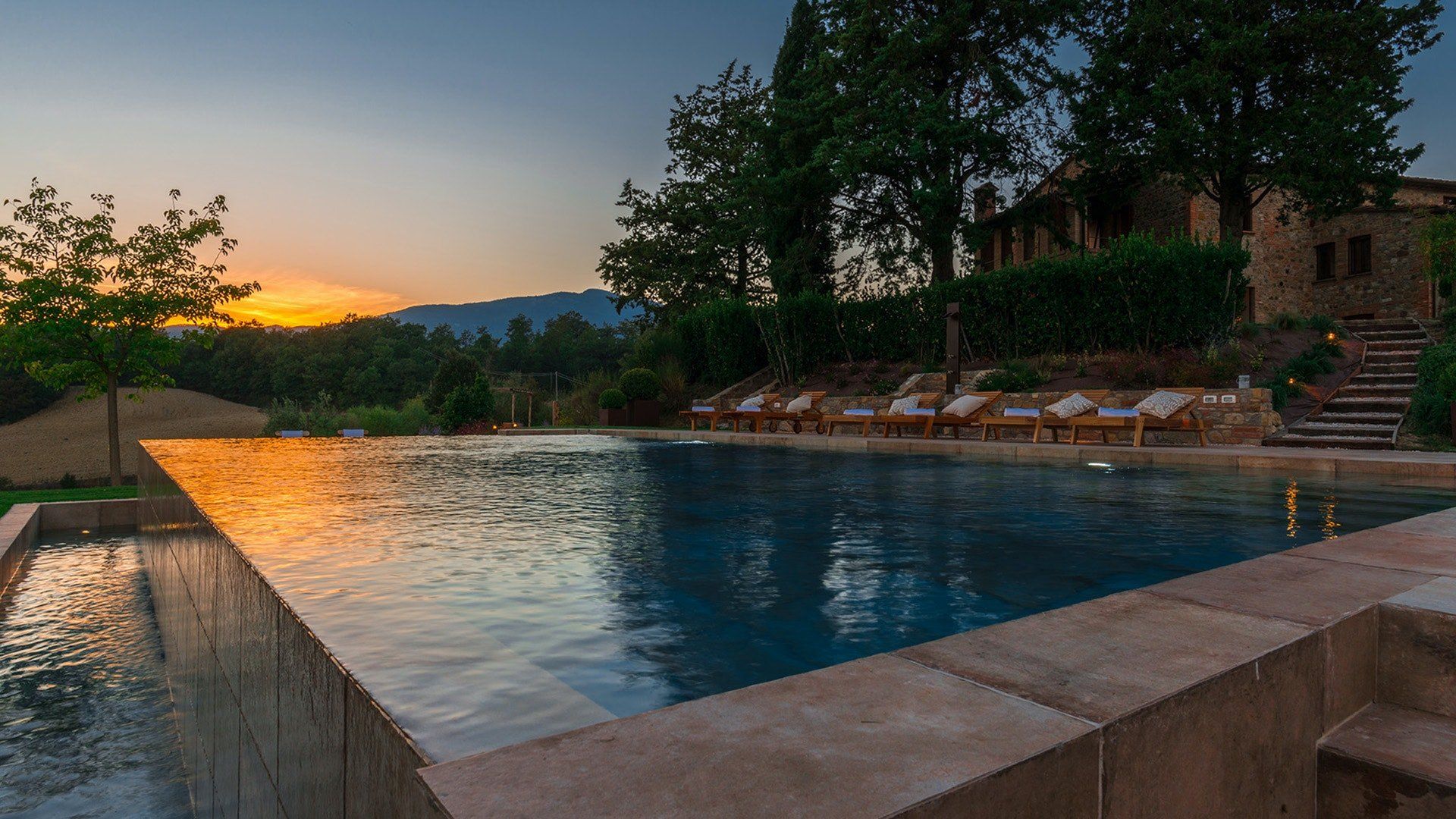 And there’s a lot to see – sitting proudly on a five-hectare estate, the home looks out onto both cultivated land and woodland, a lush garden of flowers and cypress trees. Outside, the rolling landscape is best enjoyed by the shimmering stone pool or the romantic, shaded pergola. In the heat of the afternoon, read in the cool of the study before returning to the patio. Lounge until sunset, where the fiery colours linger longer, and are best enjoyed alongside a bold Tuscan red from the cellar.