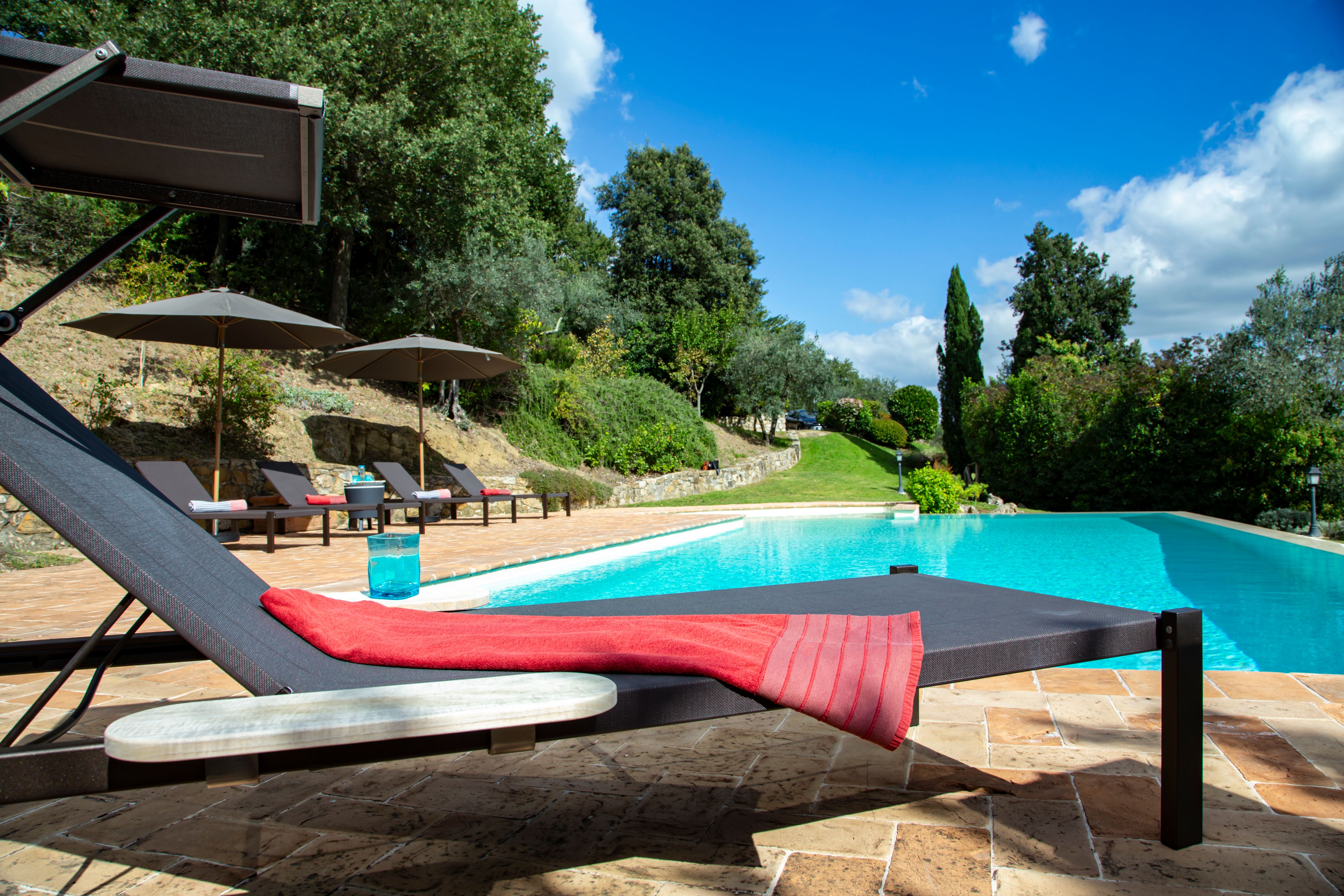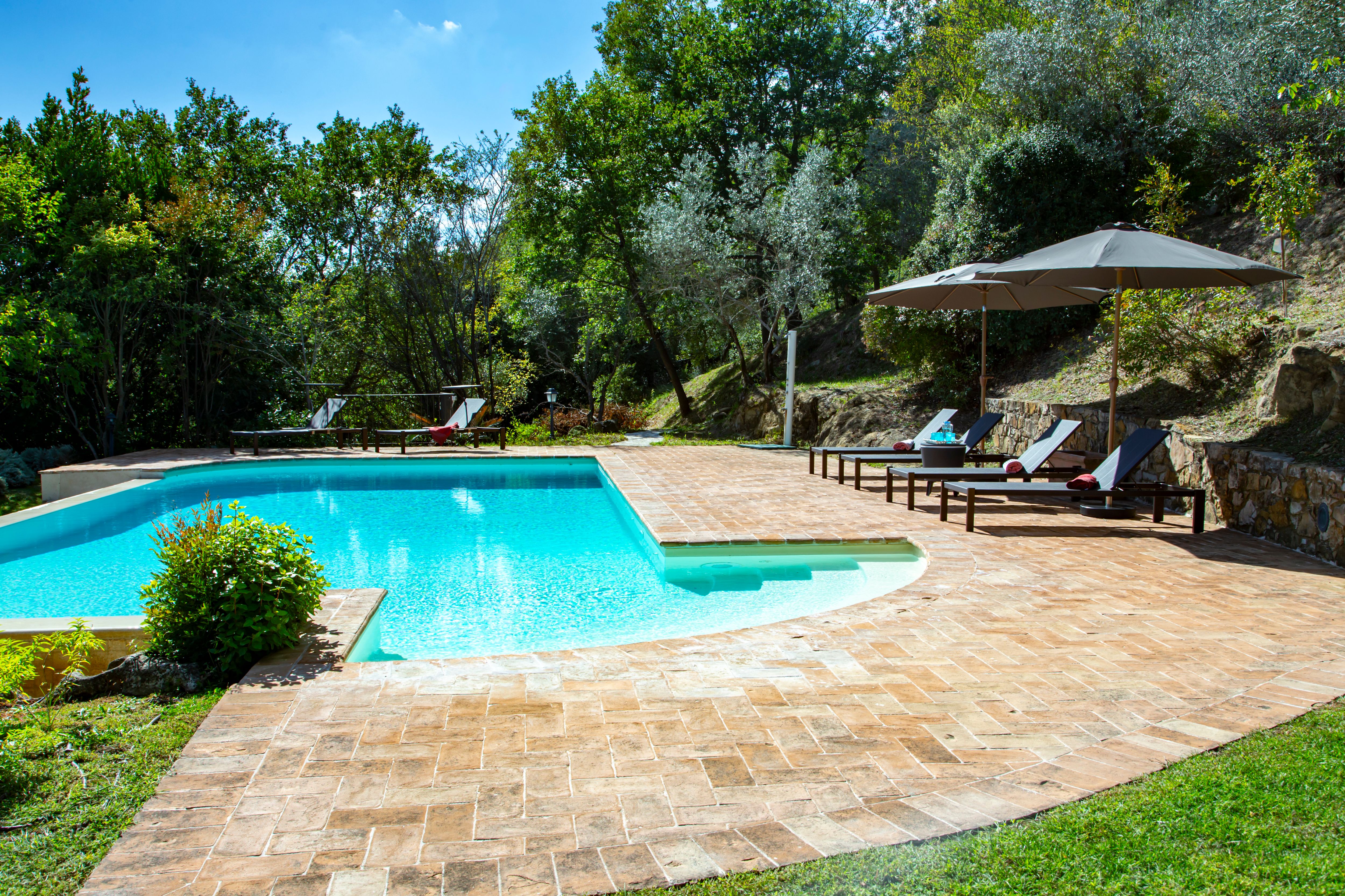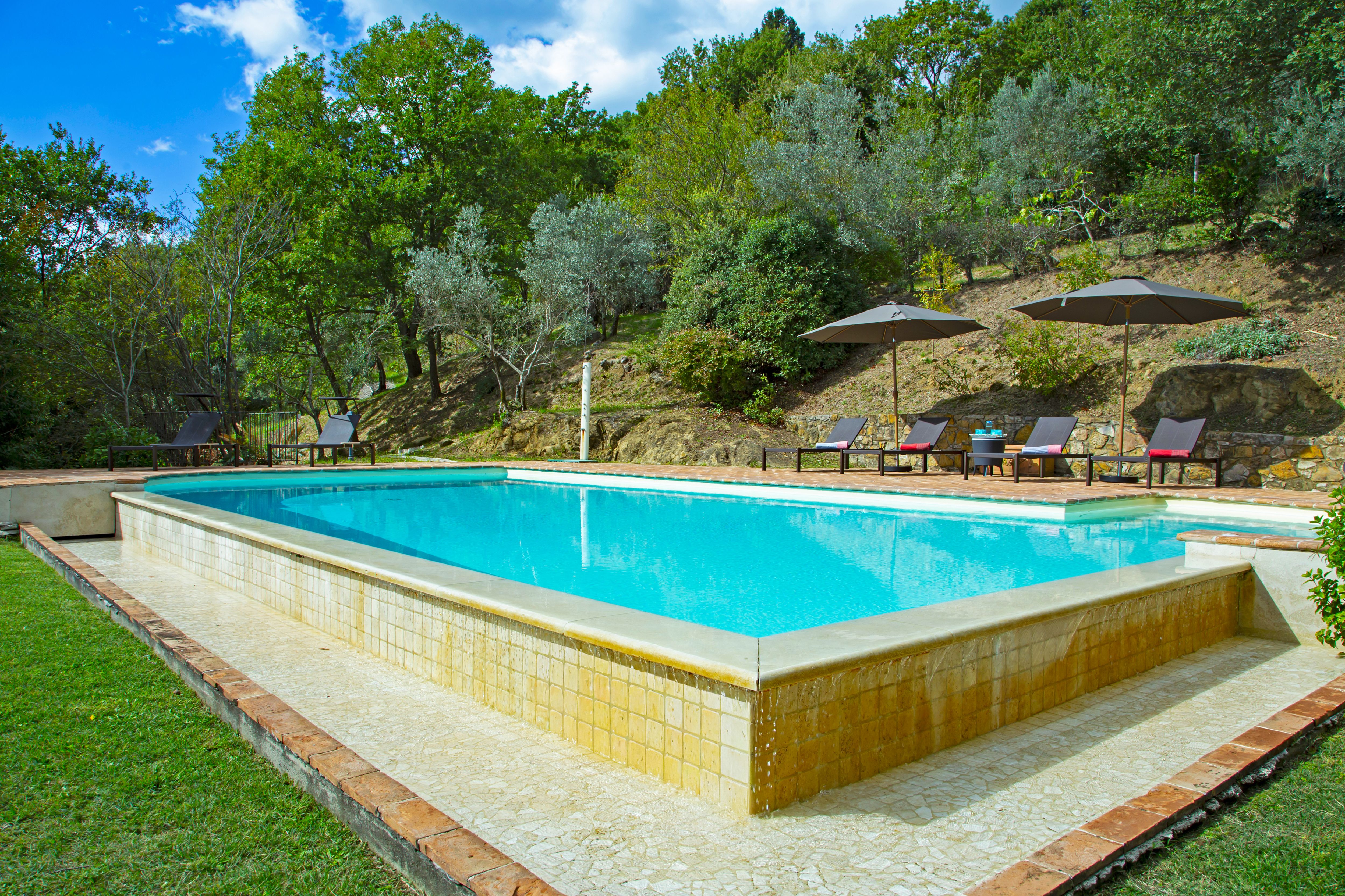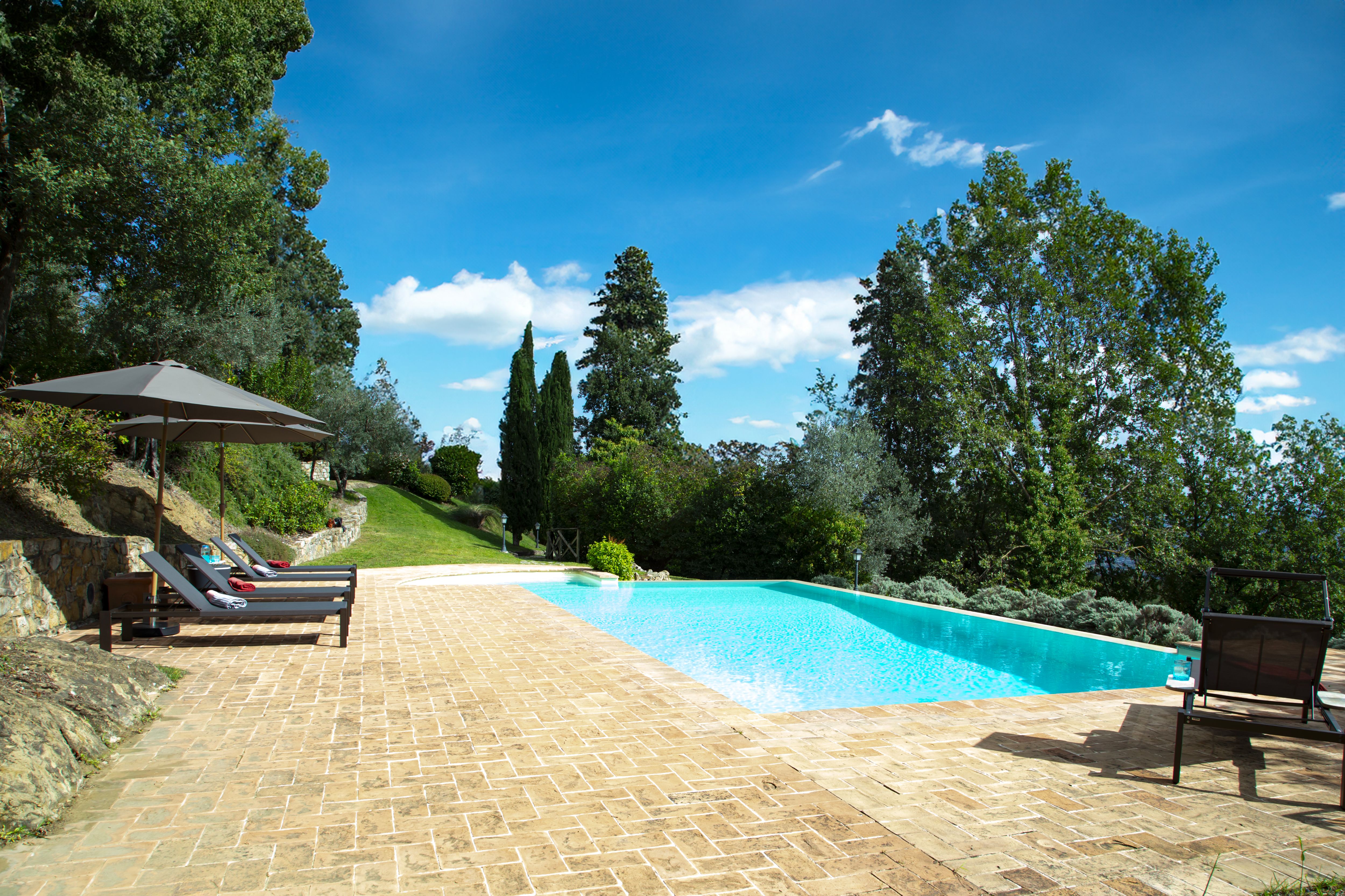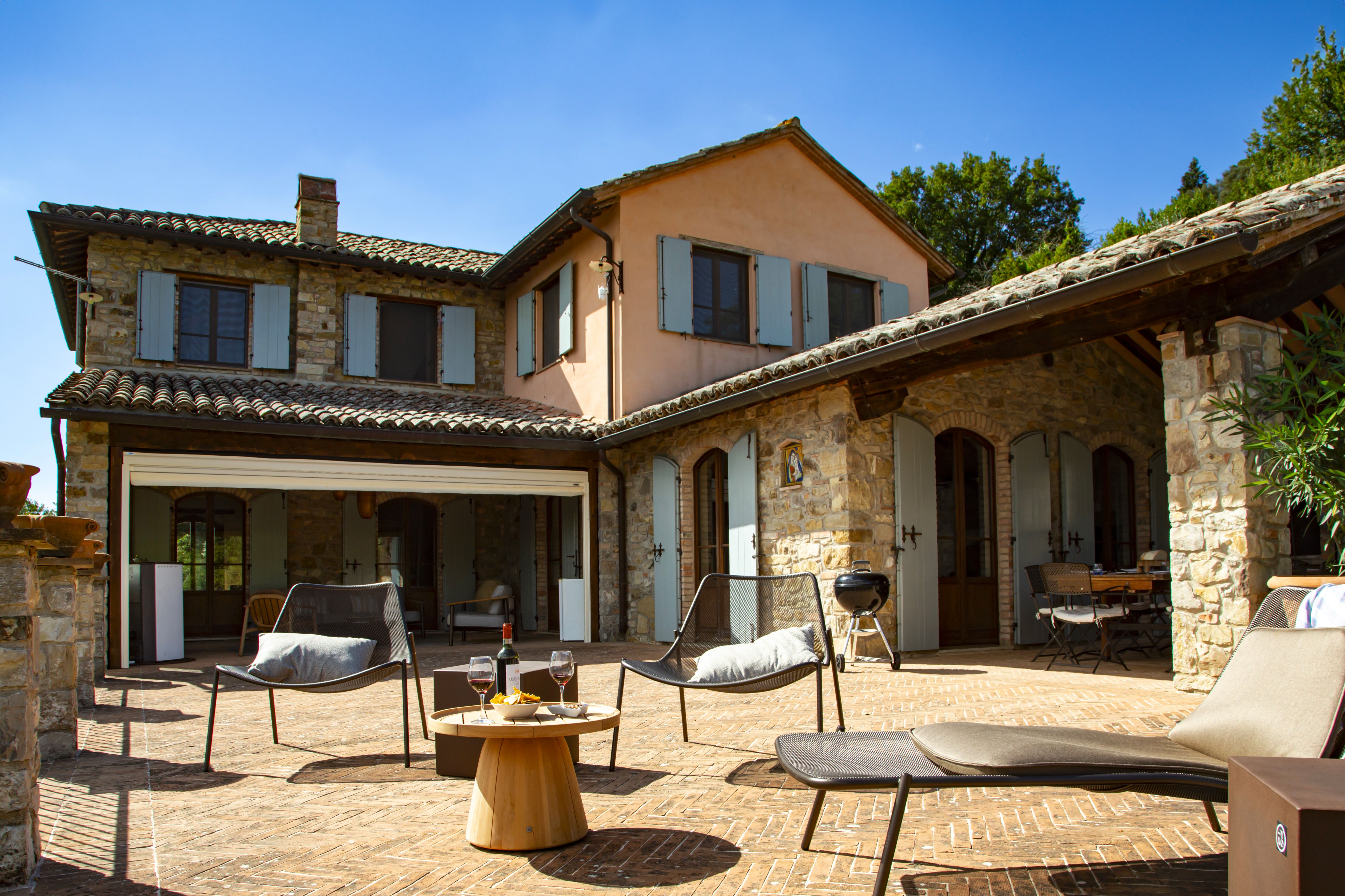 Sitting pretty in the rural hamlet of San Venanzo at the foothills of Mount Peglia, this Finca-style villa is a picture of rustic charm and countryside splendour. Turn off the beaten track through a surplus of olive trees, maples, oaks and cypresses, and escape from reality by tucking yourself away in the remote Umbrian hills – perfect for larger groups seeking serenity and calm. The home is steeped in tradition, comfort, and authenticity with wood-beamed ceilings, stone flooring and veranda shaded dining areas. Decorated with plenty of Italian passion in mind, the interior benefits from dark wooden furnishings, antique rugs, ceramic pots, and homely touches that create a cosy and warm ambience. Outside, meander through the rolling hills, float idly in the glistening infinity pool or dine alfresco on the patio with local produce and vino. If you can bear to leave your Italian abode, beautiful Perugia is a 20-minute drive away, with a host of vineyards and wineries even closer. To stay here is to be connected to the simpler pleasures of the Umbrian countryside, slowing down and adopting the pace of nature with your loved ones.