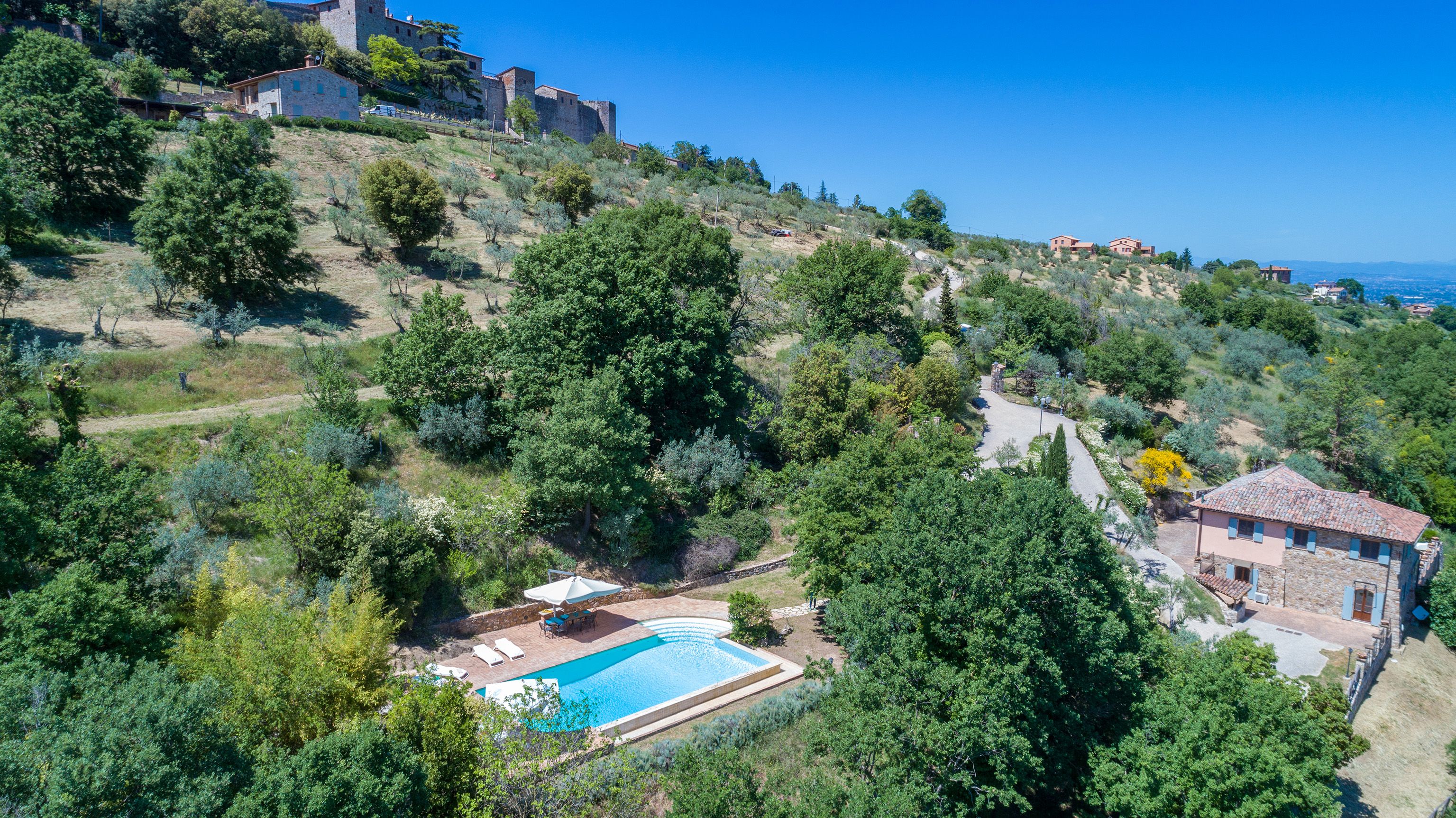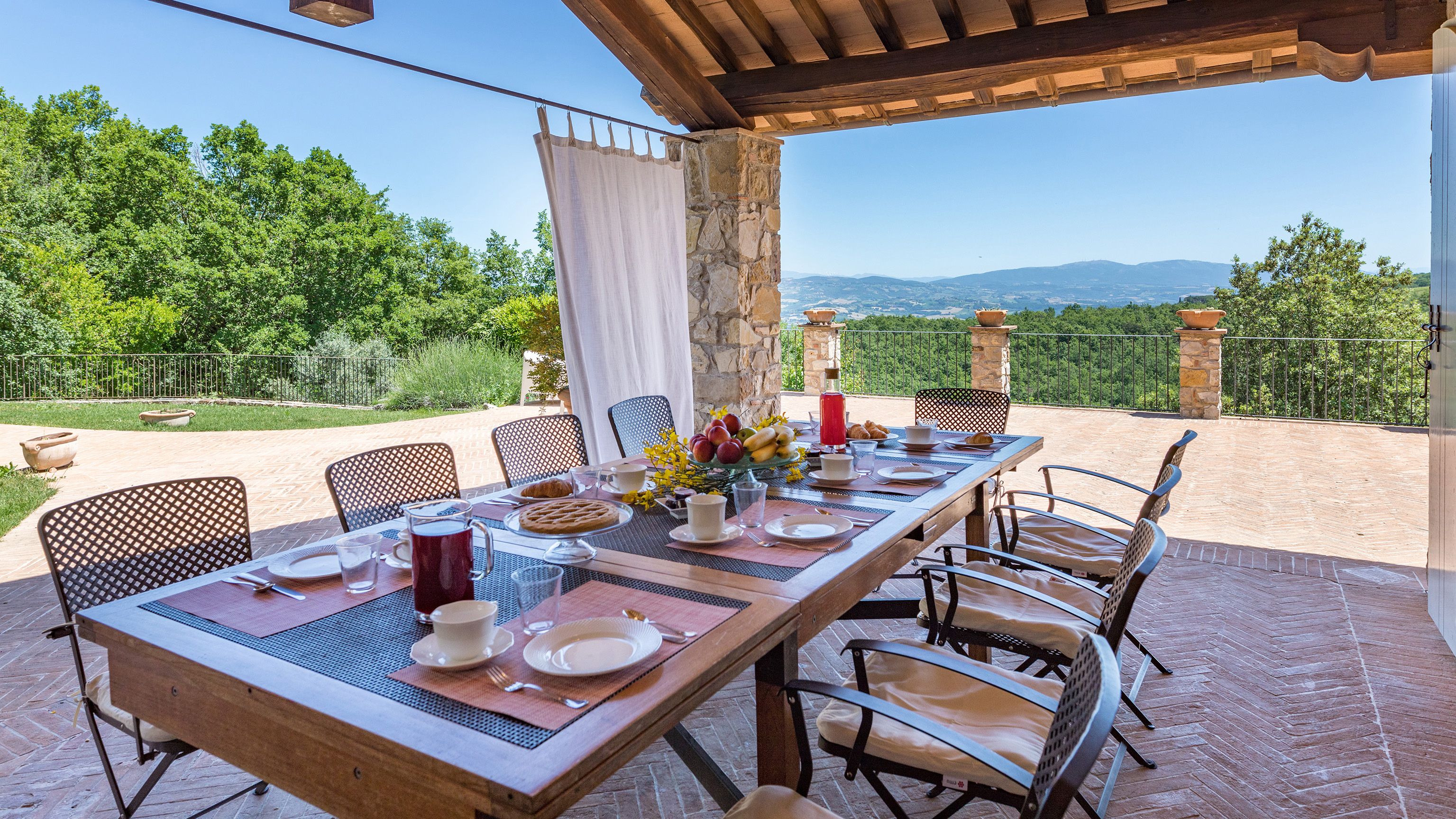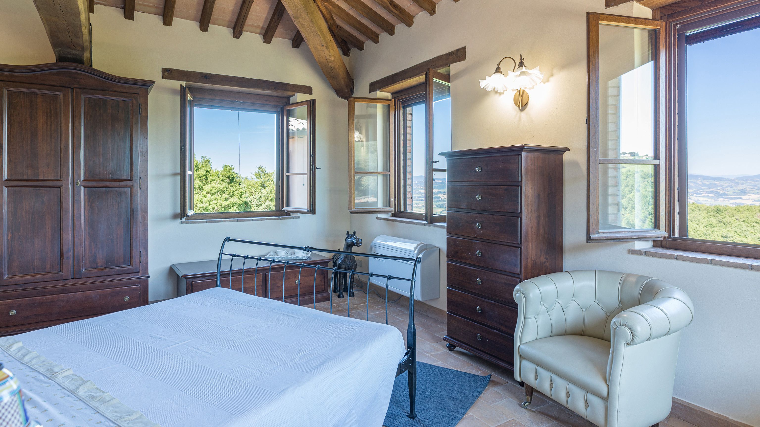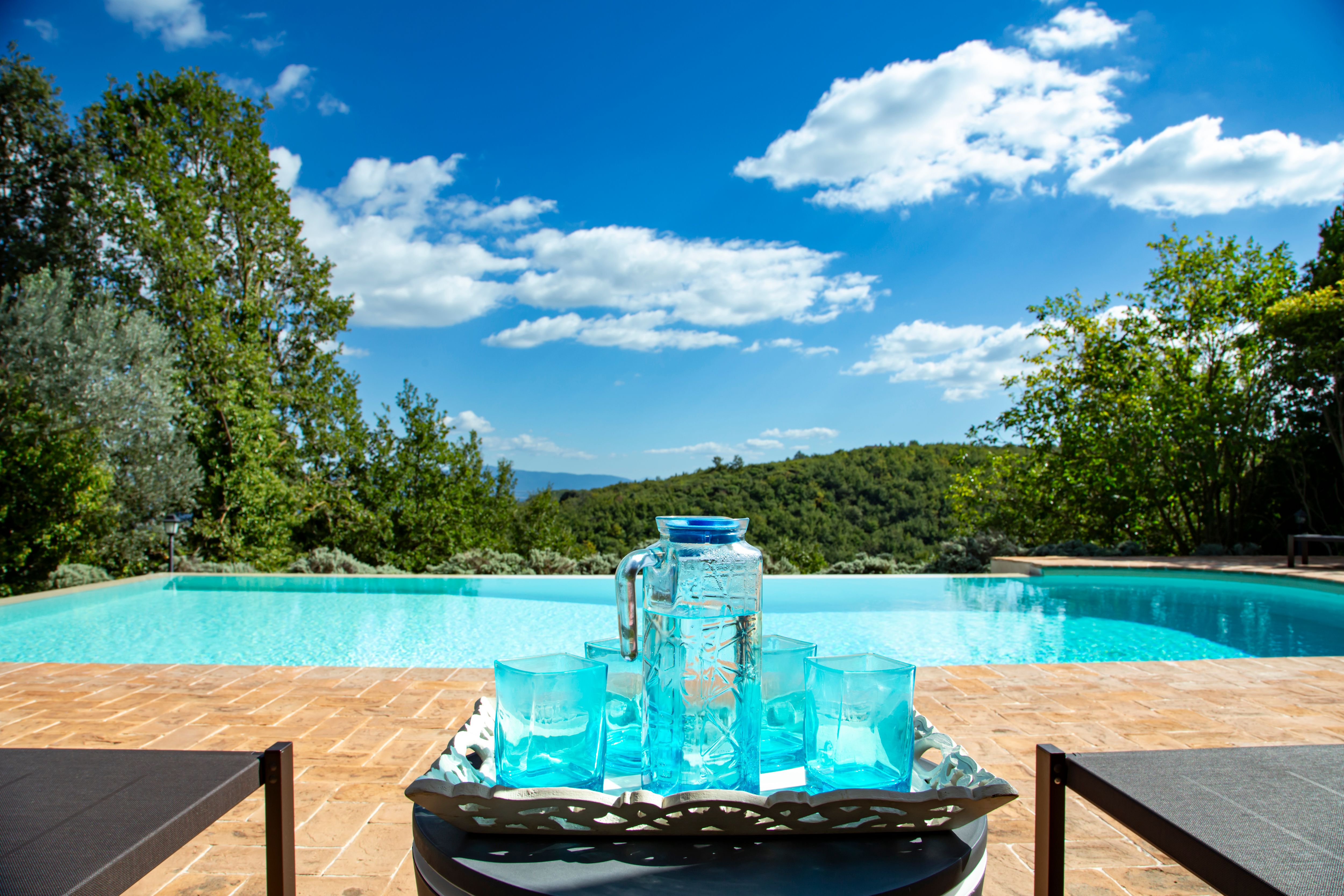 Sitting pretty in the rural hamlet of San Venanzo at the foothills of Mount Peglia, this Finca-style villa is a picture of rustic charm and countryside splendour. Turn off the beaten track through a surplus of olive trees, maples, oaks and cypresses, and escape from reality by tucking yourself away in the remote Umbrian hills – perfect for larger groups seeking serenity and calm. The home is steeped in tradition, comfort, and authenticity with wood-beamed ceilings, stone flooring and veranda shaded dining areas. Decorated with plenty of Italian passion in mind, the interior benefits from dark wooden furnishings, antique rugs, ceramic pots, and homely touches that create a cosy and warm ambience. Outside, meander through the rolling hills, float idly in the glistening infinity pool or dine alfresco on the patio with local produce and vino. If you can bear to leave your Italian abode, beautiful Perugia is a 20-minute drive away, with a host of vineyards and wineries even closer. To stay here is to be connected to the simpler pleasures of the Umbrian countryside, slowing down and adopting the pace of nature with your loved ones.