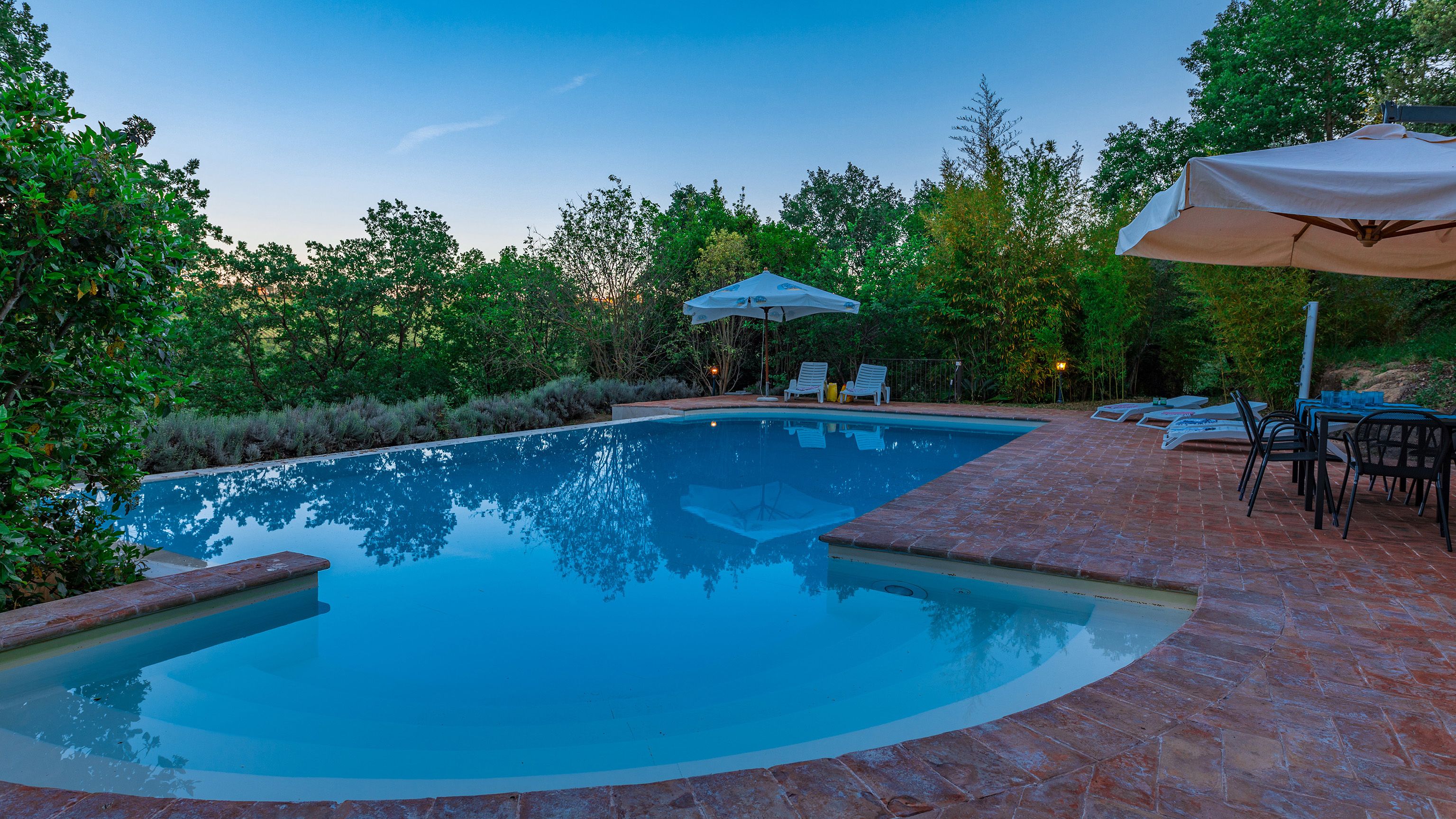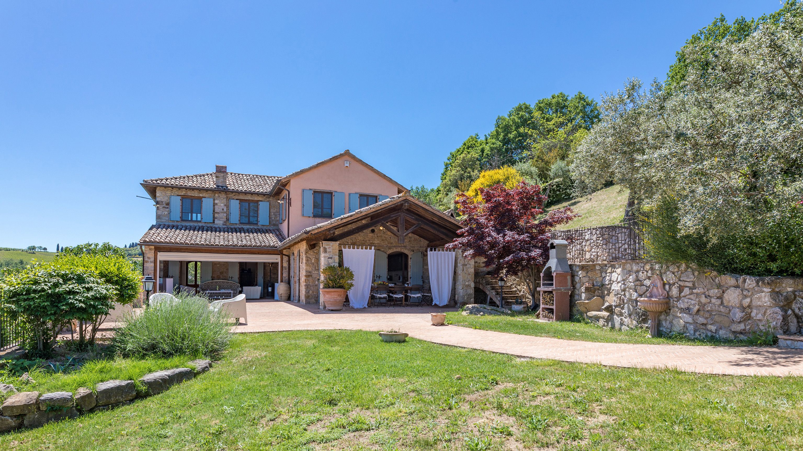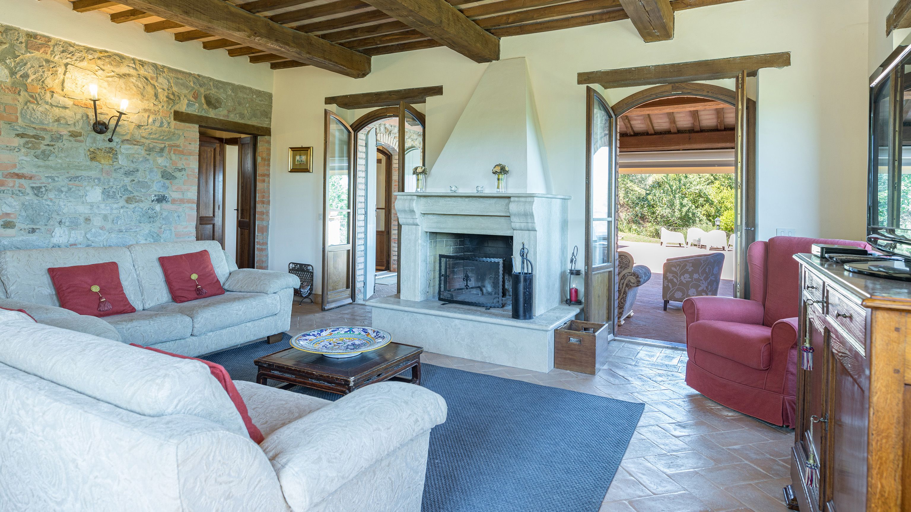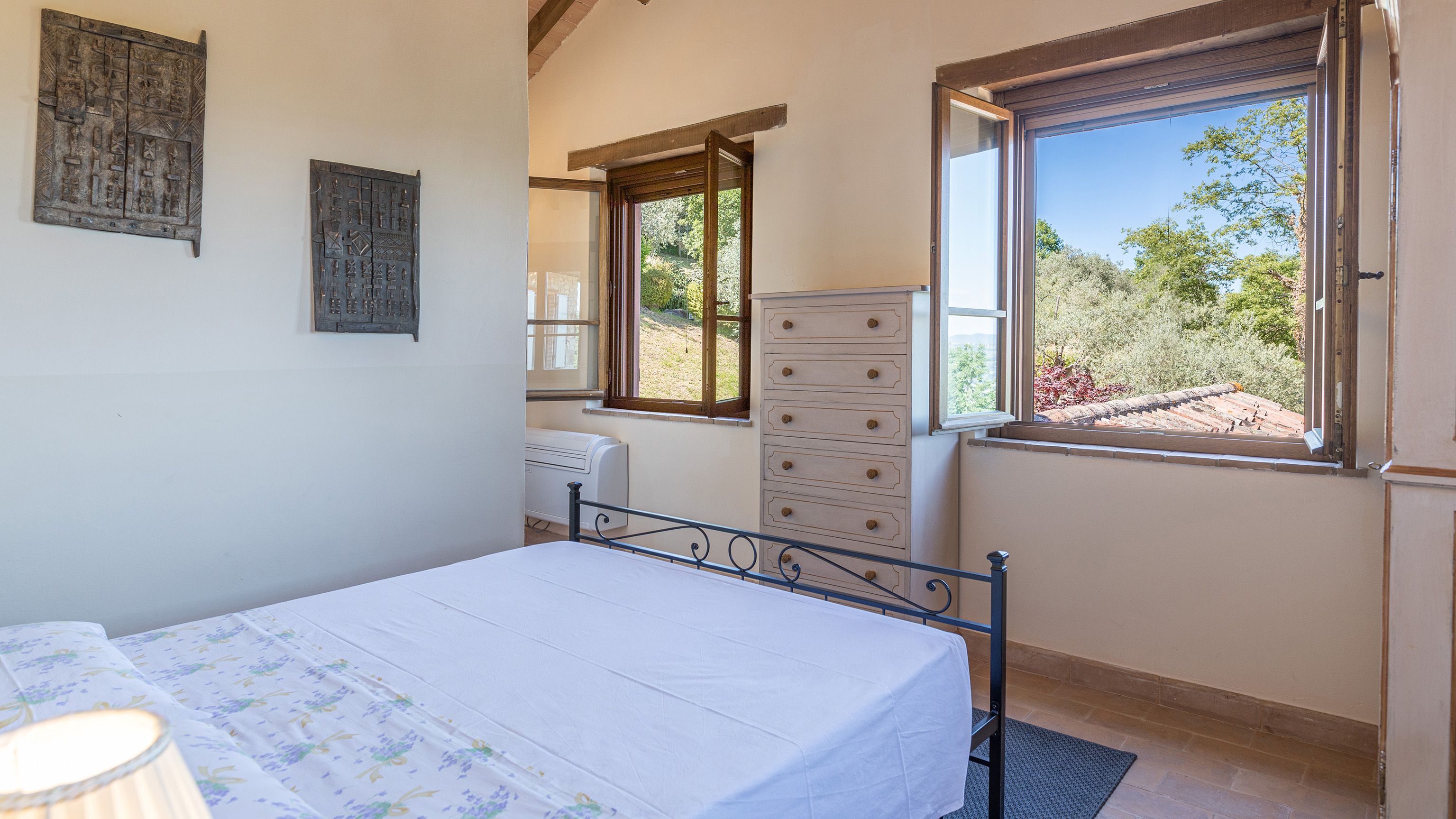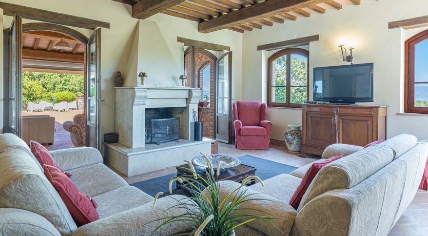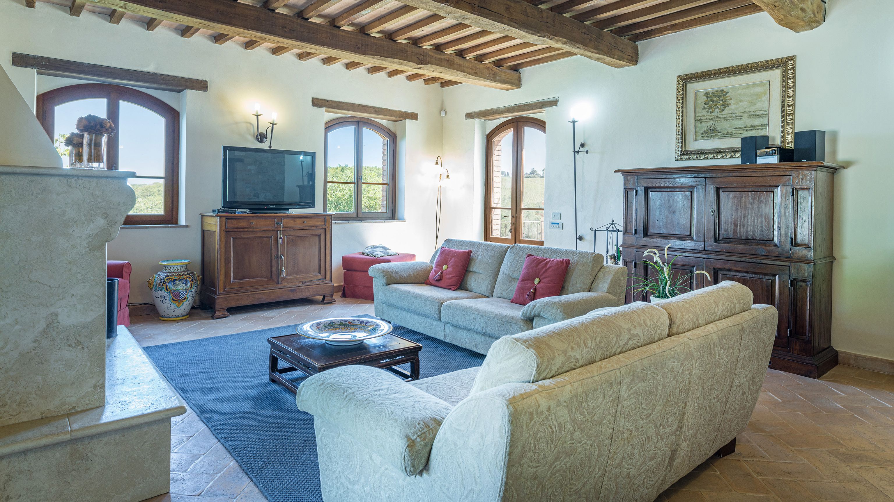 Sitting pretty in the rural hamlet of San Venanzo at the foothills of Mount Peglia, this Finca-style villa is a picture of rustic charm and countryside splendour. Turn off the beaten track through a surplus of olive trees, maples, oaks and cypresses, and escape from reality by tucking yourself away in the remote Umbrian hills – perfect for larger groups seeking serenity and calm. The home is steeped in tradition, comfort, and authenticity with wood-beamed ceilings, stone flooring and veranda shaded dining areas. Decorated with plenty of Italian passion in mind, the interior benefits from dark wooden furnishings, antique rugs, ceramic pots, and homely touches that create a cosy and warm ambience. Outside, meander through the rolling hills, float idly in the glistening infinity pool or dine alfresco on the patio with local produce and vino. If you can bear to leave your Italian abode, beautiful Perugia is a 20-minute drive away, with a host of vineyards and wineries even closer. To stay here is to be connected to the simpler pleasures of the Umbrian countryside, slowing down and adopting the pace of nature with your loved ones.