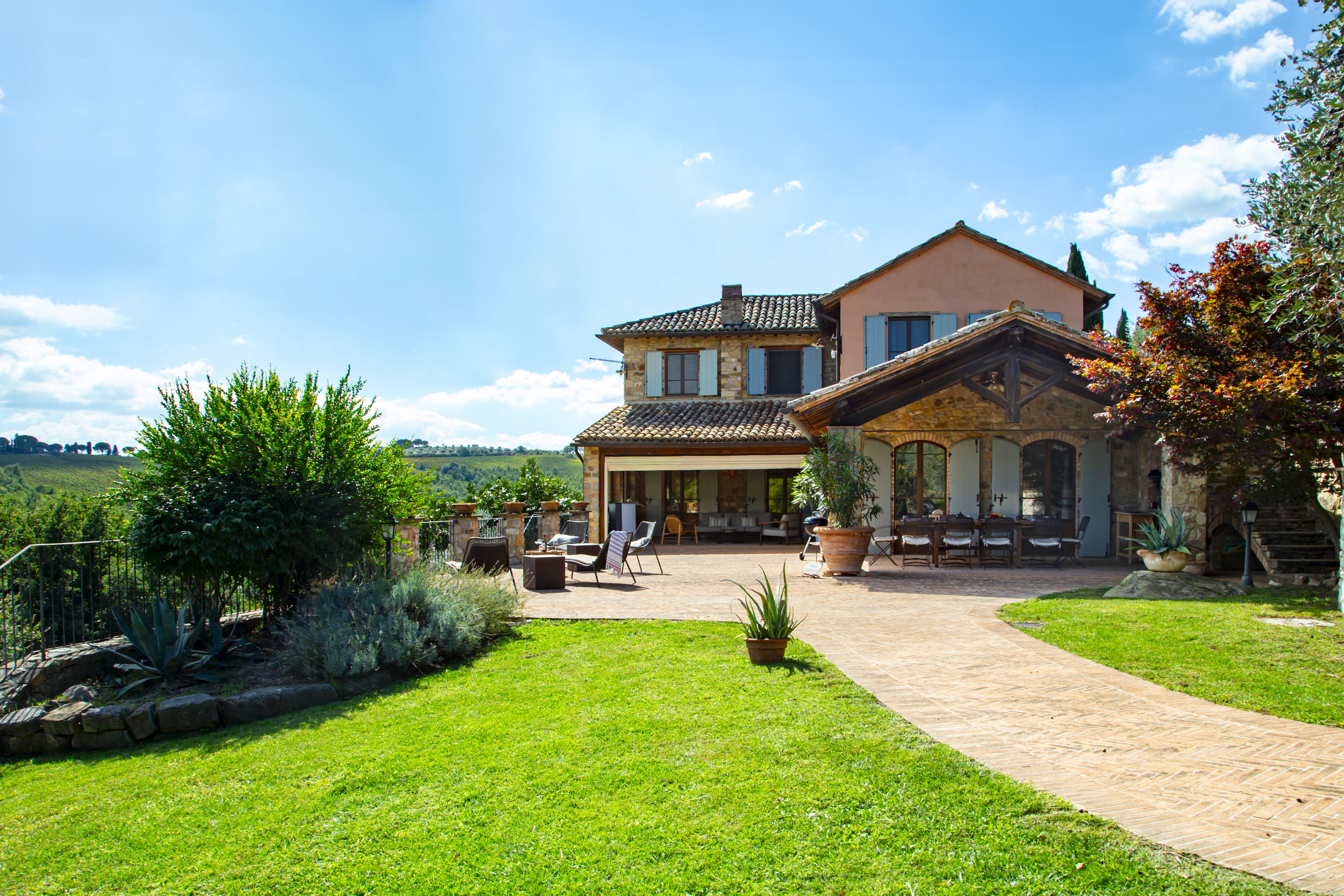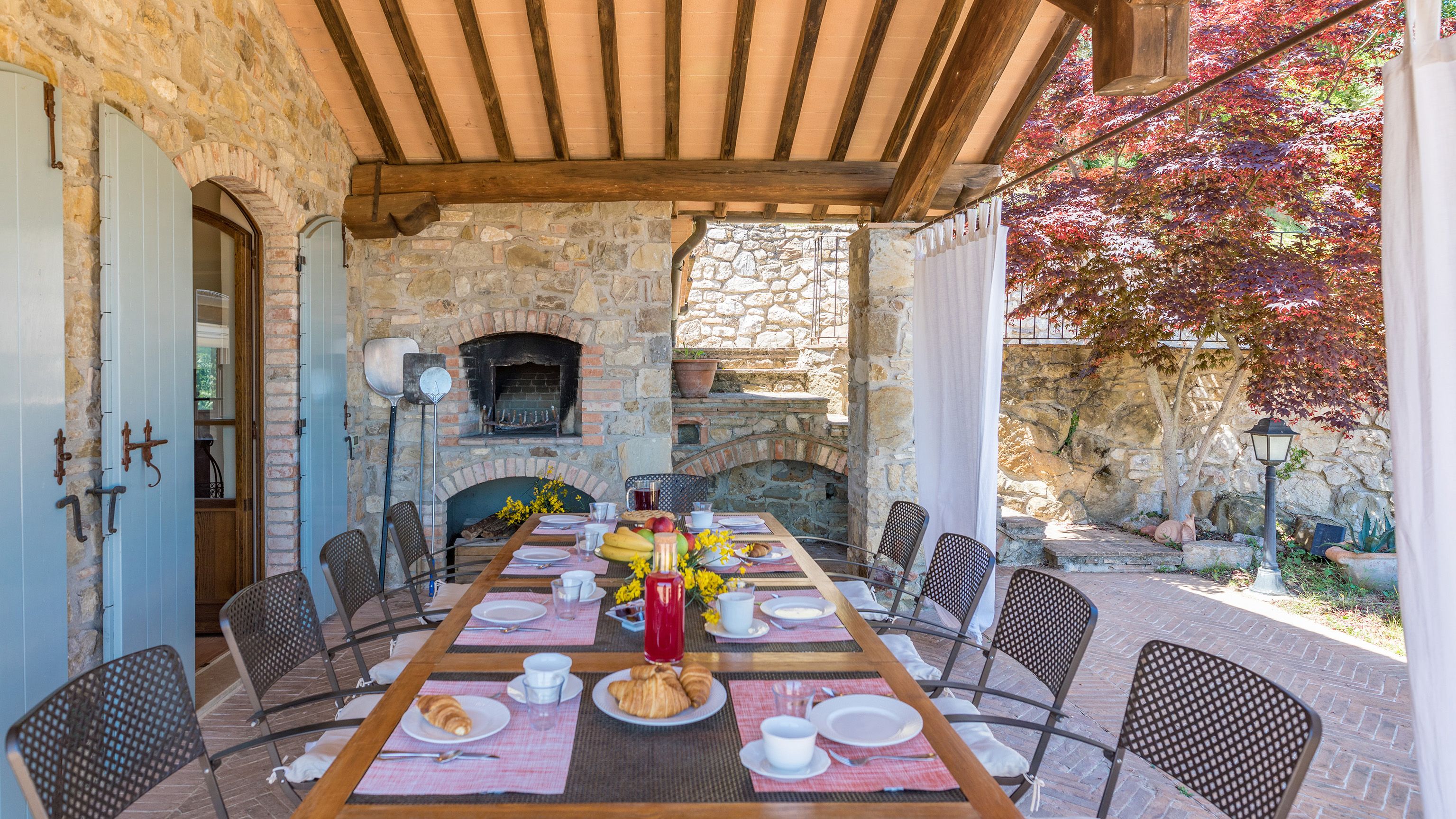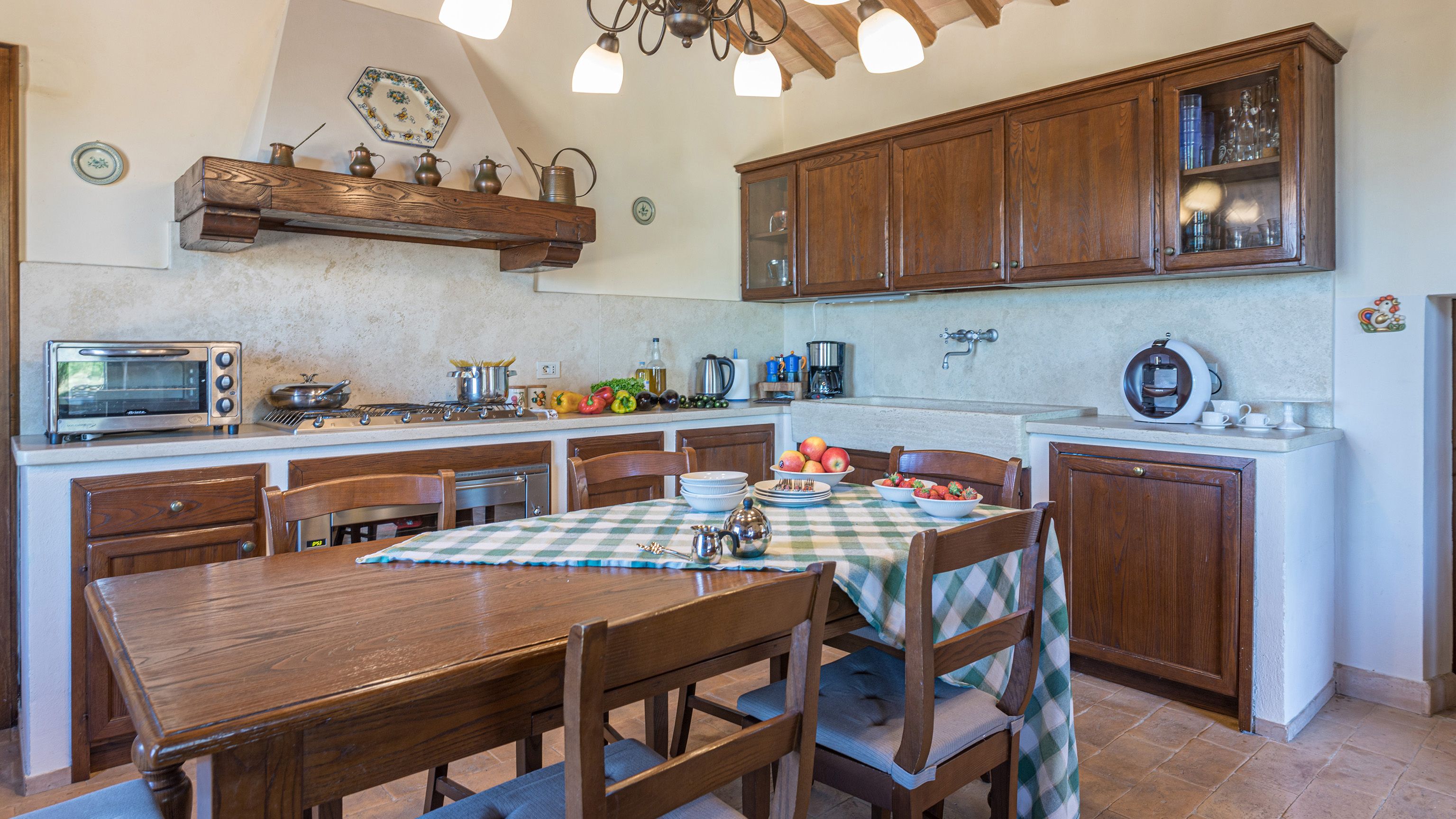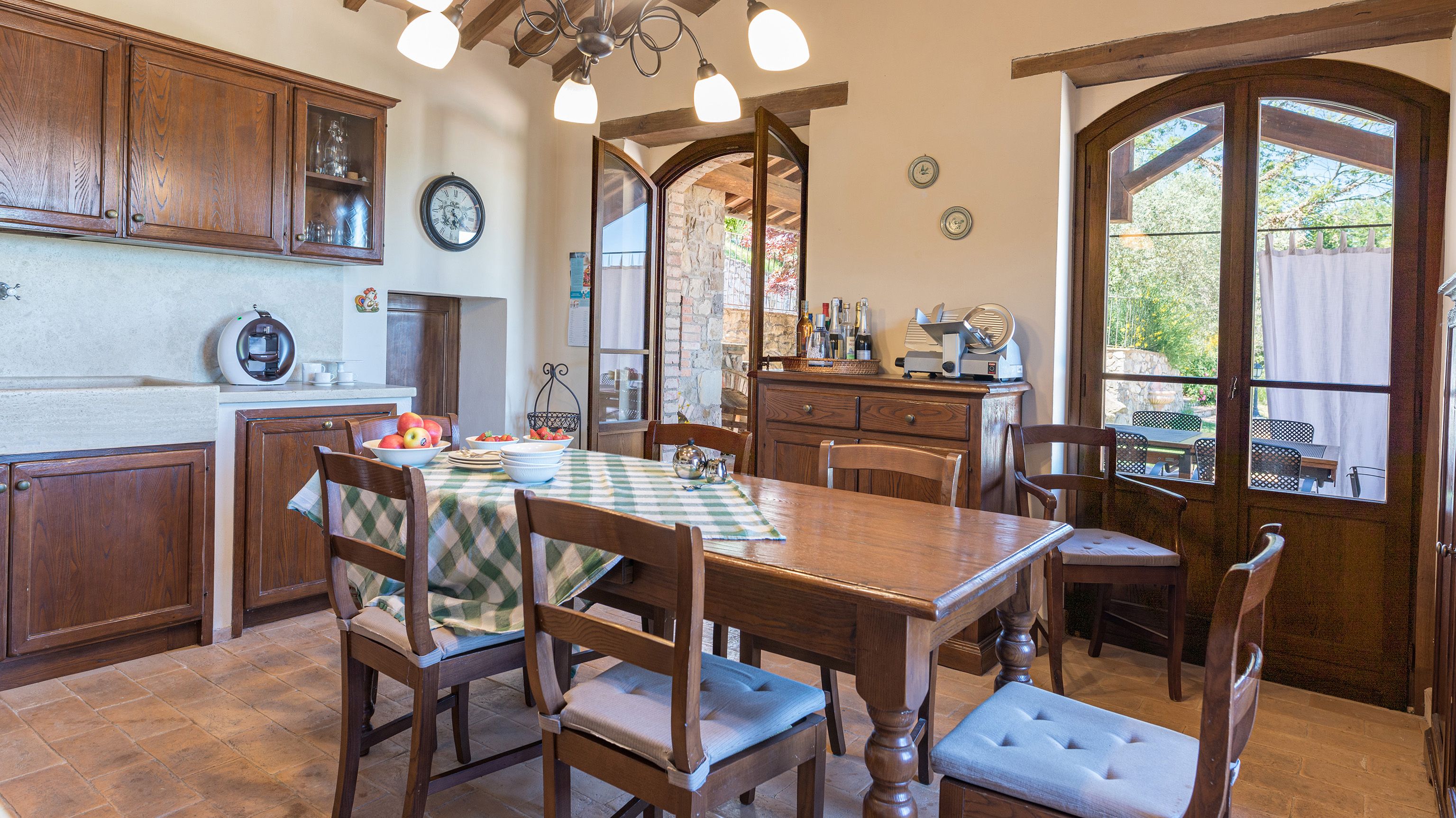 Sitting pretty in the rural hamlet of San Venanzo at the foothills of Mount Peglia, this Finca-style villa is a picture of rustic charm and countryside splendour. Turn off the beaten track through a surplus of olive trees, maples, oaks and cypresses, and escape from reality by tucking yourself away in the remote Umbrian hills – perfect for larger groups seeking serenity and calm. The home is steeped in tradition, comfort, and authenticity with wood-beamed ceilings, stone flooring and veranda shaded dining areas. Decorated with plenty of Italian passion in mind, the interior benefits from dark wooden furnishings, antique rugs, ceramic pots, and homely touches that create a cosy and warm ambience. Outside, meander through the rolling hills, float idly in the glistening infinity pool or dine alfresco on the patio with local produce and vino. If you can bear to leave your Italian abode, beautiful Perugia is a 20-minute drive away, with a host of vineyards and wineries even closer. To stay here is to be connected to the simpler pleasures of the Umbrian countryside, slowing down and adopting the pace of nature with your loved ones.