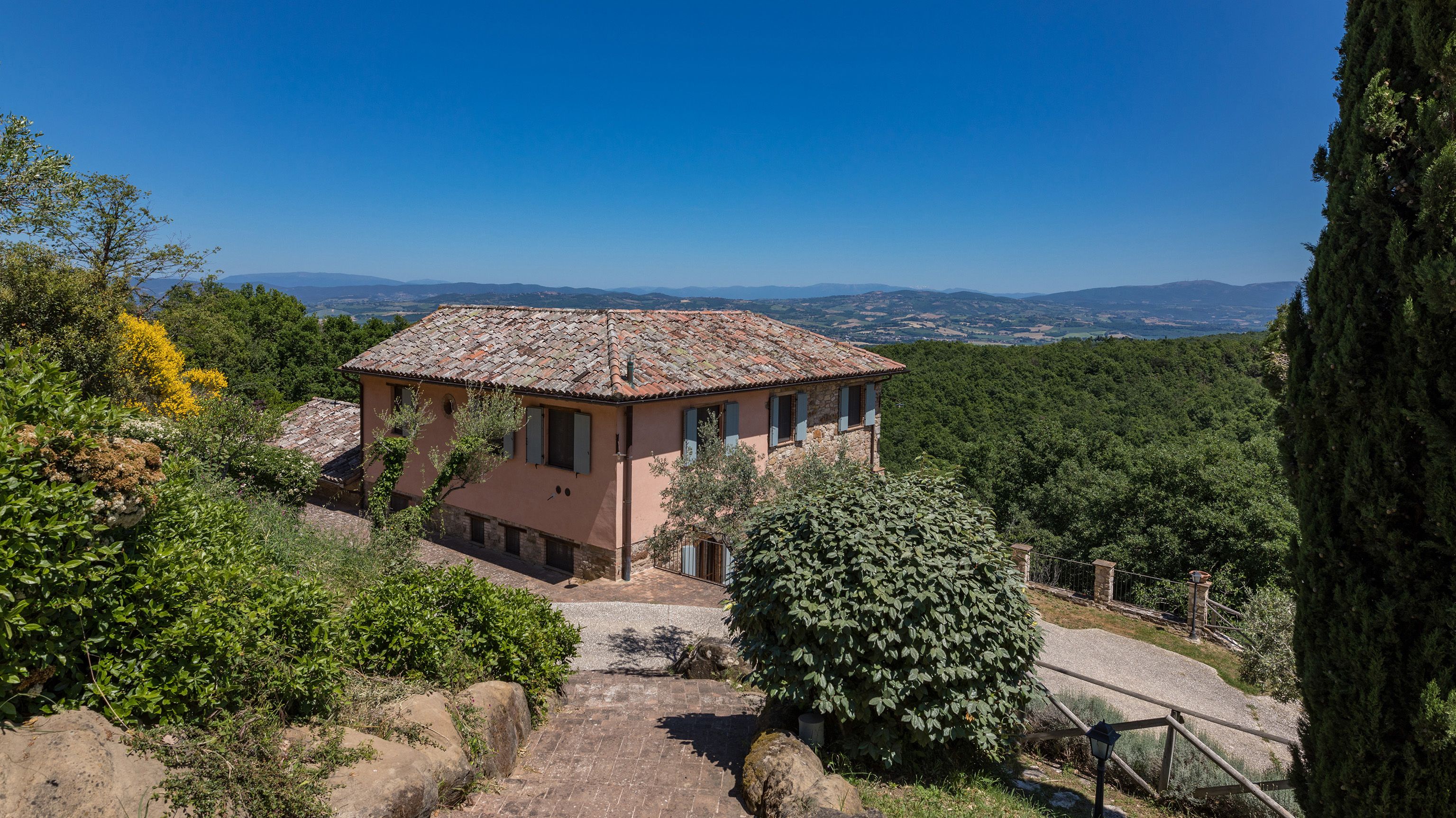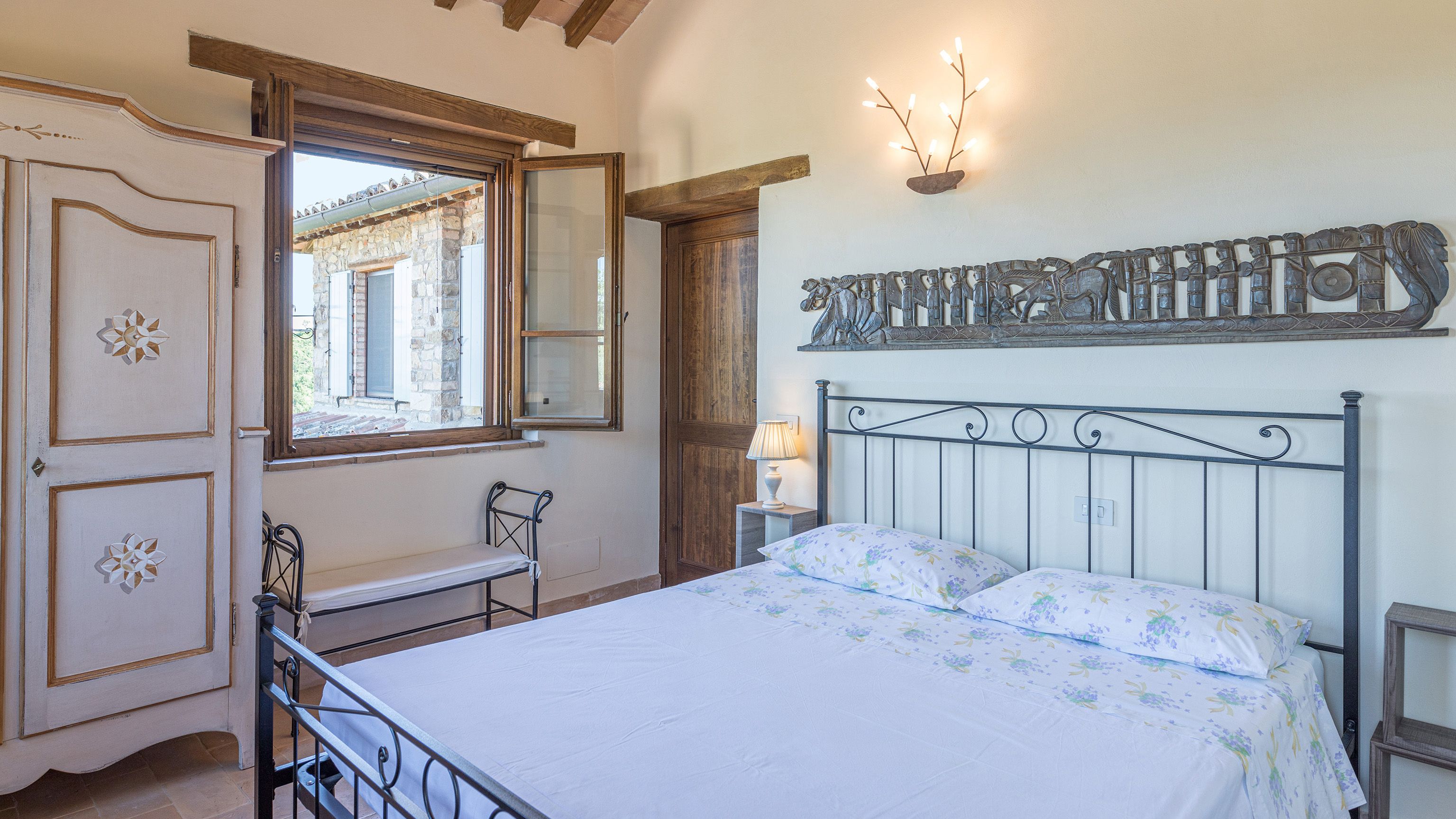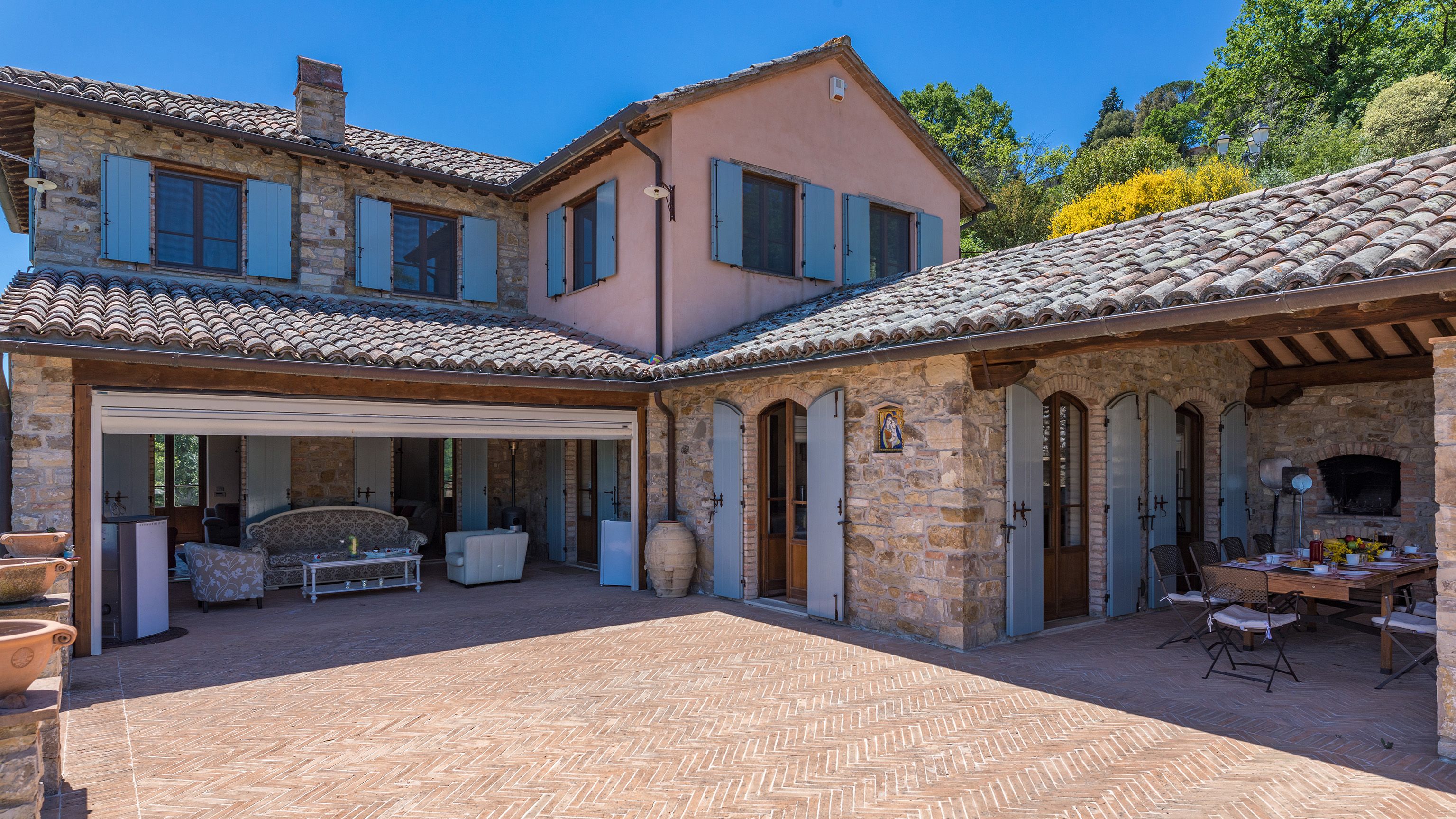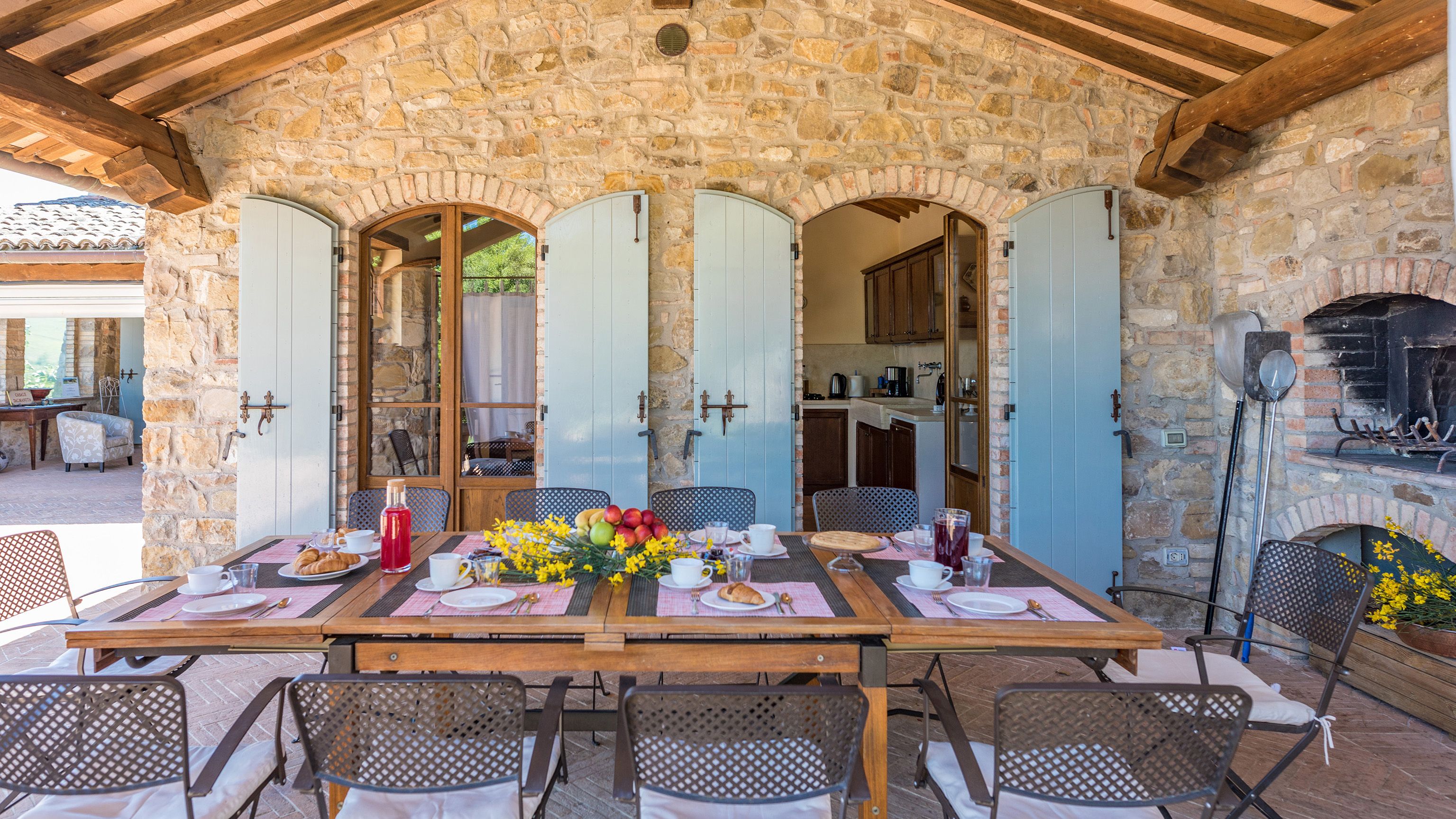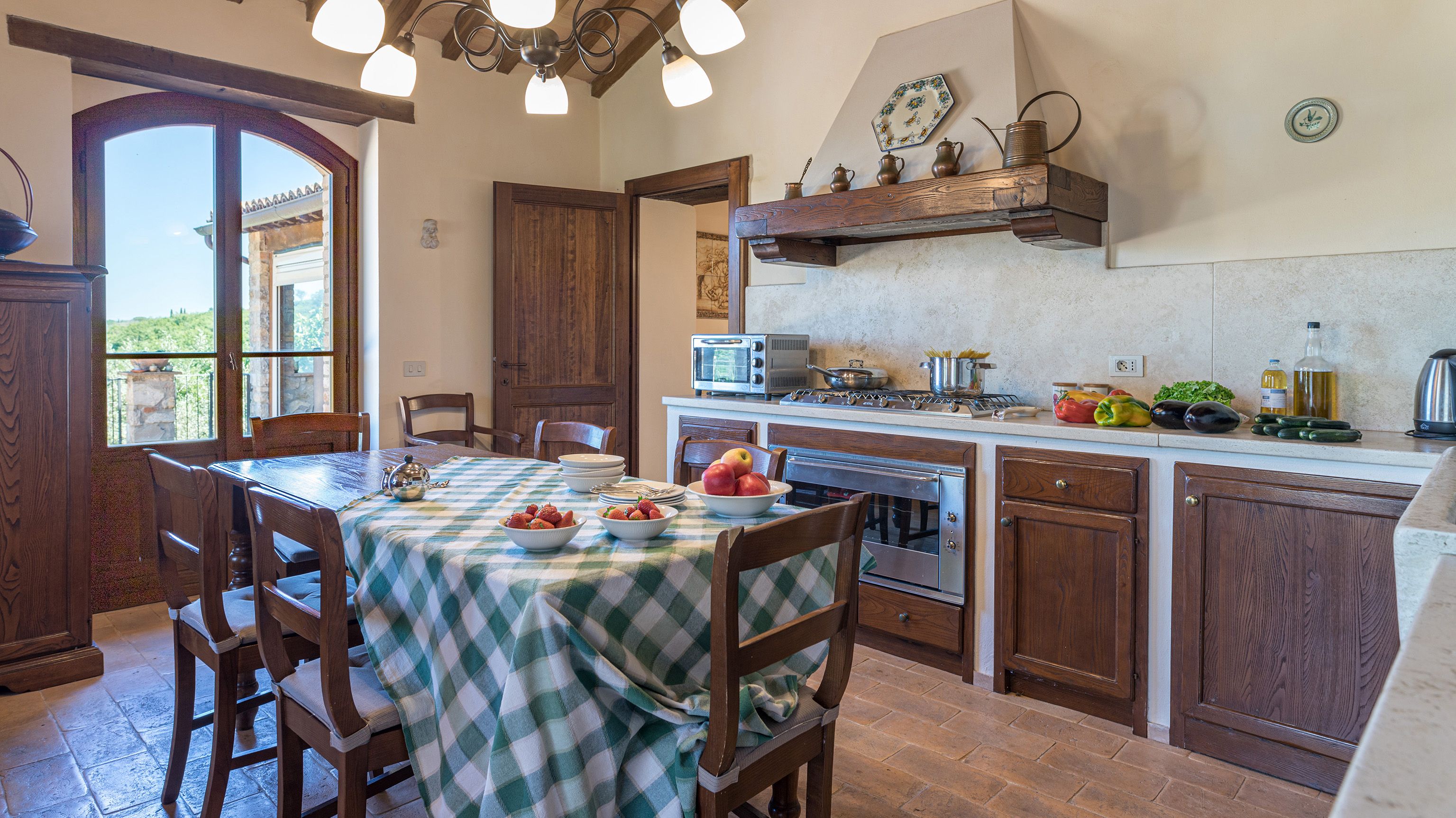 Sitting pretty in the rural hamlet of San Venanzo at the foothills of Mount Peglia, this Finca-style villa is a picture of rustic charm and countryside splendour. Turn off the beaten track through a surplus of olive trees, maples, oaks and cypresses, and escape from reality by tucking yourself away in the remote Umbrian hills – perfect for larger groups seeking serenity and calm. The home is steeped in tradition, comfort, and authenticity with wood-beamed ceilings, stone flooring and veranda shaded dining areas. Decorated with plenty of Italian passion in mind, the interior benefits from dark wooden furnishings, antique rugs, ceramic pots, and homely touches that create a cosy and warm ambience. Outside, meander through the rolling hills, float idly in the glistening infinity pool or dine alfresco on the patio with local produce and vino. If you can bear to leave your Italian abode, beautiful Perugia is a 20-minute drive away, with a host of vineyards and wineries even closer. To stay here is to be connected to the simpler pleasures of the Umbrian countryside, slowing down and adopting the pace of nature with your loved ones.