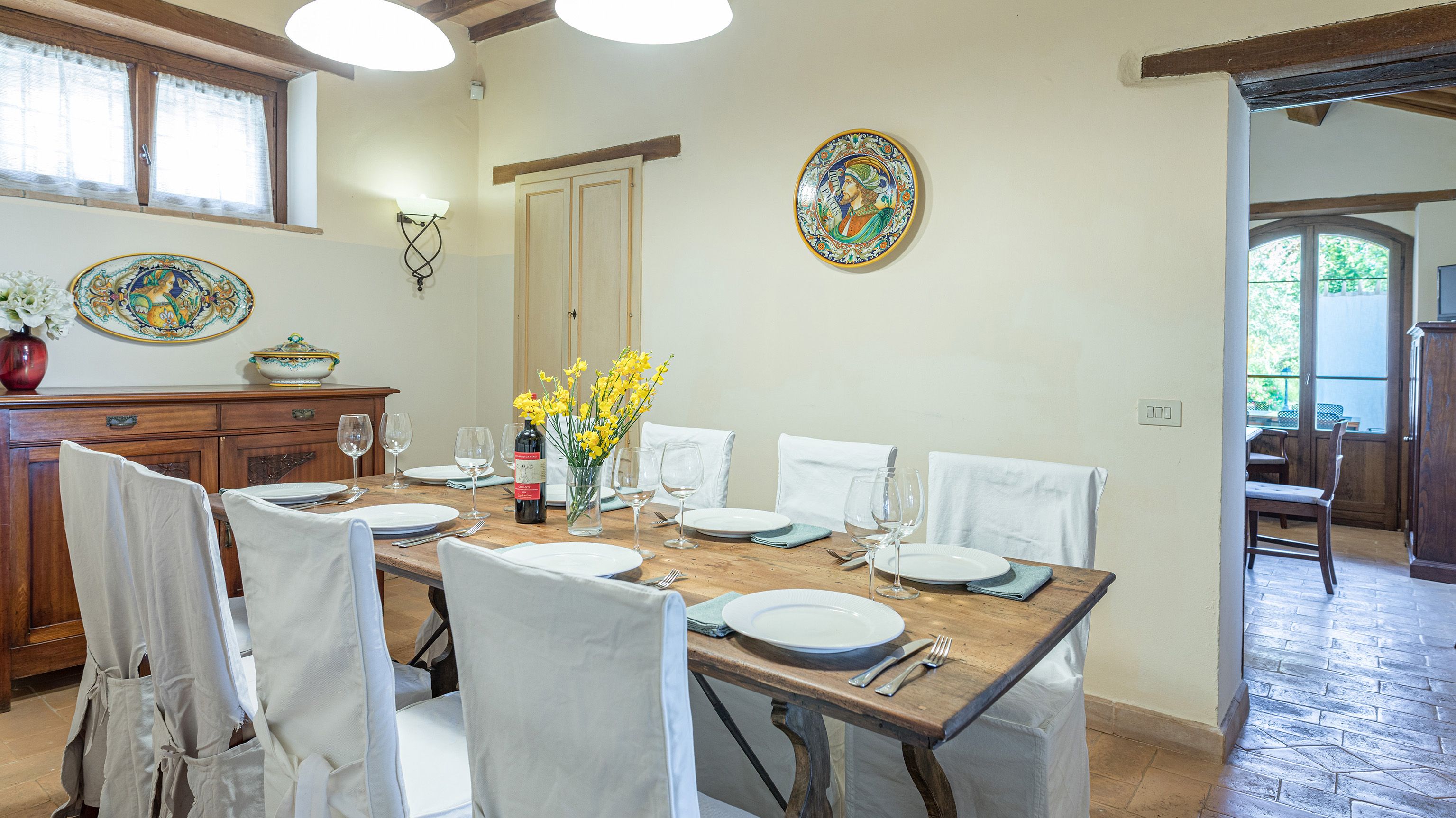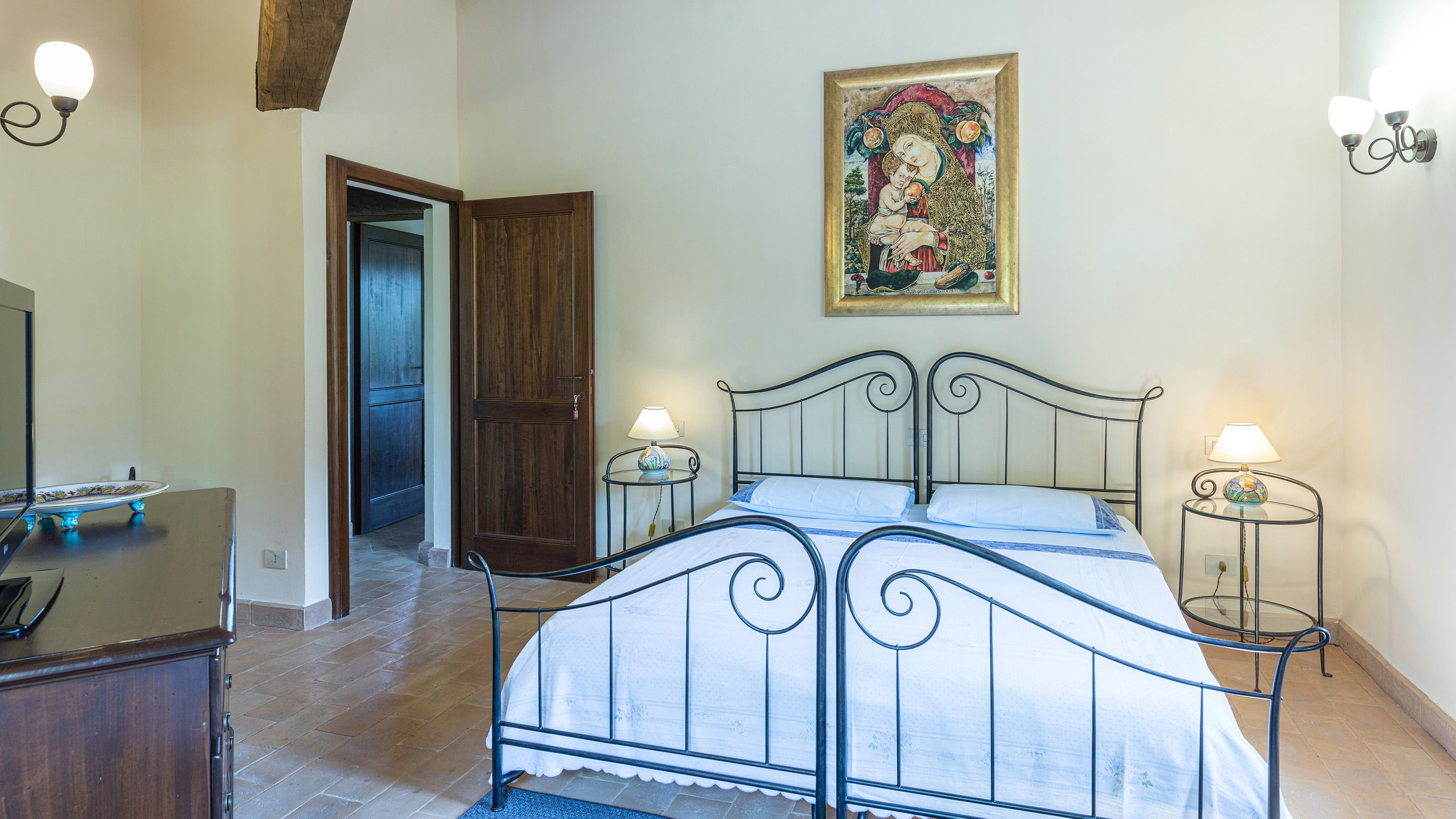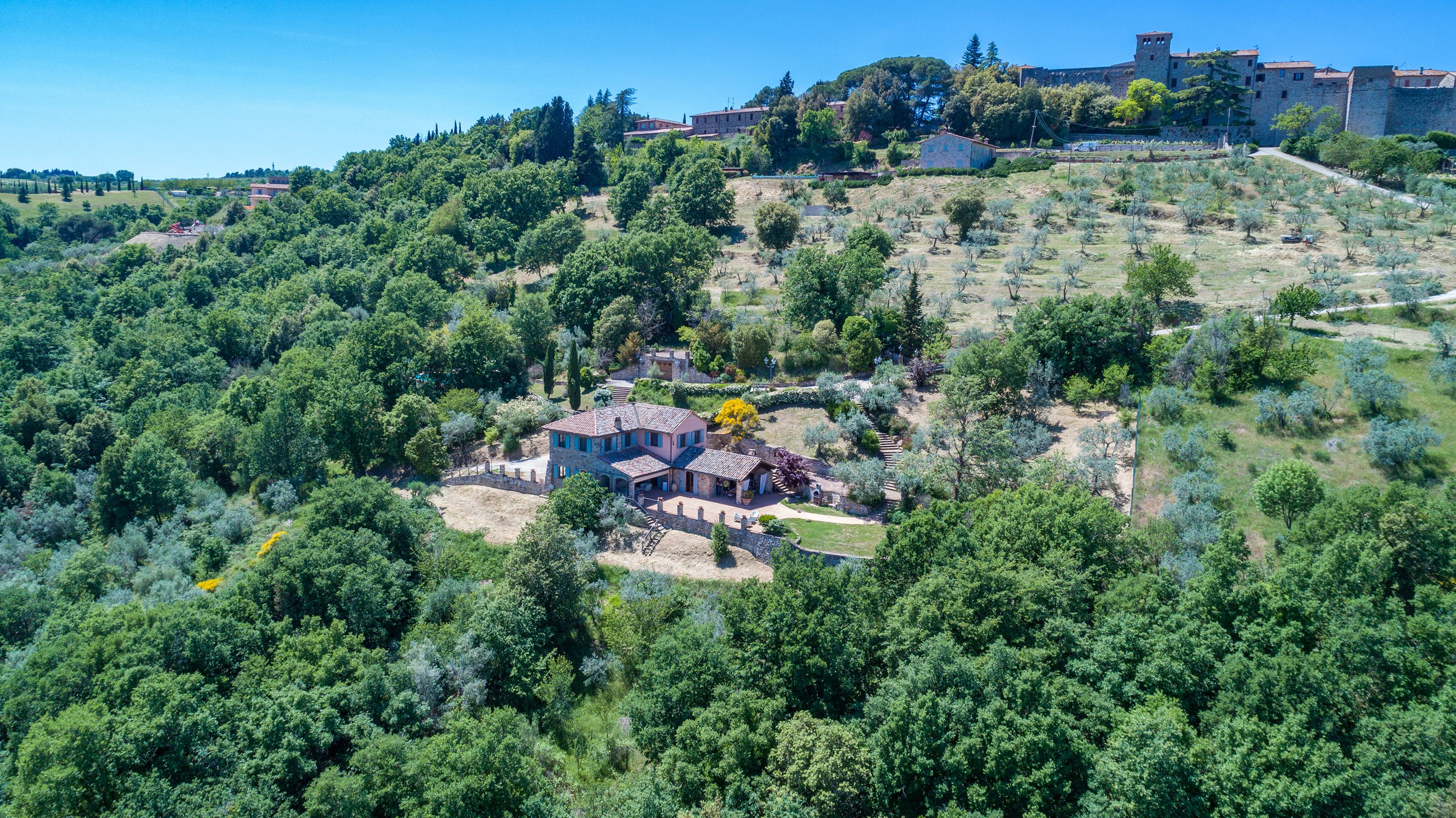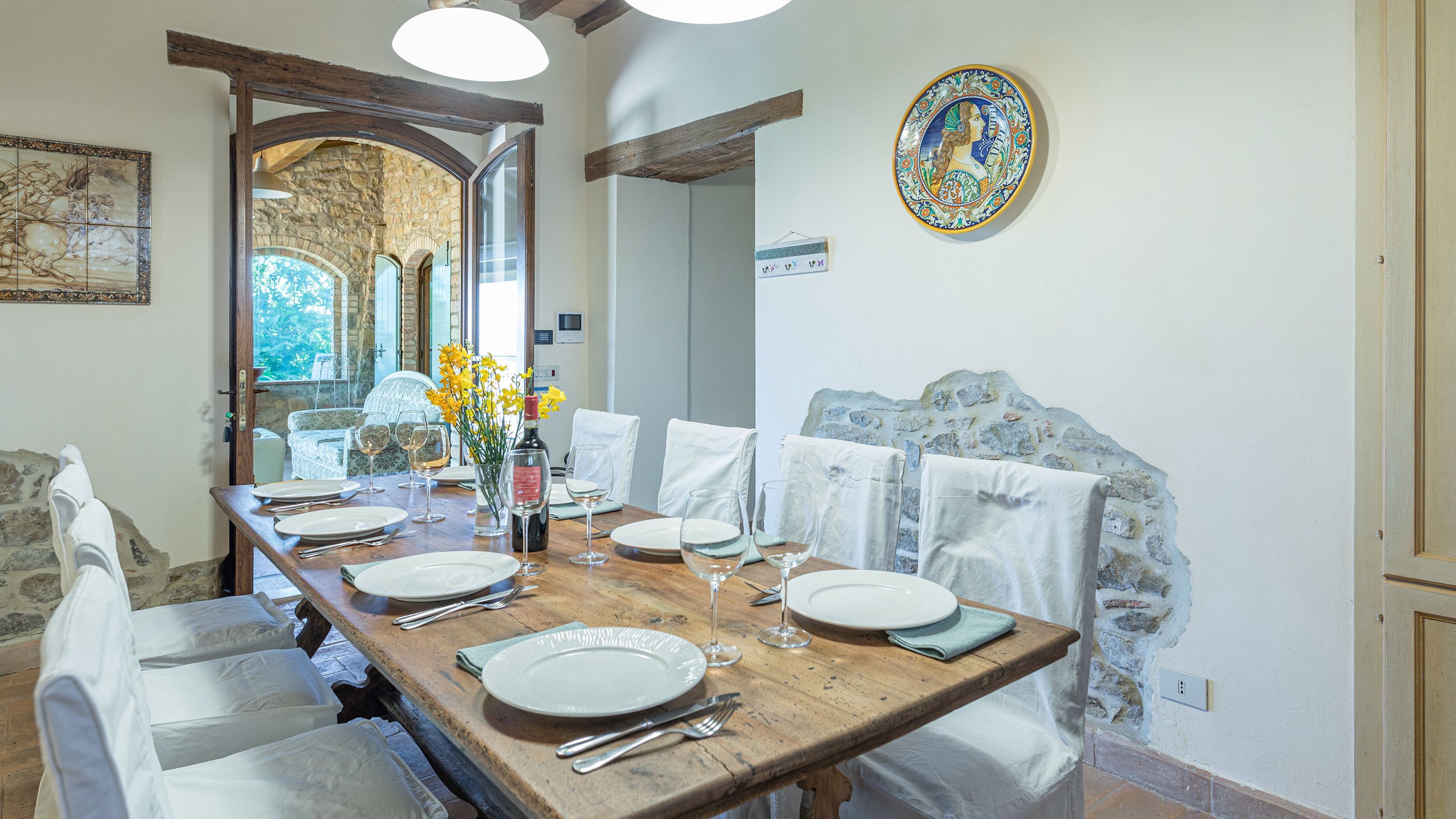 Sitting pretty in the rural hamlet of San Venanzo at the foothills of Mount Peglia, this Finca-style villa is a picture of rustic charm and countryside splendour. Turn off the beaten track through a surplus of olive trees, maples, oaks and cypresses, and escape from reality by tucking yourself away in the remote Umbrian hills – perfect for larger groups seeking serenity and calm. The home is steeped in tradition, comfort, and authenticity with wood-beamed ceilings, stone flooring and veranda shaded dining areas. Decorated with plenty of Italian passion in mind, the interior benefits from dark wooden furnishings, antique rugs, ceramic pots, and homely touches that create a cosy and warm ambience. Outside, meander through the rolling hills, float idly in the glistening infinity pool or dine alfresco on the patio with local produce and vino. If you can bear to leave your Italian abode, beautiful Perugia is a 20-minute drive away, with a host of vineyards and wineries even closer. To stay here is to be connected to the simpler pleasures of the Umbrian countryside, slowing down and adopting the pace of nature with your loved ones.