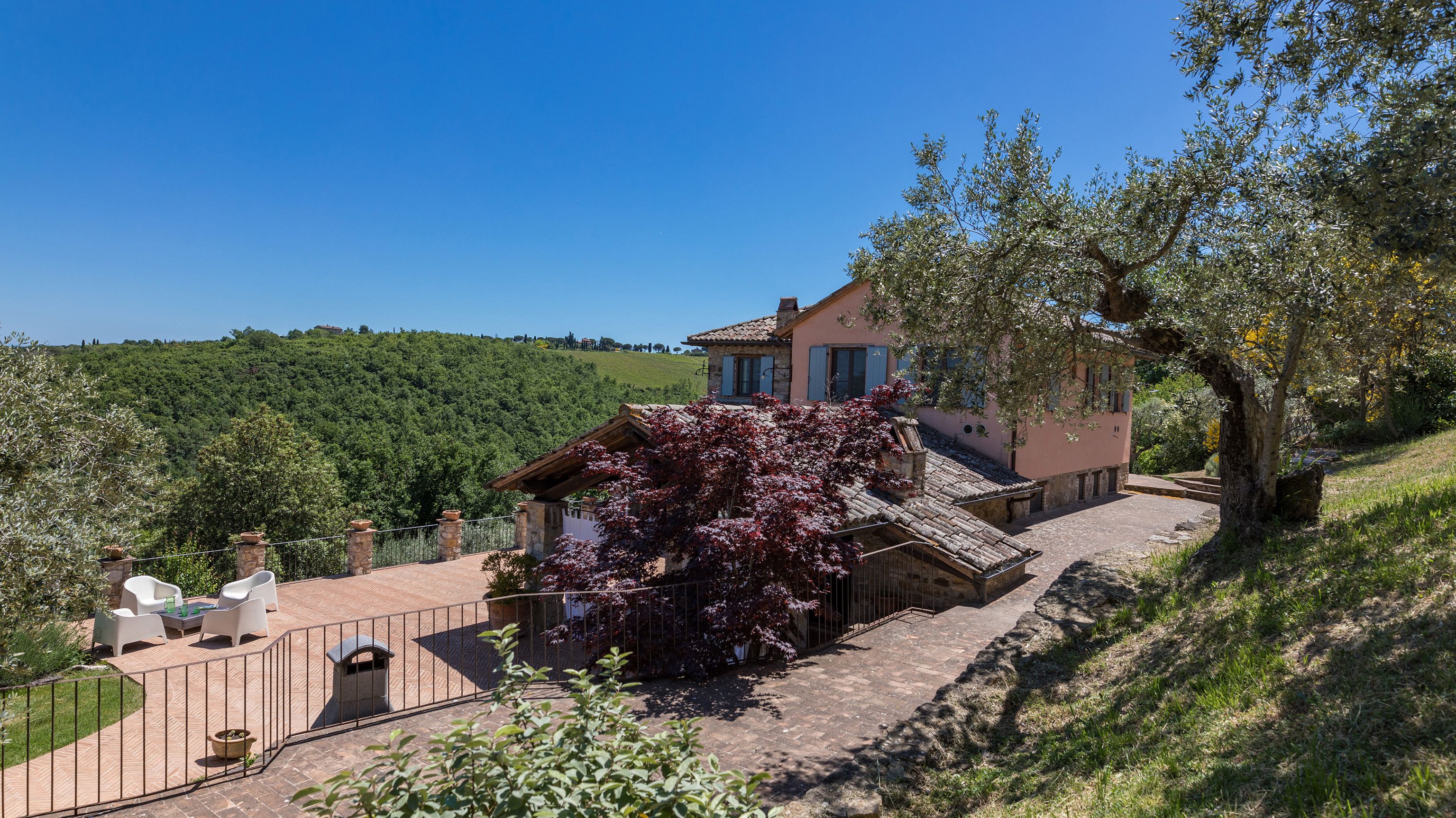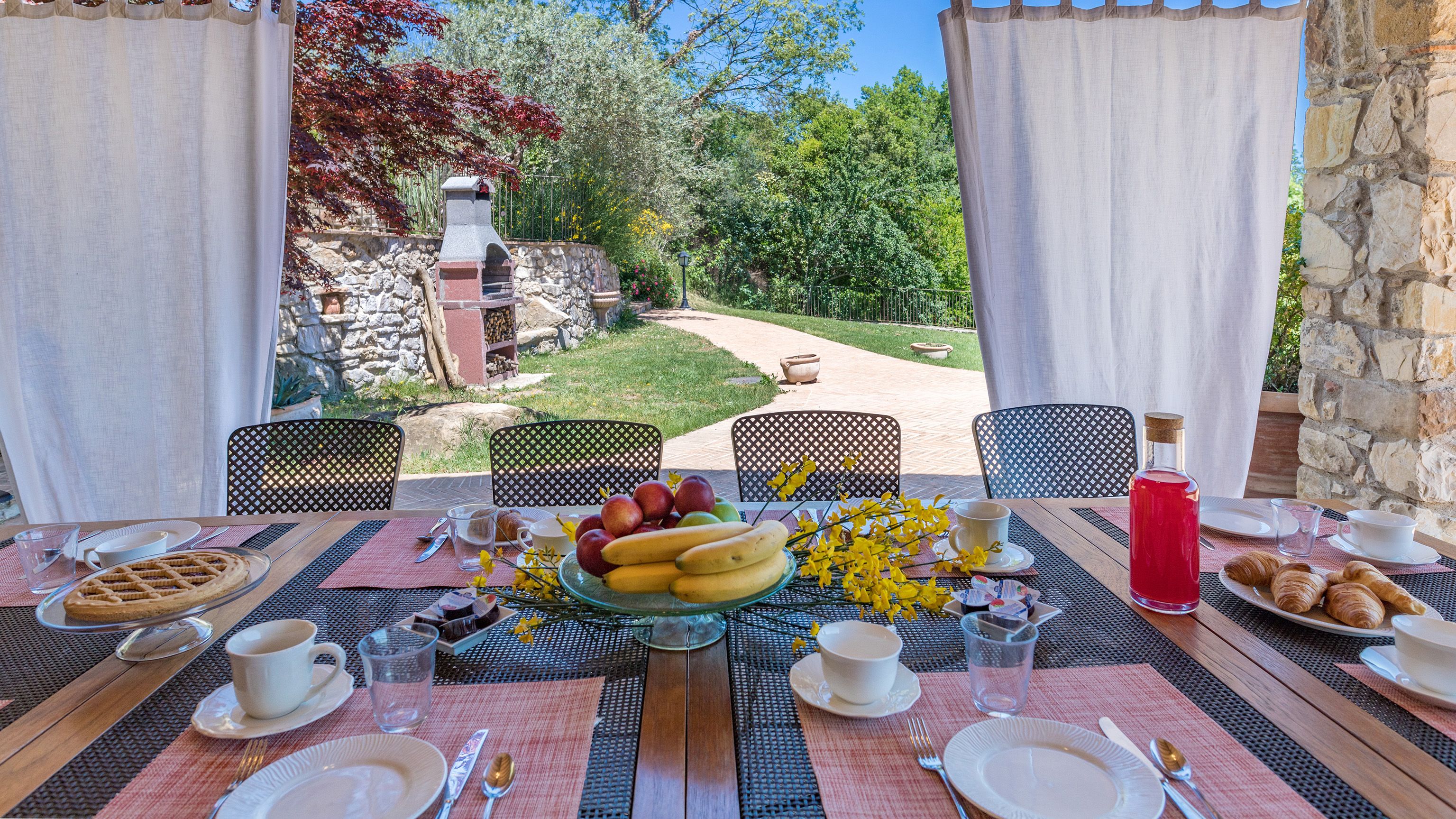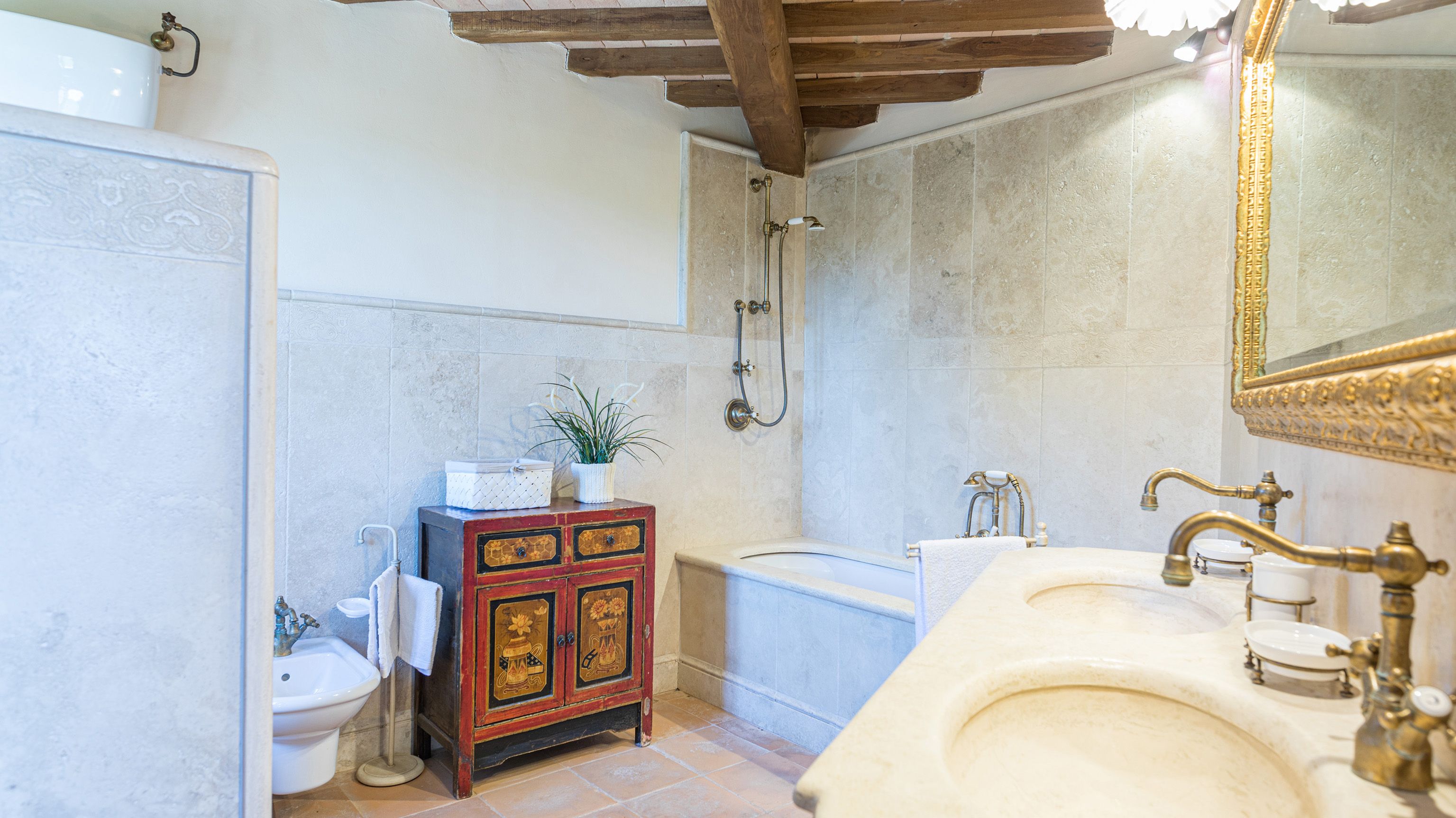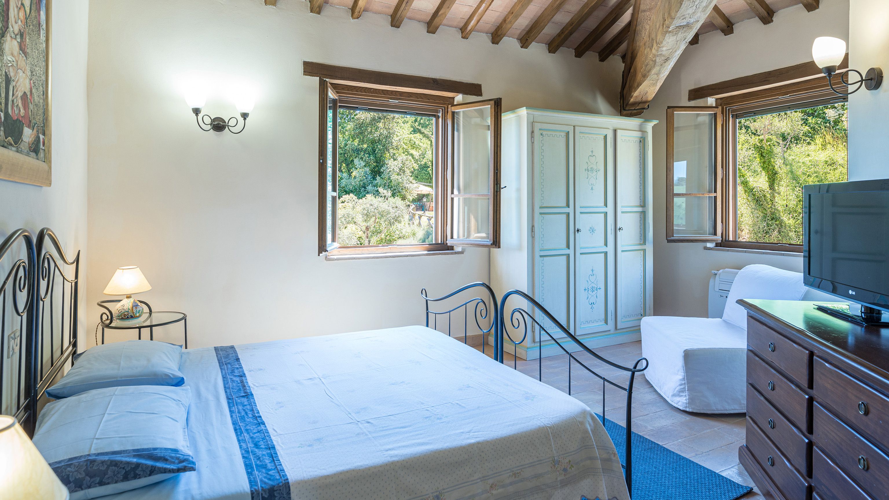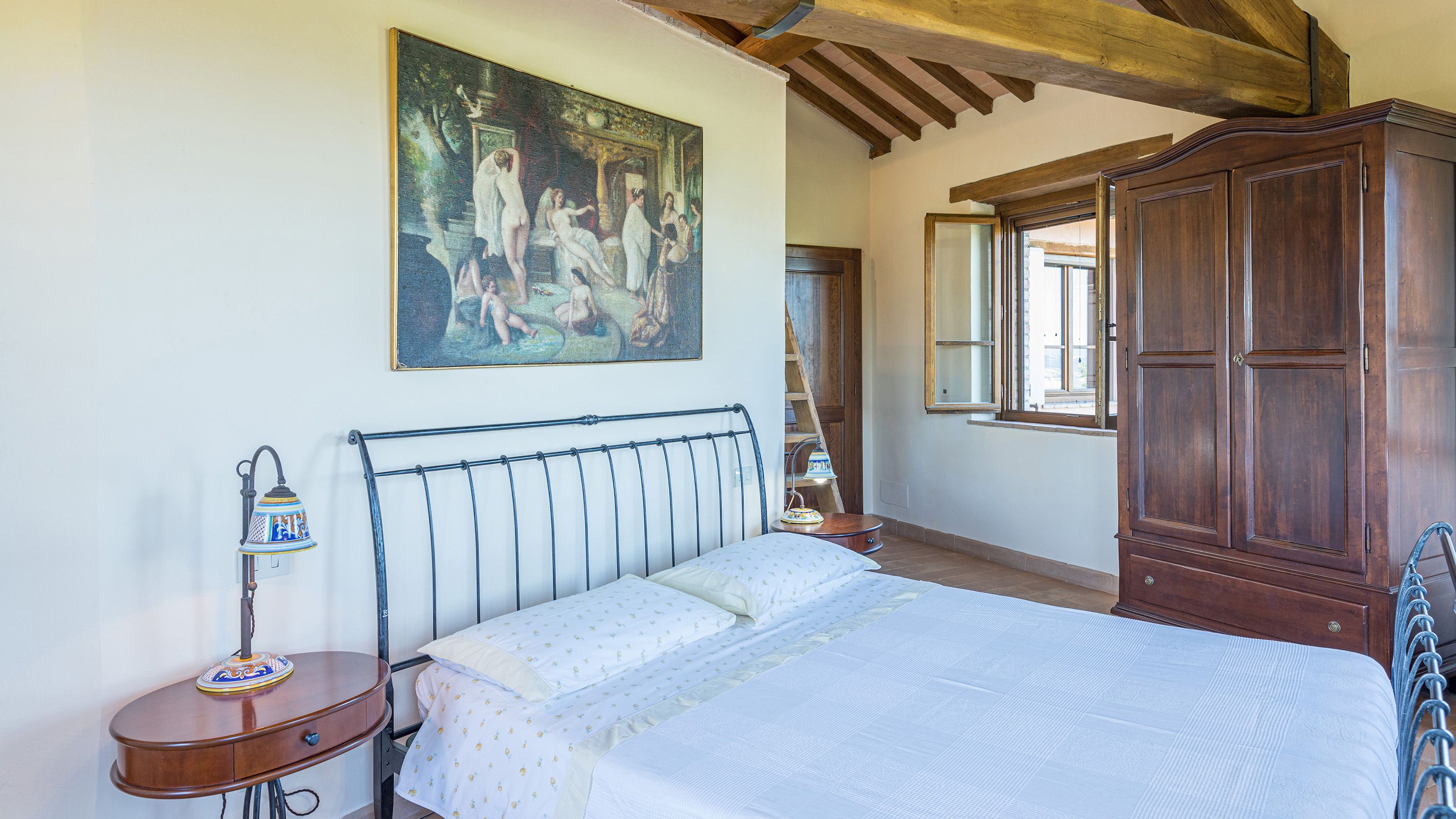 Sitting pretty in the rural hamlet of San Venanzo at the foothills of Mount Peglia, this Finca-style villa is a picture of rustic charm and countryside splendour. Turn off the beaten track through a surplus of olive trees, maples, oaks and cypresses, and escape from reality by tucking yourself away in the remote Umbrian hills – perfect for larger groups seeking serenity and calm. The home is steeped in tradition, comfort, and authenticity with wood-beamed ceilings, stone flooring and veranda shaded dining areas. Decorated with plenty of Italian passion in mind, the interior benefits from dark wooden furnishings, antique rugs, ceramic pots, and homely touches that create a cosy and warm ambience. Outside, meander through the rolling hills, float idly in the glistening infinity pool or dine alfresco on the patio with local produce and vino. If you can bear to leave your Italian abode, beautiful Perugia is a 20-minute drive away, with a host of vineyards and wineries even closer. To stay here is to be connected to the simpler pleasures of the Umbrian countryside, slowing down and adopting the pace of nature with your loved ones.