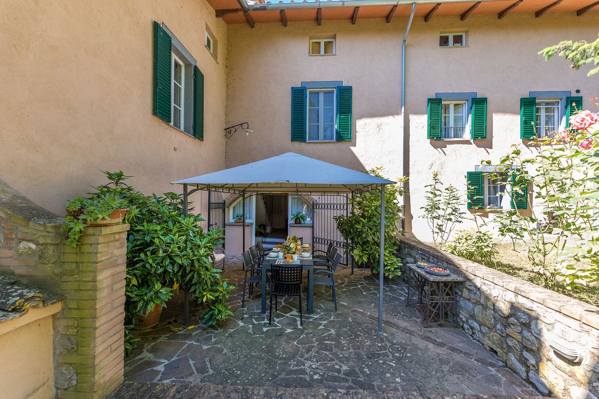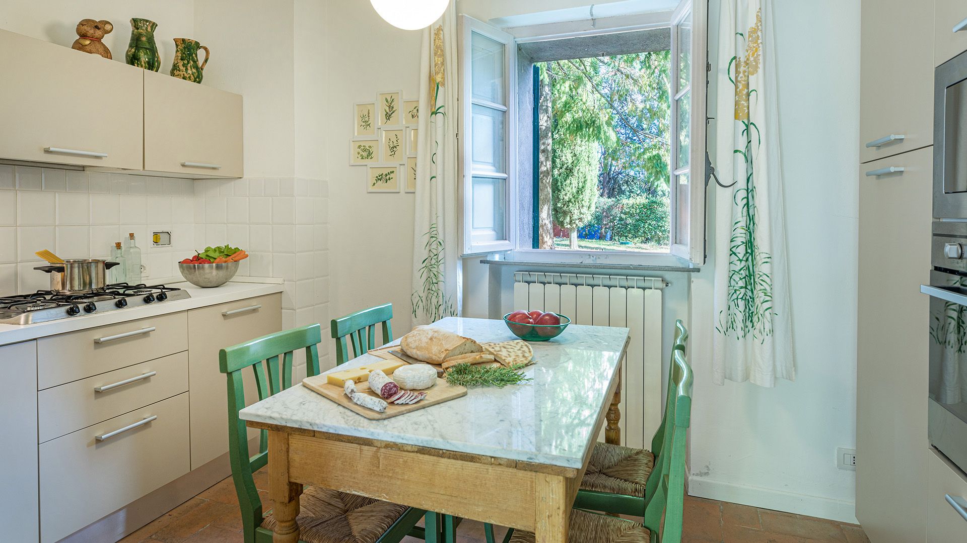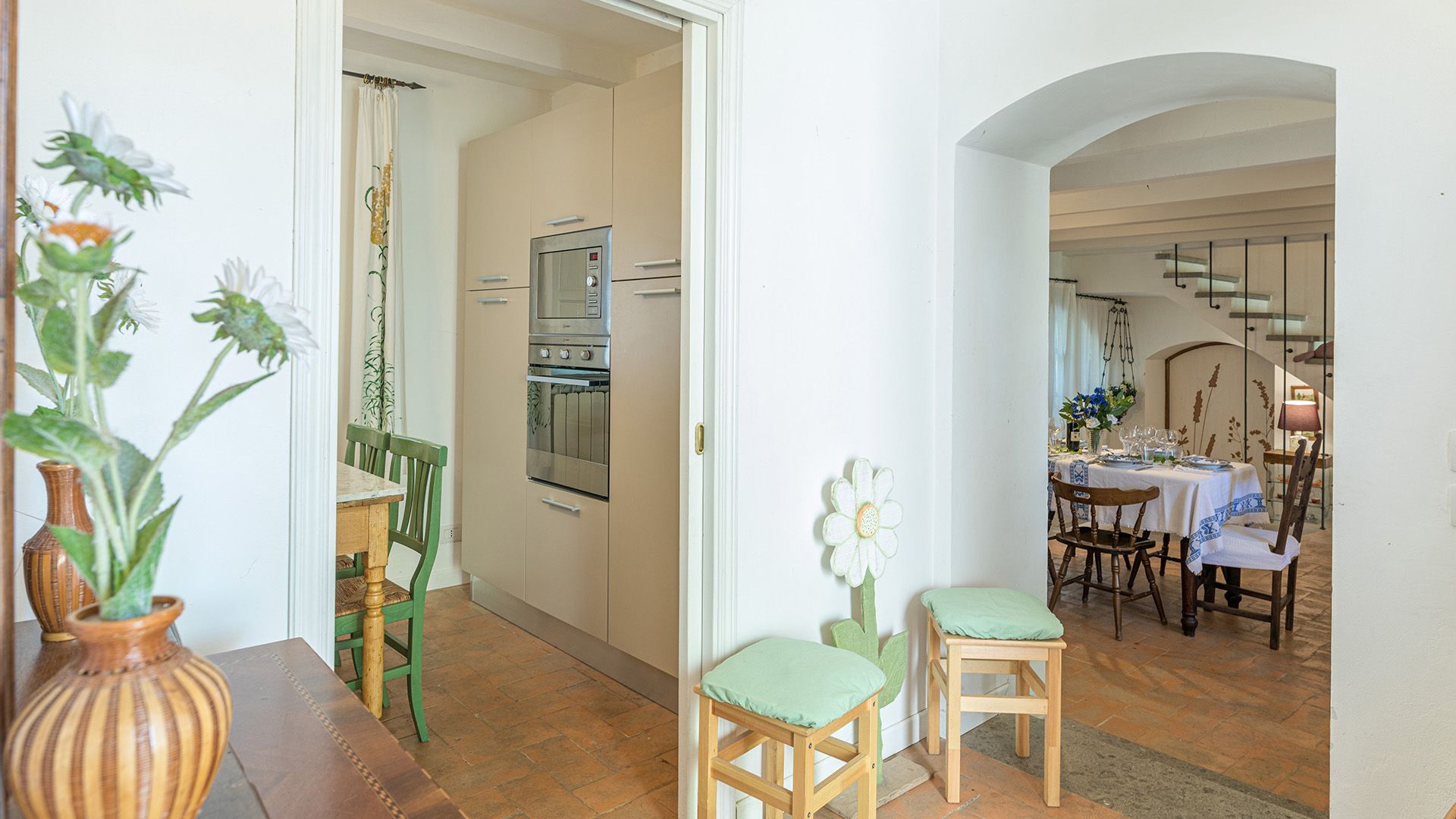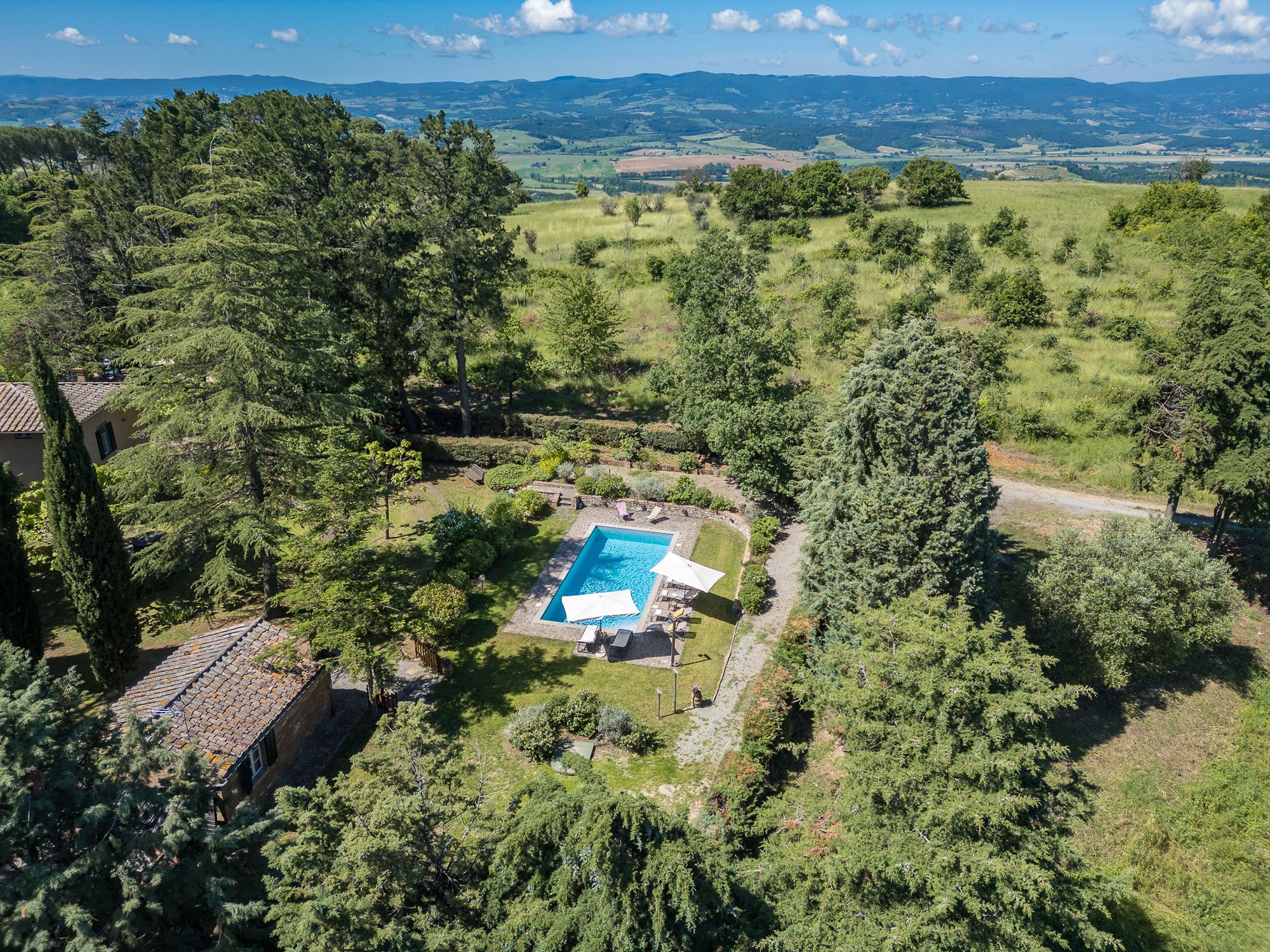 Set amidst Umbria’s rolling hills and verdant woods, this home is a true escape from the hustle and bustle of city life. Less than a five-minute drive from the medieval village of Monteleone d'Orvieto, it’s a relaxing retreat full of sensory romance. Breathe in the sweet-smelling flowers that frame the home’s grounds, look out onto the forested paths beyond the front gates and feel right at home within its pretty pink walls. Inside, contemporary and vintage furnishings combine with an elaborate hearth and cowhide rug in the first-floor living room, while downstairs, rustic charm abounds in the bright, white dining room. Exit through the French doors to reach the lush garden, where a jade green swimming pool invites swimming and sun-soaking aplenty. In the evening, the pool takes on a magical lantern-lit glow, perfect for sundown dips. Steal yourself away for an intimate drink under the stone portico, then sit down for an al fresco meal, courtesy of the barbecue. When it’s time for bed, canopied beds and a private suite under the home’s eaves will treat you to a dreamy night's sleep.