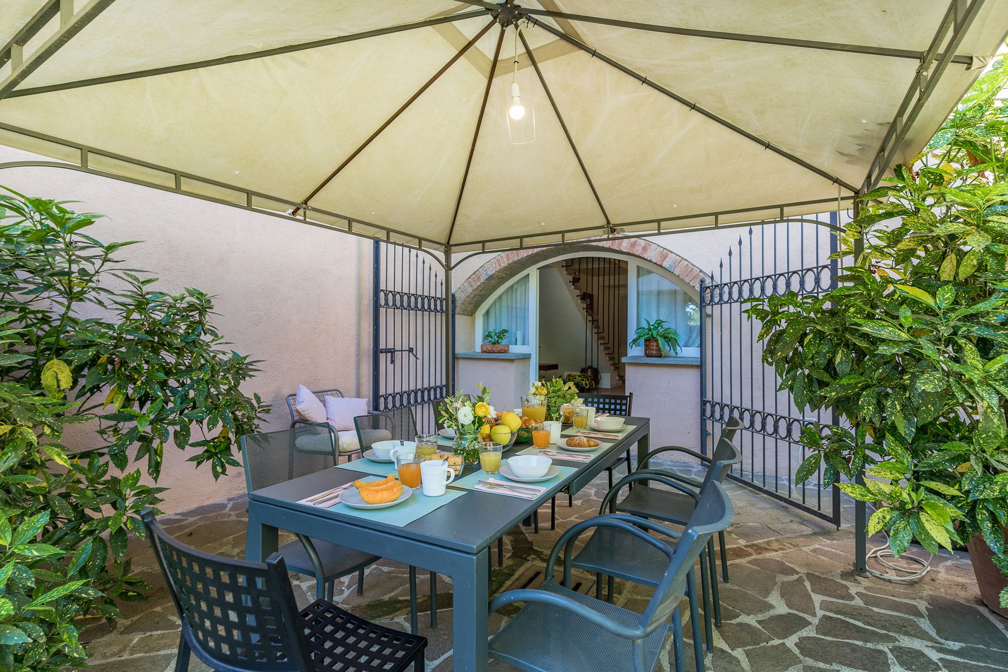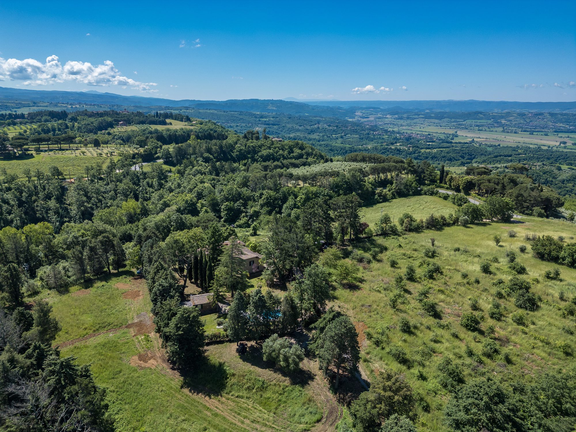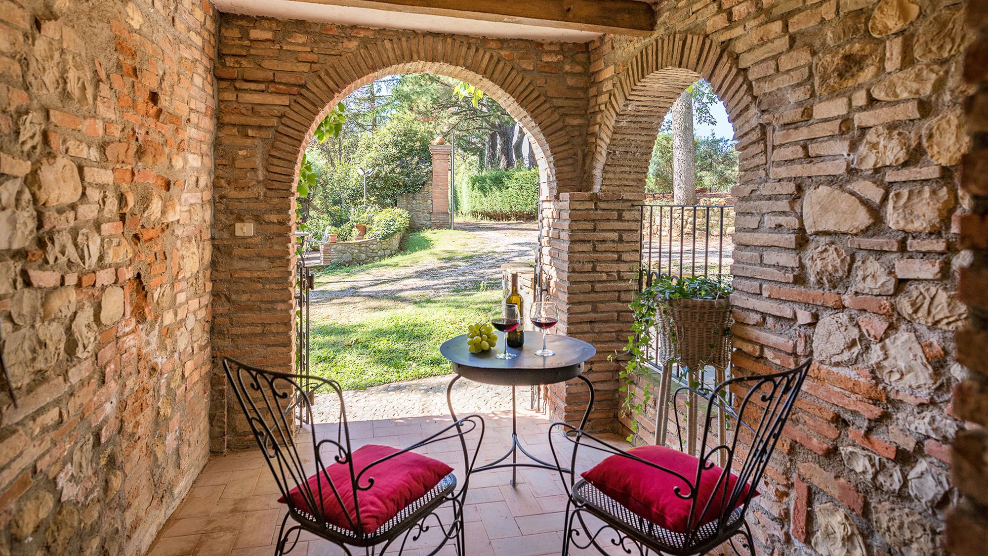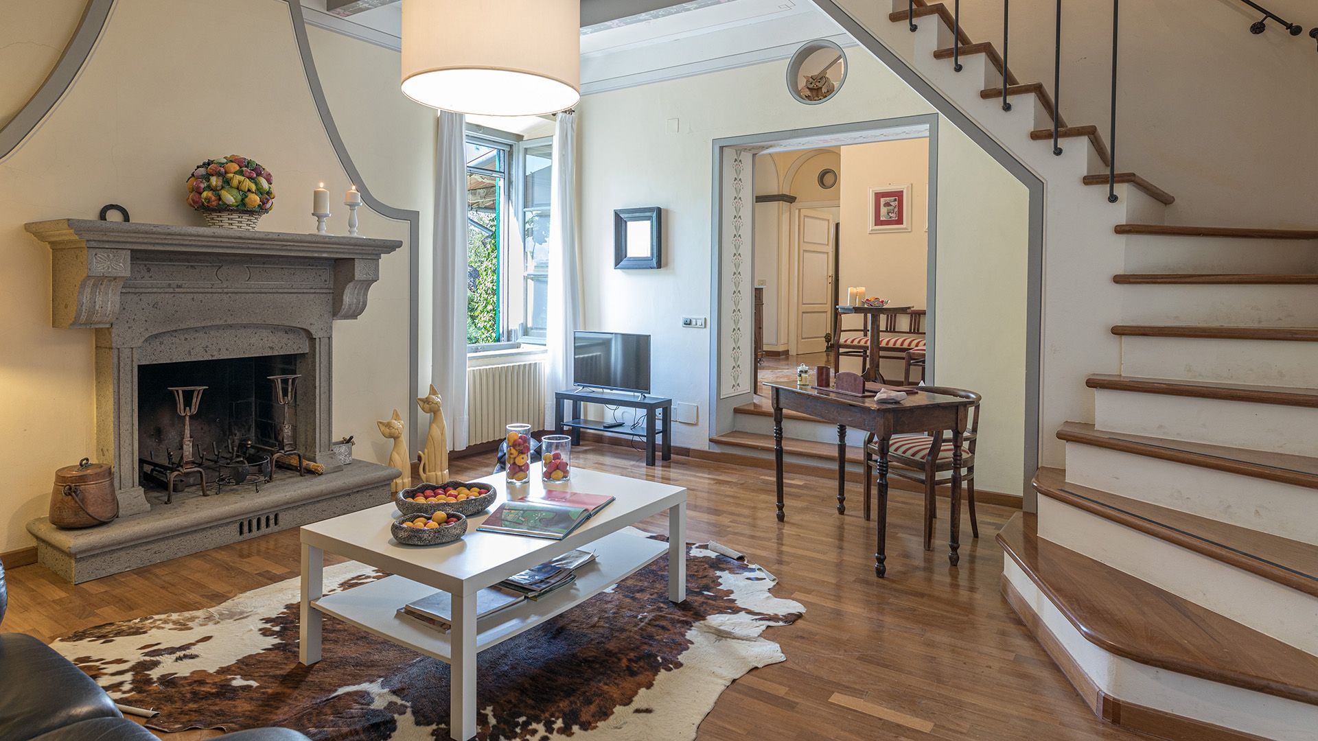 Set amidst Umbria’s rolling hills and verdant woods, this home is a true escape from the hustle and bustle of city life. Less than a five-minute drive from the medieval village of Monteleone d'Orvieto, it’s a relaxing retreat full of sensory romance. Breathe in the sweet-smelling flowers that frame the home’s grounds, look out onto the forested paths beyond the front gates and feel right at home within its pretty pink walls. Inside, contemporary and vintage furnishings combine with an elaborate hearth and cowhide rug in the first-floor living room, while downstairs, rustic charm abounds in the bright, white dining room. Exit through the French doors to reach the lush garden, where a jade green swimming pool invites swimming and sun-soaking aplenty. In the evening, the pool takes on a magical lantern-lit glow, perfect for sundown dips. Steal yourself away for an intimate drink under the stone portico, then sit down for an al fresco meal, courtesy of the barbecue. When it’s time for bed, canopied beds and a private suite under the home’s eaves will treat you to a dreamy night's sleep.