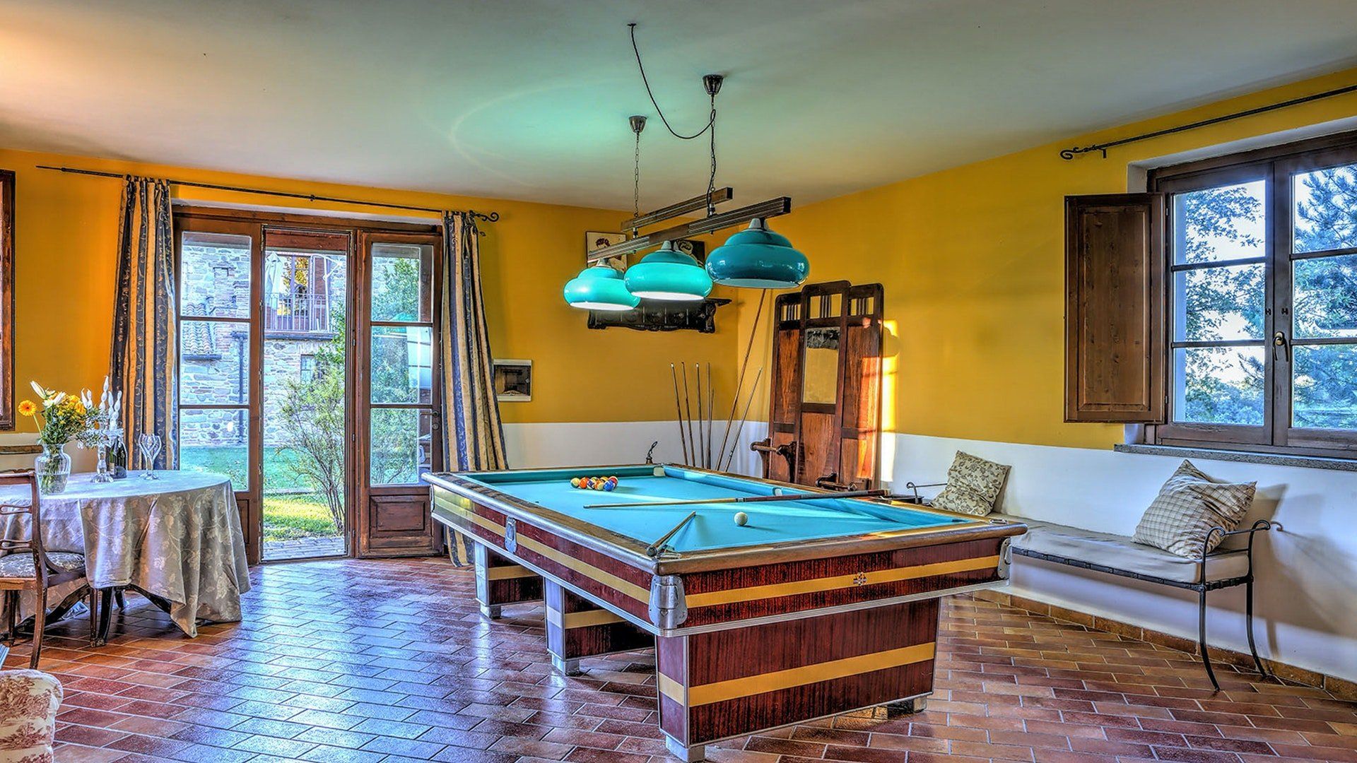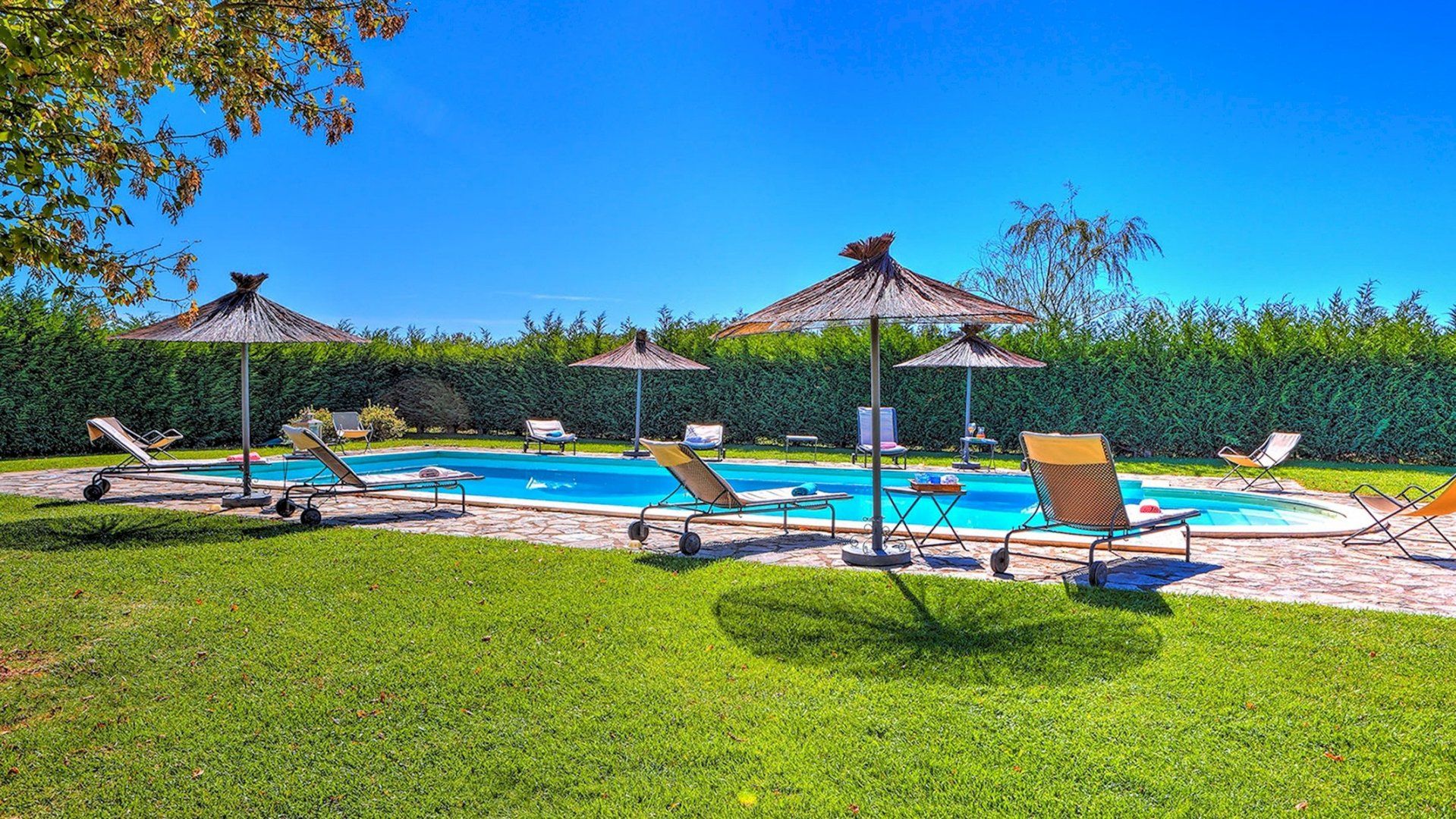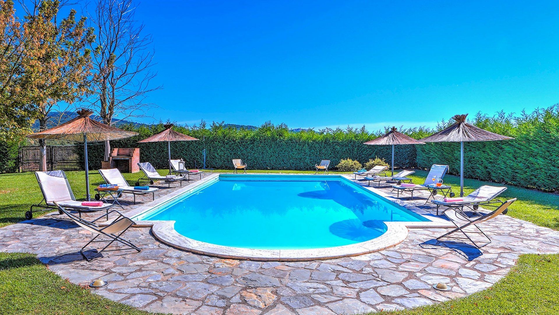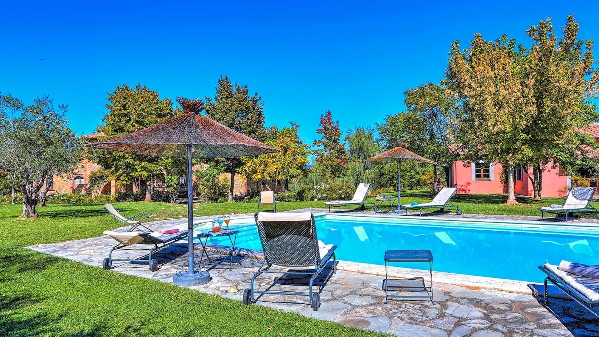 We could get used to this – a rustic Italian villa that oozes charm, surrounded by lush Umbrian countryside. A short drive takes you to the shops and cafes of medieval Città della Pieve, and charming destinations like Trasimeno Lake and Perugia are within easy reach too. This is a seriously good spot. In the home itself, Persian rugs sit adorn the polished tiled floors, lending a feeling of laid-back luxury, while a grand fireplace takes centre stage in the open living area. The kitchen is dominated by stainless steel and provides everything you need to realise your culinary dreams. Then, share your meals with nine of your favourite people at the garden table outside, with views of the countryside as your backdrop. Handily, there is also a separate, self-contained annexe for those who require some extra privacy. It comes with its own kitchen, en-suite and billiard table. Outside, the large, inviting pool is where we suspect you’ll spend most of your time. The well kept garden surrounding the villa is an extremely relaxing place to unwind – get the outdoor pizza oven on and set the world to rights until the sun goes down. Then do it all again tomorrow.