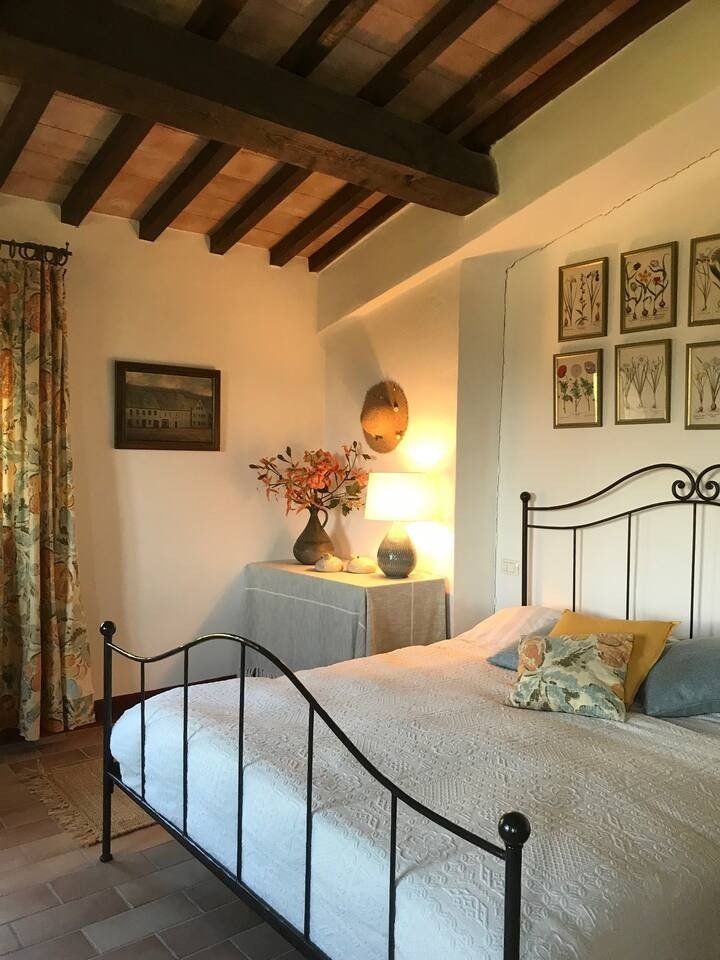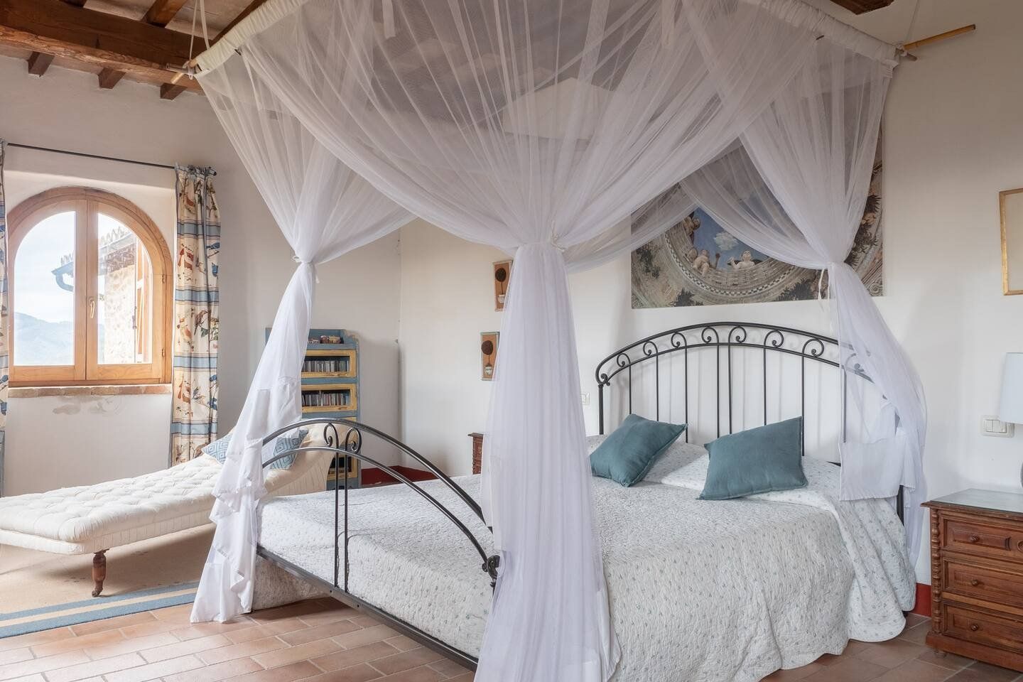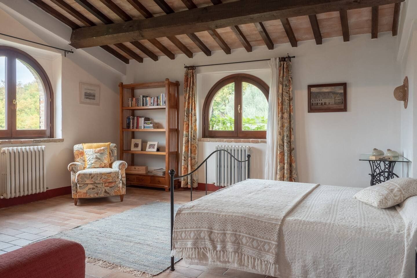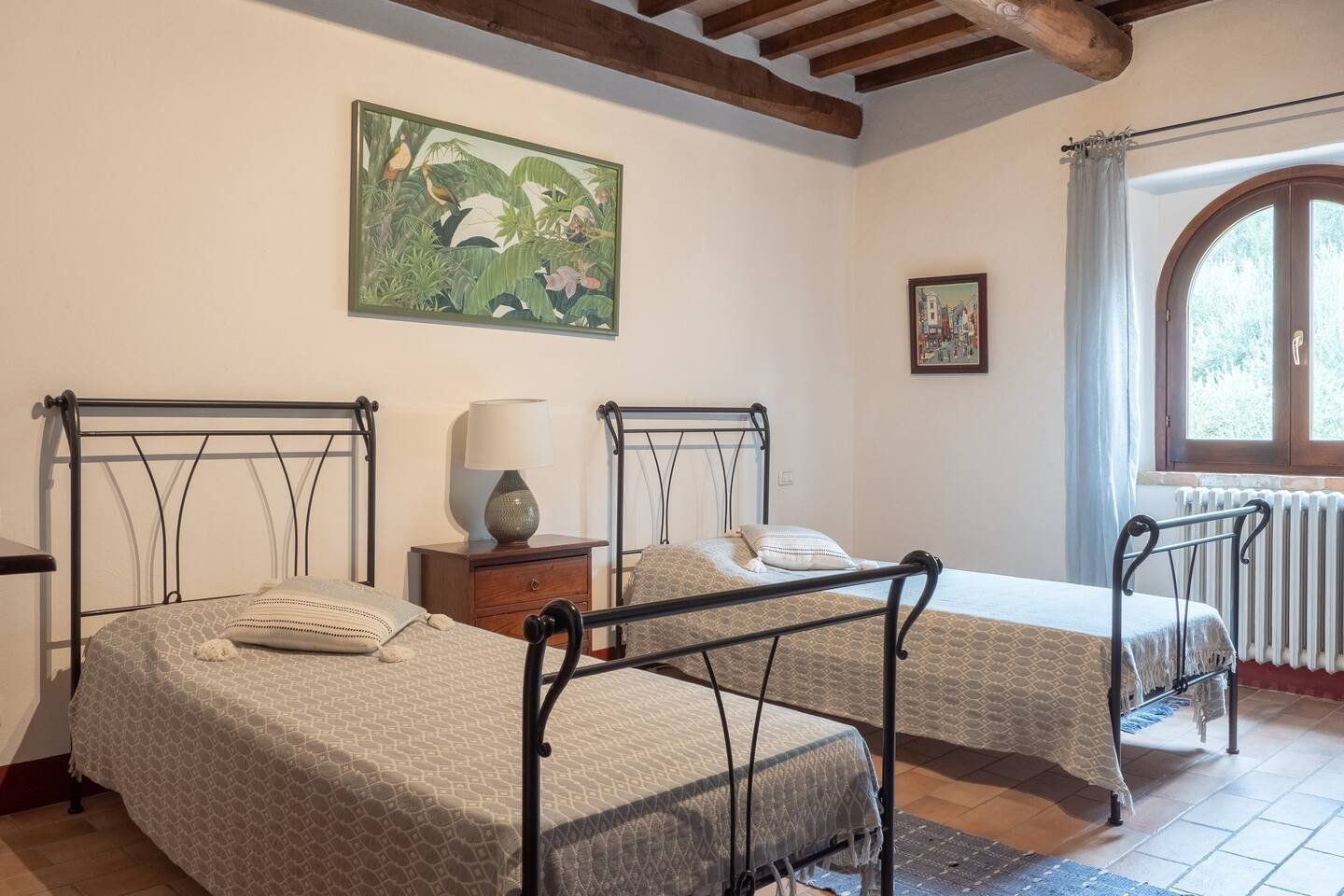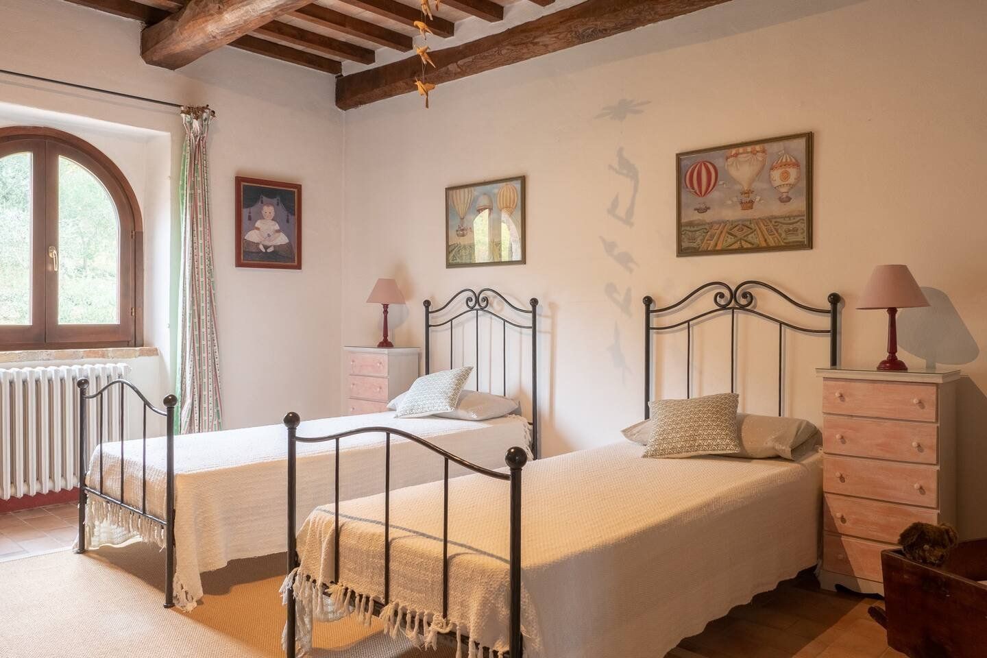It’s a world of traditional Umbrian farmhouse inside, with wooden ceilings and original fireplaces in sitting rooms (there are several to choose from). Vintage travelling trunks, wrought-iron bedsteads and terracotta-tiled floors all add to the old-world feel of this sprawling villa.