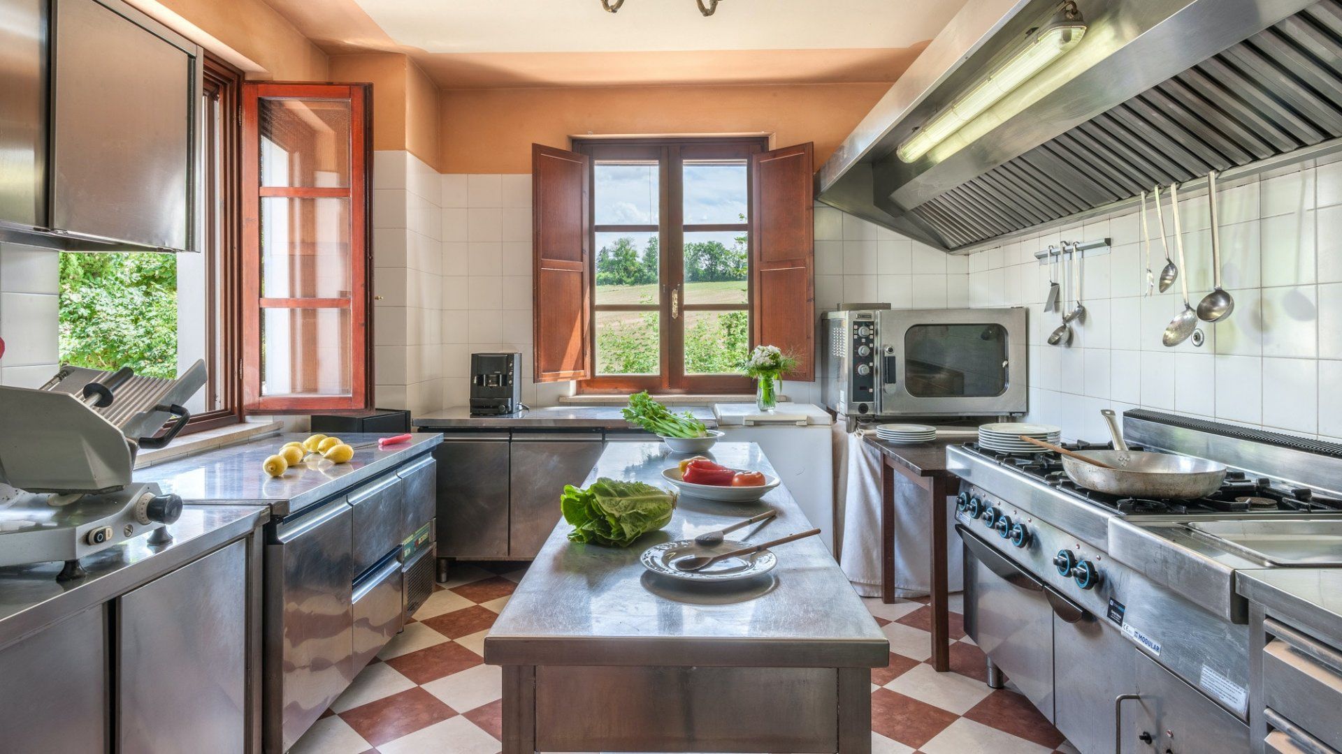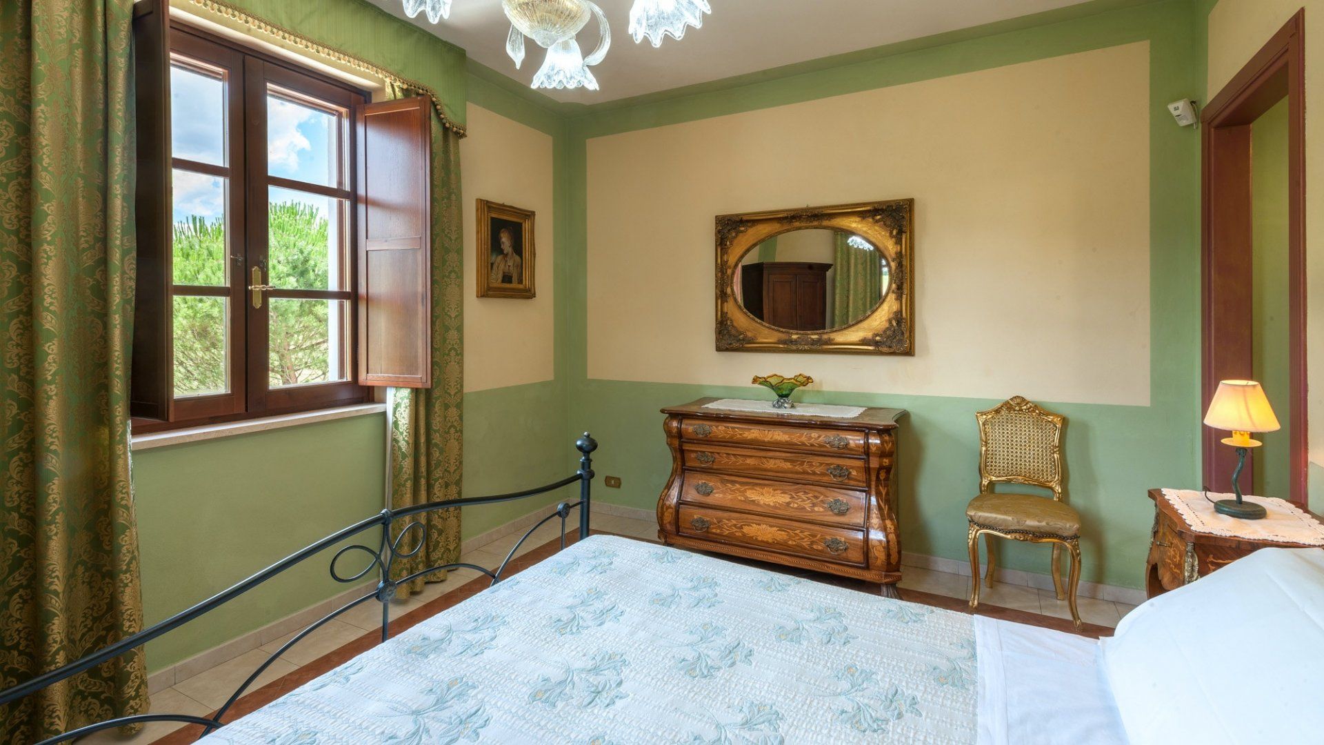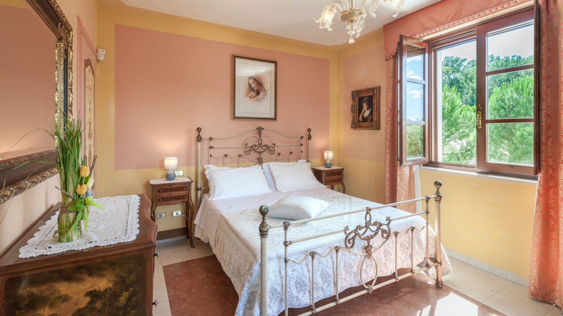 As soon as you drive up to the front, it's clear this imposing home is something very special indeed. Its arching windows, tower room and checkerboard terrace make this the quintessential Umbrian villa. And inside doesn't disappoint either, with frescoes, tiled floors and antique furnishings. There's a fabulous, professional-grade kitchen for whipping up meals both casual and formal, with the latter served in the grand dining hall with a series of tall French doors that open to the terrace.