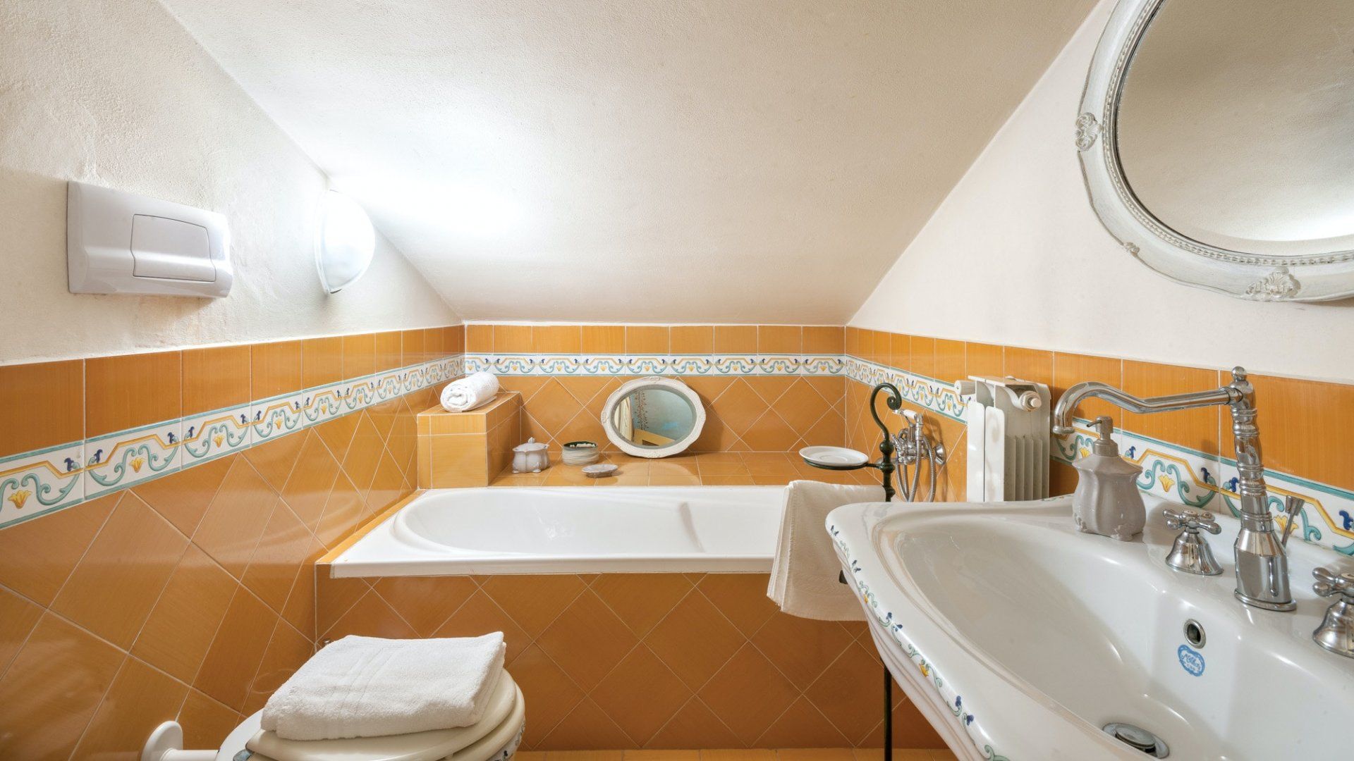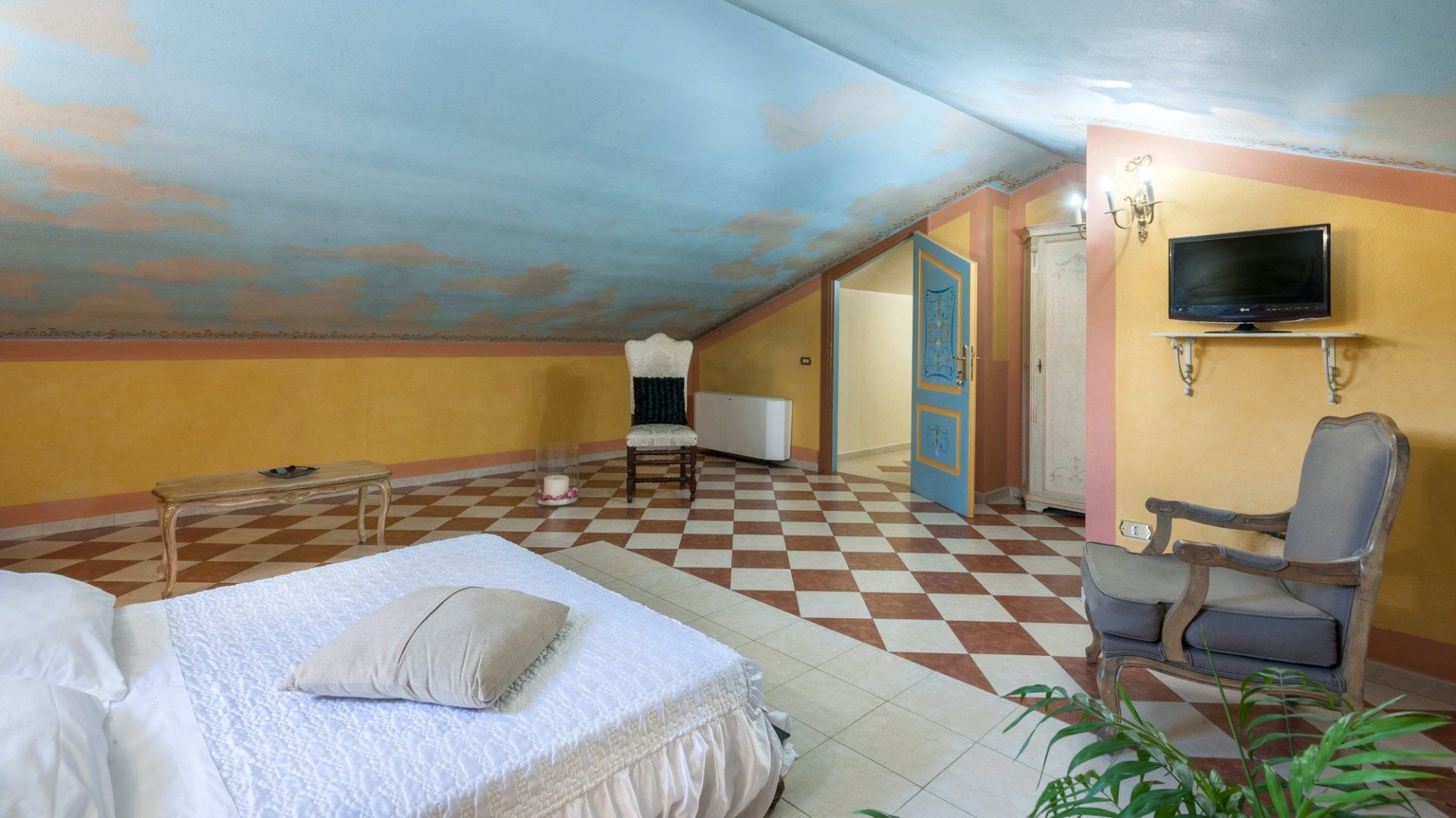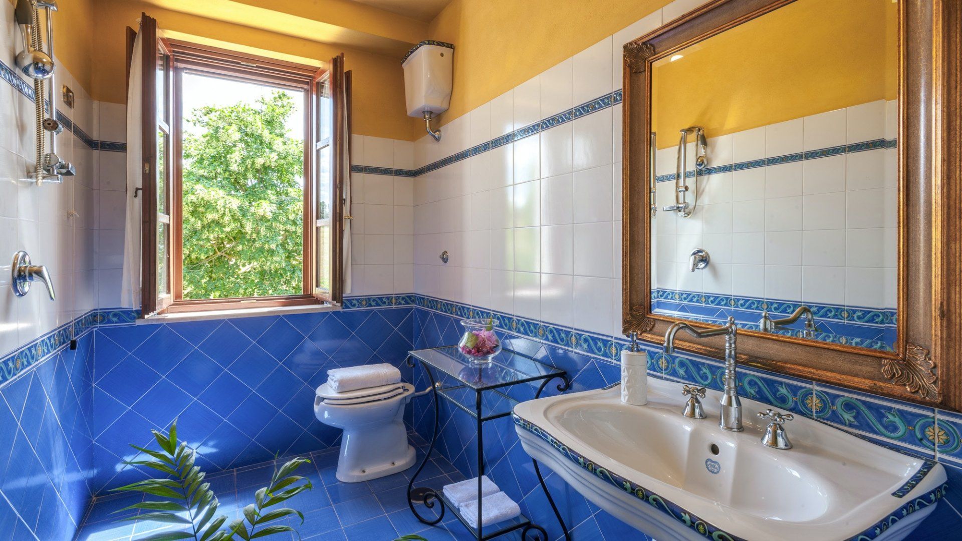 As soon as you drive up to the front, it's clear this imposing home is something very special indeed. Its arching windows, tower room and checkerboard terrace make this the quintessential Umbrian villa. And inside doesn't disappoint either, with frescoes, tiled floors and antique furnishings. There's a fabulous, professional-grade kitchen for whipping up meals both casual and formal, with the latter served in the grand dining hall with a series of tall French doors that open to the terrace.