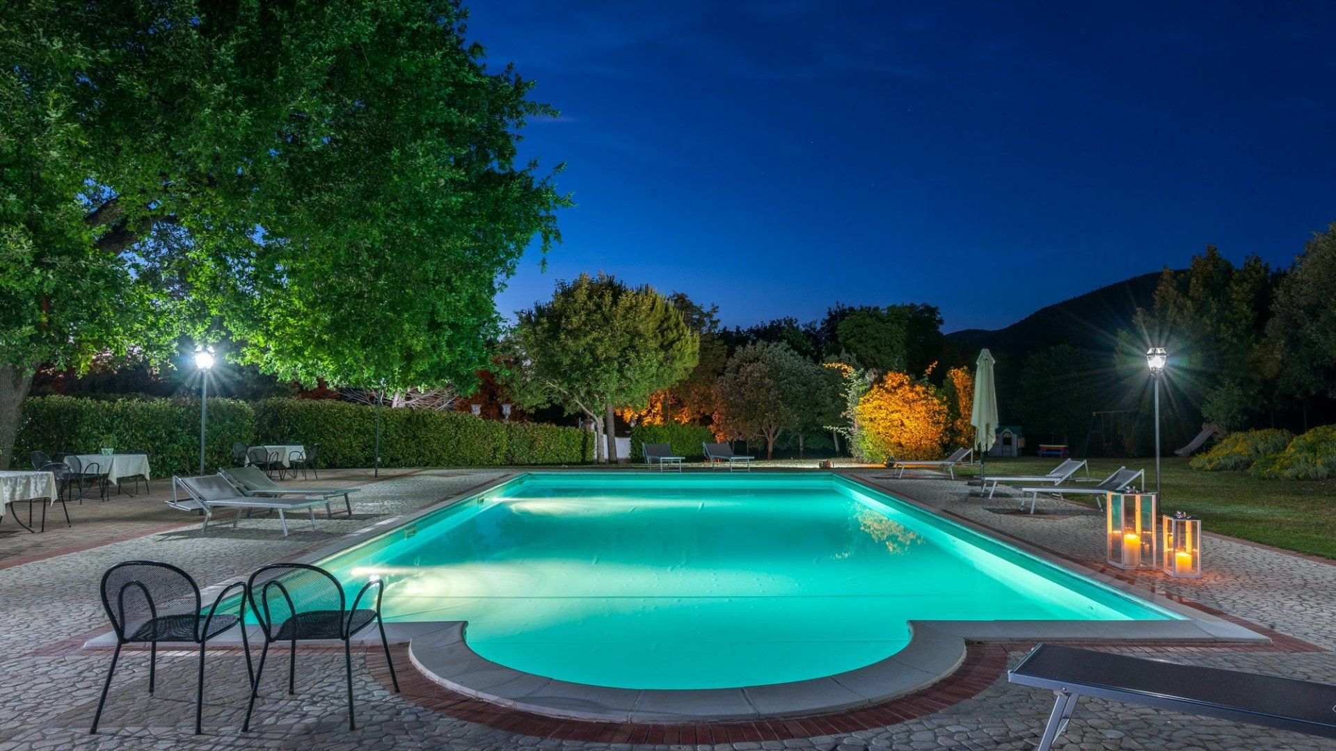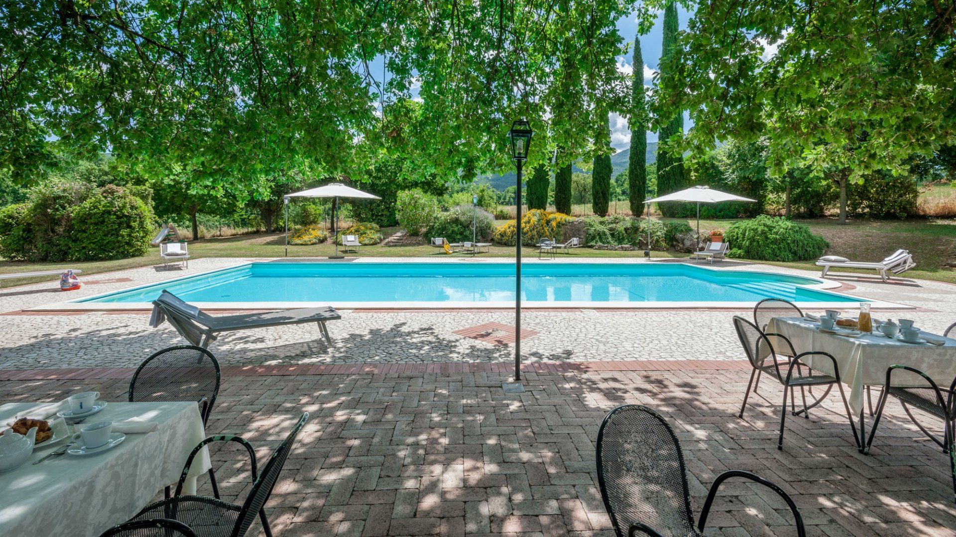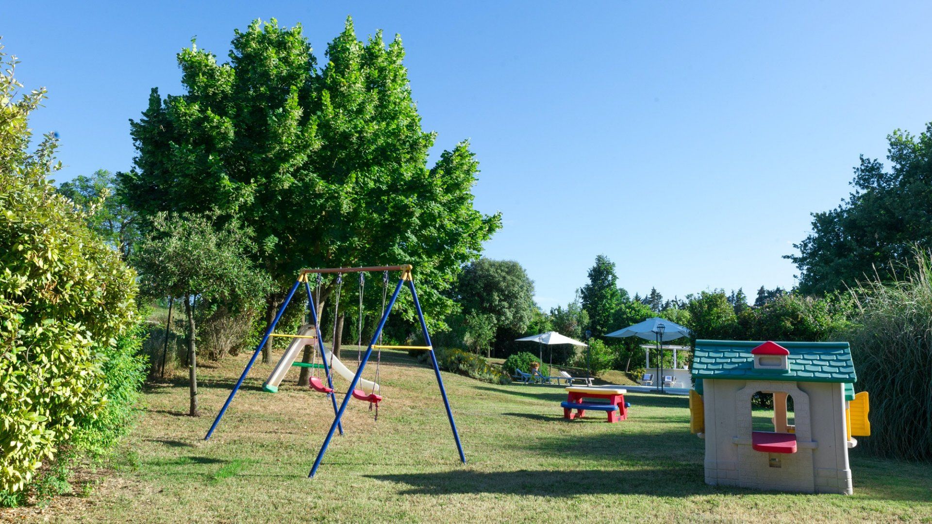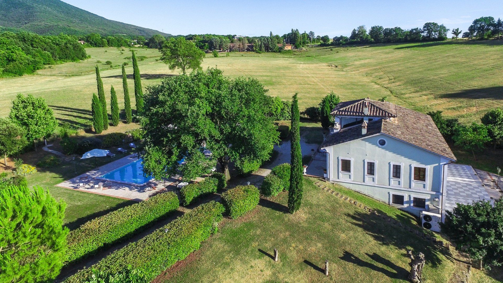 Outside, the grounds are beautifully maintained, with cypress trees, lavender and rose borders surrounding the lawns. A large, pristine pool awaits, with sun loungers and a shaded poolside dining area that also boasts a bar. And there's a play area for the children, shaded by mature trees.