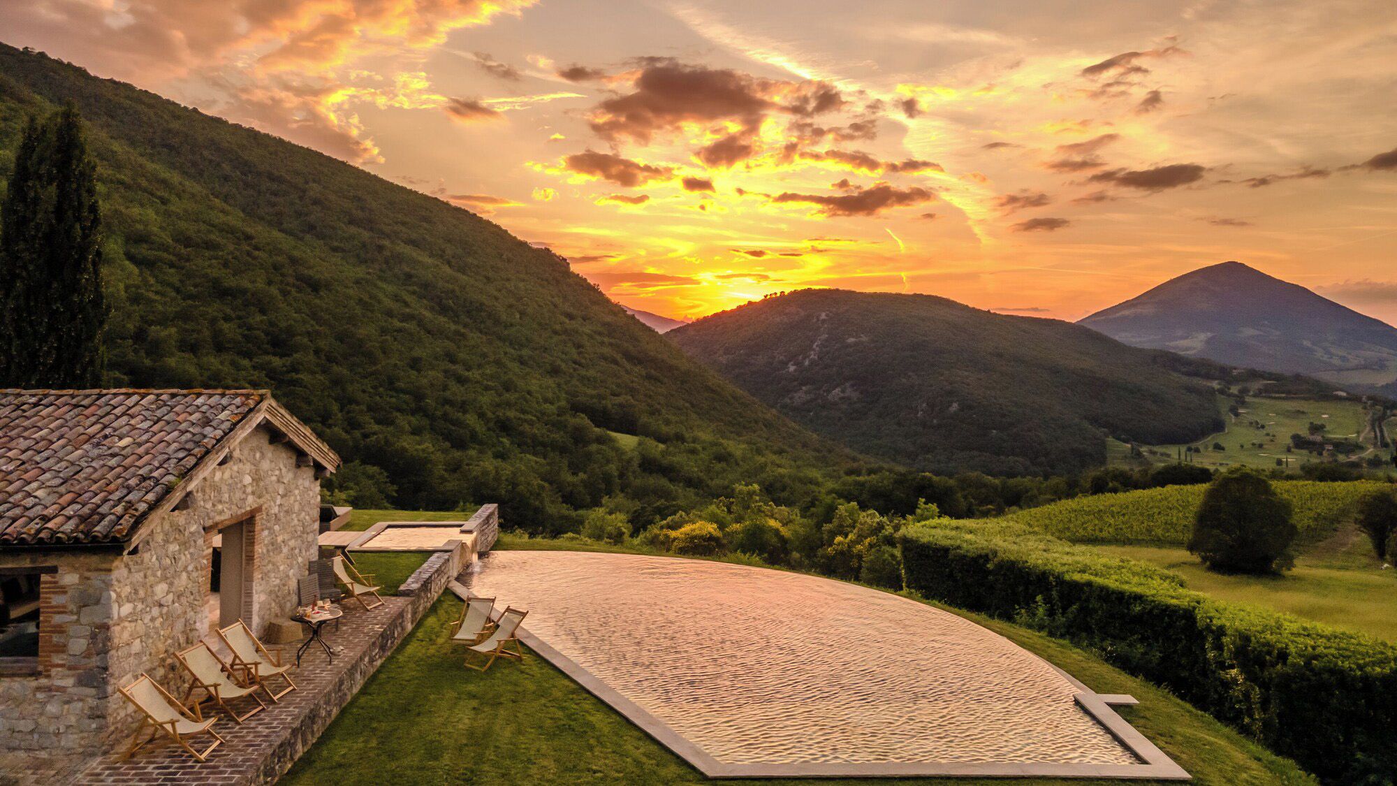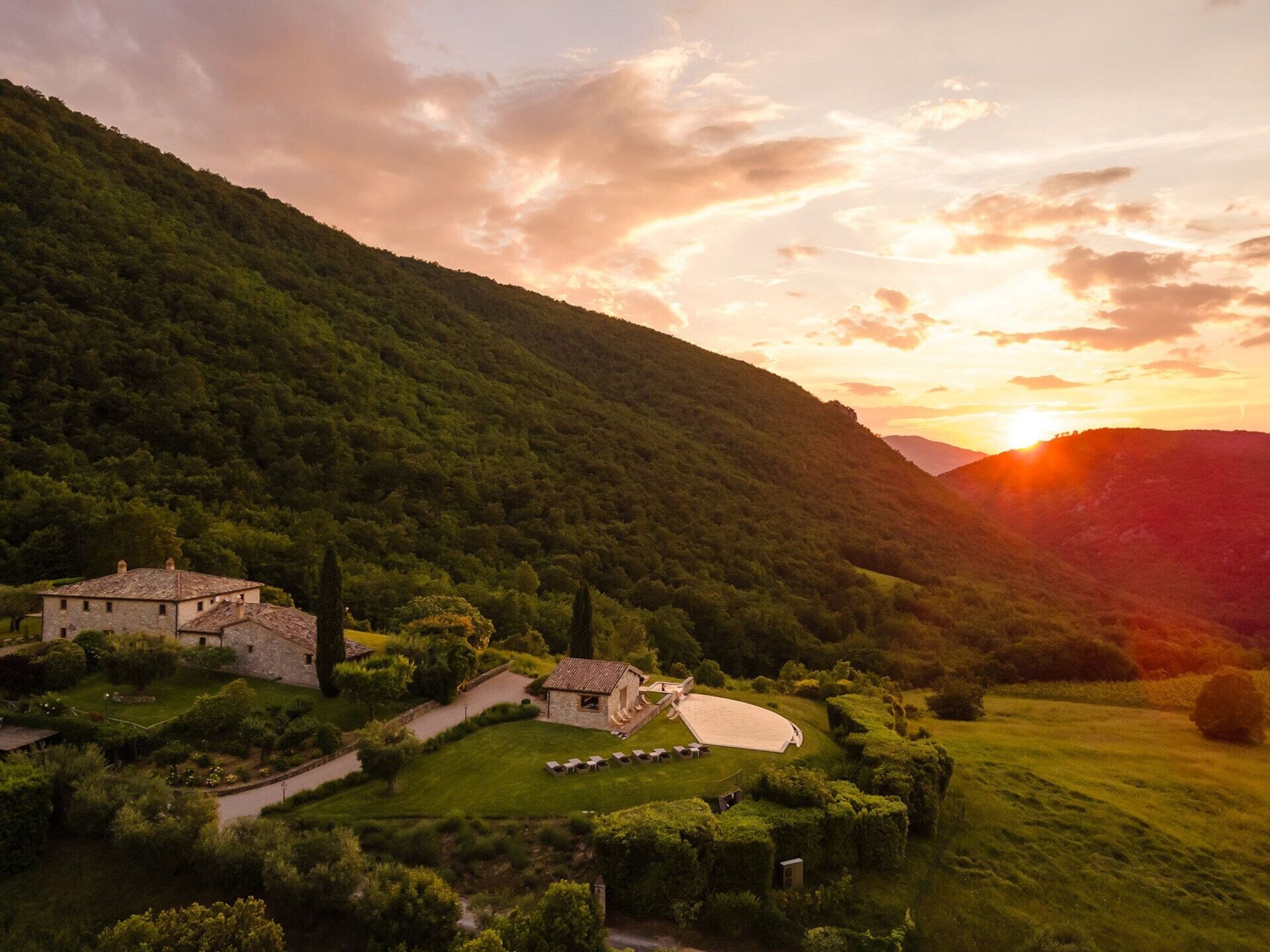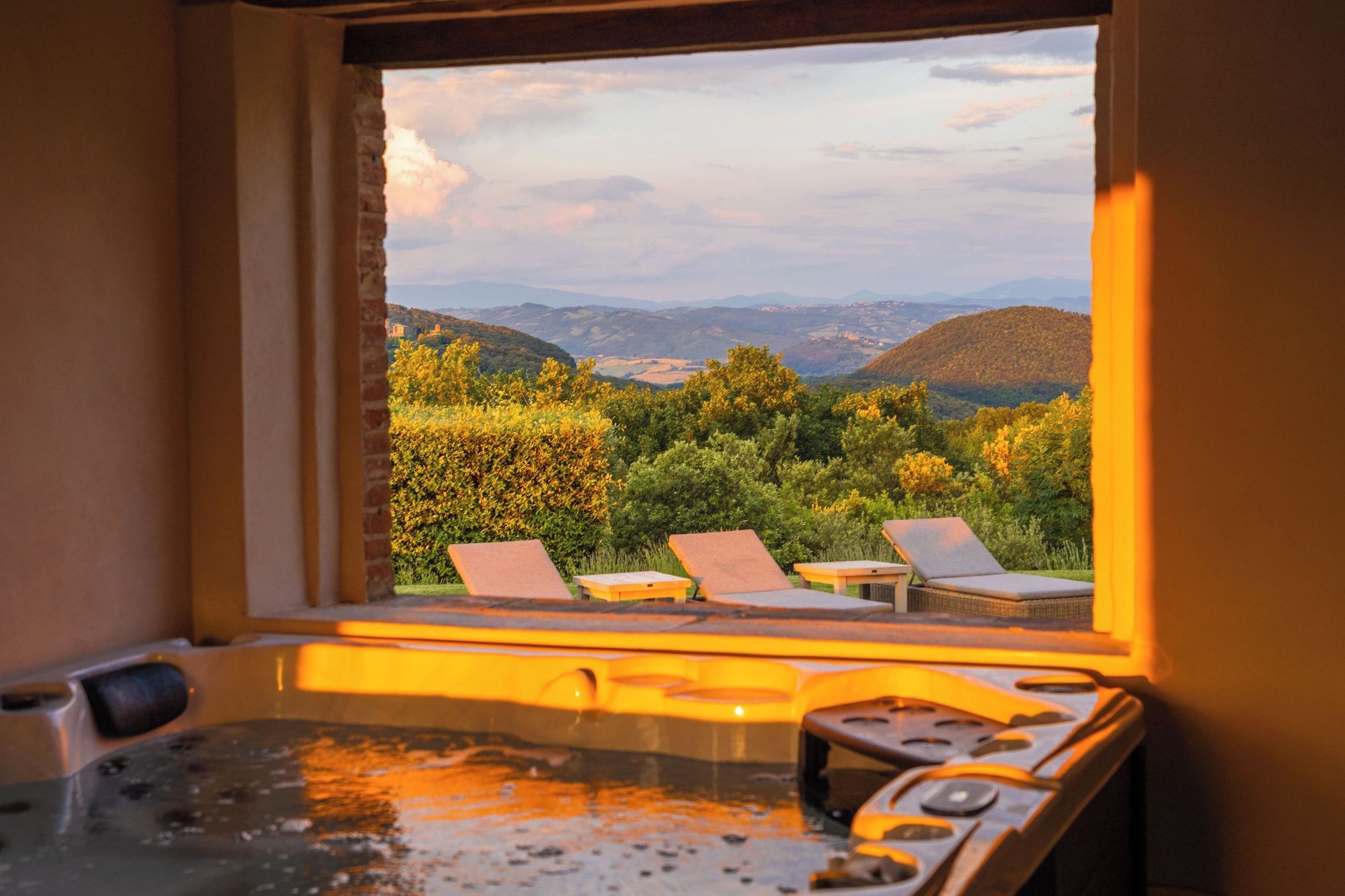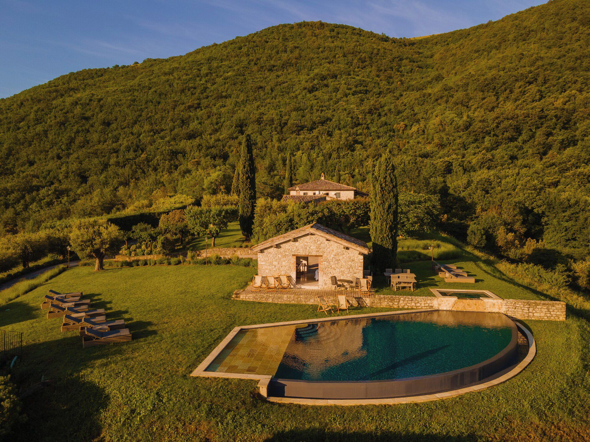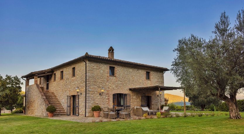 Set on an estate and surrounded by countryside, this home invites relaxation. Made up of the main villa and a separate apartment, it’s an ideal choice for large groups of extended family or friends who seek a sociable getaway together yet still enjoy some private time. The outdoor space is the perfect spot to gather together, with a private pool, Jacuzzi and open-air cottage. When you’re ready to explore, you can take to the fairways of the local golf course or drive to Perugia where shops, eateries, and historic landmarks await.
