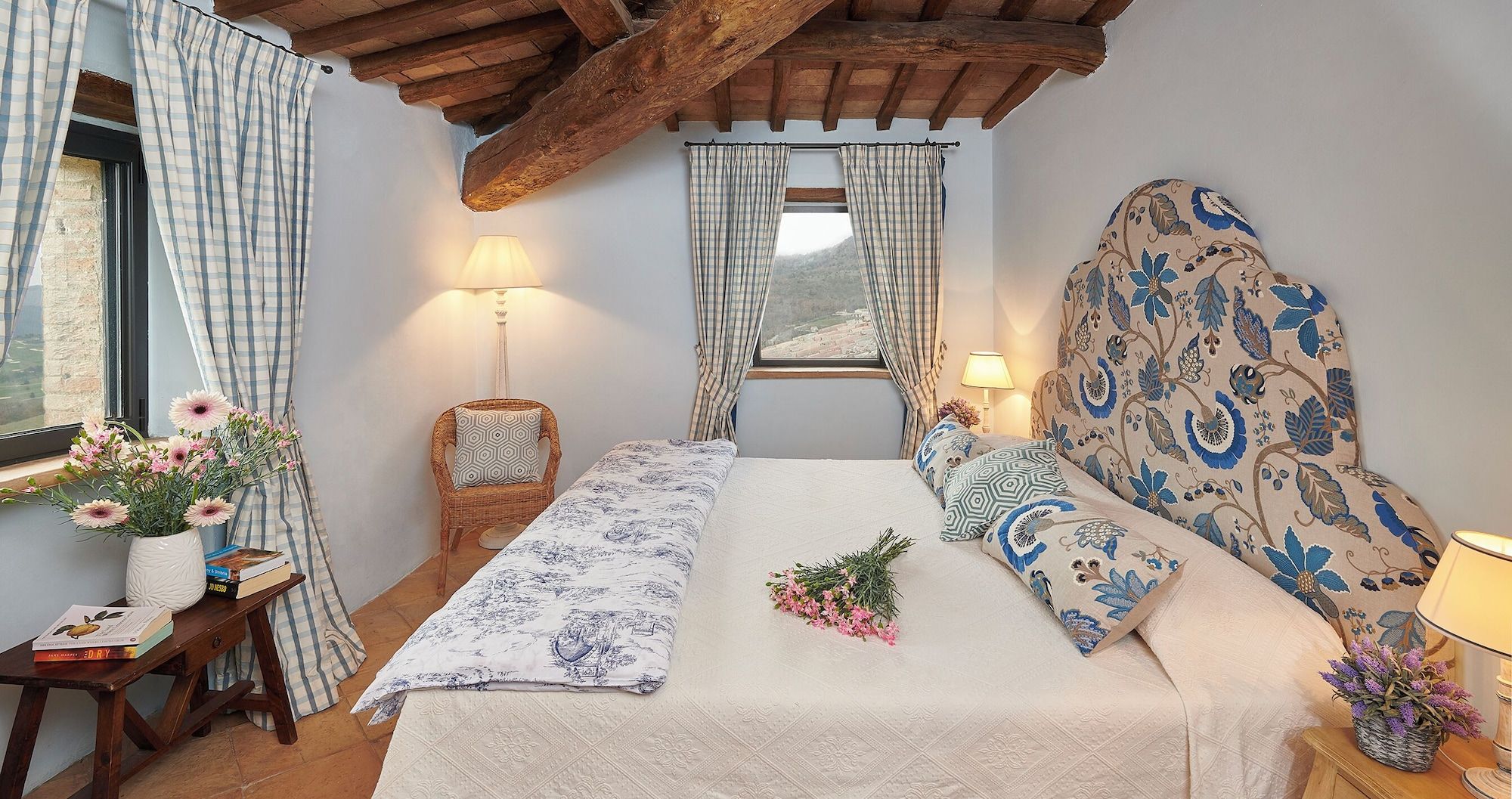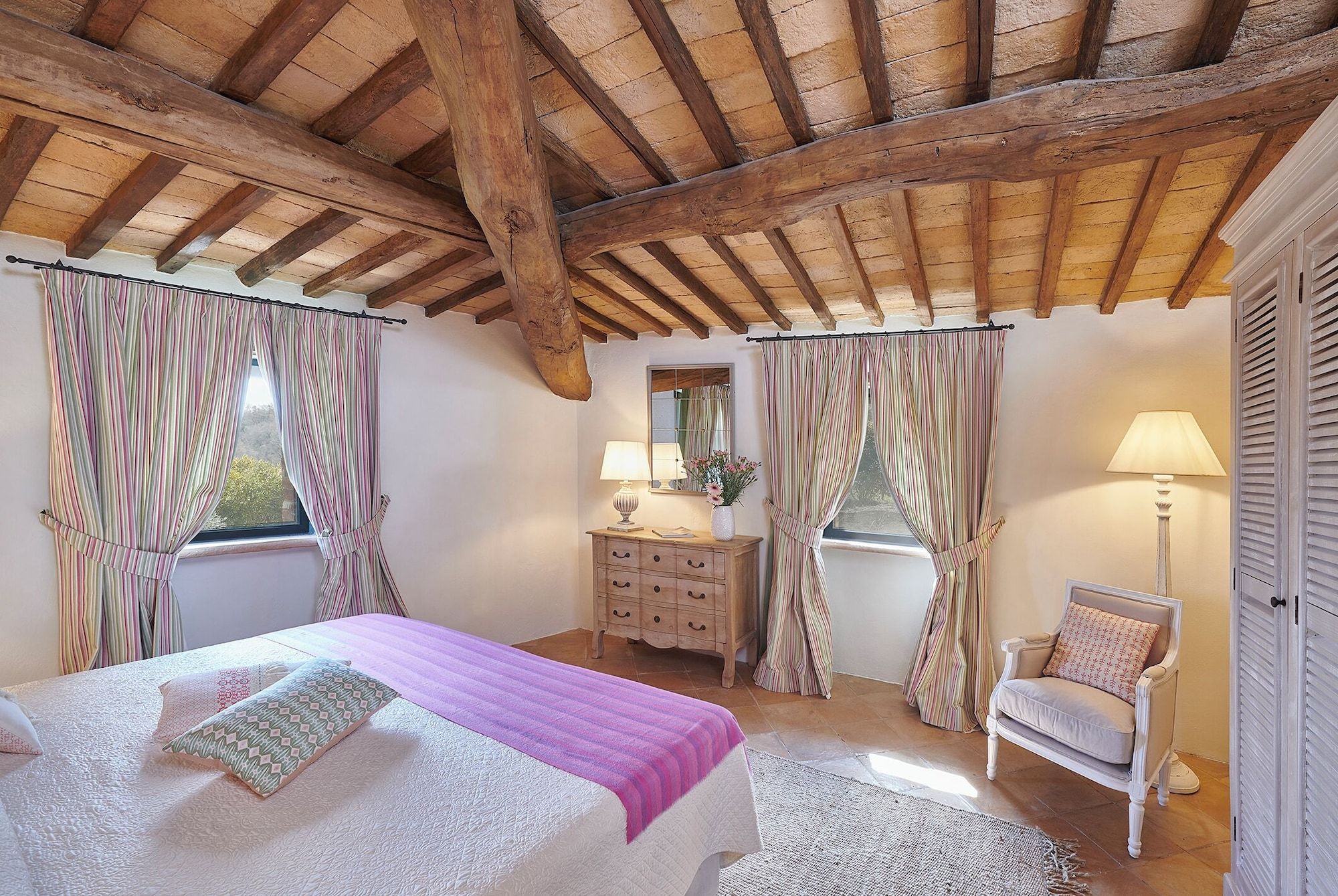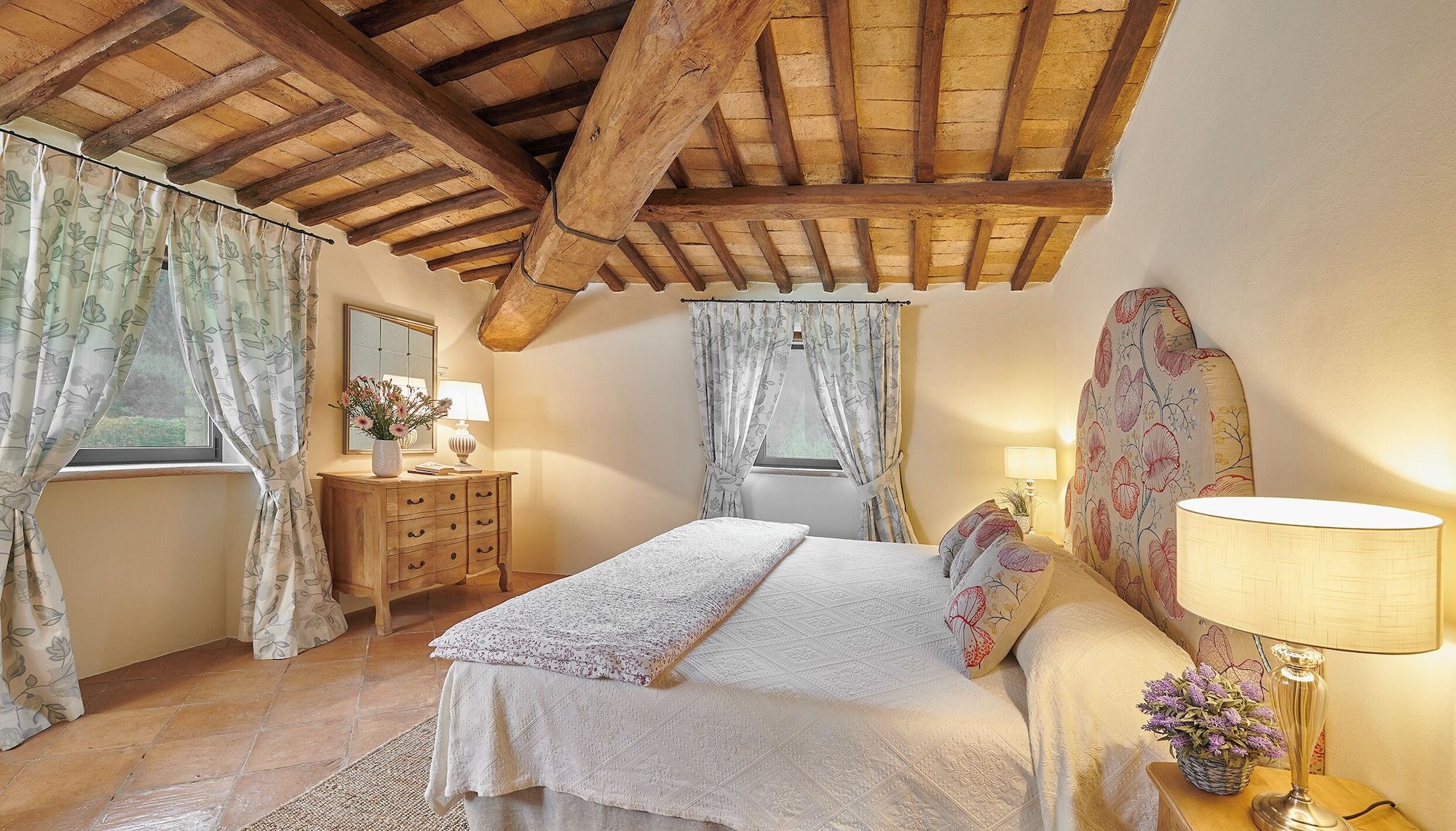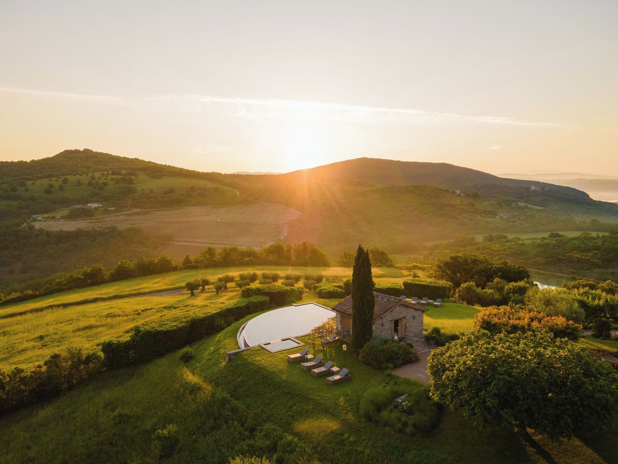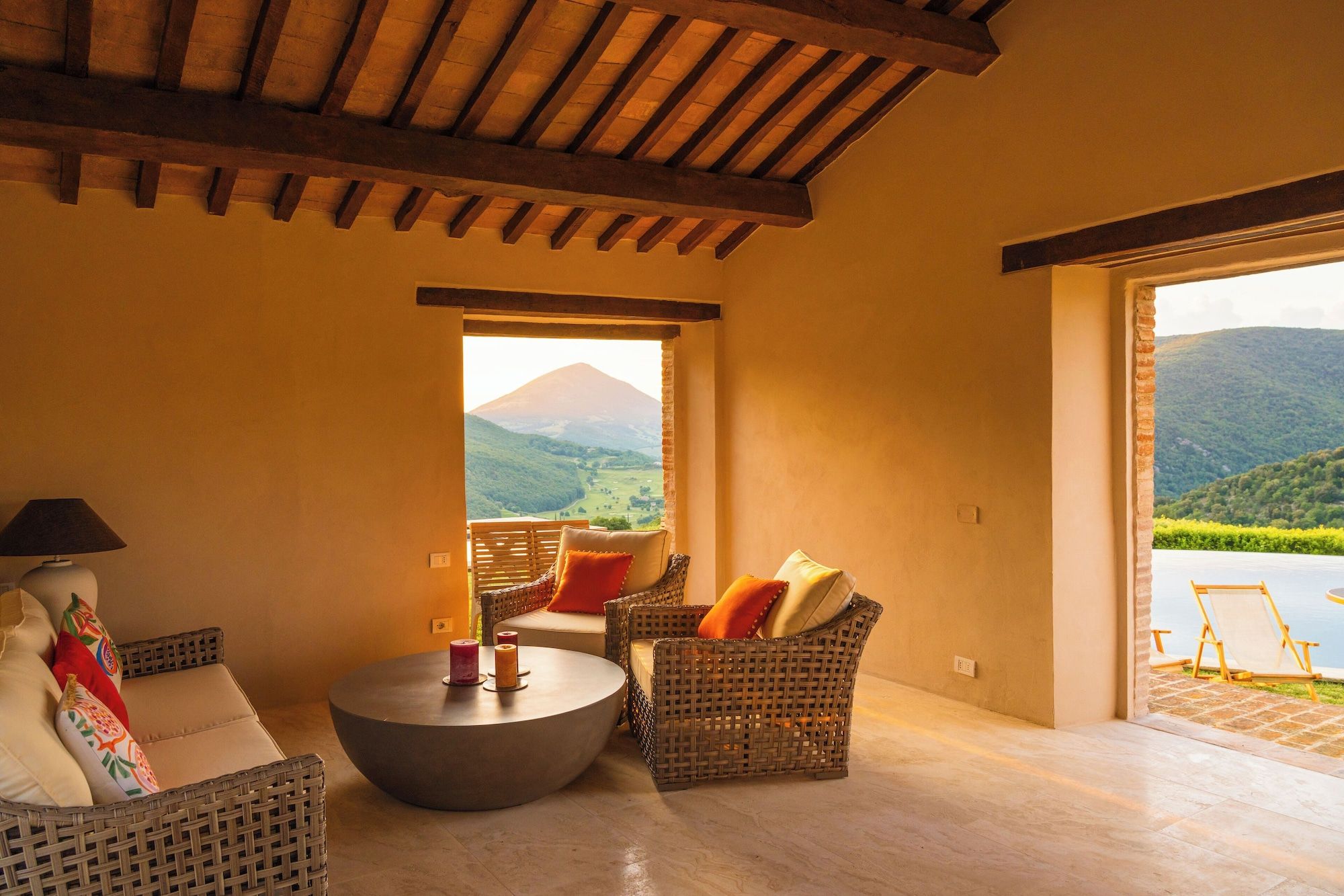 Set on an estate and surrounded by countryside, this home invites relaxation. Made up of the main villa and a separate apartment, it’s an ideal choice for large groups of extended family or friends who seek a sociable getaway together yet still enjoy some private time. The outdoor space is the perfect spot to gather together, with a private pool, Jacuzzi and open-air cottage. When you’re ready to explore, you can take to the fairways of the local golf course or drive to Perugia where shops, eateries, and historic landmarks await.