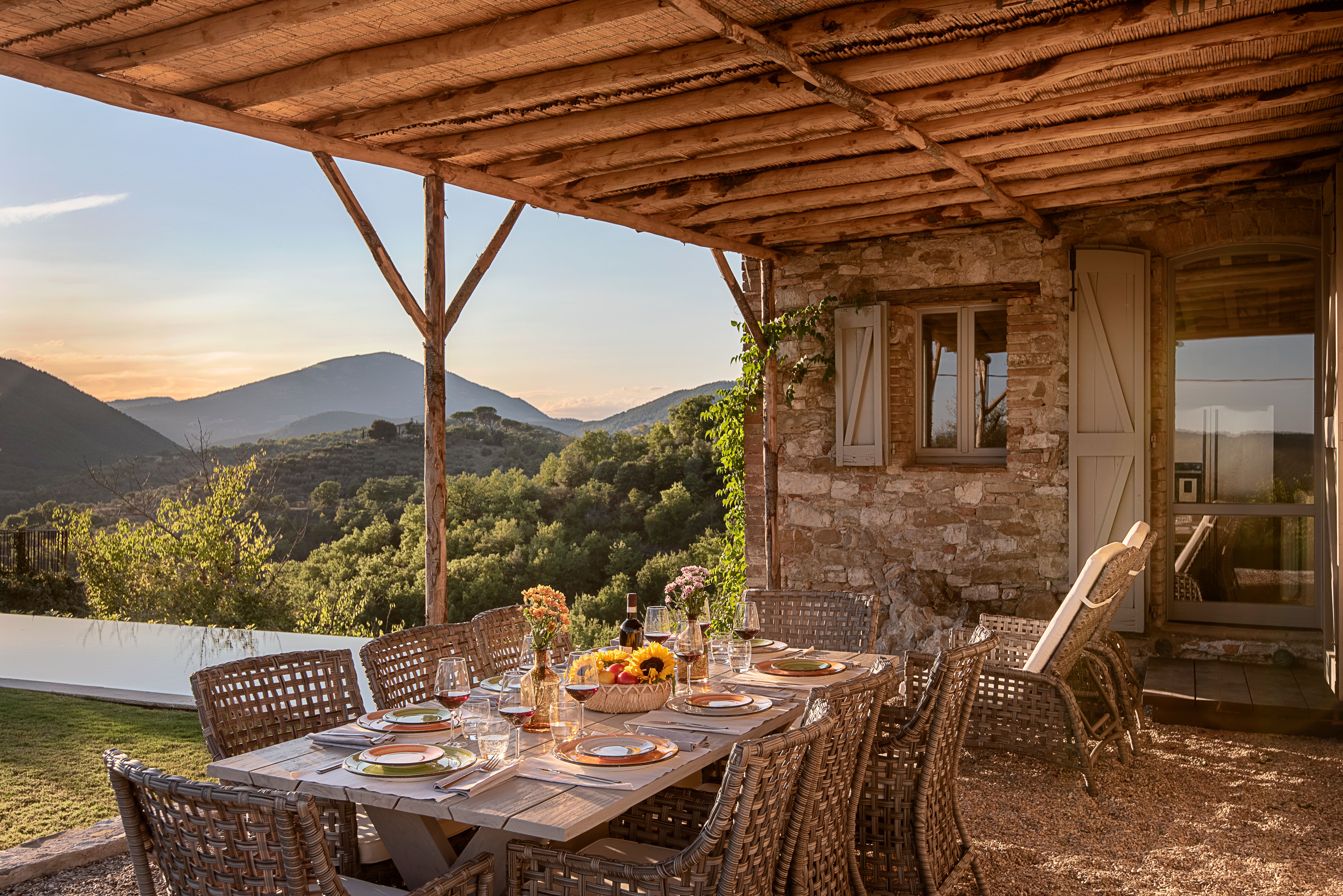 Originally a castle with an adjoining 11th-century church adorned with frescoes, this grand home is perfect for weddings and special celebrations. Set on a renowned estate, there are stunning views of the Umbrian hills and vineyards from the gardens, alfresco dining areas and the heated infinity pool. The main house sleeps six guests, while on the other side of the garden, there’s an annexe which sleeps eight people – all bedrooms have a marble en-suite. When you want to explore, long walks can be enjoyed around the estate’s communal grounds home, to olive groves and river valleys or visit the fascinating city of Perugia.