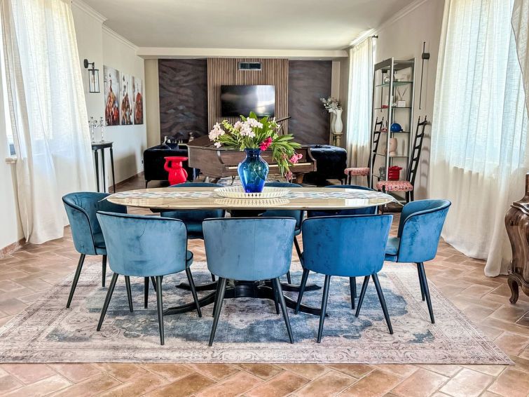 12-room villa 600 m2 on 3 levels. Modern and stylish furnishings: billiard room with open-hearth fireplace, TV and flat screen. Exit to the garden. 1 children's room with 4 beds and shower/bidet/WC. 1 double bedroom with shower/bidet/WC. 1 room with 1 x 2 bunk beds, 1 double bed and shower/bidet/WC.